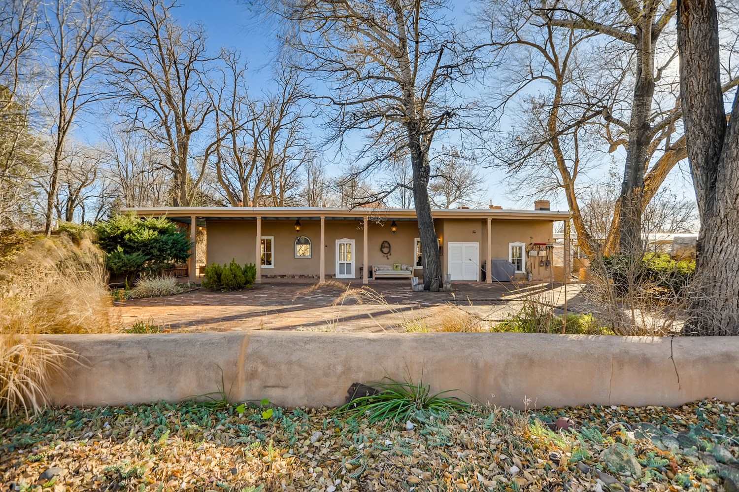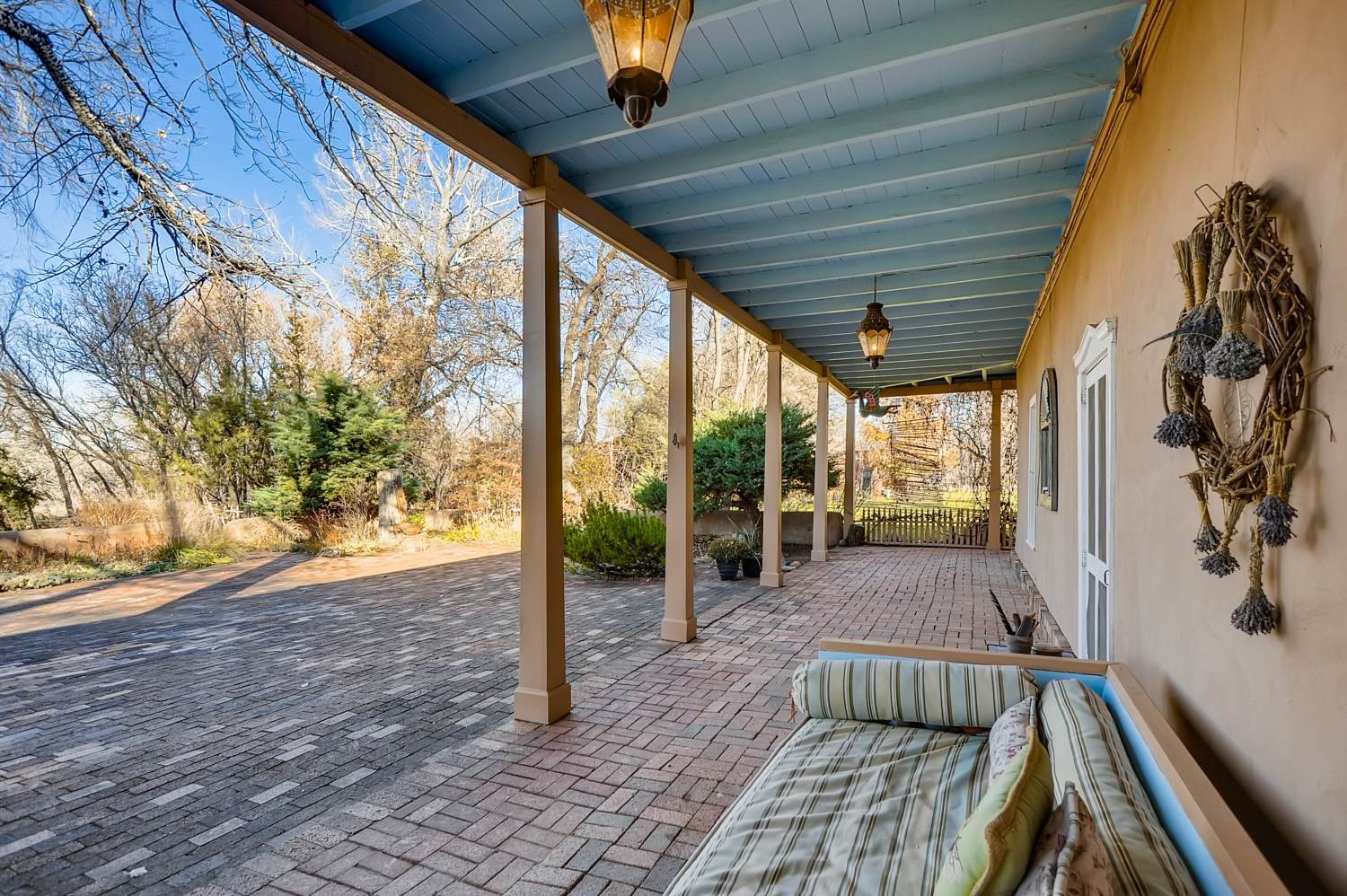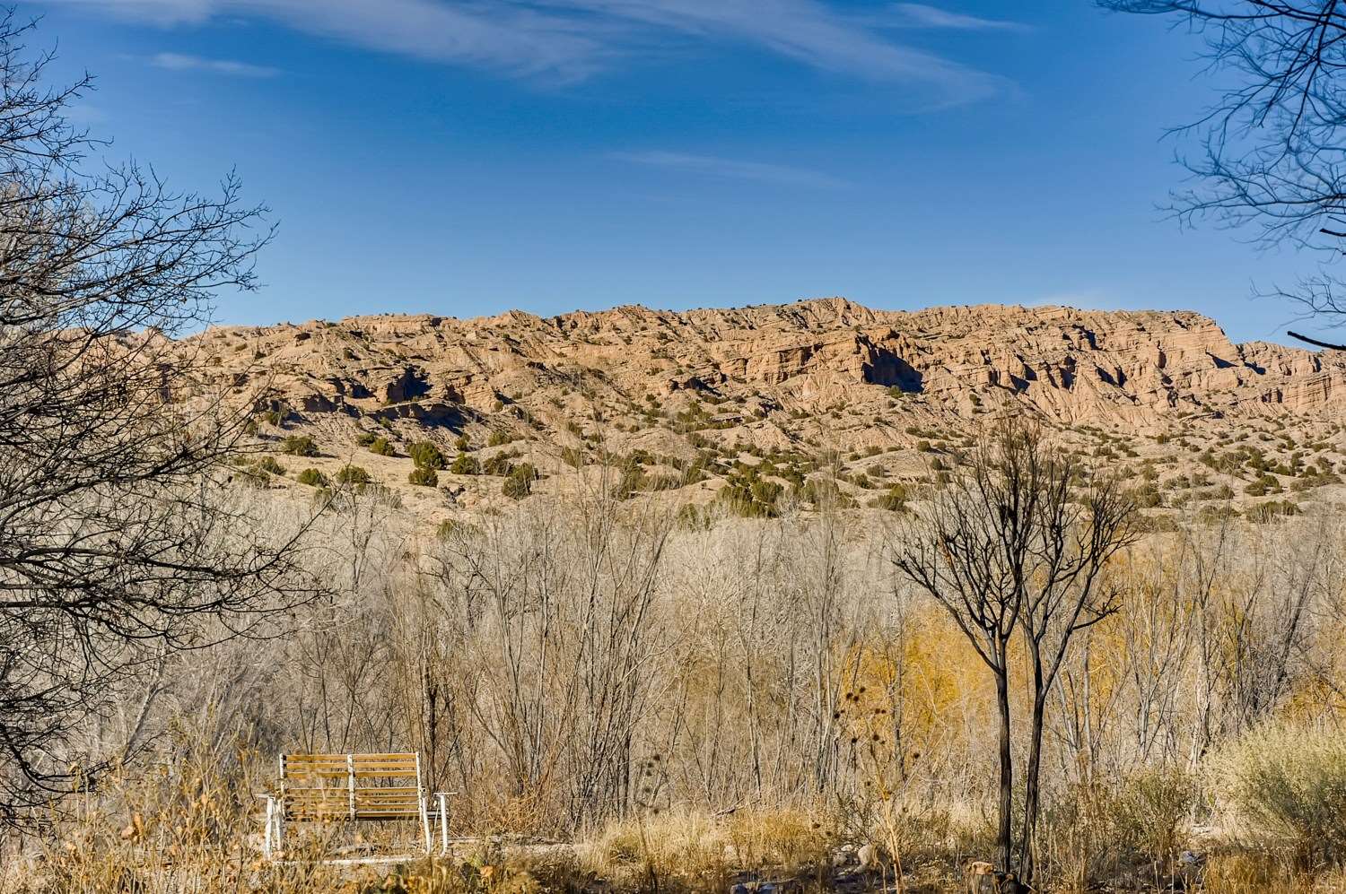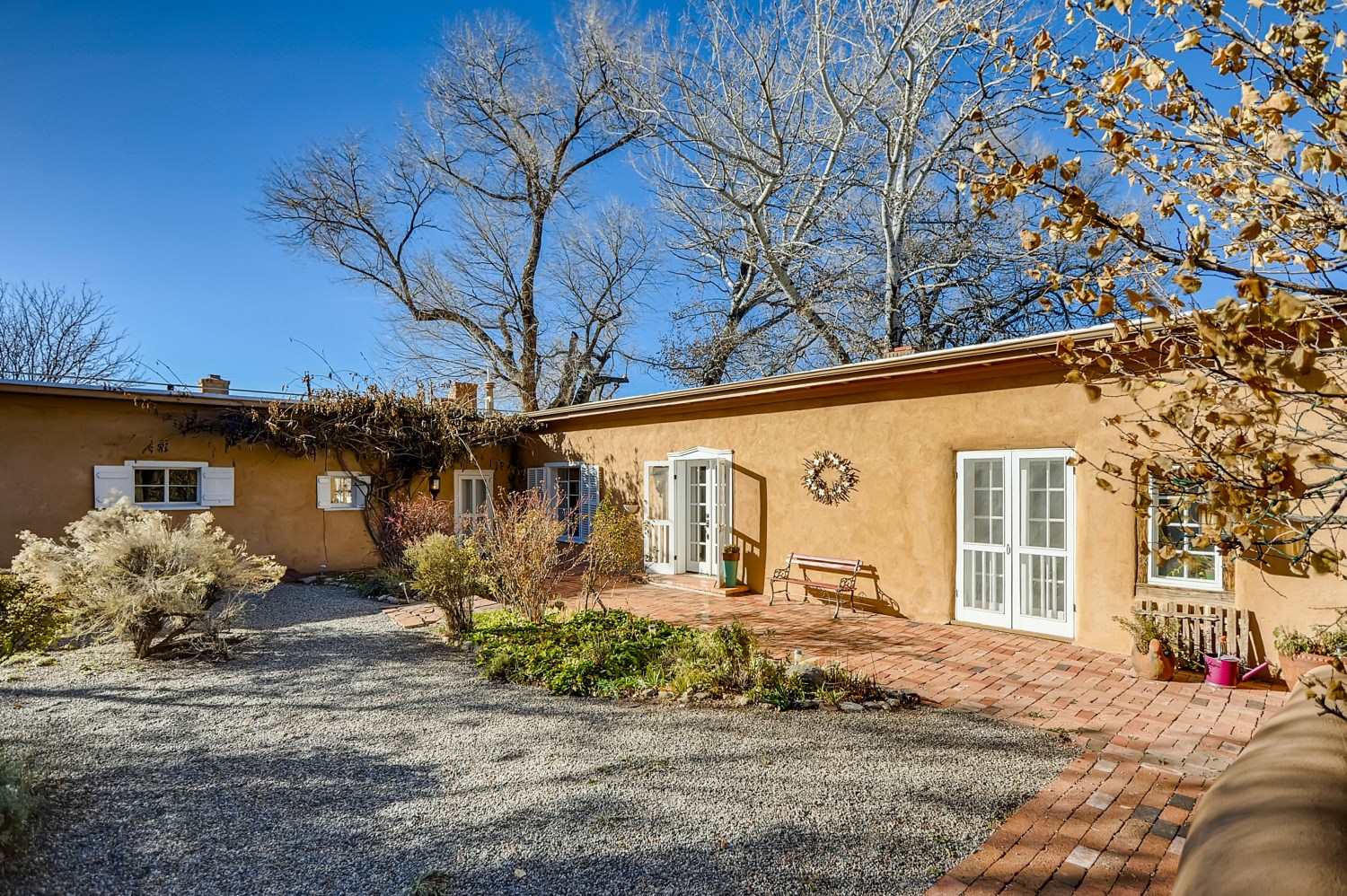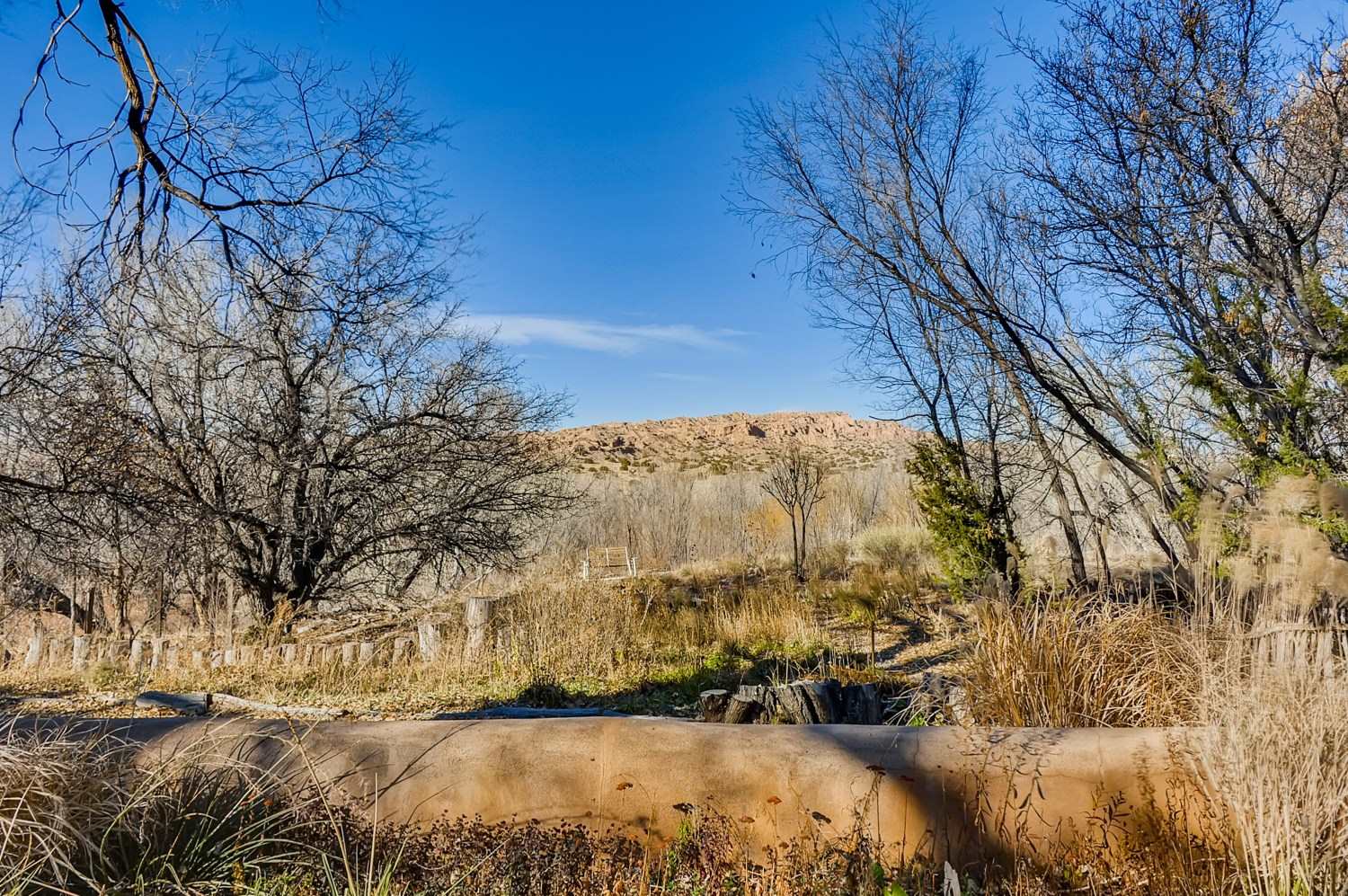 20 minutes from Santa Fe or Los Alamos, CASA LAS BARRANCAS rests in the lush Jacona Valley, proudly boasting the best view of the Barrancas from John Gaw Meem's famous portal. This historic Spanish Revival offers 2+ plus bedrooms, 2 baths, 2 living rooms, 4 fireplaces, kitchen, plus kitchenette. There are many opportunities for work at home flex space. The classic double adobe walls, hand-hewed beams, brick flooring and extraordinary landscaping were developed by the artist Cady Wells, under the guidance of architect John Gaw Meem, and has been preserved though all upgrades. The house has its own heated and covered private lap pool. It is part of a 10-acre compound with 5 other houses, each sited for maximum privacy and private space. With ample water rights, the property features decades of Permaculture practices, 100-foot trees, community vegetable garden, historic chapel, and a guesthouse with two bedrooms and a full kitchen. Casa Las Barrancas also has its own 4 acres of federally protected wetlands. The house has updated plumbing, heating and electric. You must see Casa Las Barrancas to fully appreciate its exceptional beauty.