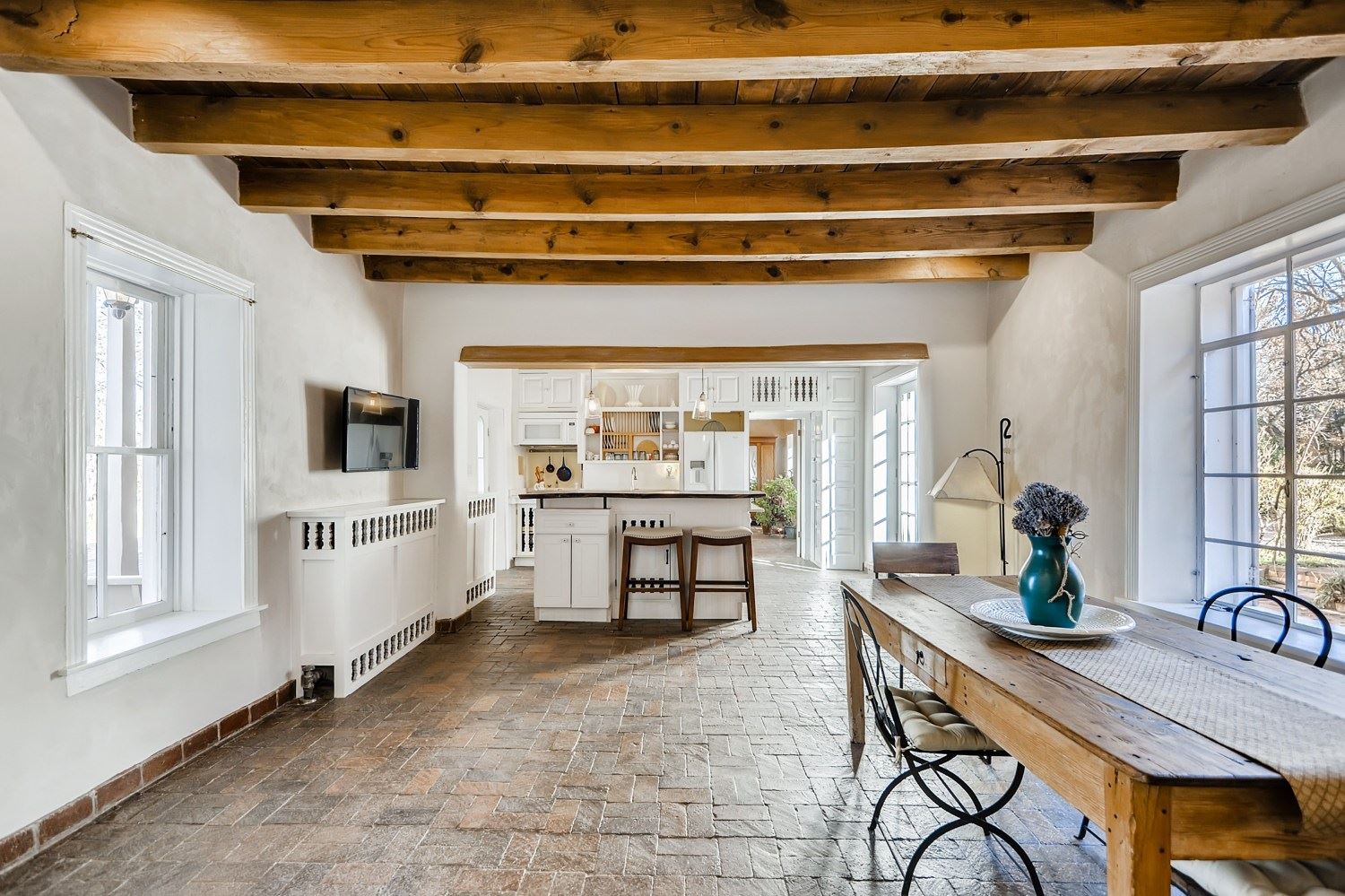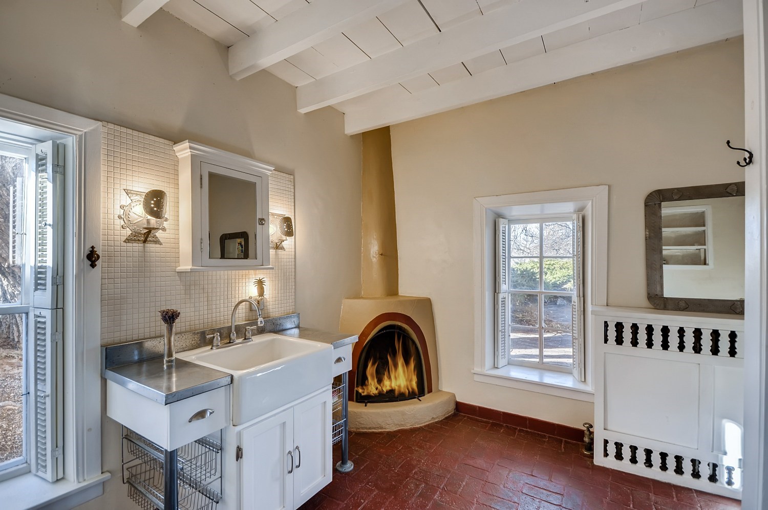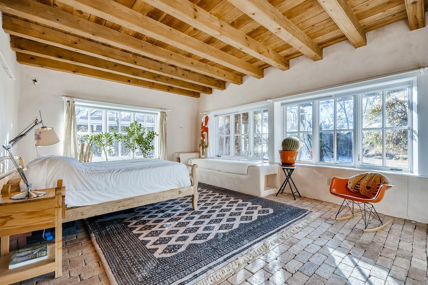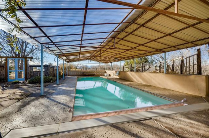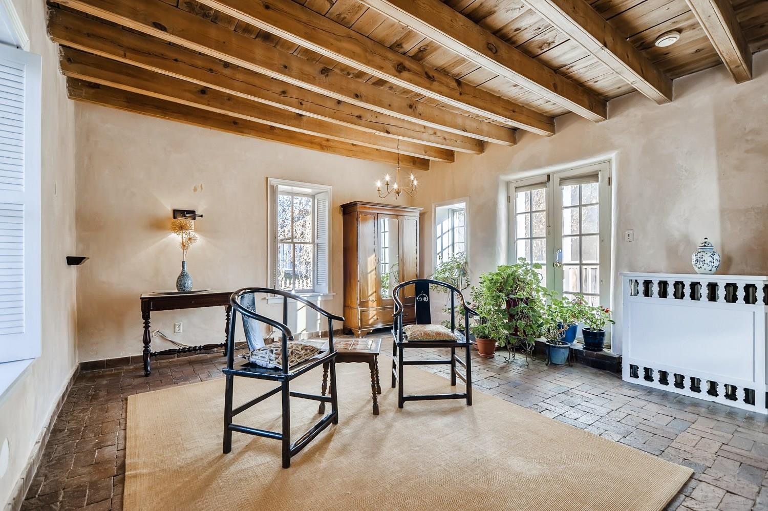 20 minutes from Santa Fe or Los Alamos, CASA LAS BARRANCAS rests in the lush Jacona Valley, proudly boasting the best view of the Barrancas from John Gaw Meem's famous portal. This historic Spanish Revival offers 2+ plus bedrooms, 2 baths, 2 living rooms, 4 fireplaces, kitchen, plus kitchenette. There are many opportunities for work at home flex space. The classic double adobe walls, hand-hewed beams, brick flooring and extraordinary landscaping were developed by the artist Cady Wells, under the guidance of architect John Gaw Meem, and has been preserved though all upgrades. The house has its own heated and covered private lap pool. It is part of a 10-acre compound with 5 other houses, each sited for maximum privacy and private space. With ample water rights, the property features decades of Permaculture practices, 100-foot trees, community vegetable garden, historic chapel, and a guesthouse with two bedrooms and a full kitchen. Casa Las Barrancas also has its own 4 acres of federally protected wetlands. The house has updated plumbing, heating and electric. You must see Casa Las Barrancas to fully appreciate its exceptional beauty.