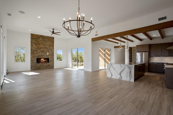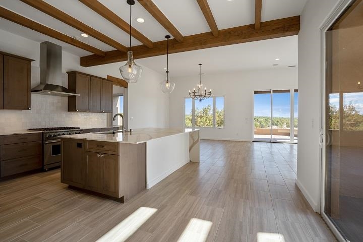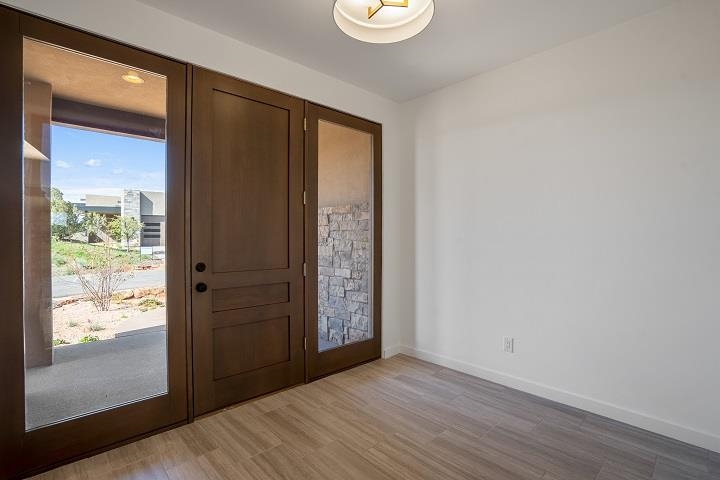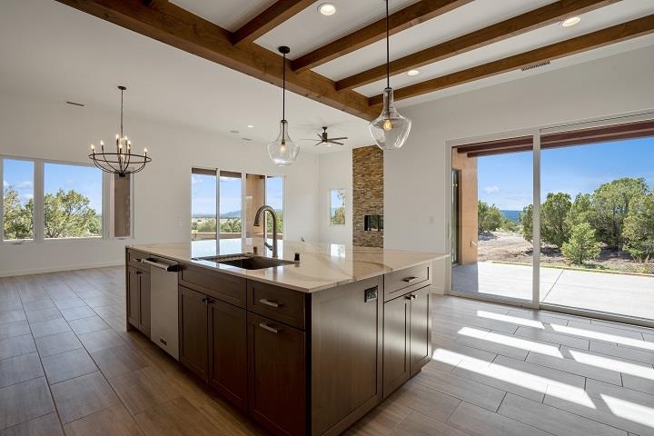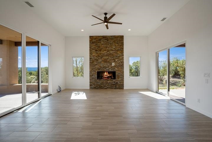 To Be Built on the Sunset Golf Course! Valverde's Sunrise Contemporary floor plan, Elevation A, has 2,802 SF, and is designed for comfort and easy livability. This single-level home has three bedrooms, 3 bathrooms and golf course views. The living space includes a gourmet kitchen with solid wood cabinets, stainless-steel Viking appliances, quartz countertops, a huge pantry, and opens to the dining and great room with 12-foot ceilings, and a low-profile gas fireplace with stone surround. A courtyard connects to the kitchen and great room for perfect outdoor dining. A third portal captures the views. The large master suite has a portal, master bathroom with curbless, walk-in shower, soaking tub, dual sinks, and walk-in closet. The guest bedrooms are on the opposite side of the home, each with their own bathroom. The large two-car garage has plenty of storage. Choose your interior finishes, color choices and other options. A low-maintenance landscape package is included and can be expanded with water features, fire pit, outdoor kitchen/BBQ. HOA fees include road and common area maintenance, 24-hour roaming security, and 24-hour EMTs on site. Membership to The Club at Las Campanas is optional. Amenities include indoor and outdoor swimming, tennis, fitness facility, equestrian, fine dining, and two Jack Nicklaus Signature Golf Courses. (Photos are representational only.)
