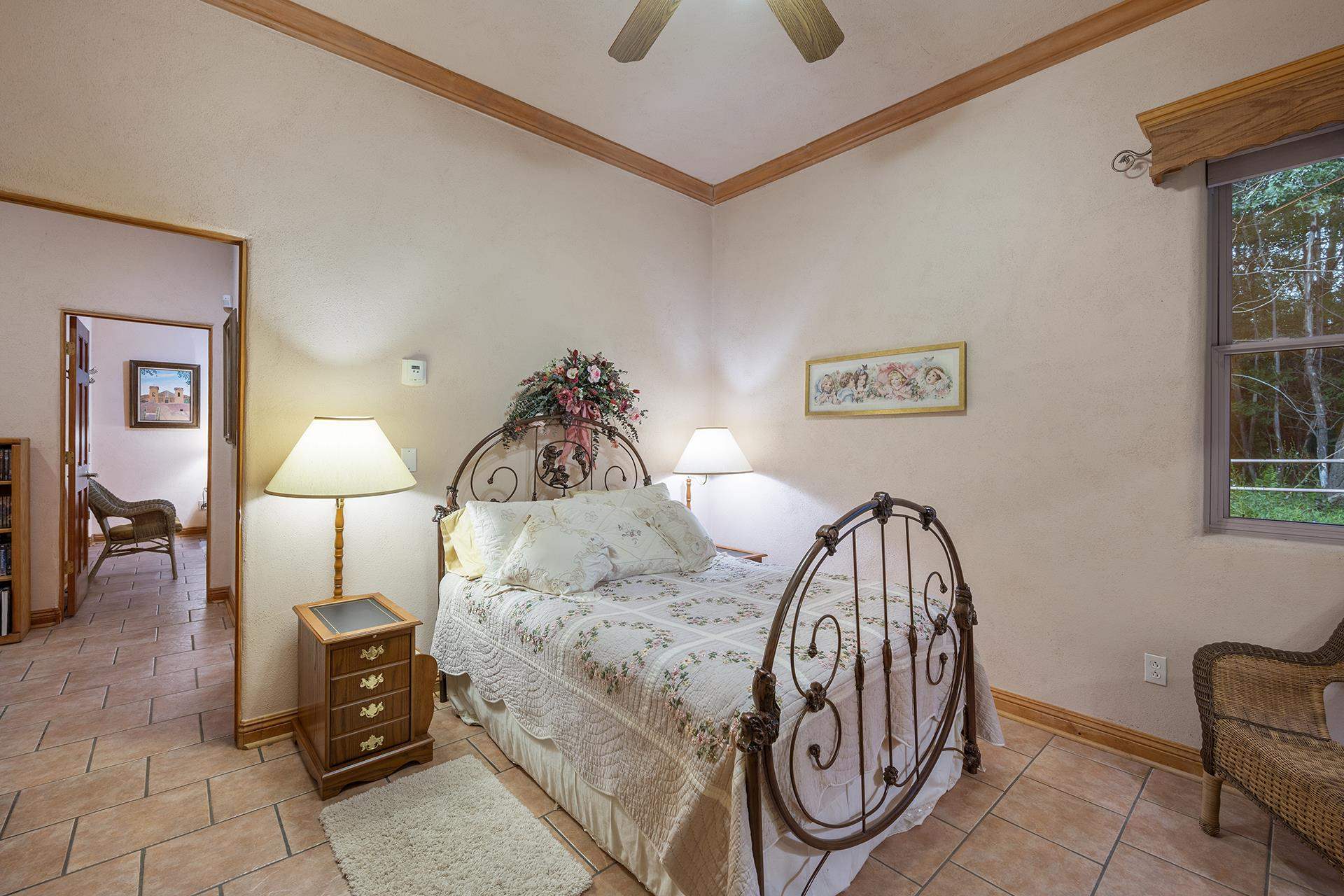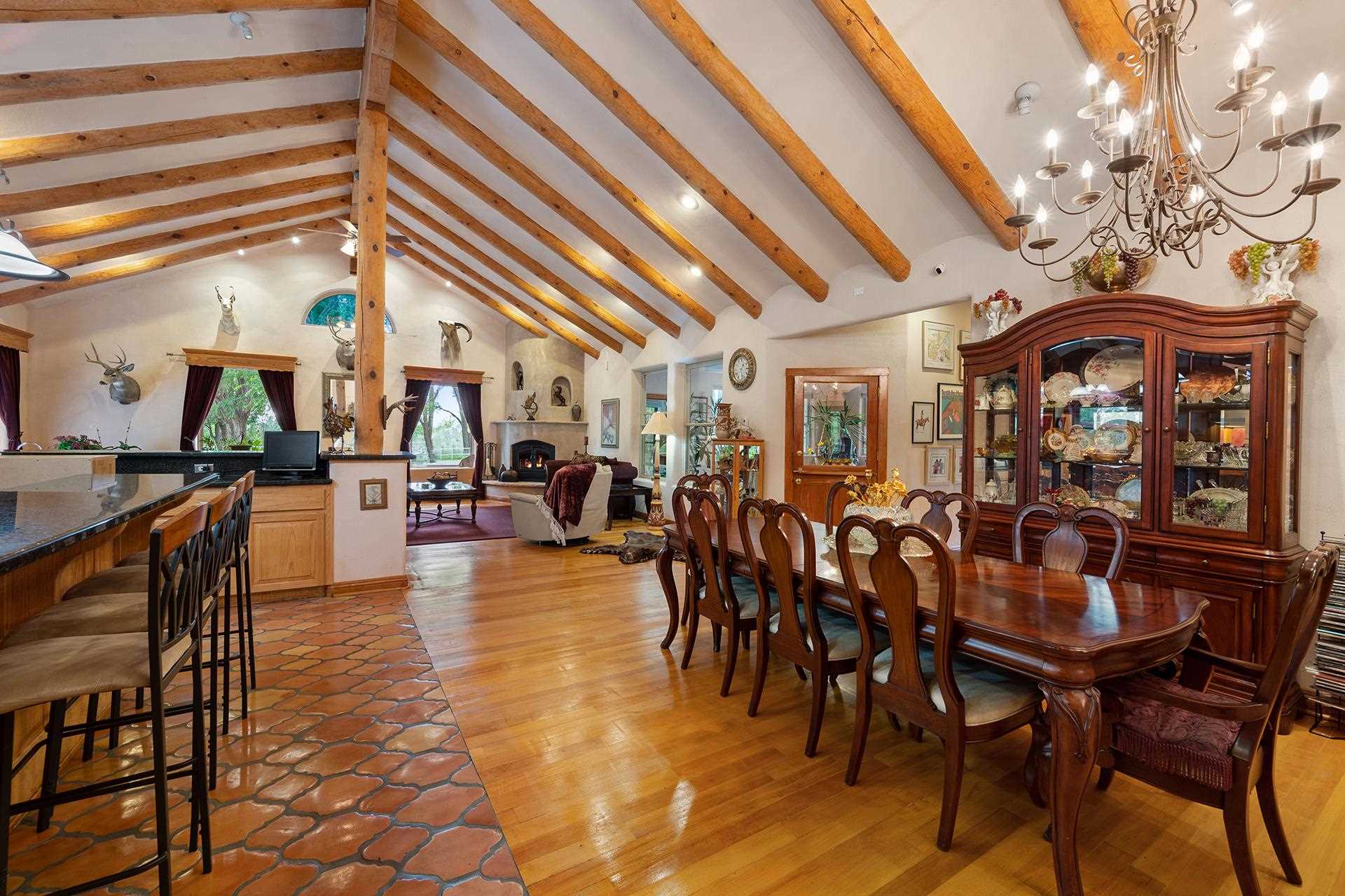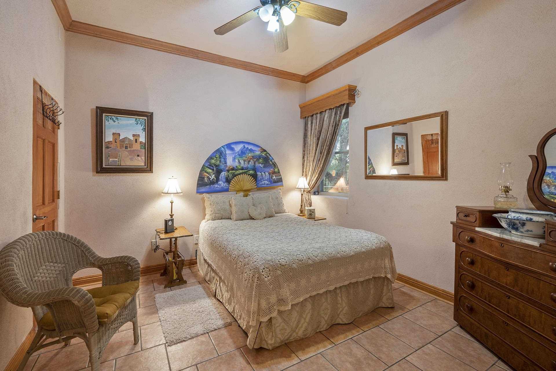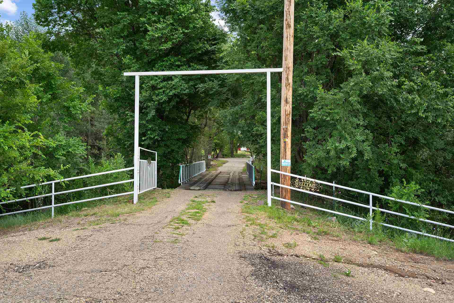 Tucked away a couple of miles outside of Las Vegas, New Mexico is this Oasis, plush in the summer and cozy in the winter with a blanket of snow, somedays, and a New Mexico star-filled sky. Come across the Acequia and drop into the 47 Acres, with 25.4 water rights UNDER MORATORIUM. Here sits this Southwest Style home comprising 3 bedrooms 2 1/2 baths. The front entrance brings you into the living room, with a large dining area, the kitchen with granite countertops sits on one side of this open floor plan. The vaulted ceiling has a scalloped edge where the Vigas enter the wall. This wing of the house has a large sun-filled room. There is an office, and two bedrooms that sit on this side of the home, with a shared bath. You can reach the two-car attached garage from here, with mudroom and the laundry room. The home is accented with hardwood floors and Saltillo tile. This one-level, open space home has your entertainment area with a lunch or breakfast nook and a wet bar. The large Master Bedroom has a Master Bath with Steam Shower and Jet-bath, 2- large walk-in closets. This en- suite is on the other wing of the house. Outside country living or entertainment, you have a Gazebo and two roofed sitting areas, one in the front of the house, a nice sitting area waiting for guests to arrive, or to have morning coffee. Walking away from the house is a Casita with a windowed kitchen, 2-bedrooms, one oversized, and living room, 1,216/sf. Barn and domed outbuildings/storage.