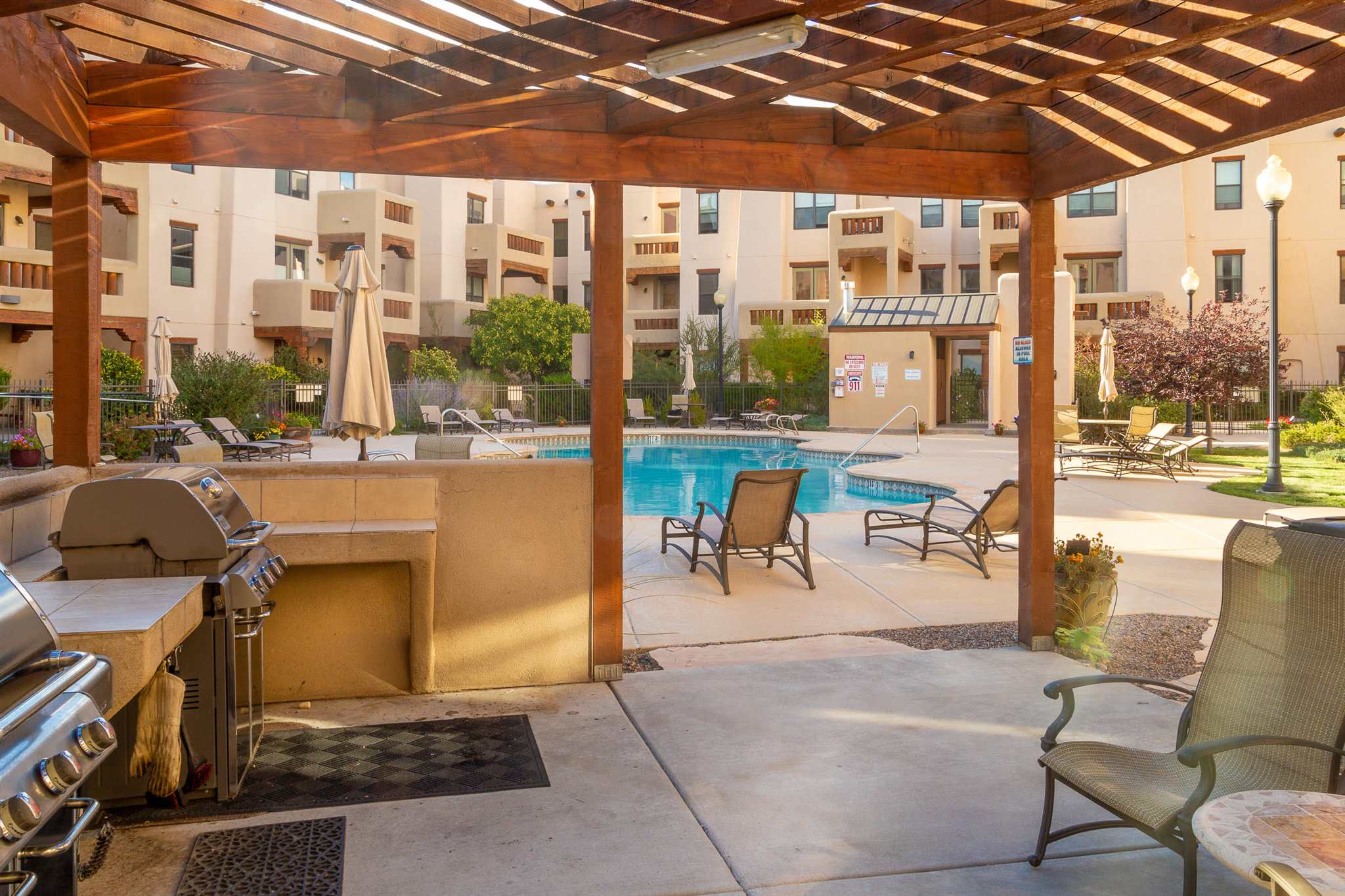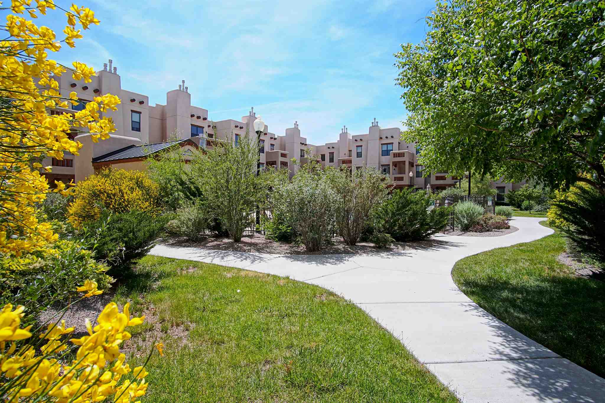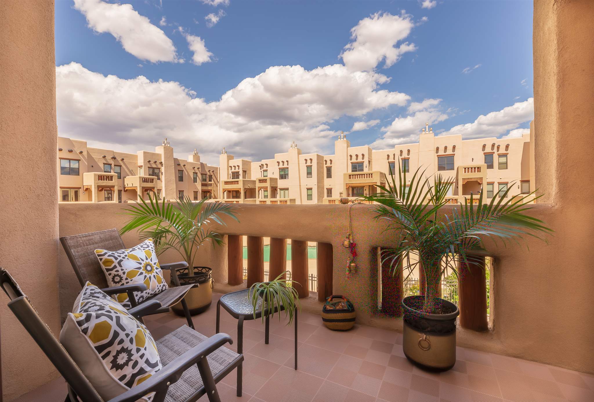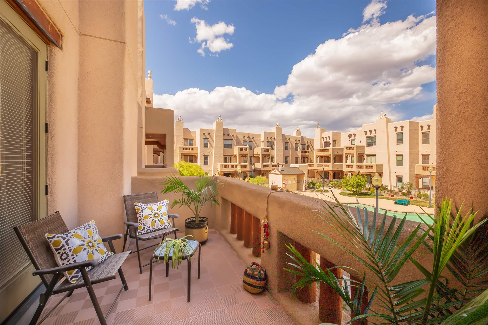 Live the Luxe Lifestyle in this Glamorous Poolside Condo in the luxurious Alameda complex. At 1275 sf, this is the largest floor plan available, with 2 BR/2 BA, and loaded with amenities: Slate, granite, stainless steel; Master suite w/ HUGE walk in closet and Sumptuous en-suite bath; Second BR with WIC, Large Hall Bath; Expansive Open Living w/Kiva gas FP onto wraparound Patio w/commanding pool court views; Washer/Dryer, and a BONUS Separately deeded 1-car GARAGE. Located on 2nd floor (2 elevators in building). Community Amenities include onsite management, gated parking, fitness center, pool, clubhouse, 24-hour controlled access, nearby hiking/biking trails, and a standard of living that is renowned throughout Santa Fe. CONDO IS CURRENTLY LEASED, PLS INQUIRE TO BROKER.