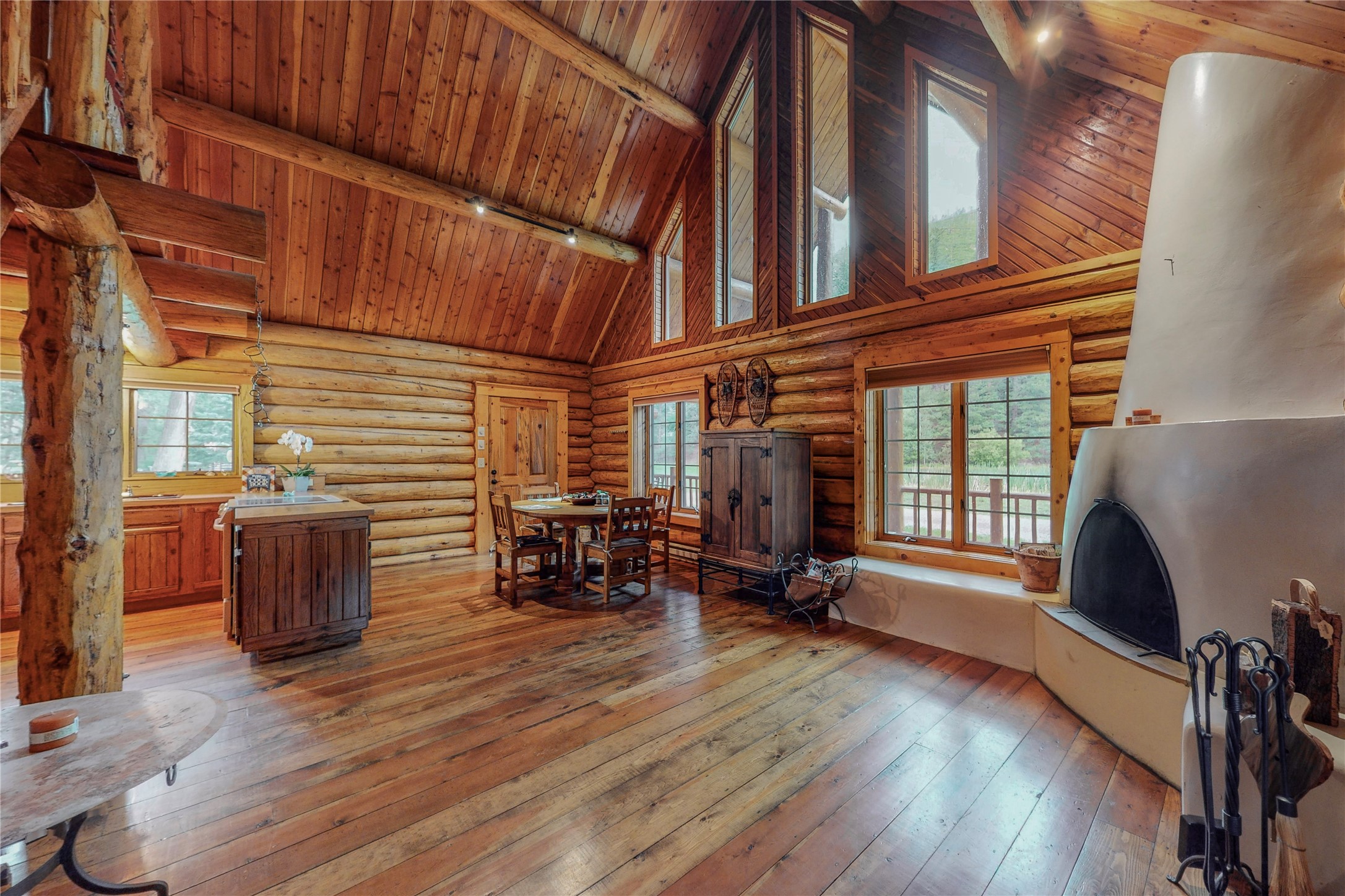 This custom built hand-hewn log cabin overlooking one of the ponds offers serenity both inside and outside this 3 bedroom plus loft area, 3 bath mountain retreat. The cabin is partially furnished and ready for you to move in. Year round access and manicured grounds are just part of the benefits of this fabulous gated community getaway along with some of the best trout fishing in New Mexico on three (3) stocked fishing ponds and river access. Square Footage on Floor plan is based on interior measurements, if of material interest, the buyer should have it independently verified. Existing interior/outdoor furniture to remain. Only a 45-minute drive to Santa Fe.