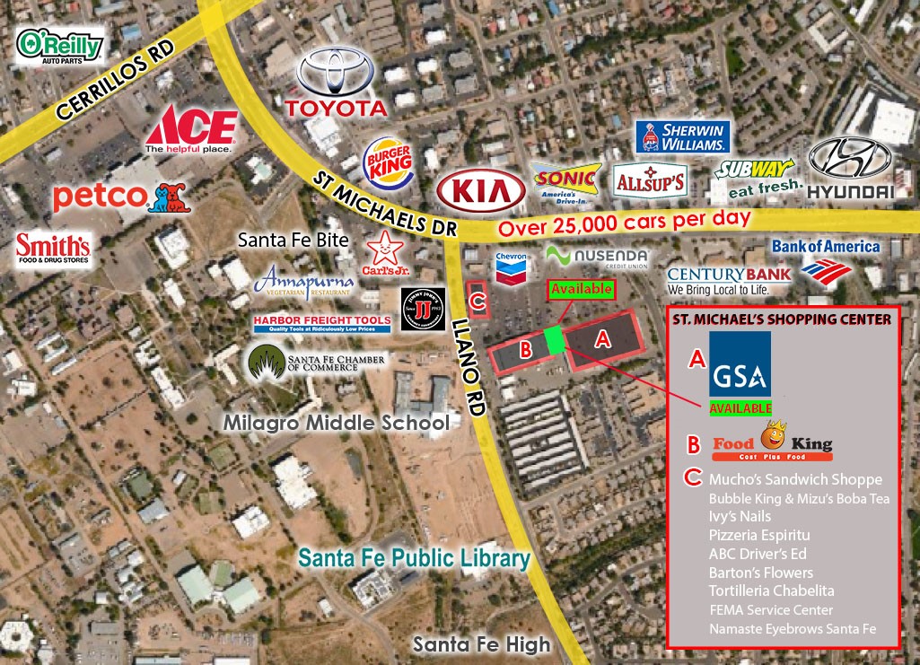 Completely remodeled and updated versatile retai space located between Food King and GSA (FEMA). Over 31K cars/day pass by St. Michael's Shopping Center. Excellent access and parking. Rent + CAM = $5,993/mo. (CAM varies year-year based on actual operating expenses).