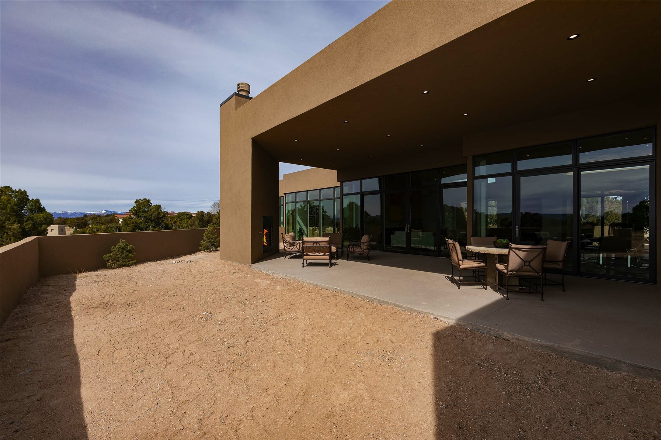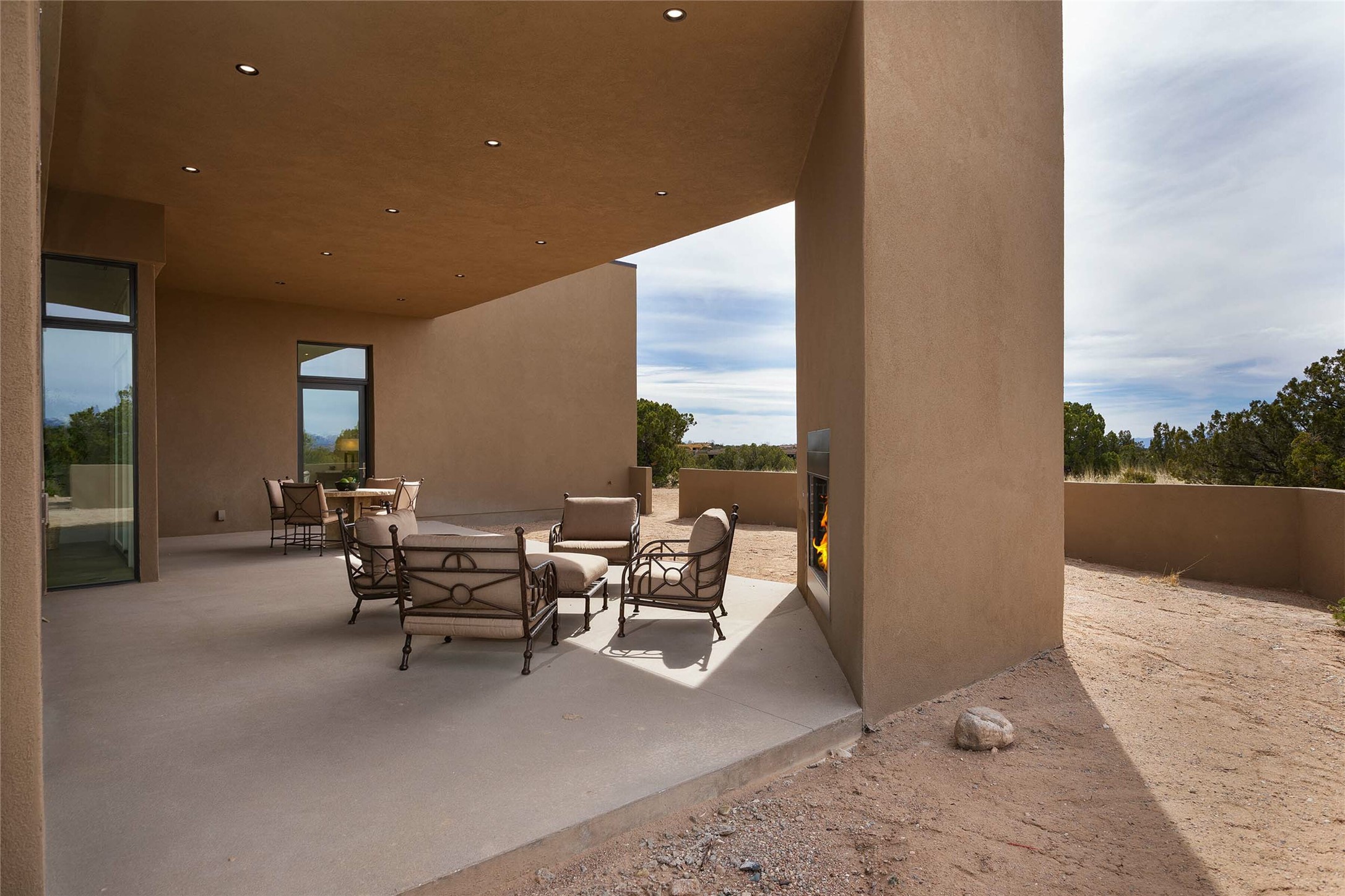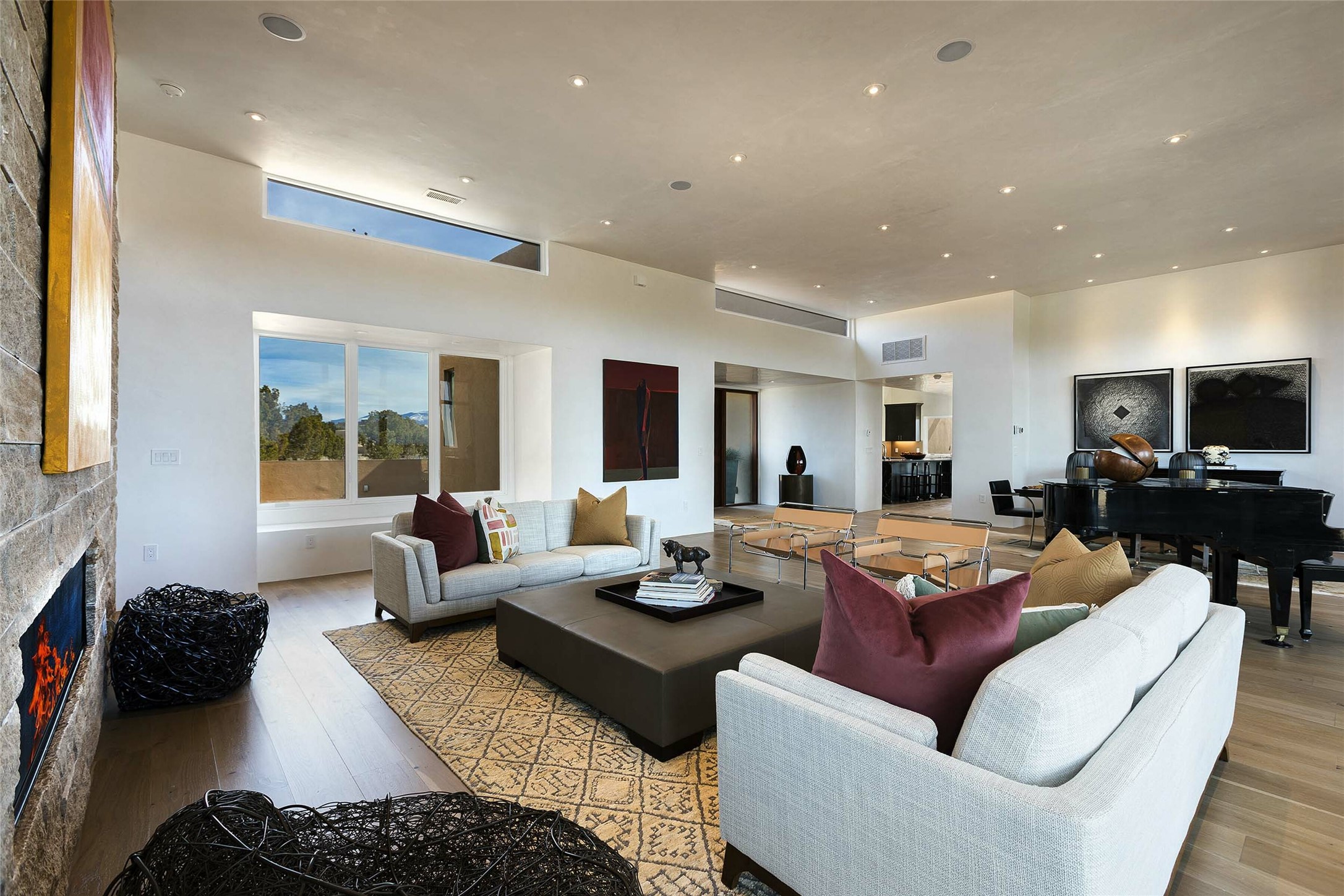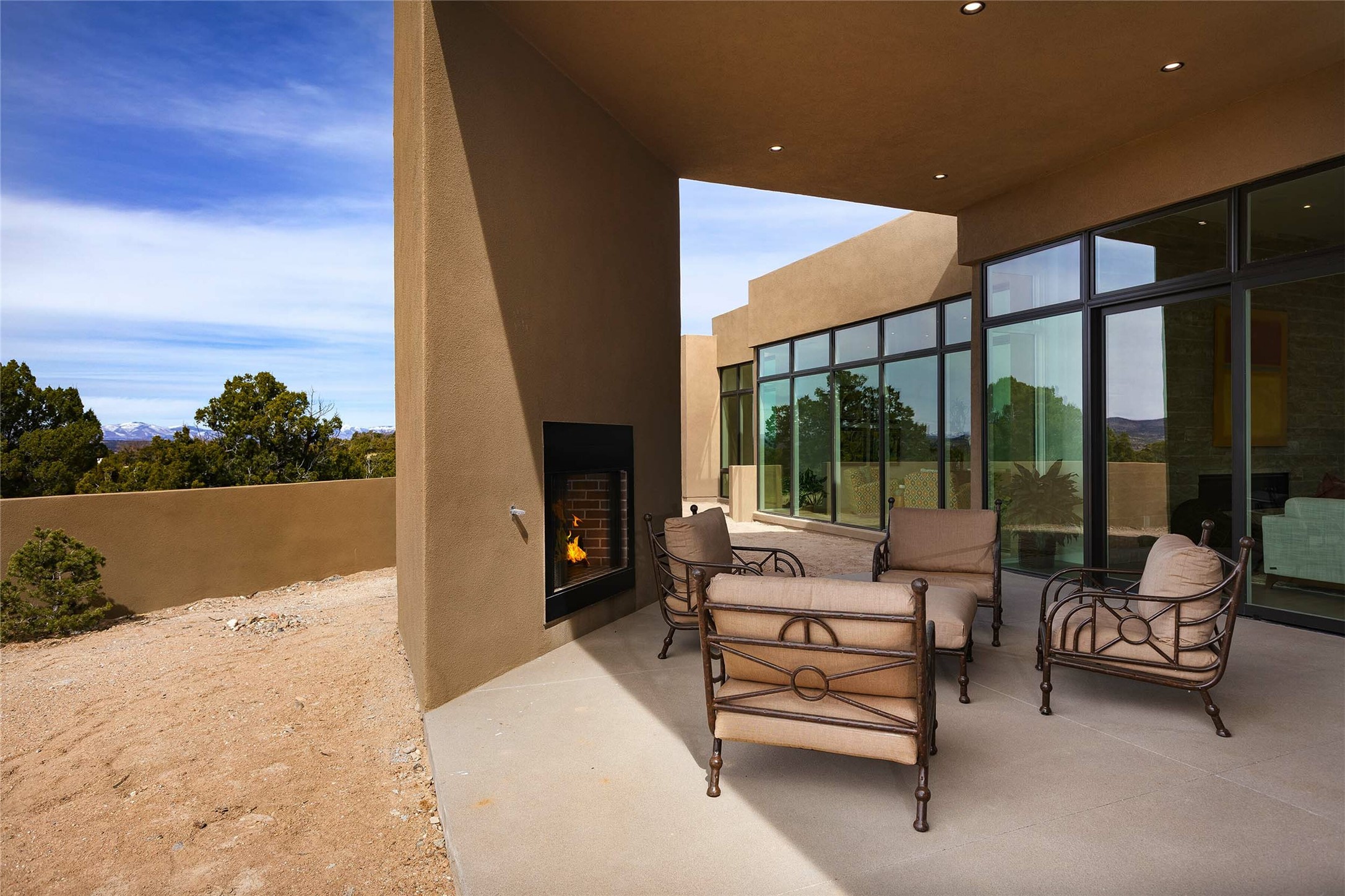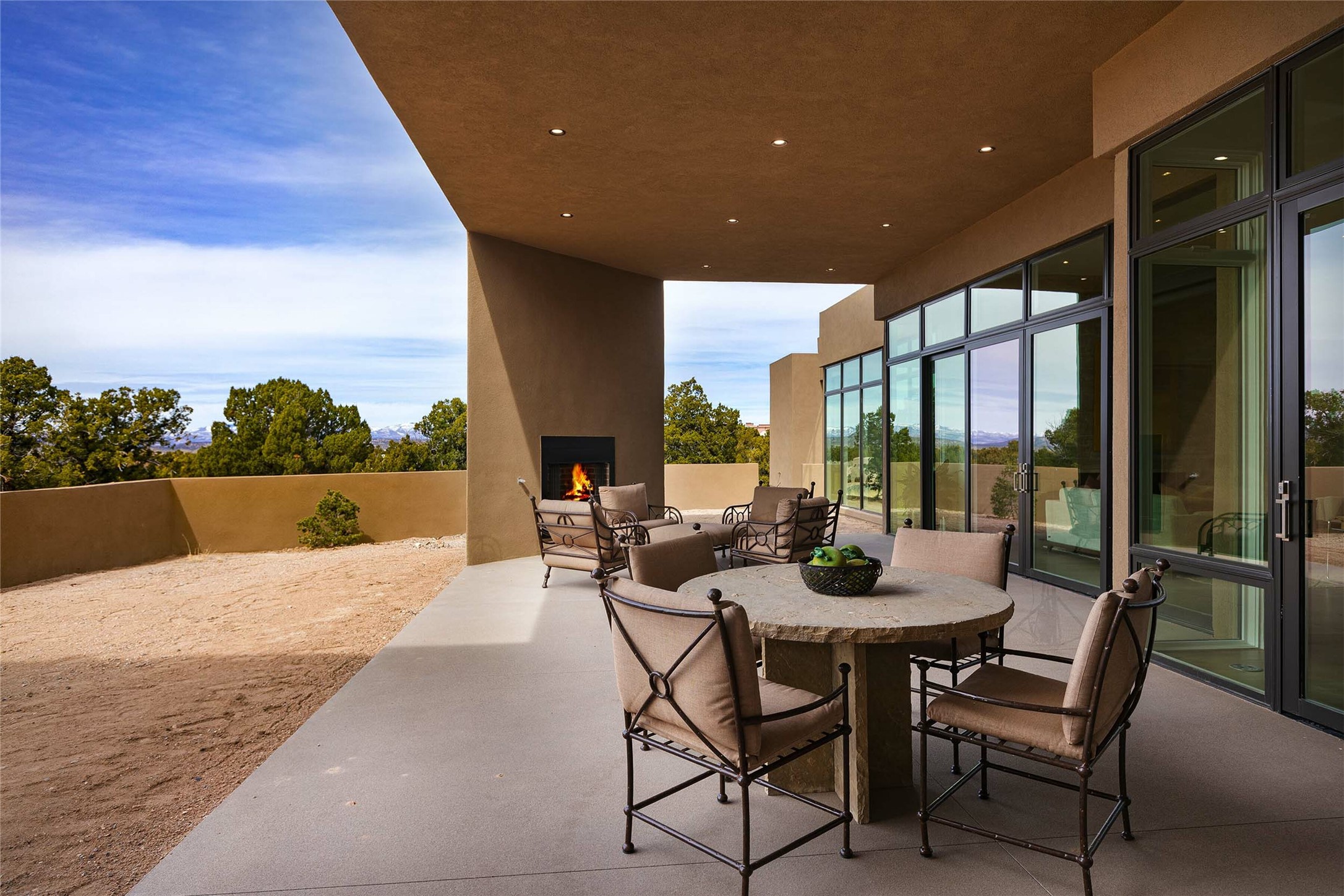 Exceptional new construction in Las Campanas, move-in ready within 30 days! Designed by the acclaimed Hoopes + Associates, this contemporary masterpiece impresses with powerful architecture and luxury designer finishes. Walking distance to The Las Campanas Hacienda Clubhouse and across the street from The Las Campanas Spa, Swim and Tennis Center, this stunning single level residence with Jemez and Sangre de Cristo mountain views was designed to embrace the ultimate indoor and outdoor living experience and capture the true essence of the Santa Fe lifestyle. Design features include a grand living room and formal dining area complete with a modern gas fireplace framed by stacked stone and a wall of sliding glass doors which frame the Jemez and sunset views, which lead out to the back entertainment area and fireplace. The state-of-the-art island kitchen stuns with luxury finishes, custom cabinetry and Wolf/Subzero appliances and opens to a casual living room with a fireplace. The private owner's suite offers a gas fireplace, views, portal access, and the ultimate spa-like bath and massive walk-in closet. Separated from the main living area is an independent guest wing complete with 2 ensuite bedrooms, each with their private entrance and a large media room or art studio. Additional features include a spacious pantry, 3 car garage, a built-in BBQ, stacked stone entrance wall, wood flooring, crisp white plaster walls, and luxury finishes throughout!