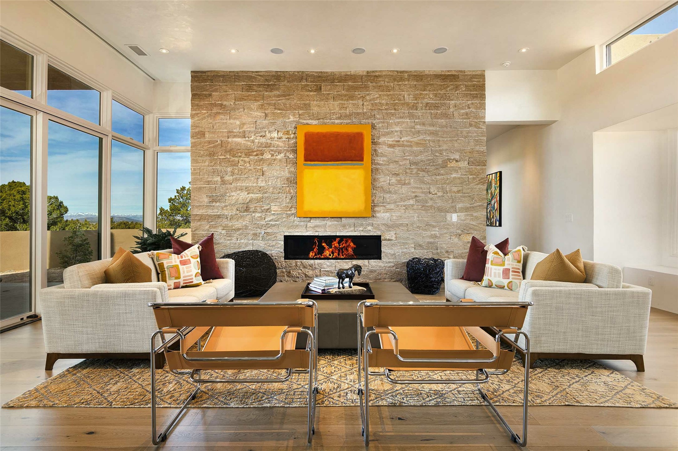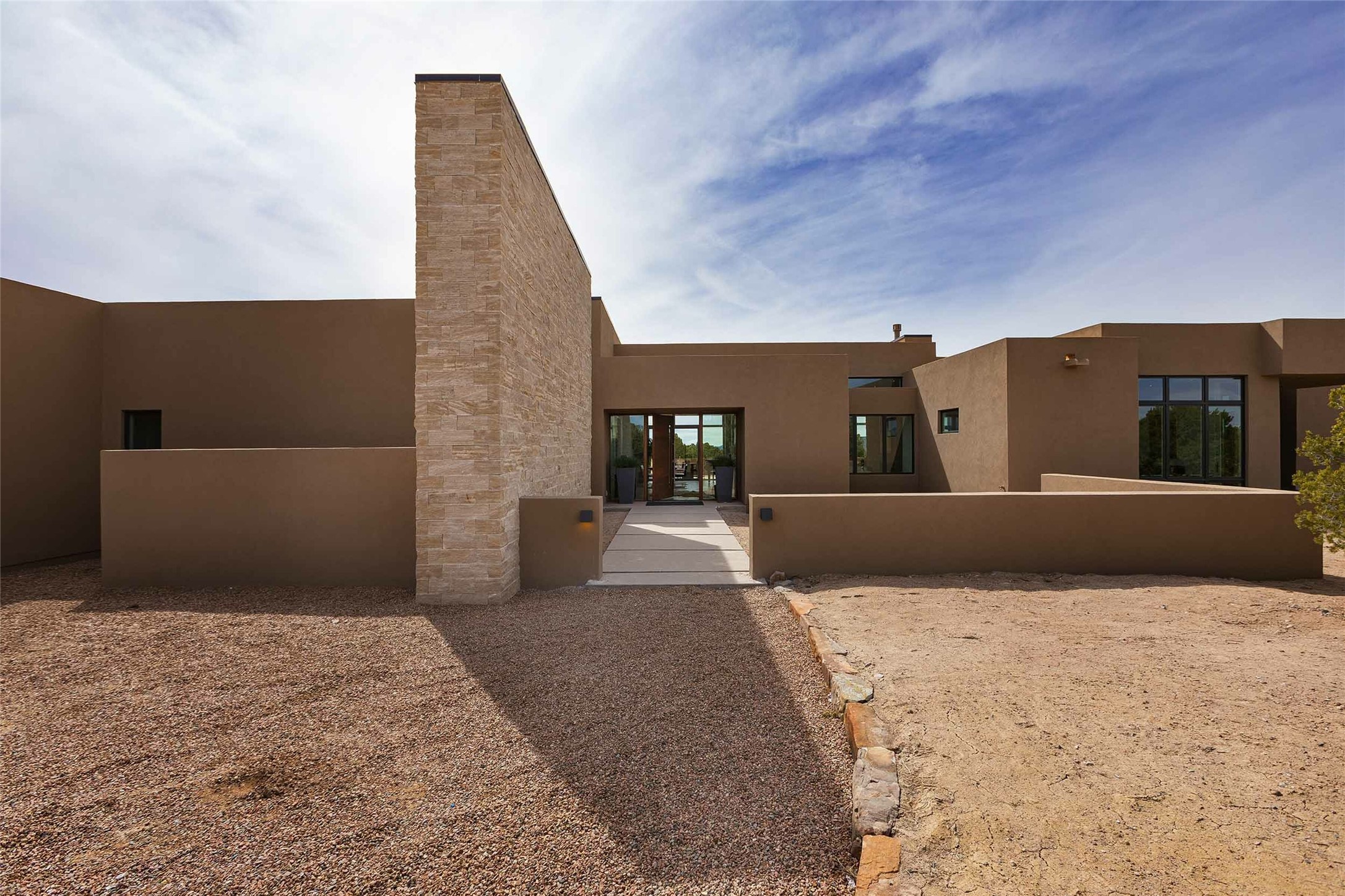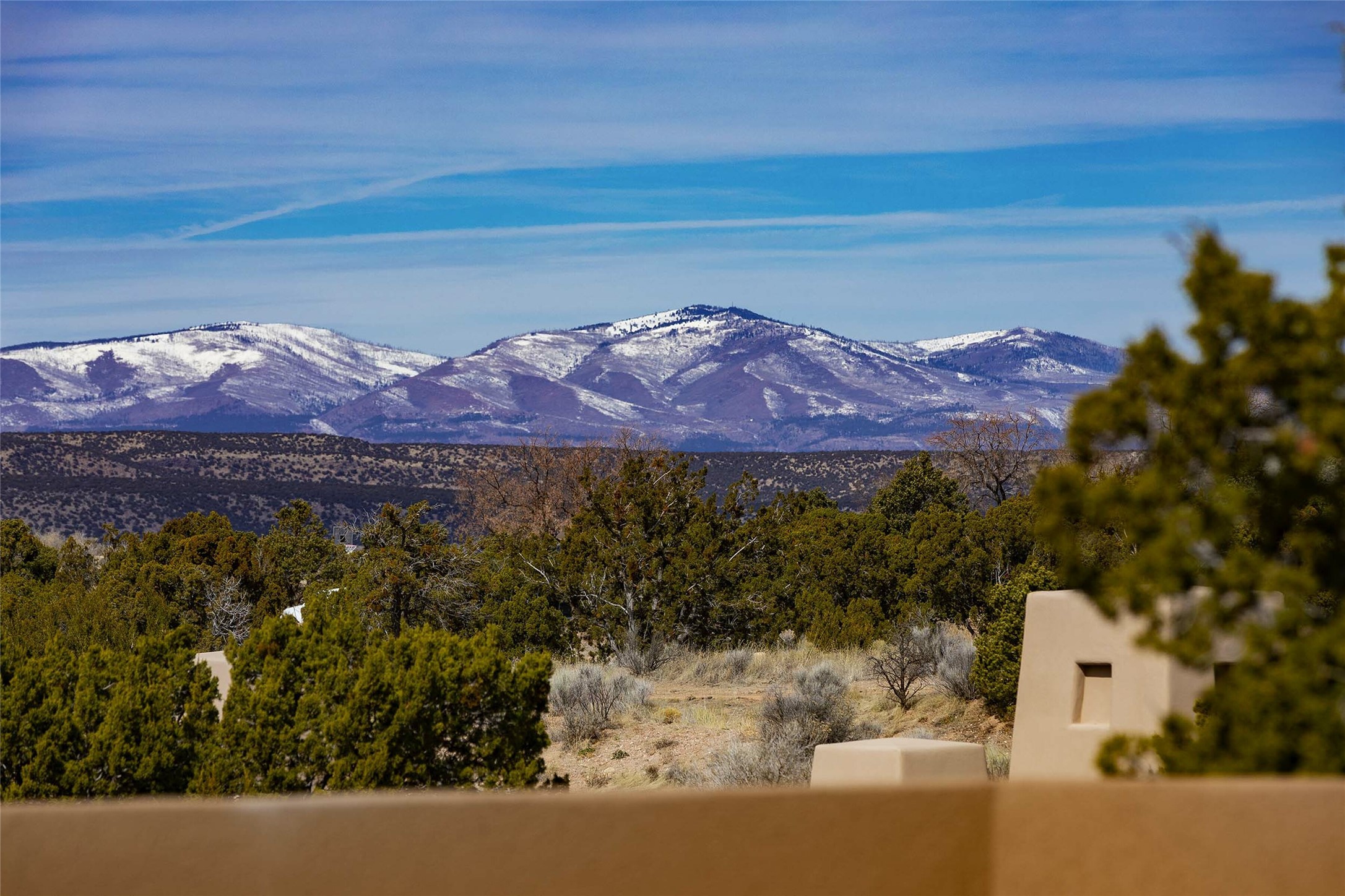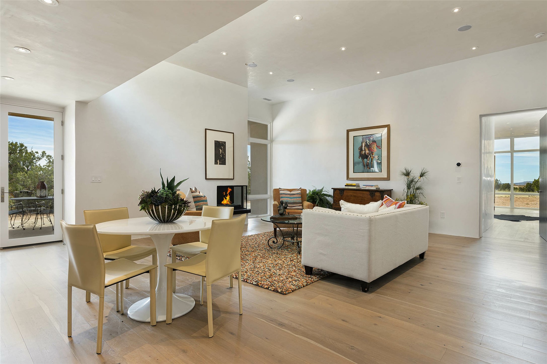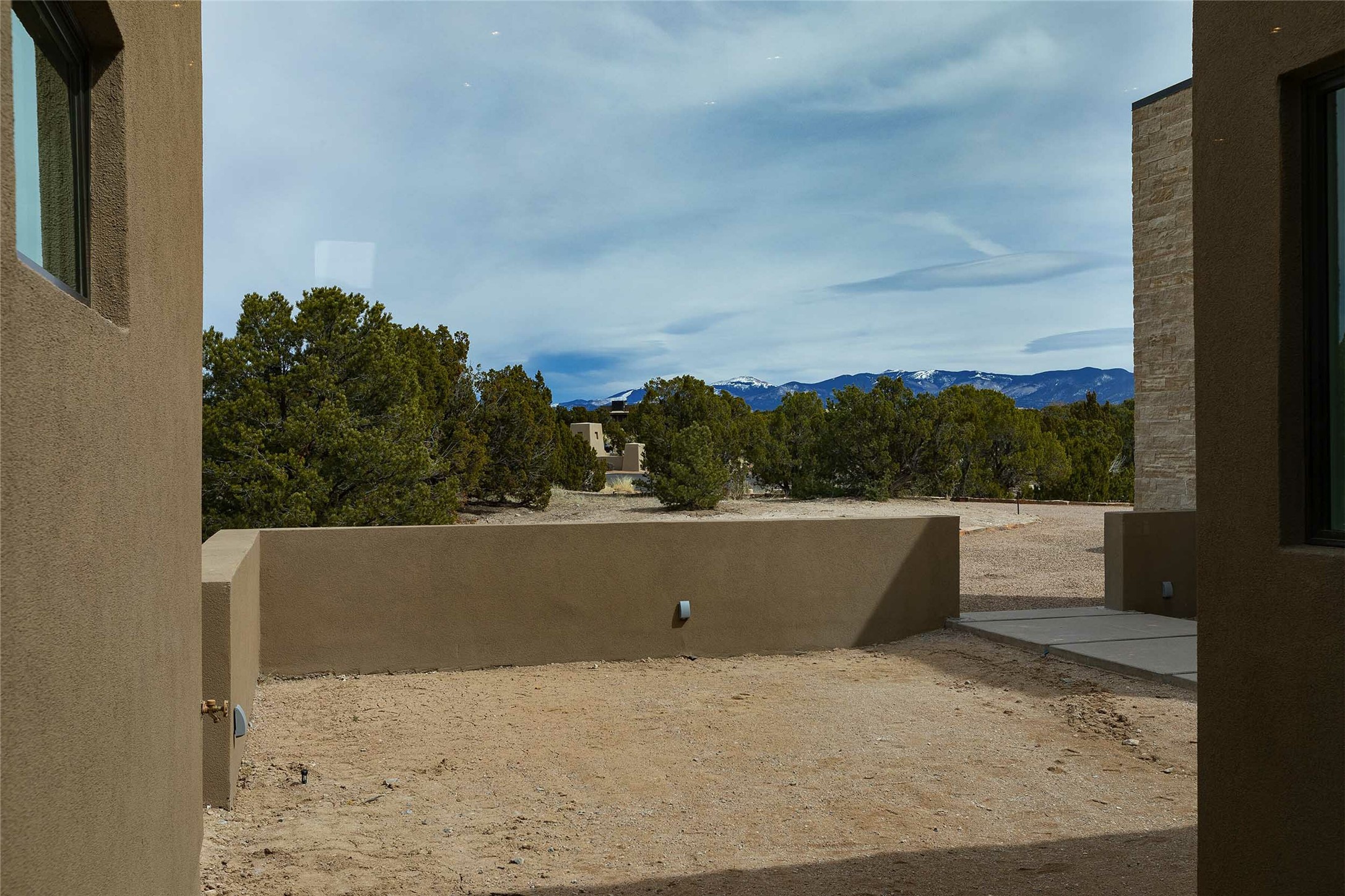 Exceptional new construction in Las Campanas, move-in ready within 30 days! Designed by the acclaimed Hoopes + Associates, this contemporary masterpiece impresses with powerful architecture and luxury designer finishes. Walking distance to The Las Campanas Hacienda Clubhouse and across the street from The Las Campanas Spa, Swim and Tennis Center, this stunning single level residence with Jemez and Sangre de Cristo mountain views was designed to embrace the ultimate indoor and outdoor living experience and capture the true essence of the Santa Fe lifestyle. Design features include a grand living room and formal dining area complete with a modern gas fireplace framed by stacked stone and a wall of sliding glass doors which frame the Jemez and sunset views, which lead out to the back entertainment area and fireplace. The state-of-the-art island kitchen stuns with luxury finishes, custom cabinetry and Wolf/Subzero appliances and opens to a casual living room with a fireplace. The private owner's suite offers a gas fireplace, views, portal access, and the ultimate spa-like bath and massive walk-in closet. Separated from the main living area is an independent guest wing complete with 2 ensuite bedrooms, each with their private entrance and a large media room or art studio. Additional features include a spacious pantry, 3 car garage, a built-in BBQ, stacked stone entrance wall, wood flooring, crisp white plaster walls, and luxury finishes throughout!