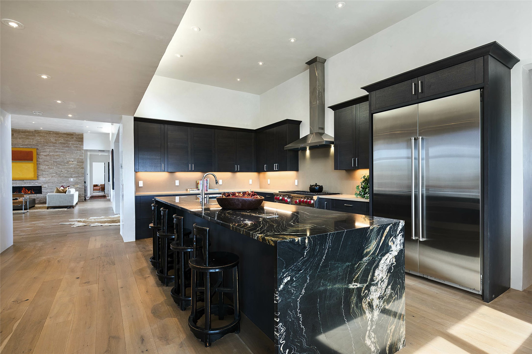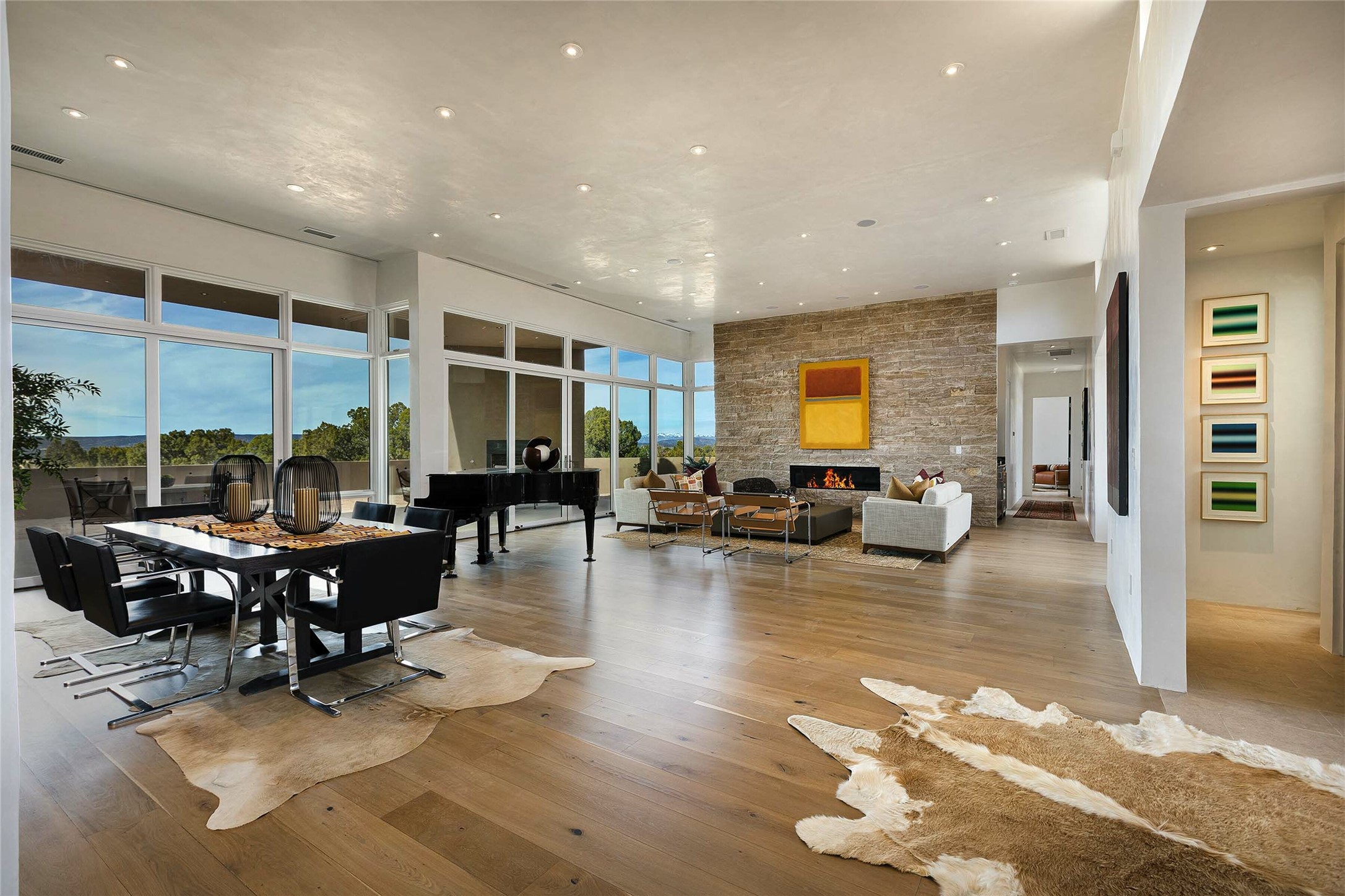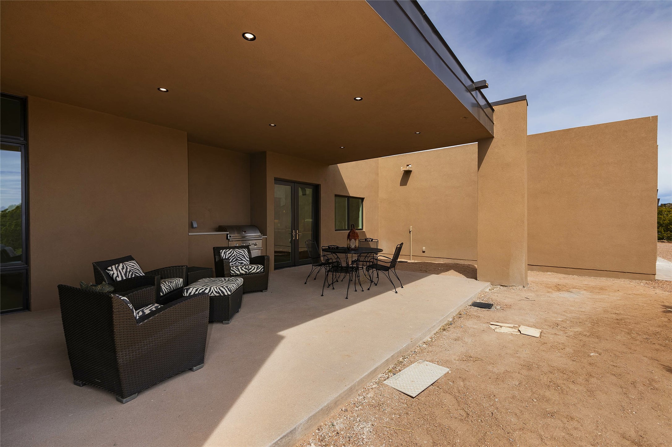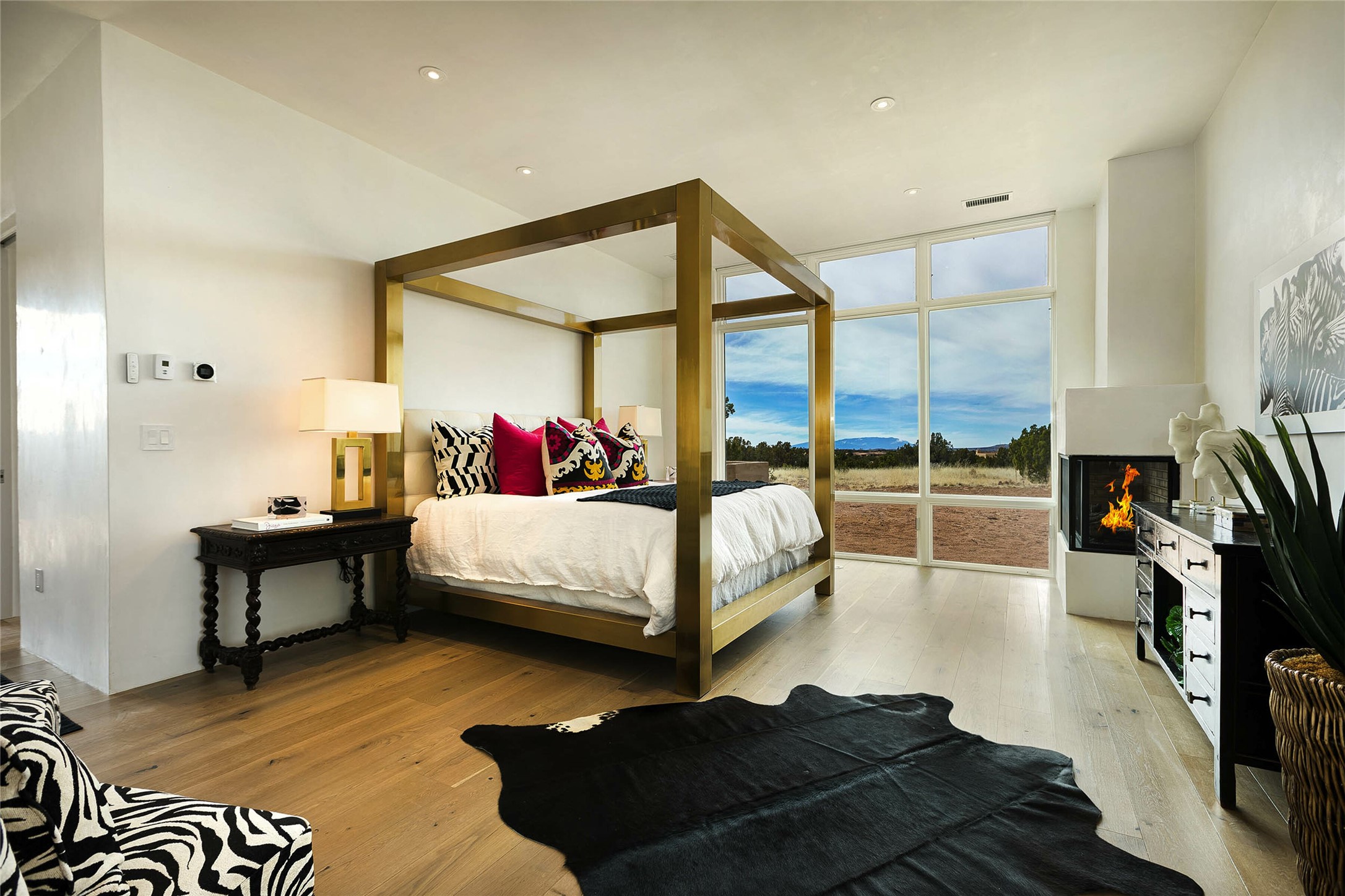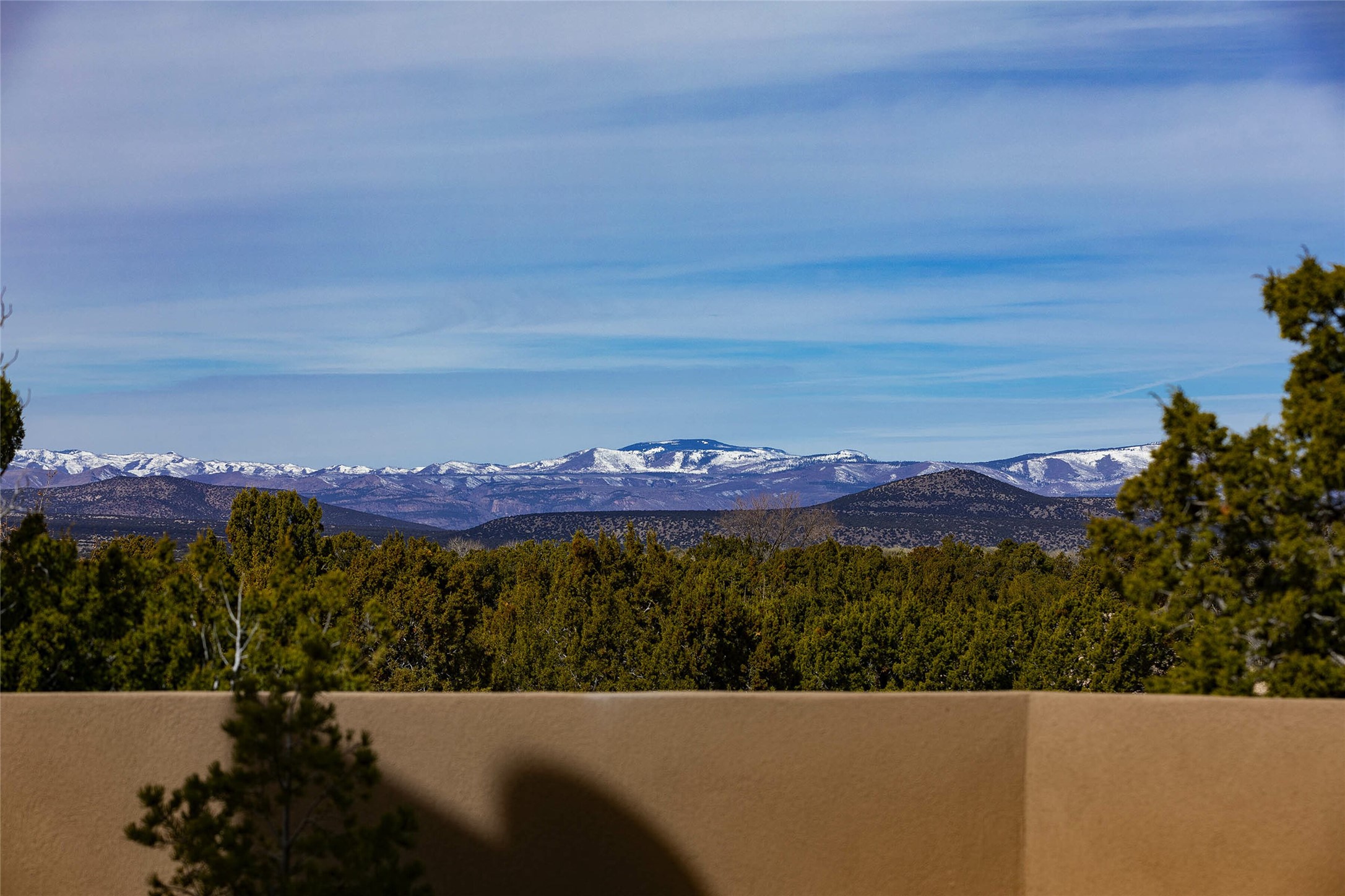 Exceptional new construction in Las Campanas, move-in ready within 30 days! Designed by the acclaimed Hoopes + Associates, this contemporary masterpiece impresses with powerful architecture and luxury designer finishes. Walking distance to The Las Campanas Hacienda Clubhouse and across the street from The Las Campanas Spa, Swim and Tennis Center, this stunning single level residence with Jemez and Sangre de Cristo mountain views was designed to embrace the ultimate indoor and outdoor living experience and capture the true essence of the Santa Fe lifestyle. Design features include a grand living room and formal dining area complete with a modern gas fireplace framed by stacked stone and a wall of sliding glass doors which frame the Jemez and sunset views, which lead out to the back entertainment area and fireplace. The state-of-the-art island kitchen stuns with luxury finishes, custom cabinetry and Wolf/Subzero appliances and opens to a casual living room with a fireplace. The private owner's suite offers a gas fireplace, views, portal access, and the ultimate spa-like bath and massive walk-in closet. Separated from the main living area is an independent guest wing complete with 2 ensuite bedrooms, each with their private entrance and a large media room or art studio. Additional features include a spacious pantry, 3 car garage, a built-in BBQ, stacked stone entrance wall, wood flooring, crisp white plaster walls, and luxury finishes throughout!