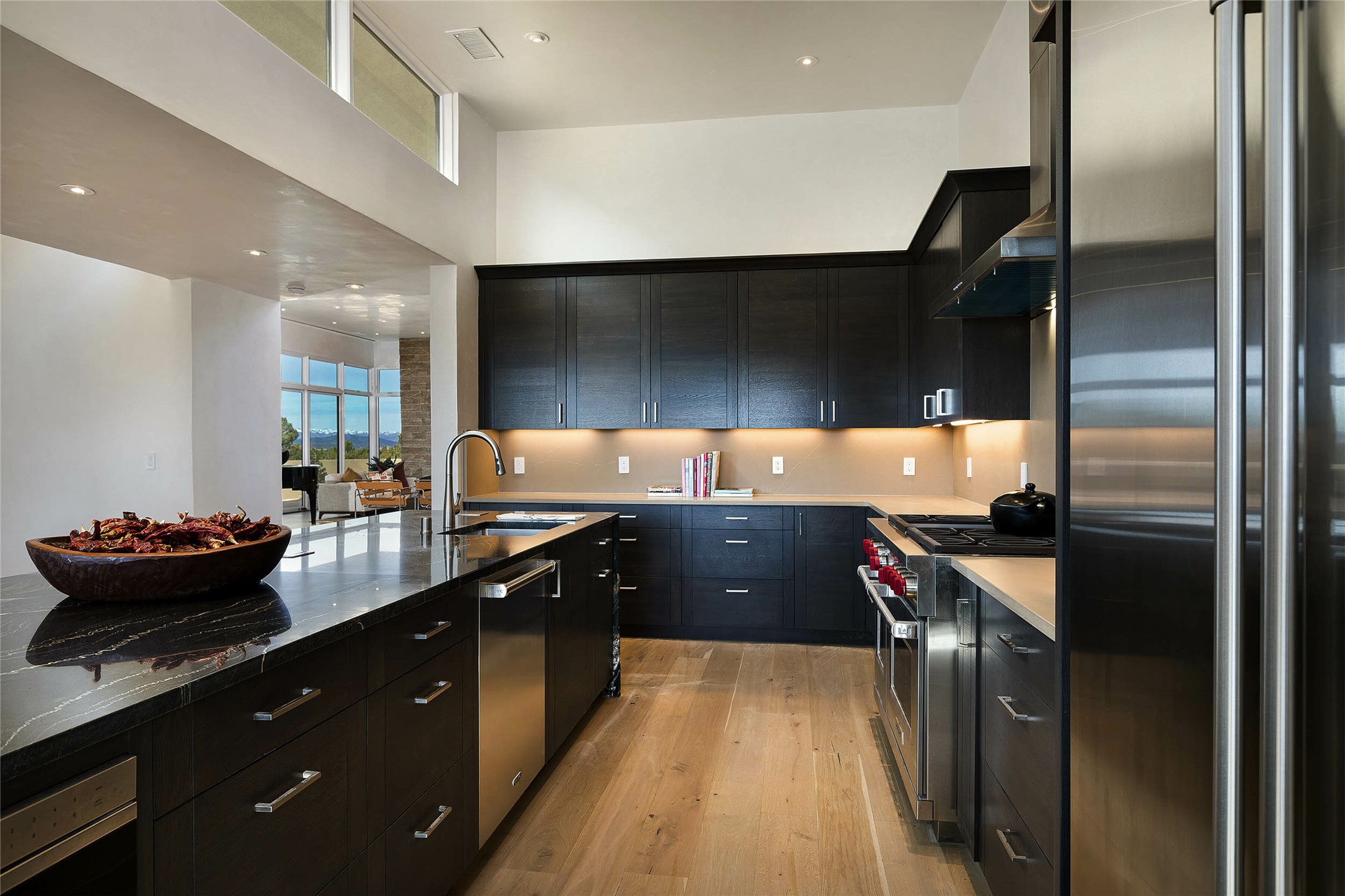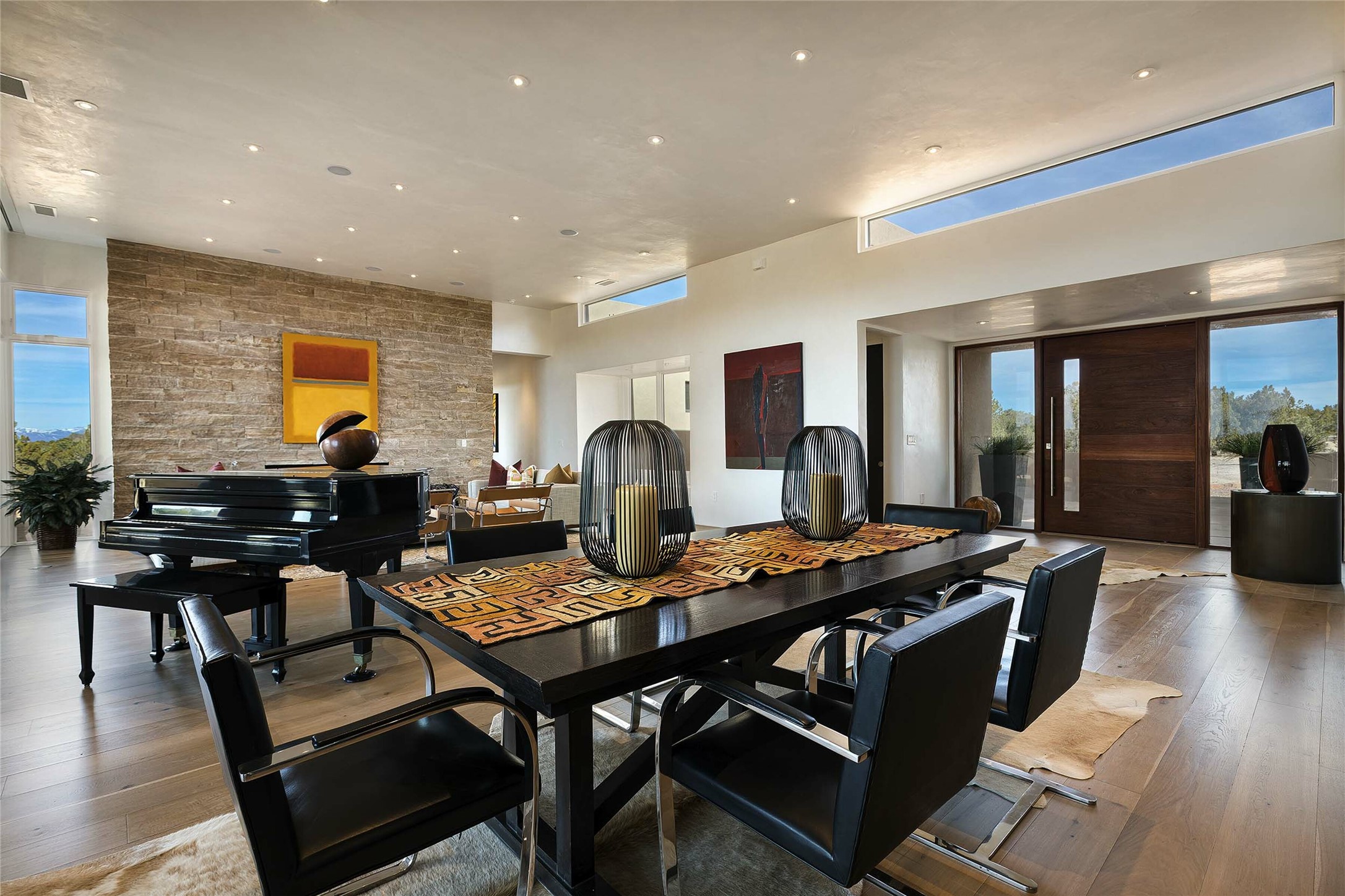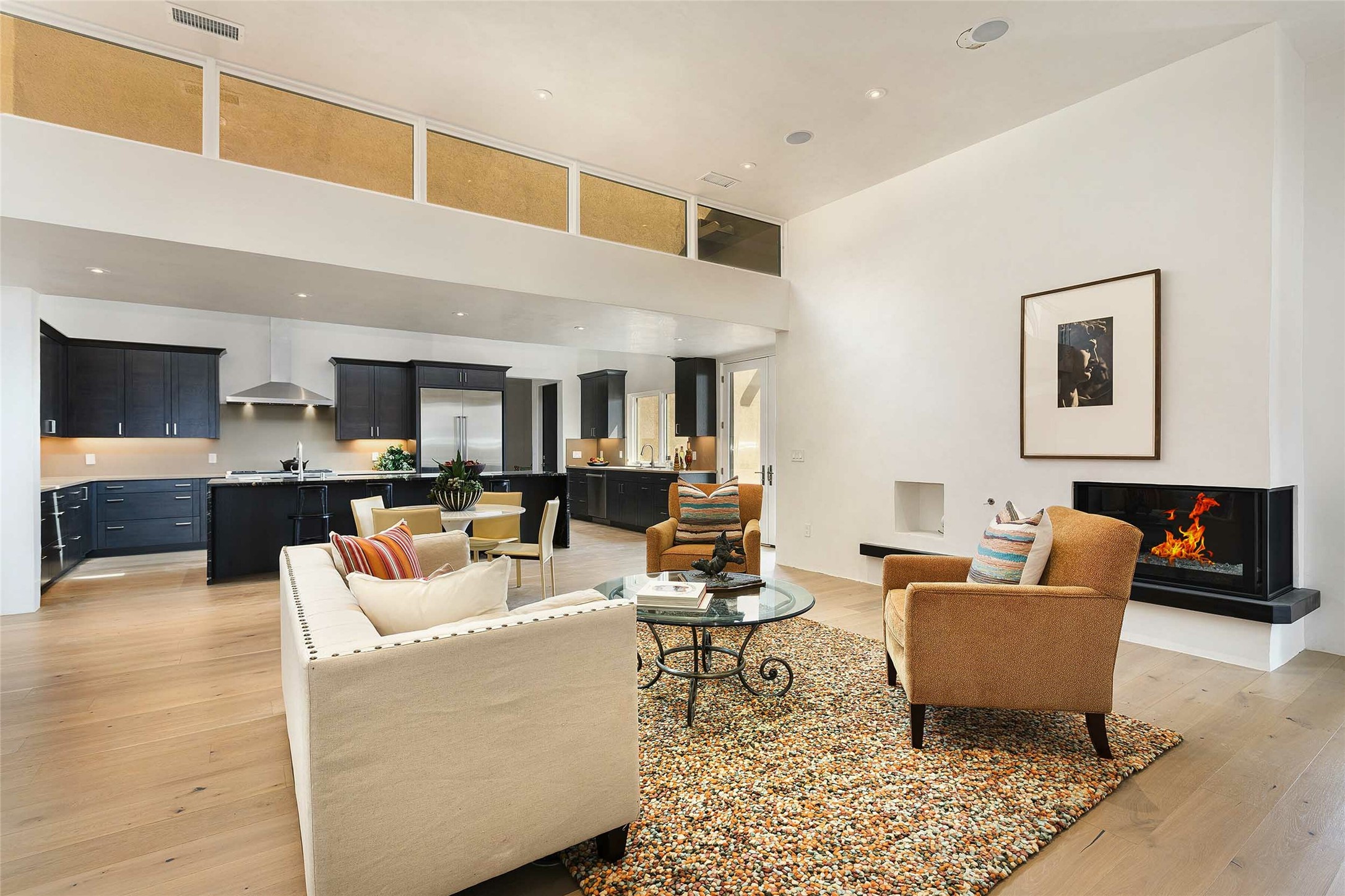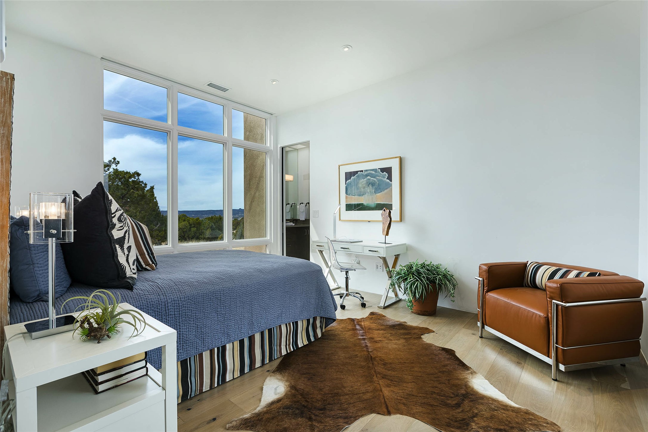 Exceptional new construction in Las Campanas, move-in ready within 30 days! Designed by the acclaimed Hoopes + Associates, this contemporary masterpiece impresses with powerful architecture and luxury designer finishes. Walking distance to The Las Campanas Hacienda Clubhouse and across the street from The Las Campanas Spa, Swim and Tennis Center, this stunning single level residence with Jemez and Sangre de Cristo mountain views was designed to embrace the ultimate indoor and outdoor living experience and capture the true essence of the Santa Fe lifestyle. Design features include a grand living room and formal dining area complete with a modern gas fireplace framed by stacked stone and a wall of sliding glass doors which frame the Jemez and sunset views, which lead out to the back entertainment area and fireplace. The state-of-the-art island kitchen stuns with luxury finishes, custom cabinetry and Wolf/Subzero appliances and opens to a casual living room with a fireplace. The private owner's suite offers a gas fireplace, views, portal access, and the ultimate spa-like bath and massive walk-in closet. Separated from the main living area is an independent guest wing complete with 2 ensuite bedrooms, each with their private entrance and a large media room or art studio. Additional features include a spacious pantry, 3 car garage, a built-in BBQ, stacked stone entrance wall, wood flooring, crisp white plaster walls, and luxury finishes throughout!