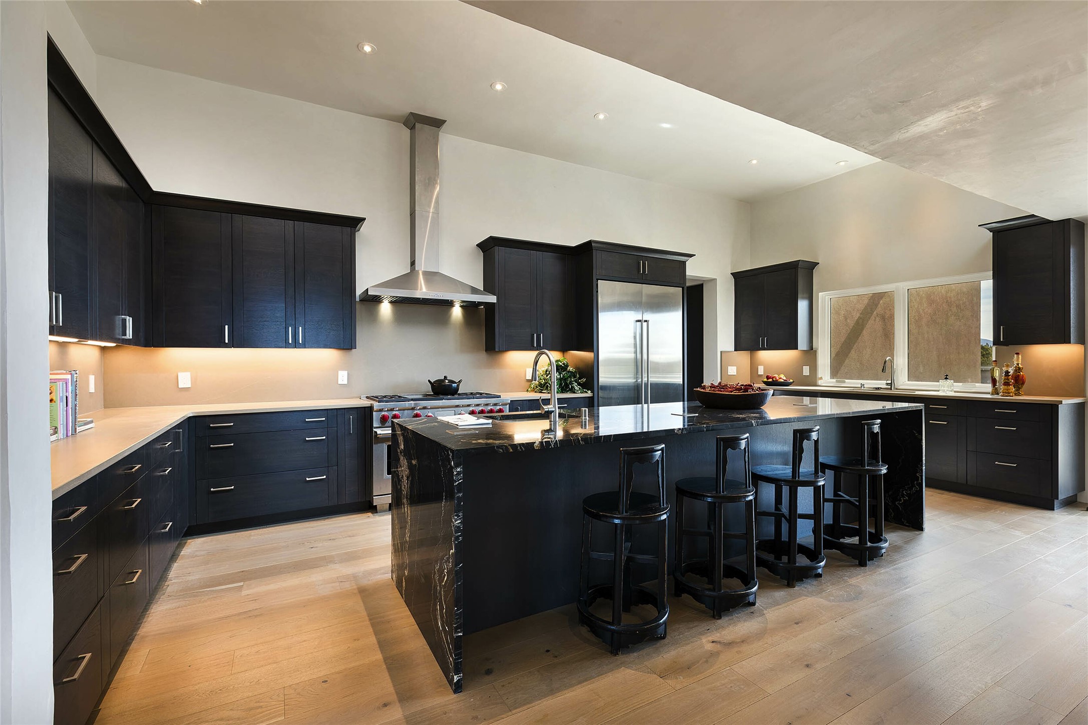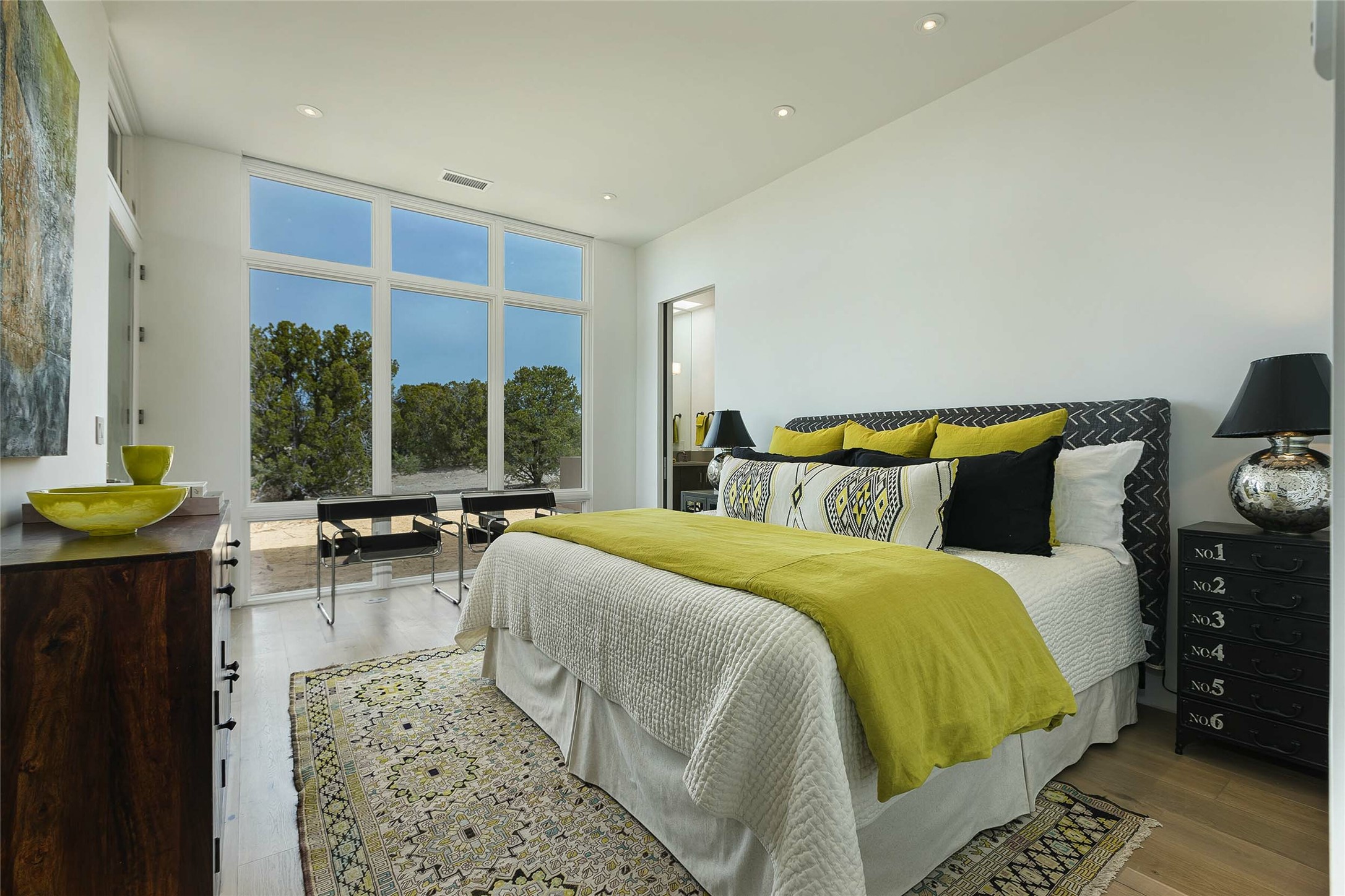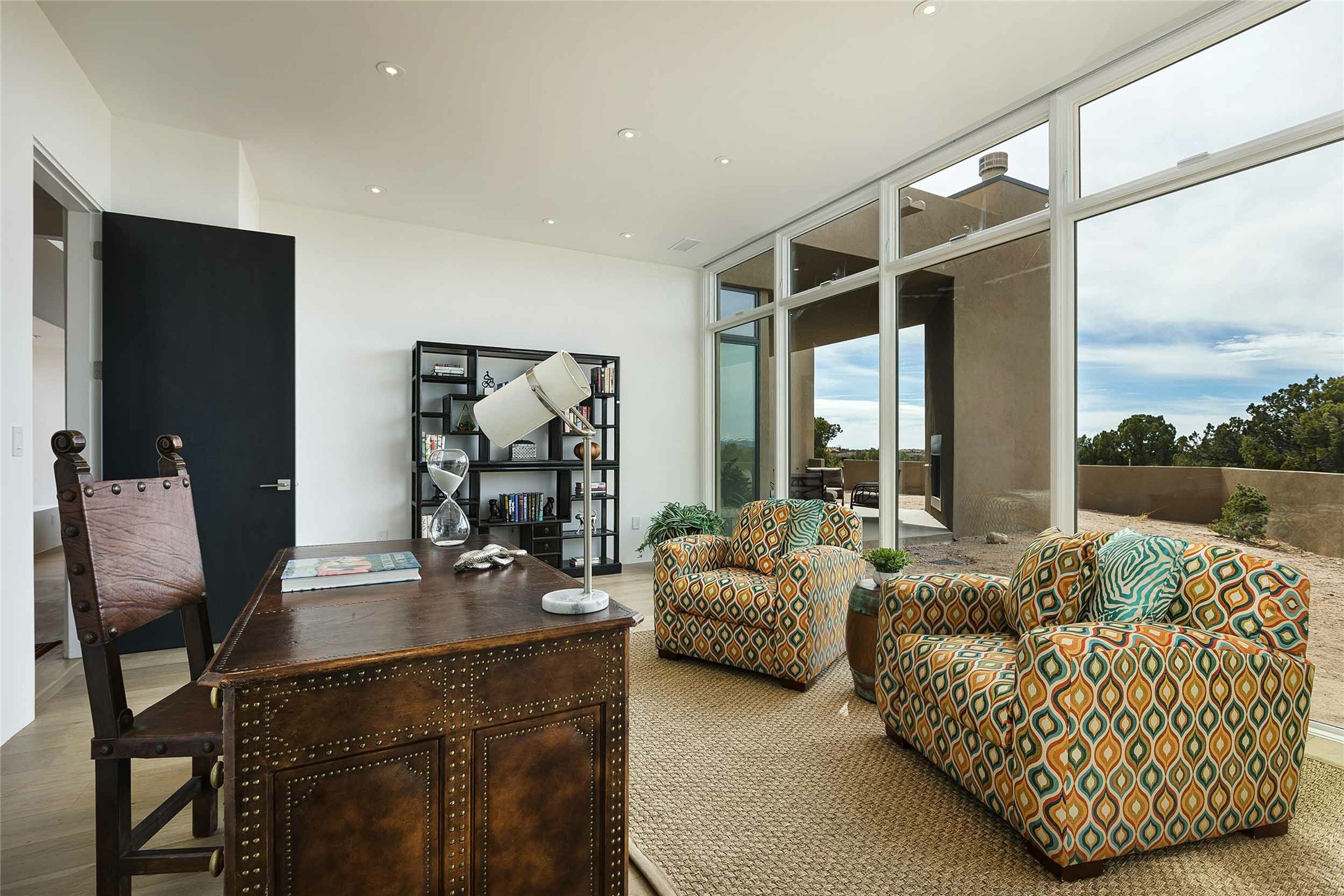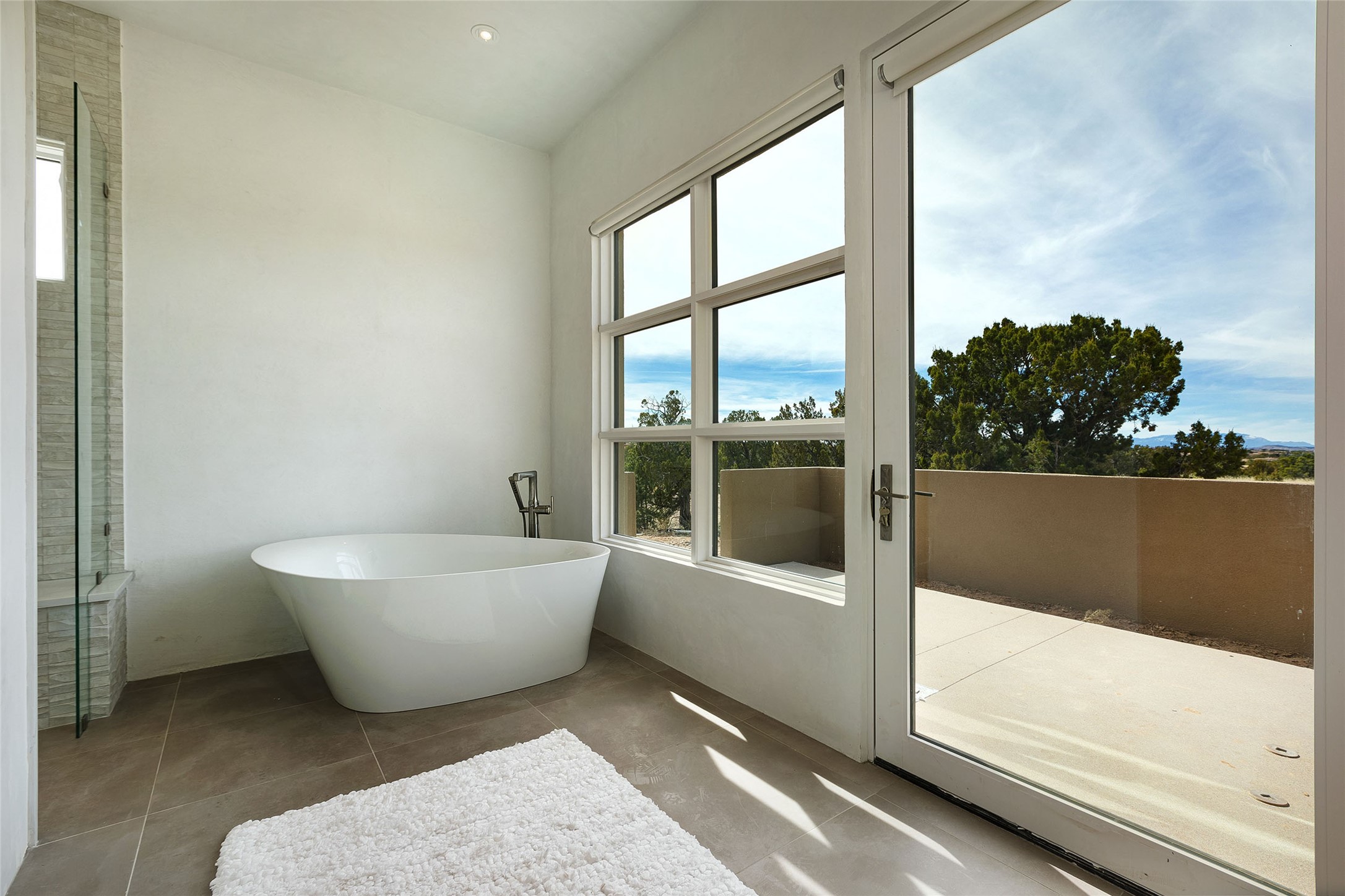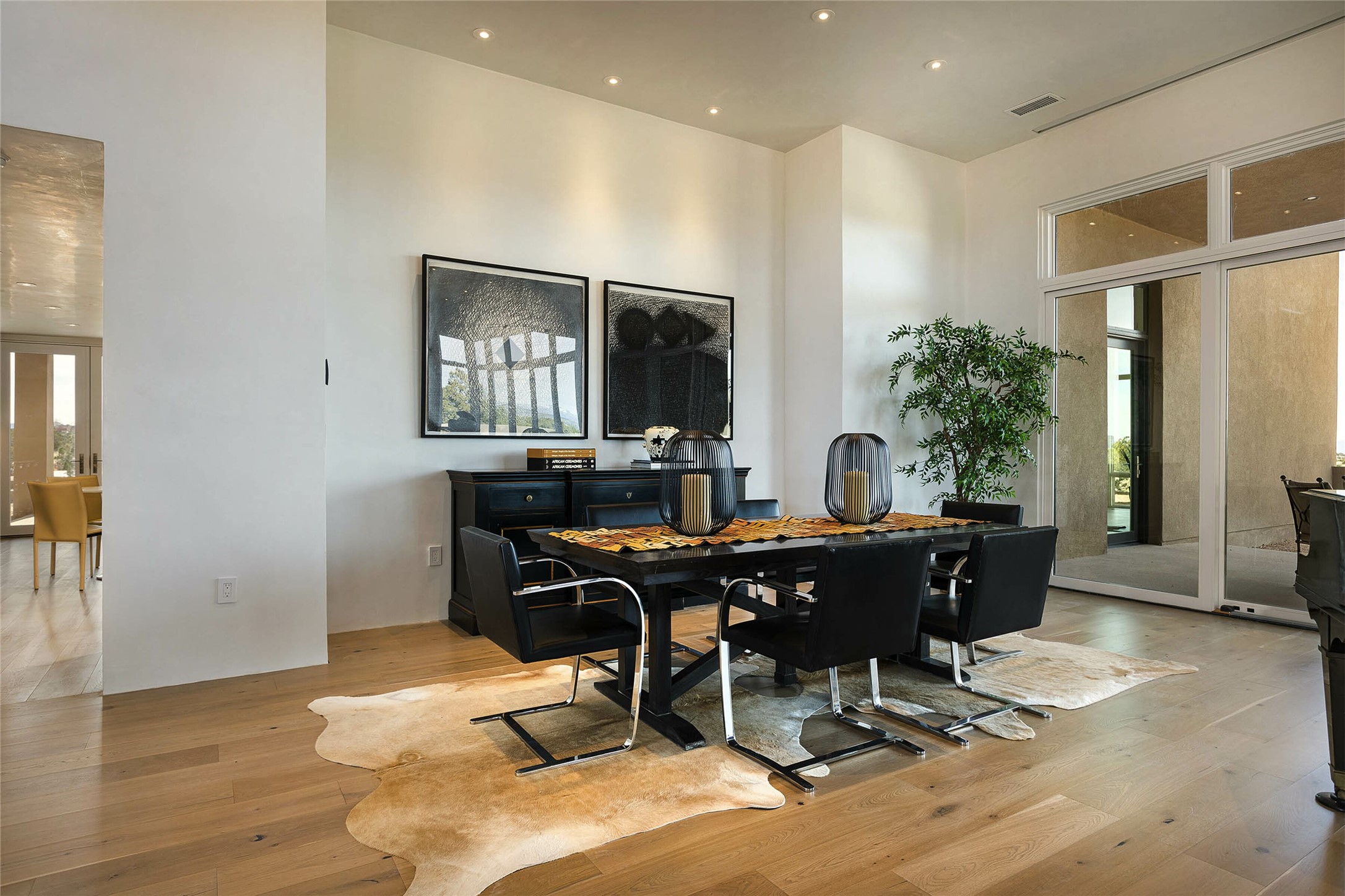 Exceptional new construction in Las Campanas, move-in ready within 30 days! Designed by the acclaimed Hoopes + Associates, this contemporary masterpiece impresses with powerful architecture and luxury designer finishes. Walking distance to The Las Campanas Hacienda Clubhouse and across the street from The Las Campanas Spa, Swim and Tennis Center, this stunning single level residence with Jemez and Sangre de Cristo mountain views was designed to embrace the ultimate indoor and outdoor living experience and capture the true essence of the Santa Fe lifestyle. Design features include a grand living room and formal dining area complete with a modern gas fireplace framed by stacked stone and a wall of sliding glass doors which frame the Jemez and sunset views, which lead out to the back entertainment area and fireplace. The state-of-the-art island kitchen stuns with luxury finishes, custom cabinetry and Wolf/Subzero appliances and opens to a casual living room with a fireplace. The private owner's suite offers a gas fireplace, views, portal access, and the ultimate spa-like bath and massive walk-in closet. Separated from the main living area is an independent guest wing complete with 2 ensuite bedrooms, each with their private entrance and a large media room or art studio. Additional features include a spacious pantry, 3 car garage, a built-in BBQ, stacked stone entrance wall, wood flooring, crisp white plaster walls, and luxury finishes throughout!