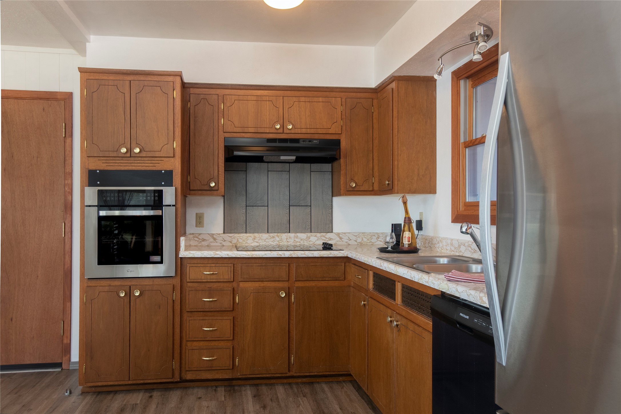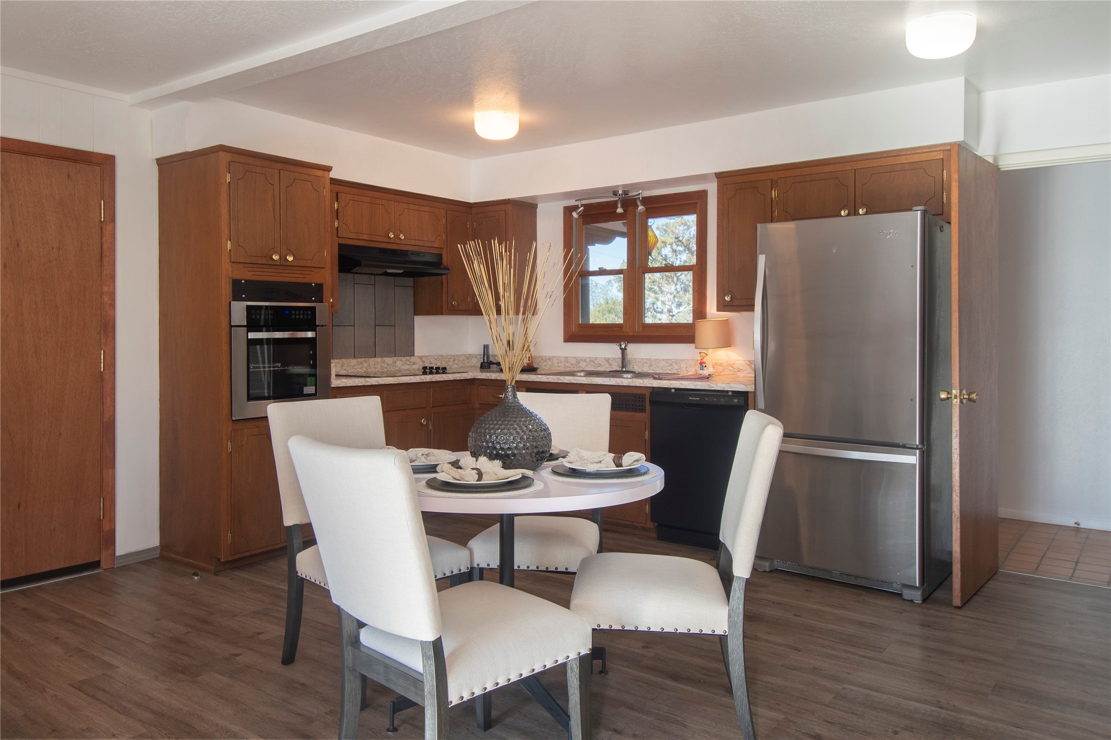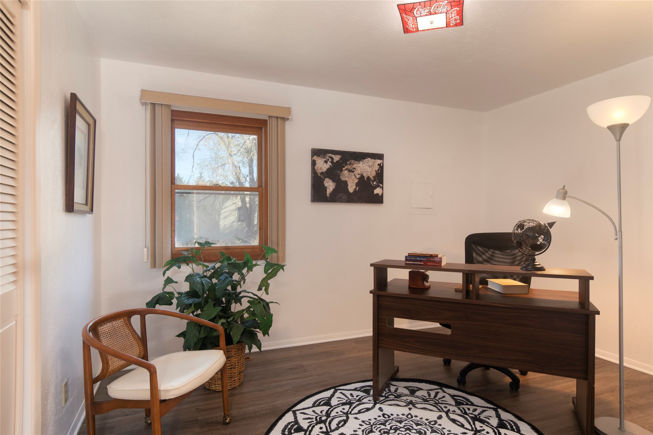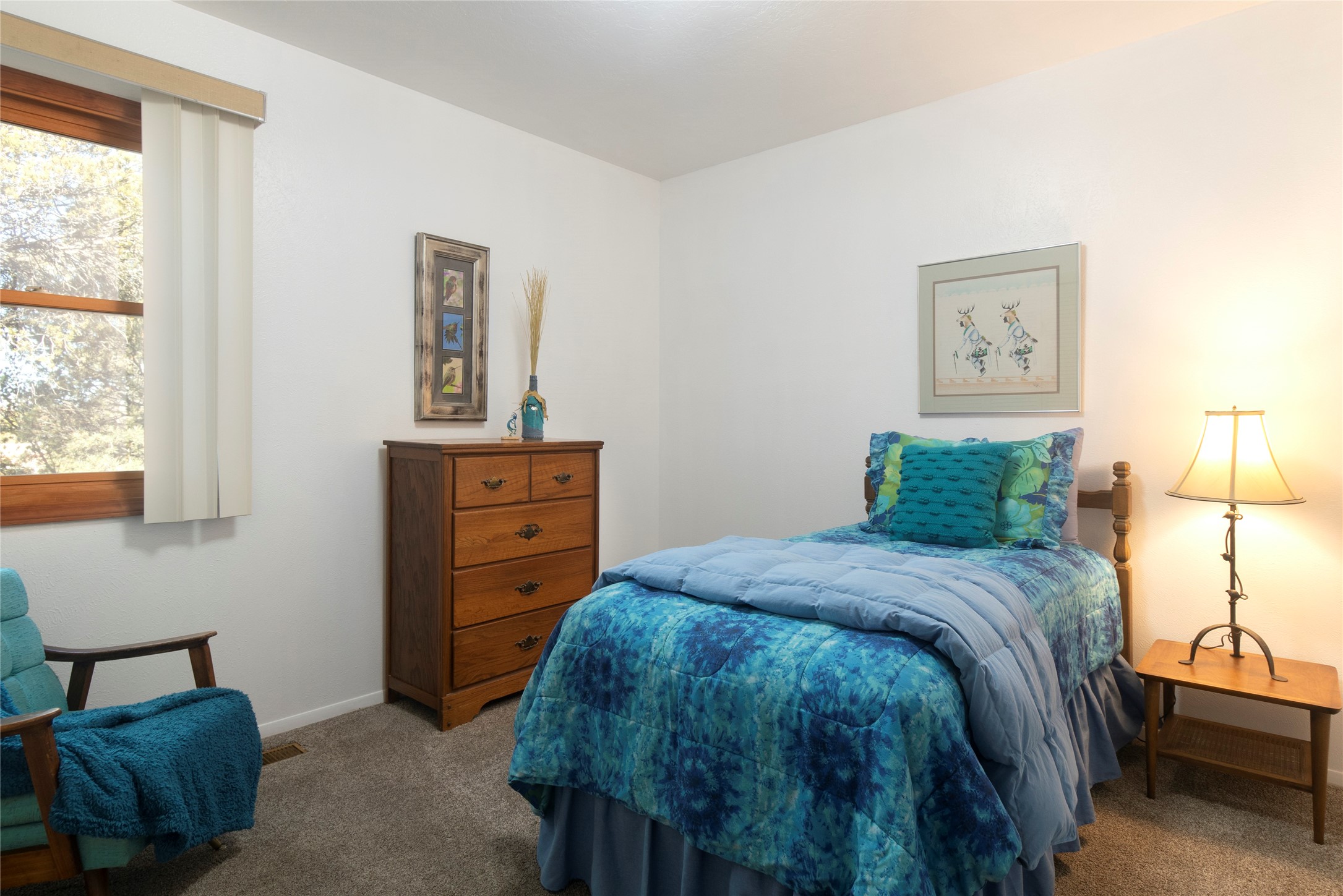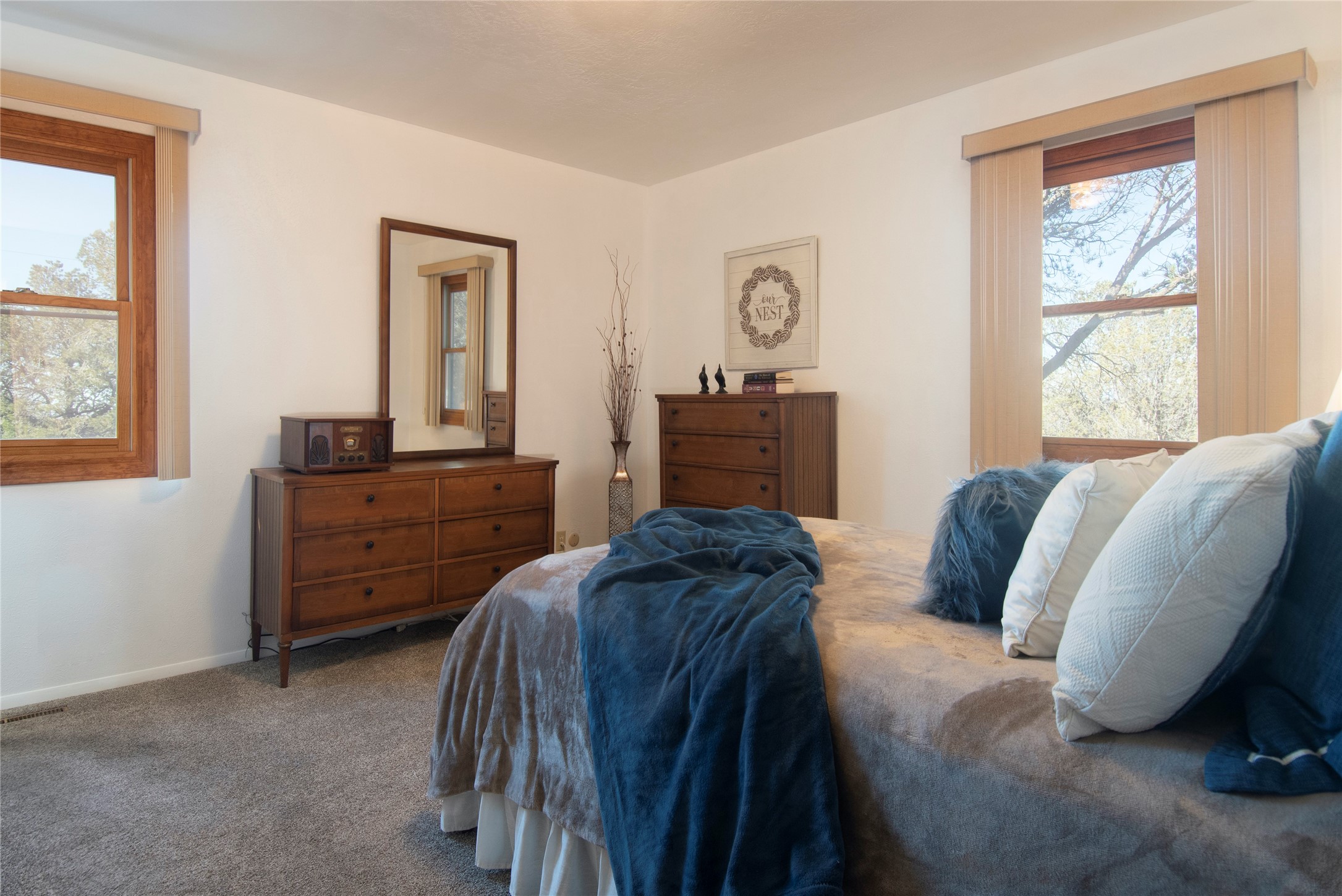 This lovely, single level home with attached garage was built in 1964 by Allan Stamm and features the best of period design. Sited on a spacious corner lot in the desirable subdivision of Arroyo Chamisa, the lot is quite large offering numerous possibilities. The entry portal is traditional with post and beam, but inside there is a shift towards modern design. A hallway leads to the kitchen with Danish Modern wooden cabinets and stainless appliances. Off to the side is a laundry area. The length of the kitchen is open to the great room with clean lines, wooden floors and lovely windows framed in wood. A dining area offers a brick wall and fireplace and is large enough to have a sitting area in front of it and a separate dining area closer to the kitchen. There are 3 bedrooms down a hallway with a full bath and a master suite with 3/4 bath across the hall. Nicely located near the foothills of Santa Fe, the mountain views are stunning here. Just minutes from restaurants, galleries, shops, this home is a genuine gem. In keeping with the design basics and the simplicity of the form follows function approach, the house is beautifully understated, well-designed, and well-executed, providing comfort and convenience to anyone who calls it home.