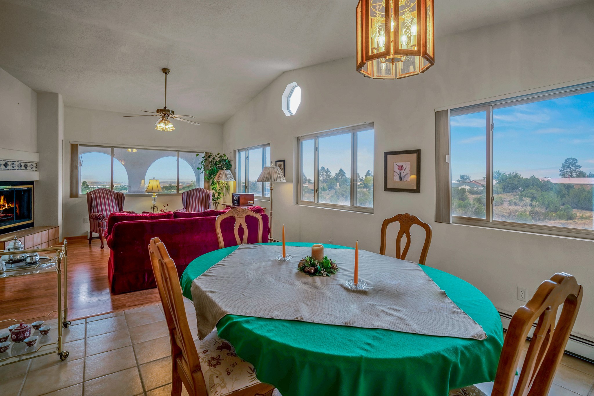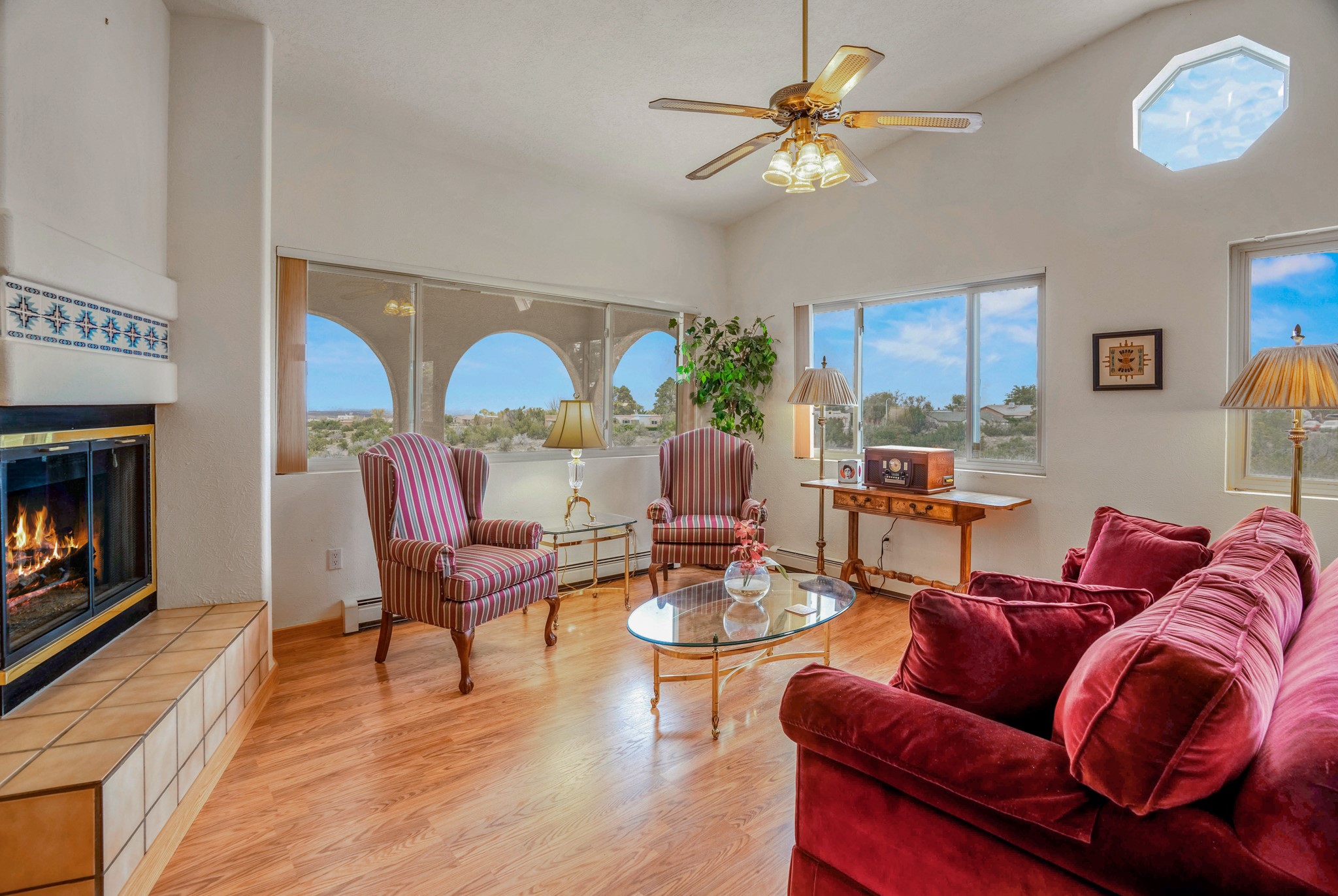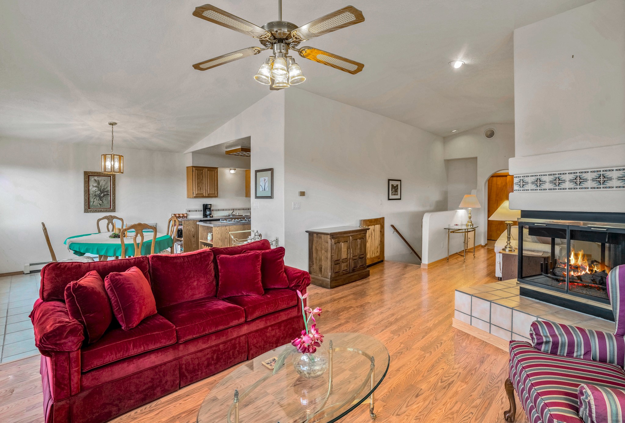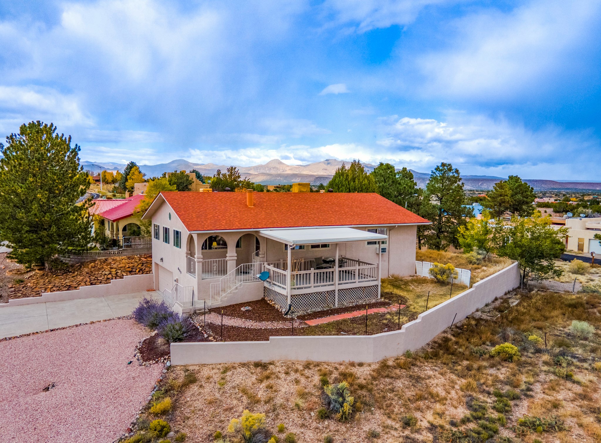 A different view out the windows - Cochiti Lake and the expansive vistas that surround! Lots of windows and high ceilings welcome you to this bright, two-story home with three bedrooms and two baths upstairs along with living room, dining room and kitchen. The three-sided fireplace centers the living space with inviting warmth. Downstairs has a bonus room and a large laundry room. Enjoy summer evenings on the covered portal with views for peaceful enjoyment. Subject to a land lease agreement.