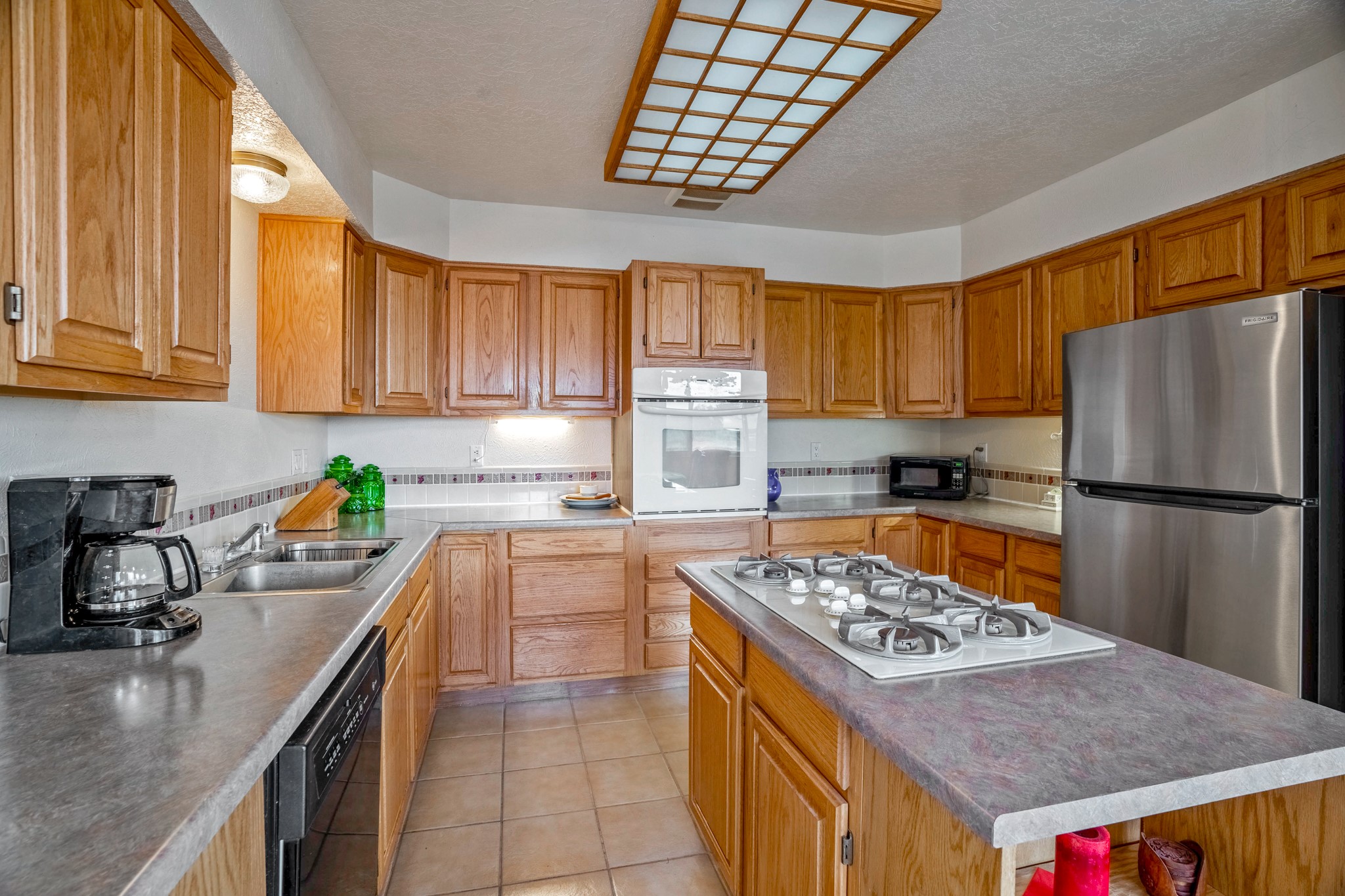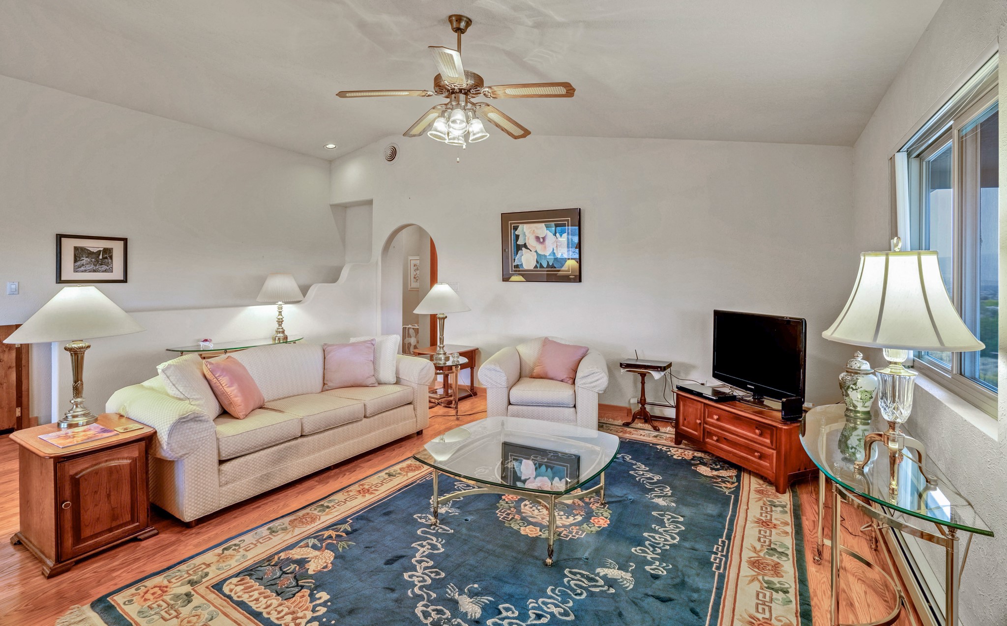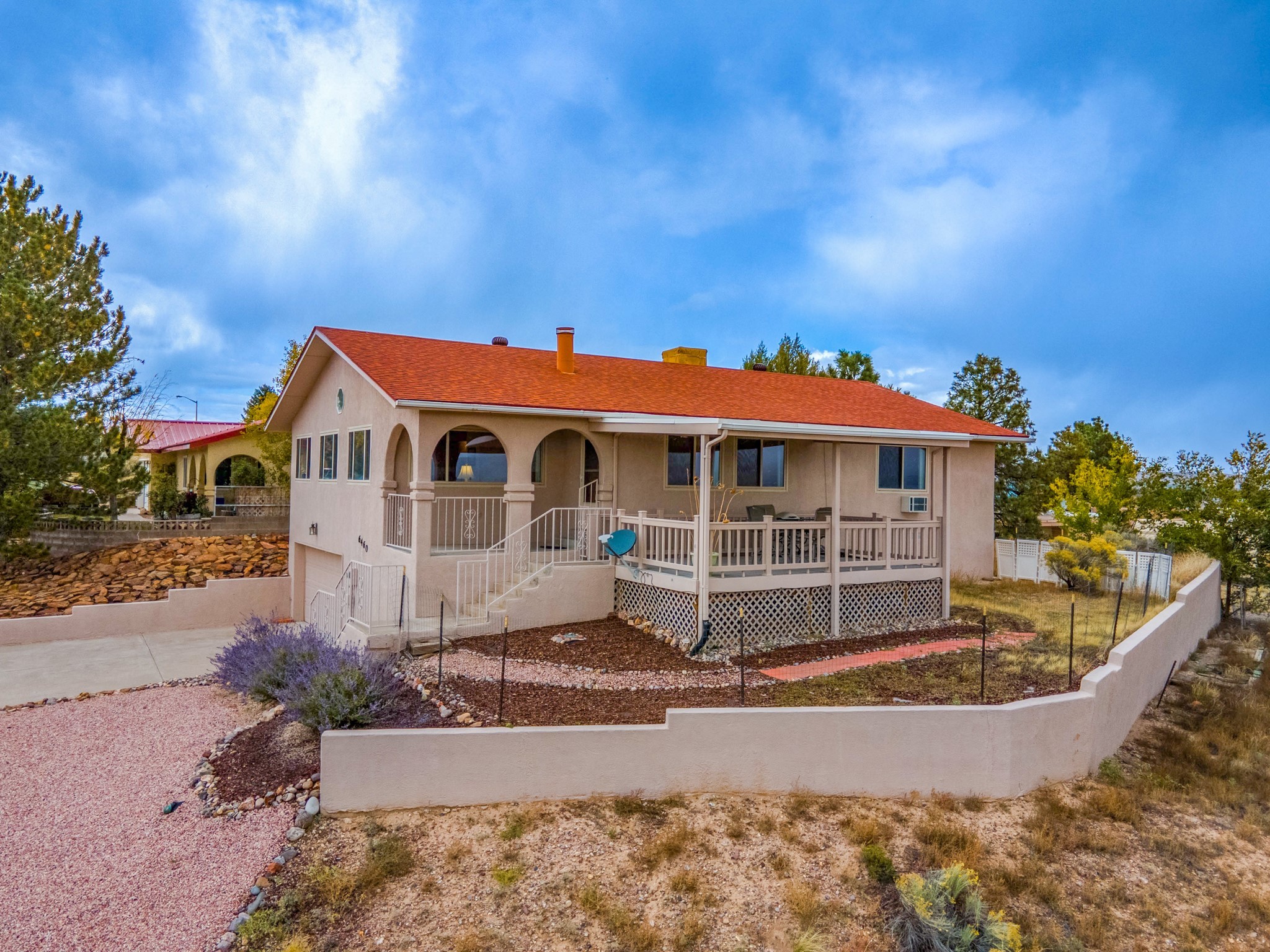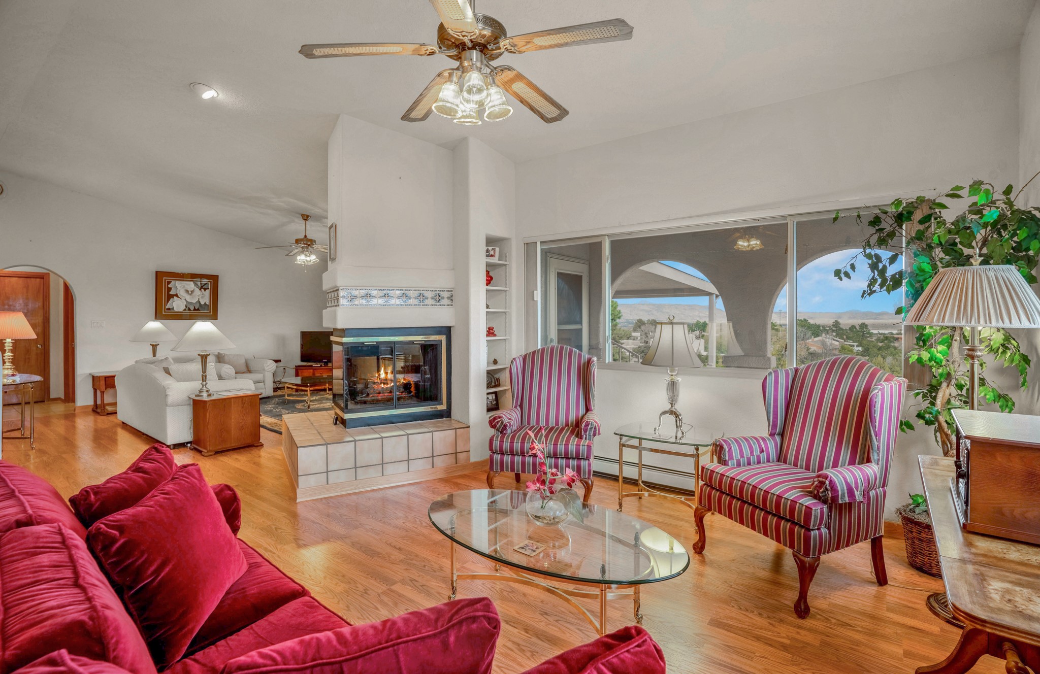 A different view out the windows - Cochiti Lake and the expansive vistas that surround! Lots of windows and high ceilings welcome you to this bright, two-story home with three bedrooms and two baths upstairs along with living room, dining room and kitchen. The three-sided fireplace centers the living space with inviting warmth. Downstairs has a bonus room and a large laundry room. Enjoy summer evenings on the covered portal with views for peaceful enjoyment. Subject to a land lease agreement.