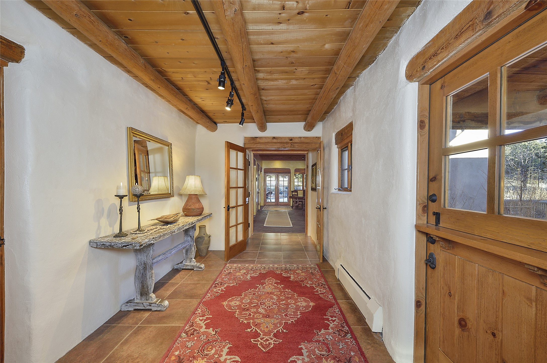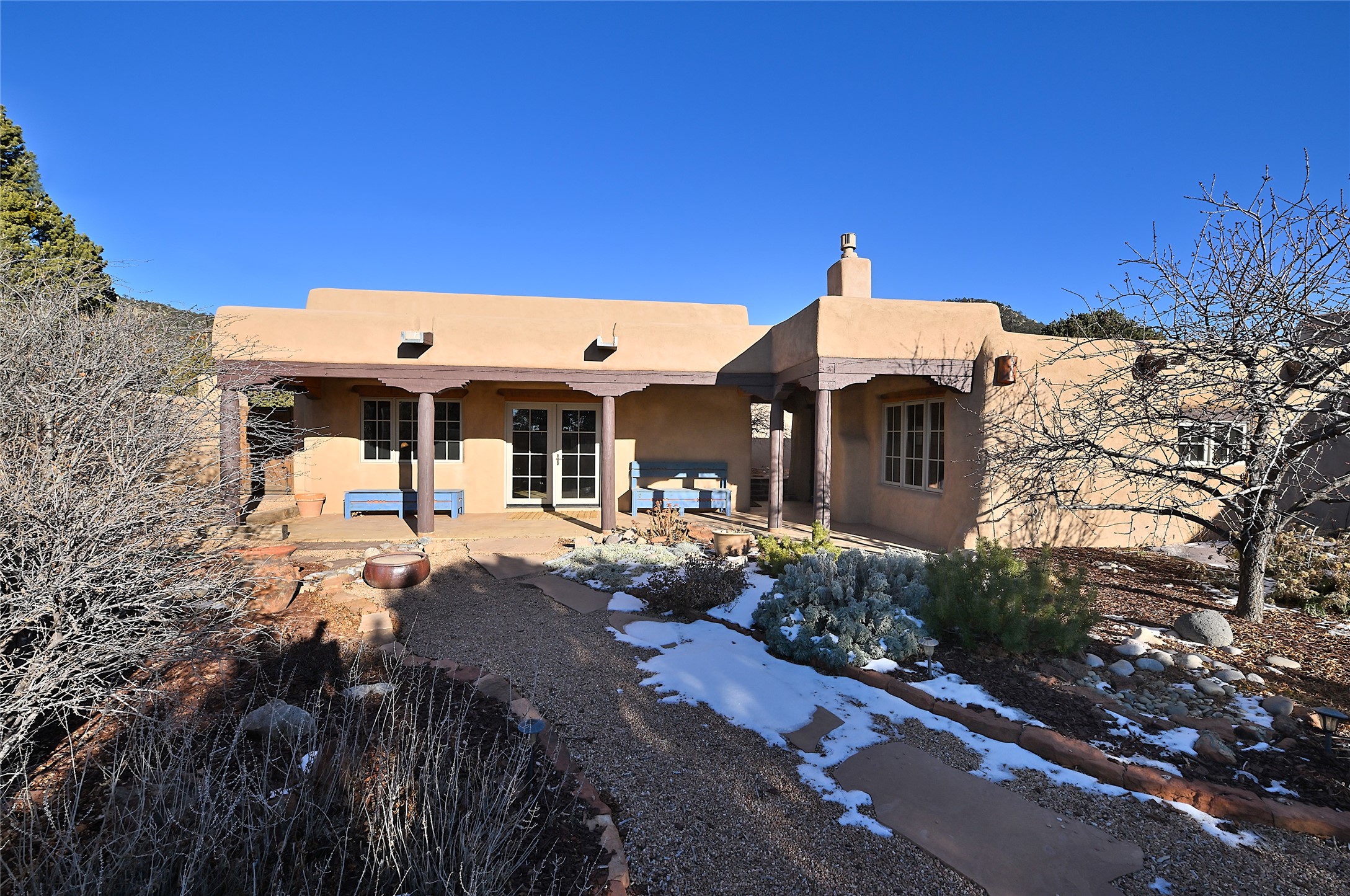 Swirling, sensuous waves of triple adobe walls are a warm welcome into this lovely home with authentic Pueblo Revival architectural details. The original ranch house was restored, upgraded and expanded in 2010 with the intention of retaining the charming rustic and "hand-wrought" character. An inner courtyard and traditional west-facing entry portal lead into the open living-dining room which showcases a beautiful fireplace, wet bar, brick floors, and divided light windows. Through French doors is a spacious eat-in kitchen with concrete countertops, an amazing adobe floor, and a raised fireplace flanked by banco seating, plus an adjacent dining portal. A gallery of shelves line the way to an extraordinary multi-purpose office/den/family room which can also be accessed from the main courtyard and includes a sitting area, built-in desks, wet bar and an efficient Vermont Stove. Four sweet bedrooms enjoy separation and updated bathrooms. The surrounding vistas and healthy mature pinon & juniper trees enhance the outdoor living areas, including four separate portals and a protected kitchen garden area. This private, peaceful property is truly a rare find in the southeast foothills off Old Santa Fe Trail.
