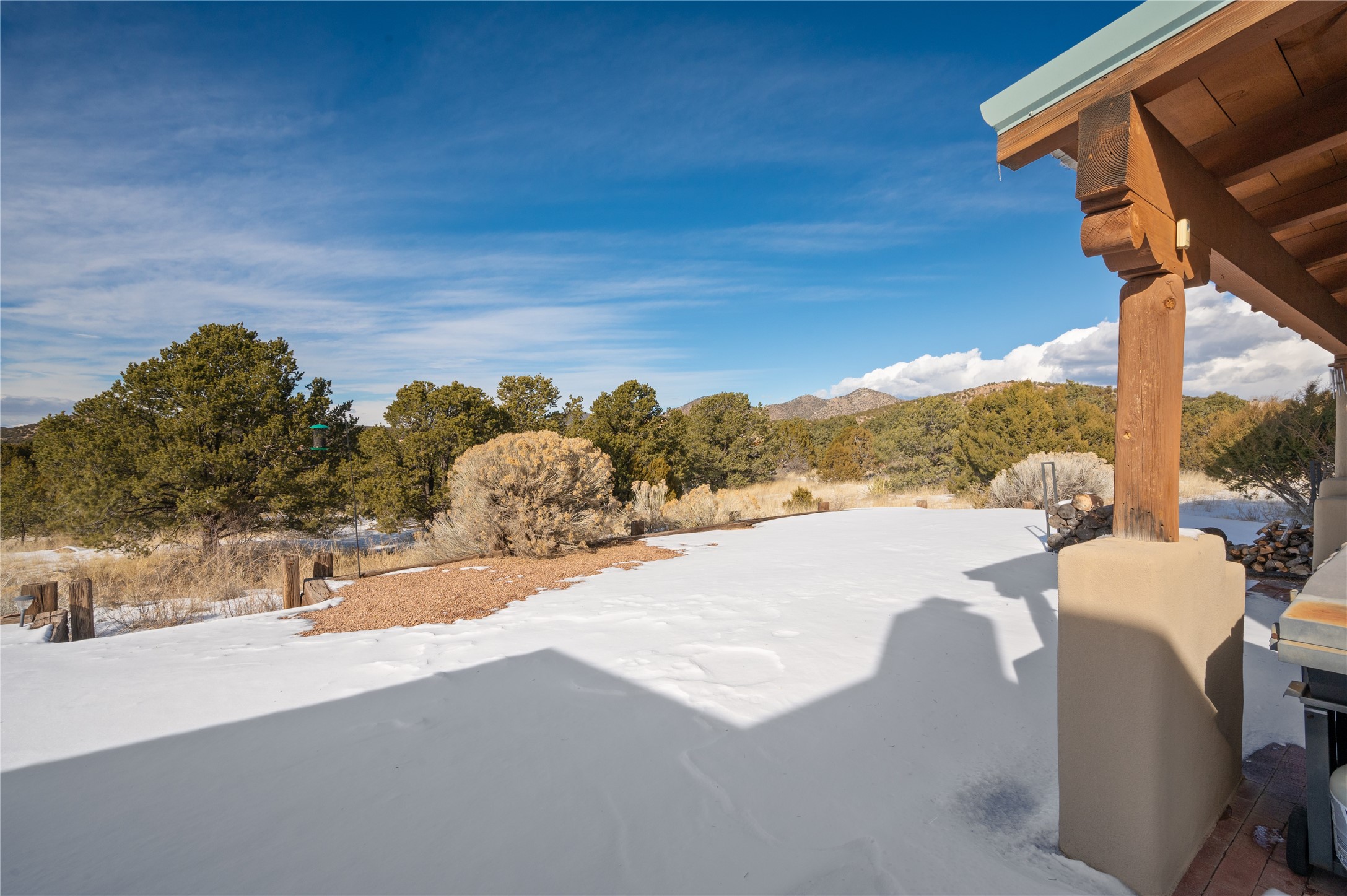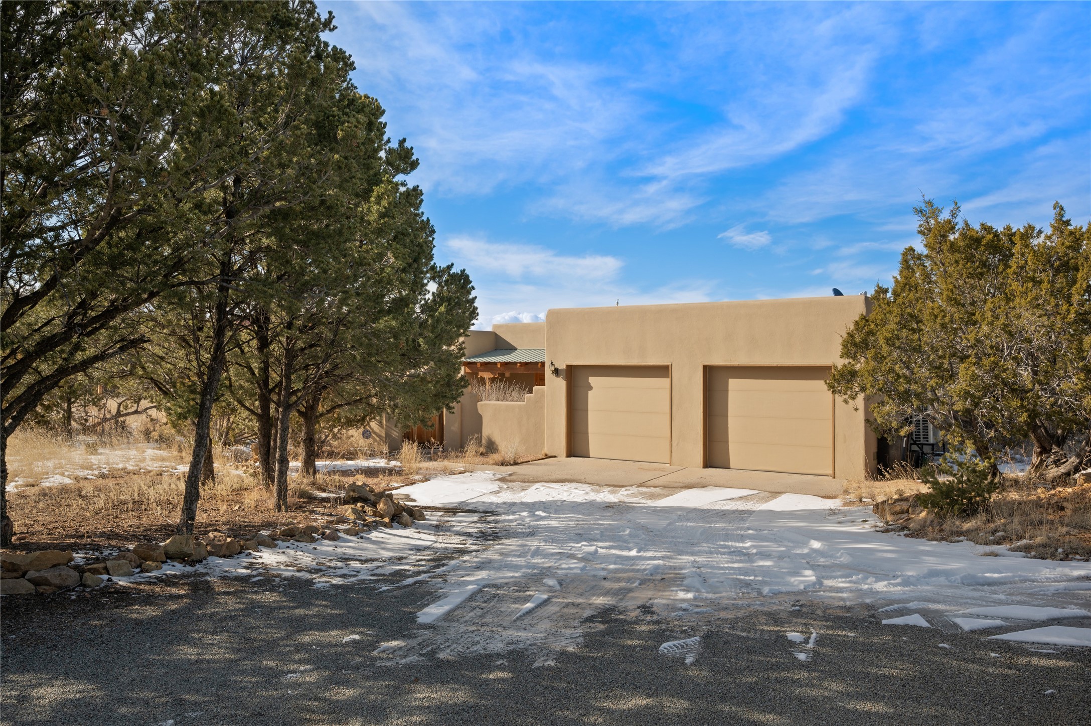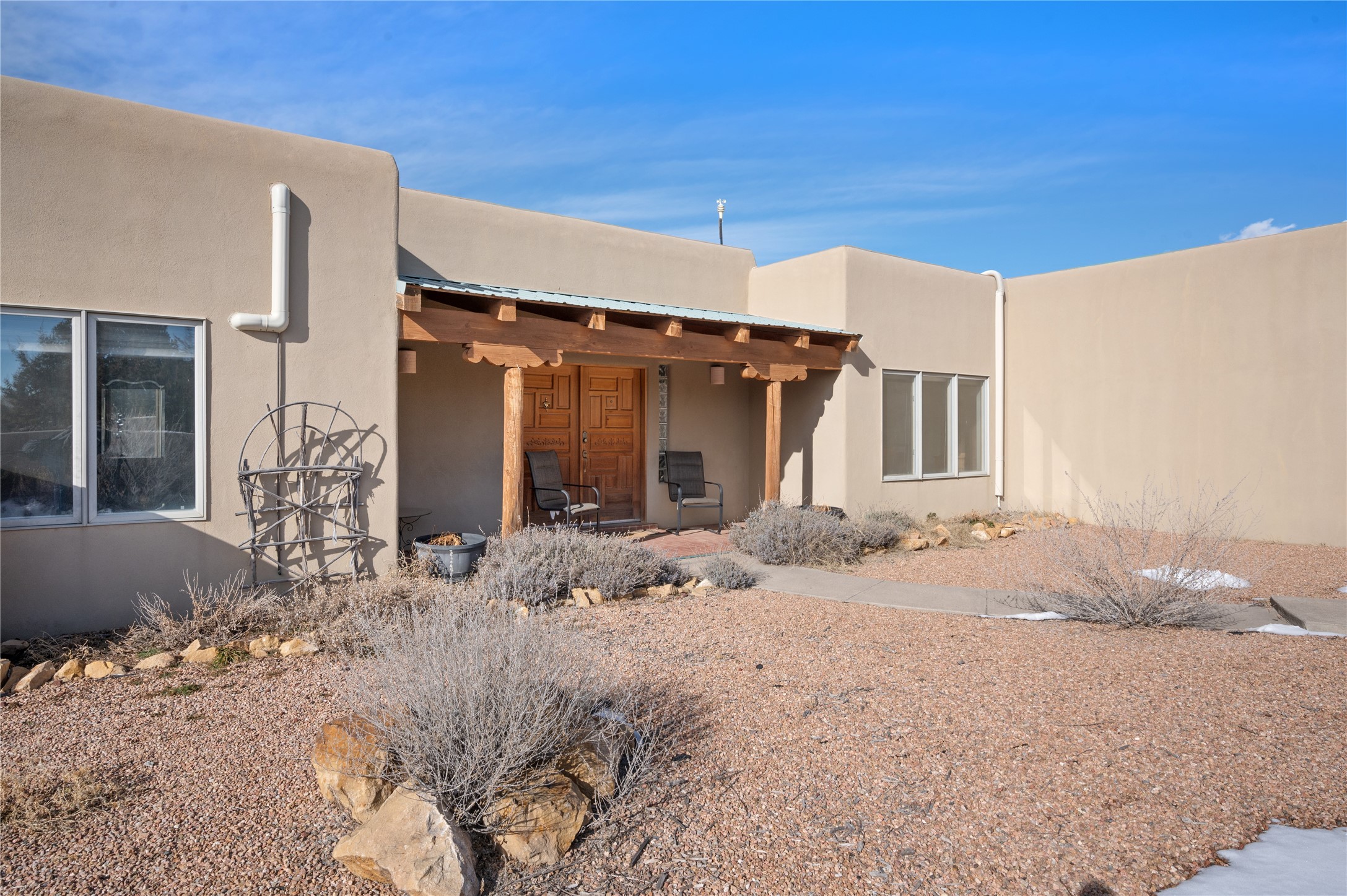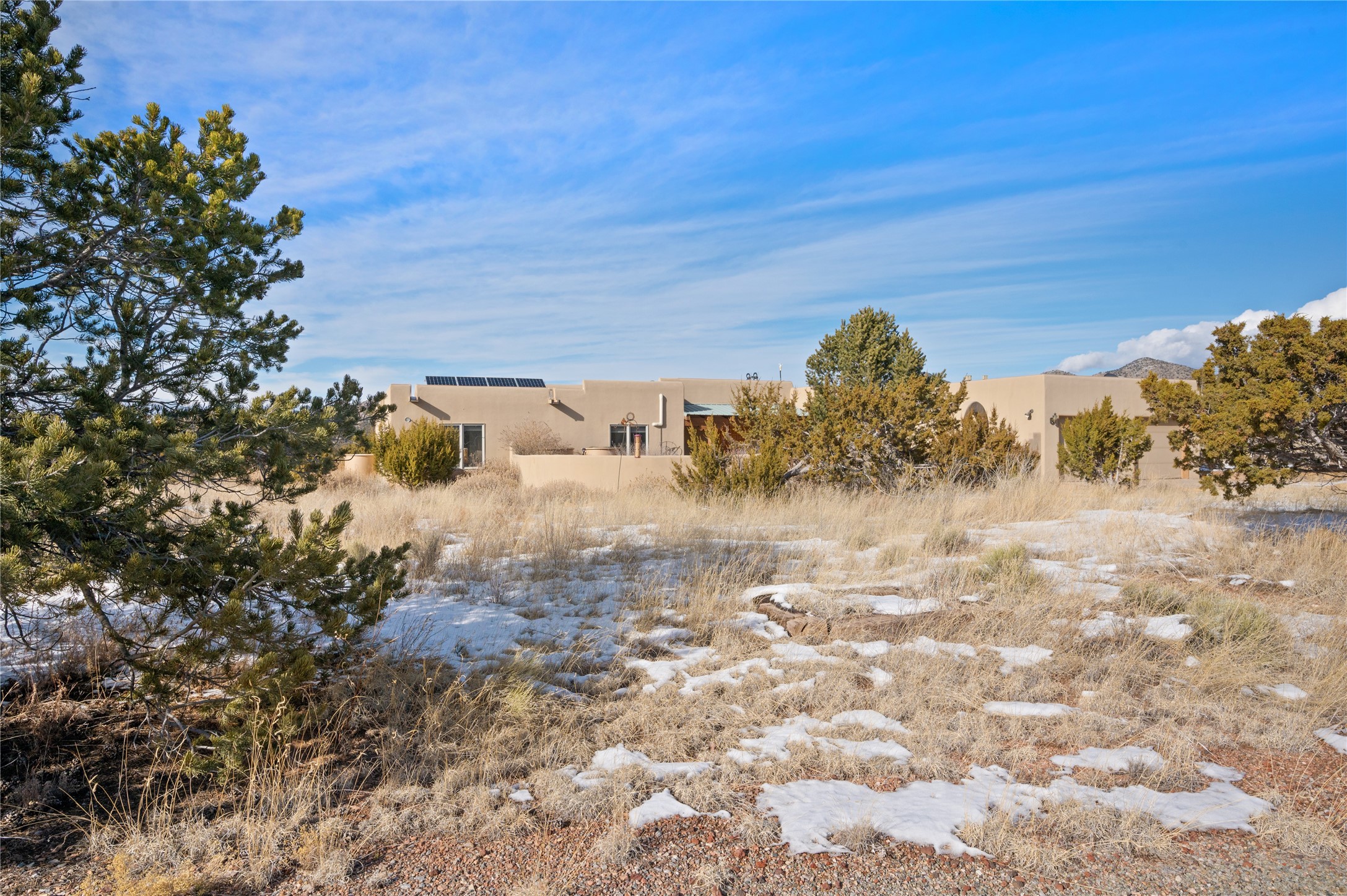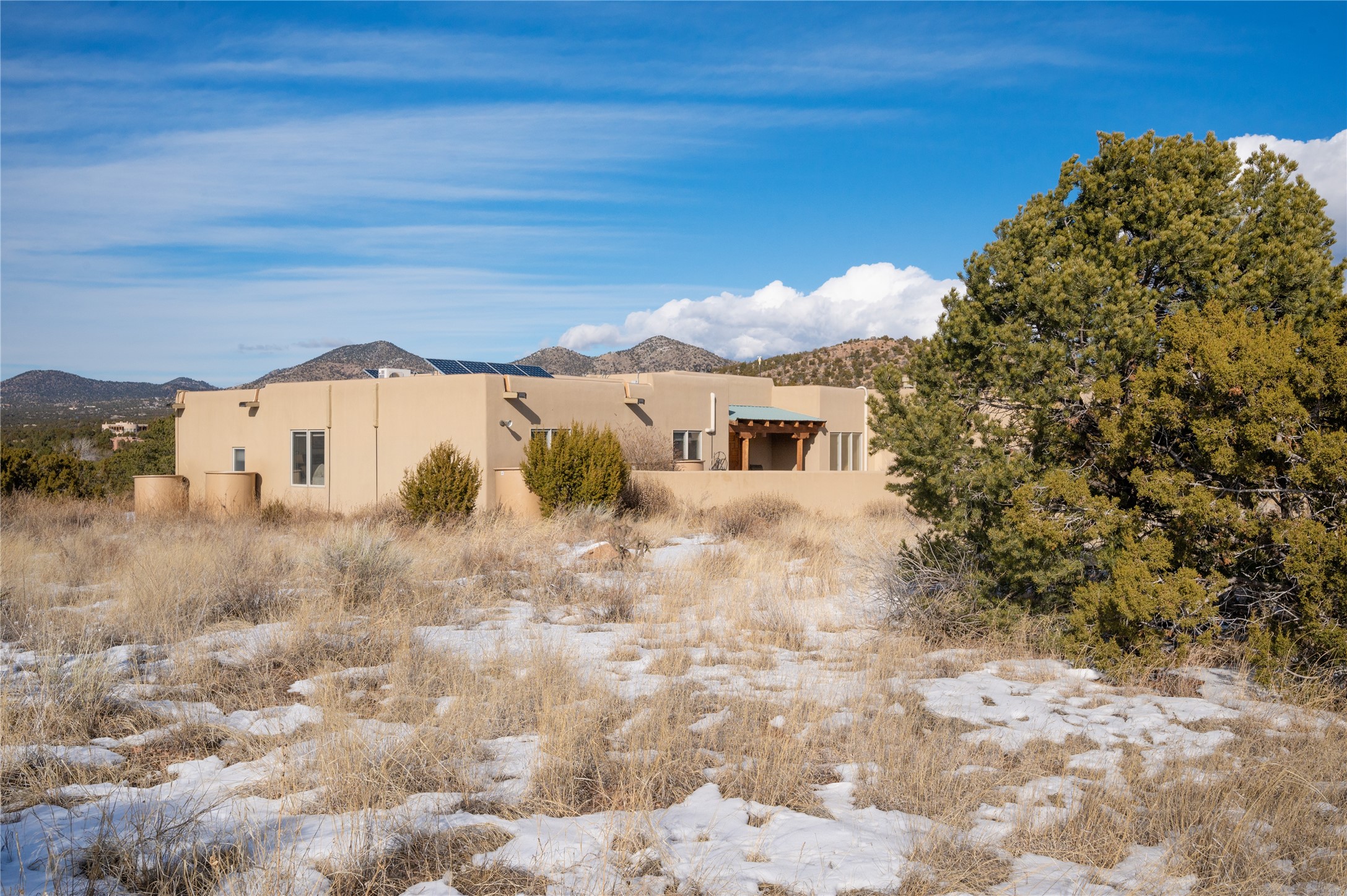 Nestled in the foothills of the Sangre de Cristo Mountains, this single level Pueblo style home can be found in the Dos Griegos Community, just 20 minutes from the Santa Fe plaza. This spacious 3,000+ square foot energy efficient home is situated on 3.66 acres, has 4 bedrooms along with a bonus room that could be used as an office, studio, media room...whatever you need it to be, 2 1/2 baths, 2 kiva fireplaces, beamed ceiling, 3 outdoor portals & 2 courtyards and a hot tub. Current owner updated the interior, added energy efficient appliances, an IB Roof System, 8 mini splits, a radiant floor heating mat in the primary bath, a water filtration system and purchased a Positive Energy Solar system.