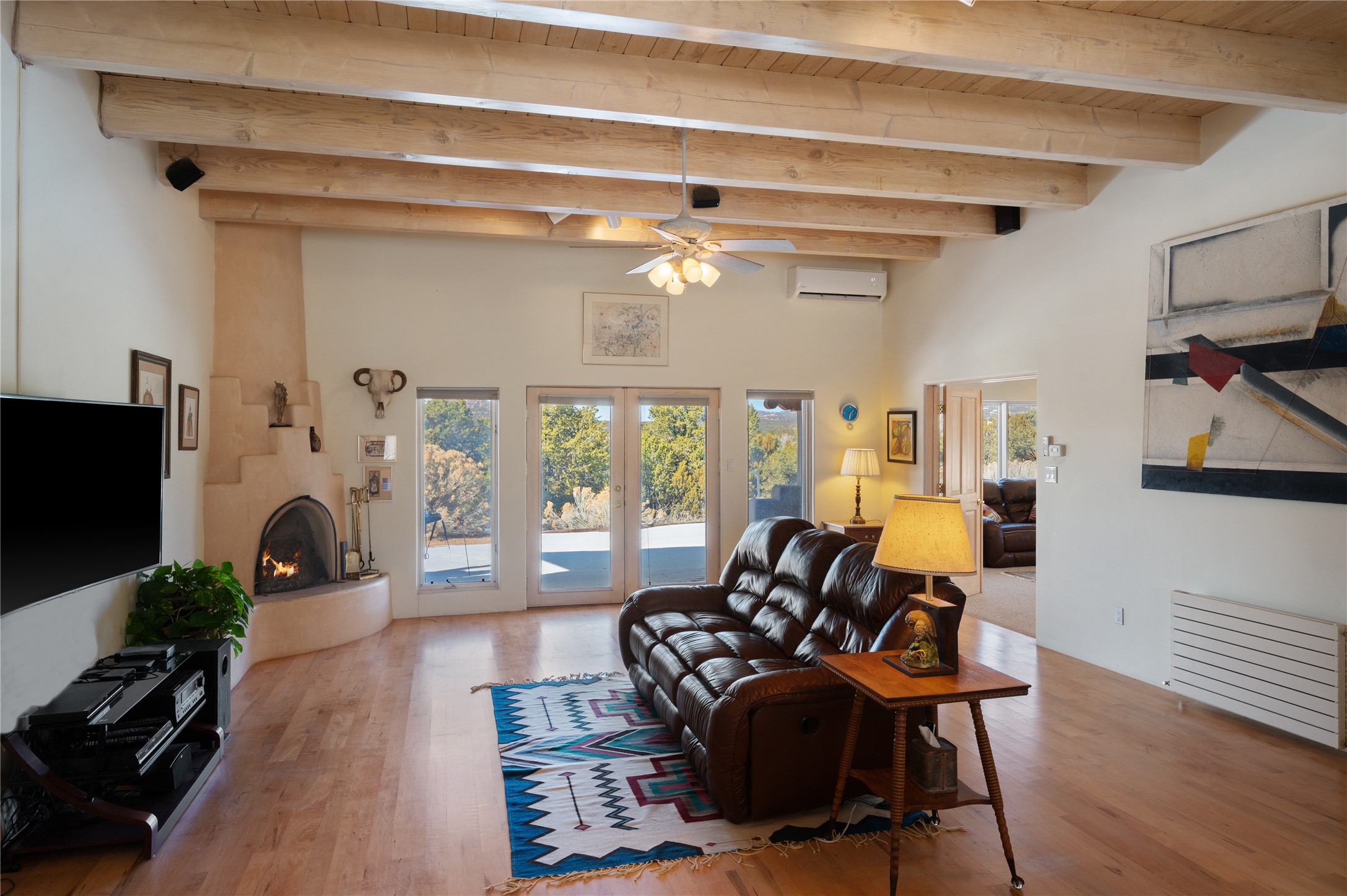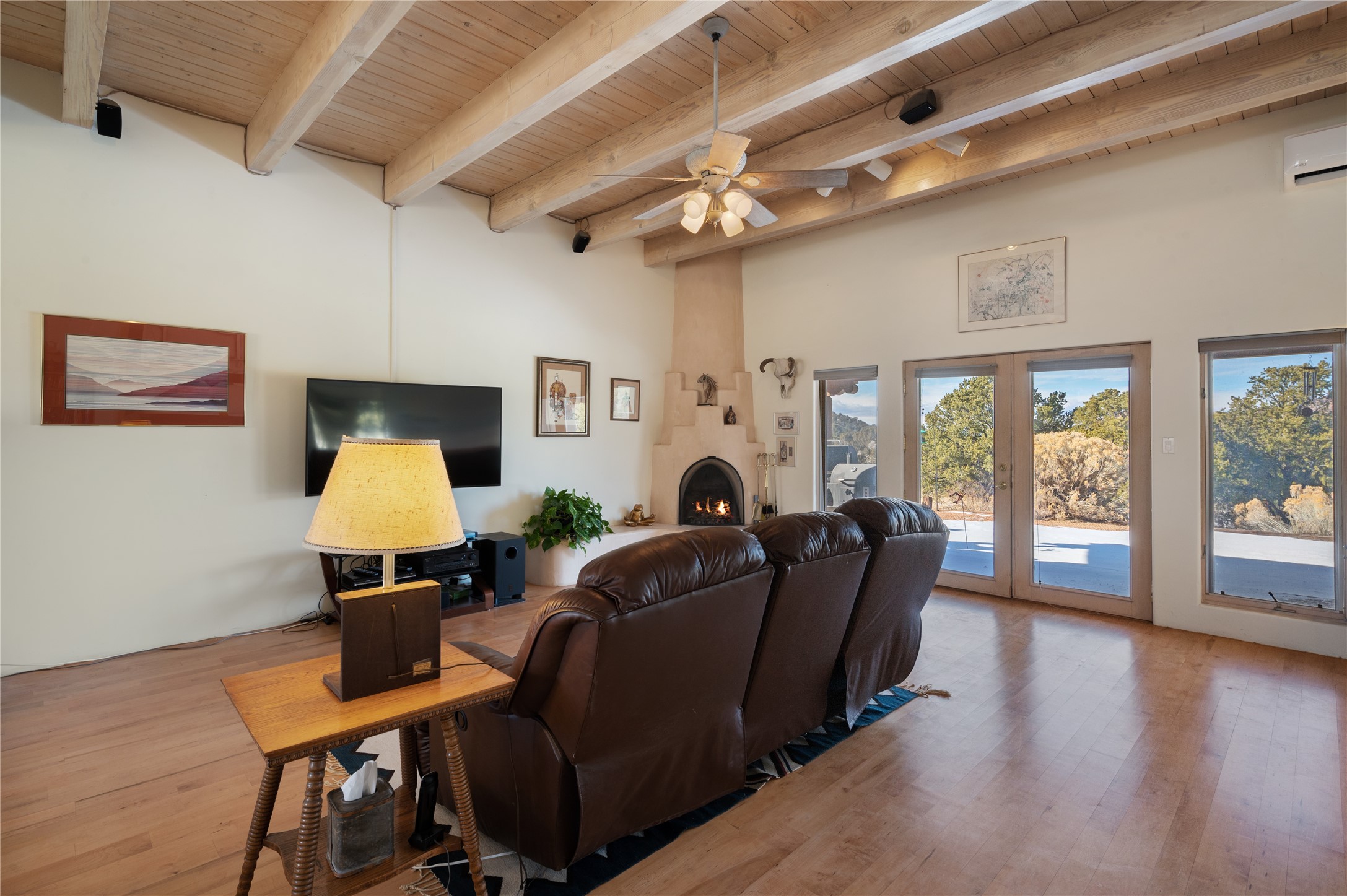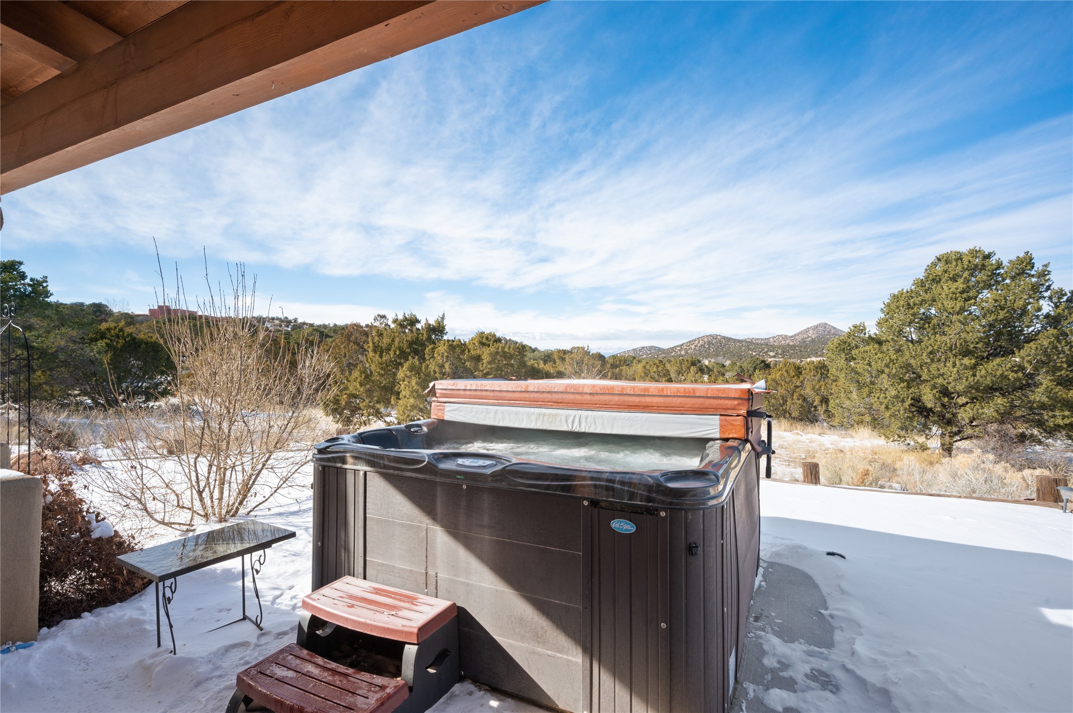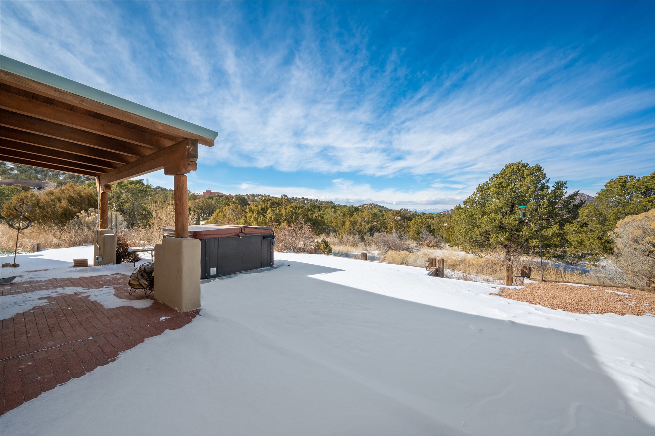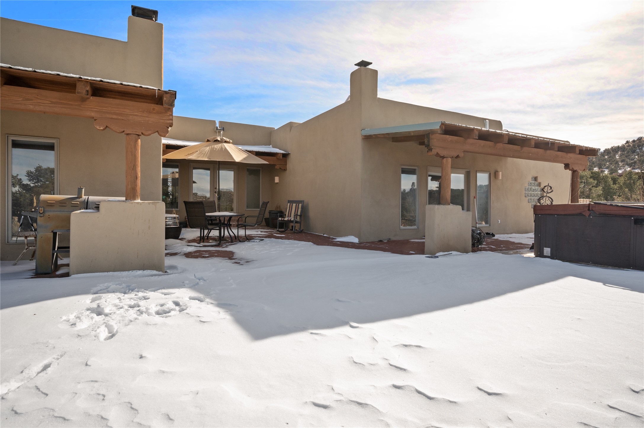 Nestled in the foothills of the Sangre de Cristo Mountains, this single level Pueblo style home can be found in the Dos Griegos Community, just 20 minutes from the Santa Fe plaza. This spacious 3,000+ square foot energy efficient home is situated on 3.66 acres, has 4 bedrooms along with a bonus room that could be used as an office, studio, media room...whatever you need it to be, 2 1/2 baths, 2 kiva fireplaces, beamed ceiling, 3 outdoor portals & 2 courtyards and a hot tub. Current owner updated the interior, added energy efficient appliances, an IB Roof System, 8 mini splits, a radiant floor heating mat in the primary bath, a water filtration system and purchased a Positive Energy Solar system.