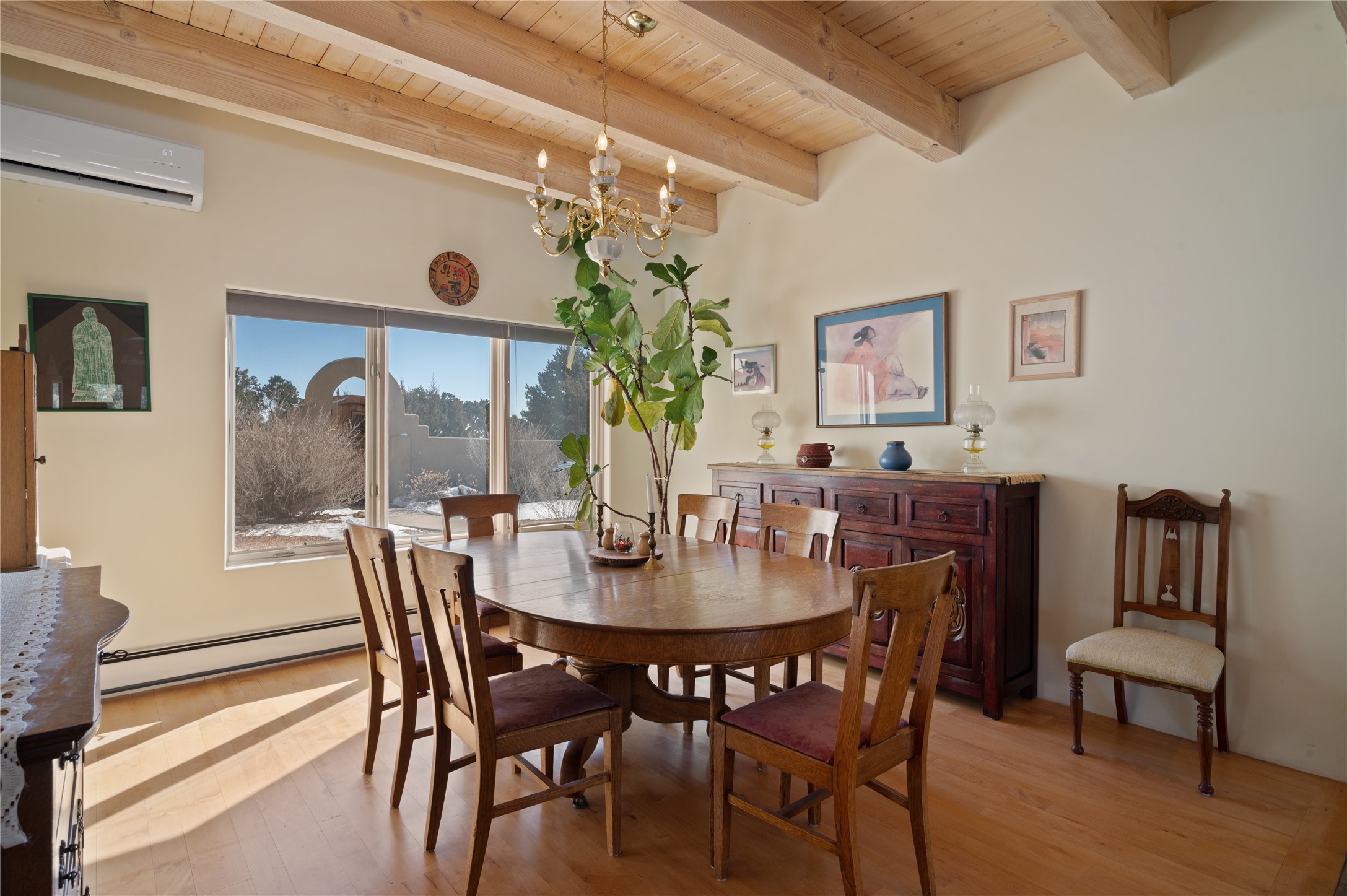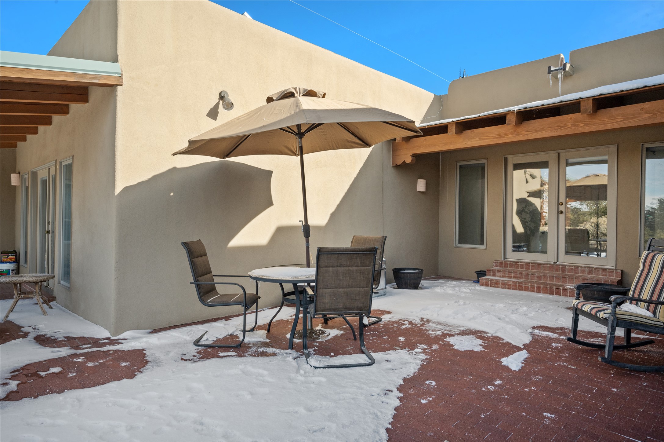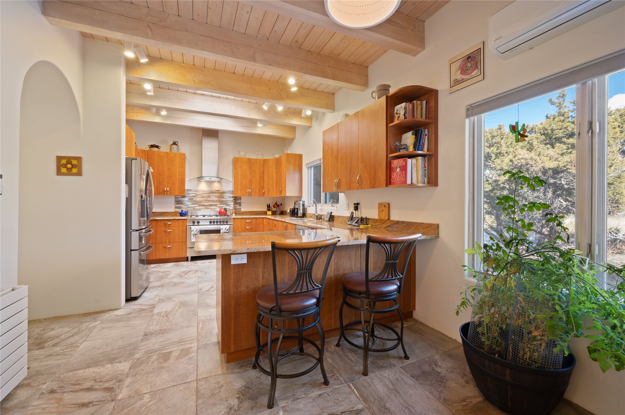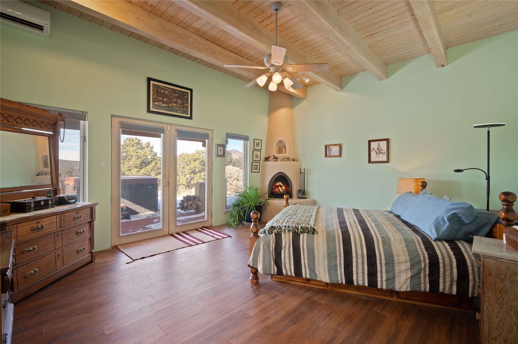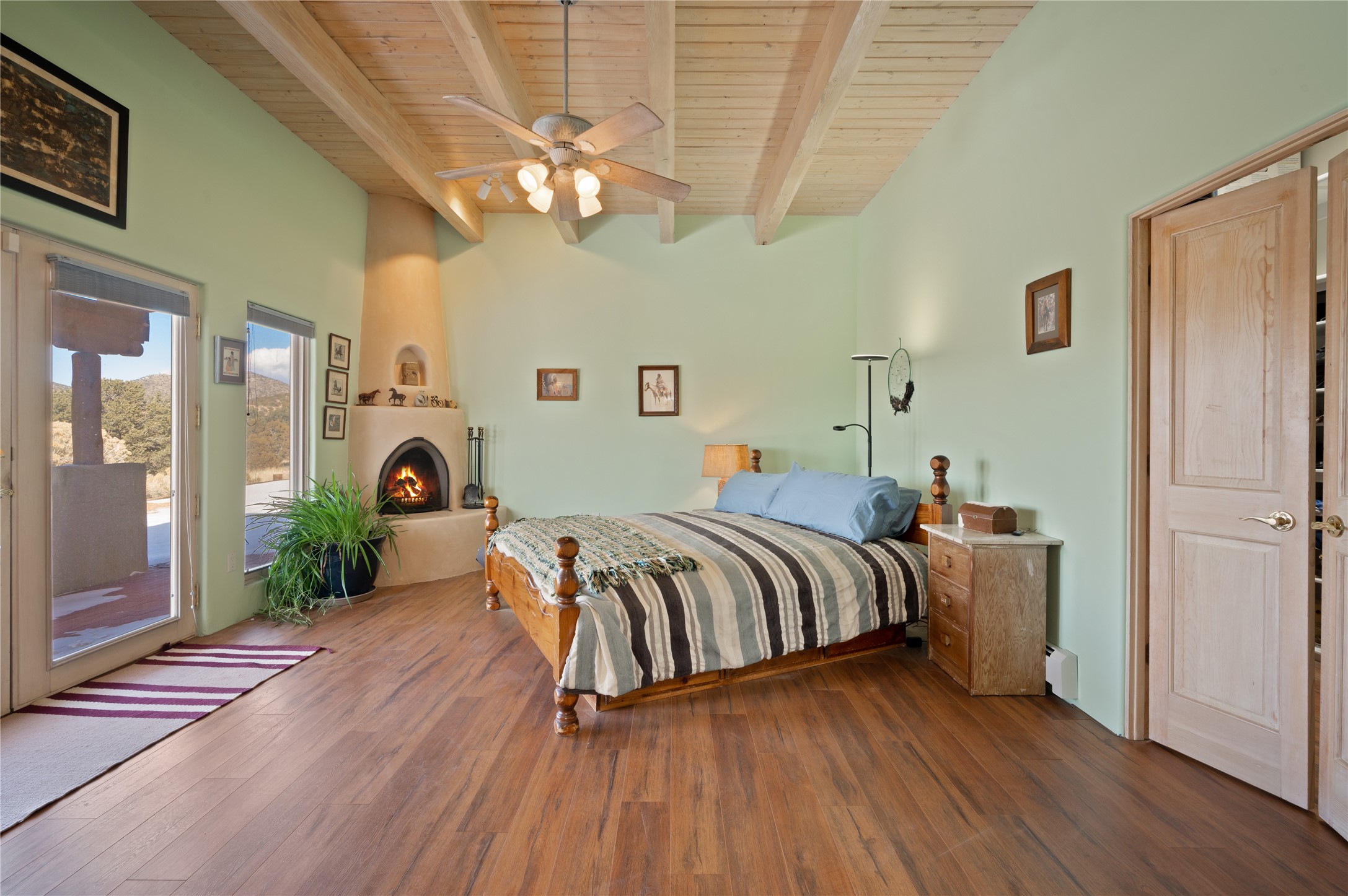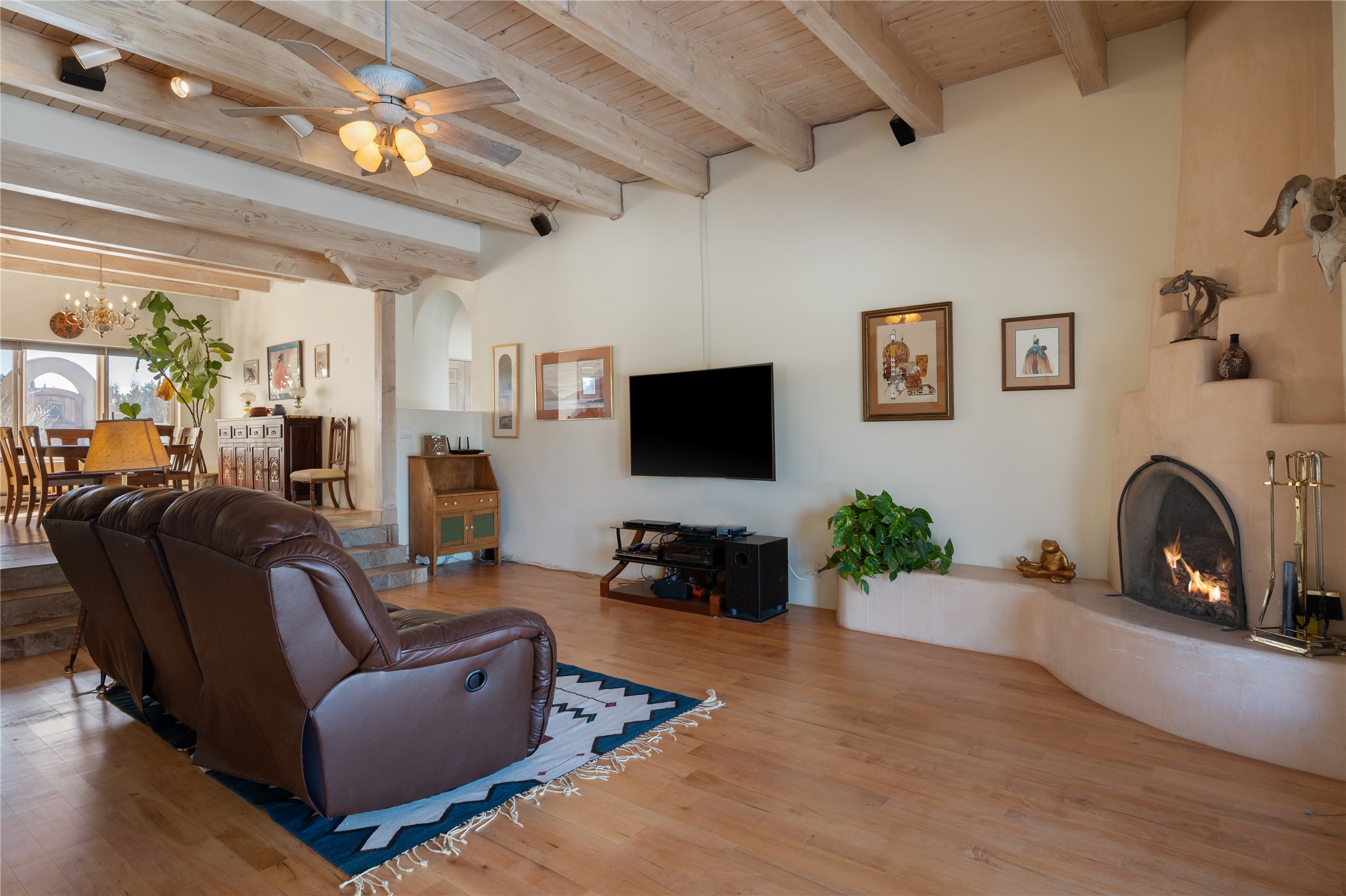 Nestled in the foothills of the Sangre de Cristo Mountains, this single level Pueblo style home can be found in the Dos Griegos Community, just 20 minutes from the Santa Fe plaza. This spacious 3,000+ square foot energy efficient home is situated on 3.66 acres, has 4 bedrooms along with a bonus room that could be used as an office, studio, media room...whatever you need it to be, 2 1/2 baths, 2 kiva fireplaces, beamed ceiling, 3 outdoor portals & 2 courtyards and a hot tub. Current owner updated the interior, added energy efficient appliances, an IB Roof System, 8 mini splits, a radiant floor heating mat in the primary bath, a water filtration system and purchased a Positive Energy Solar system.