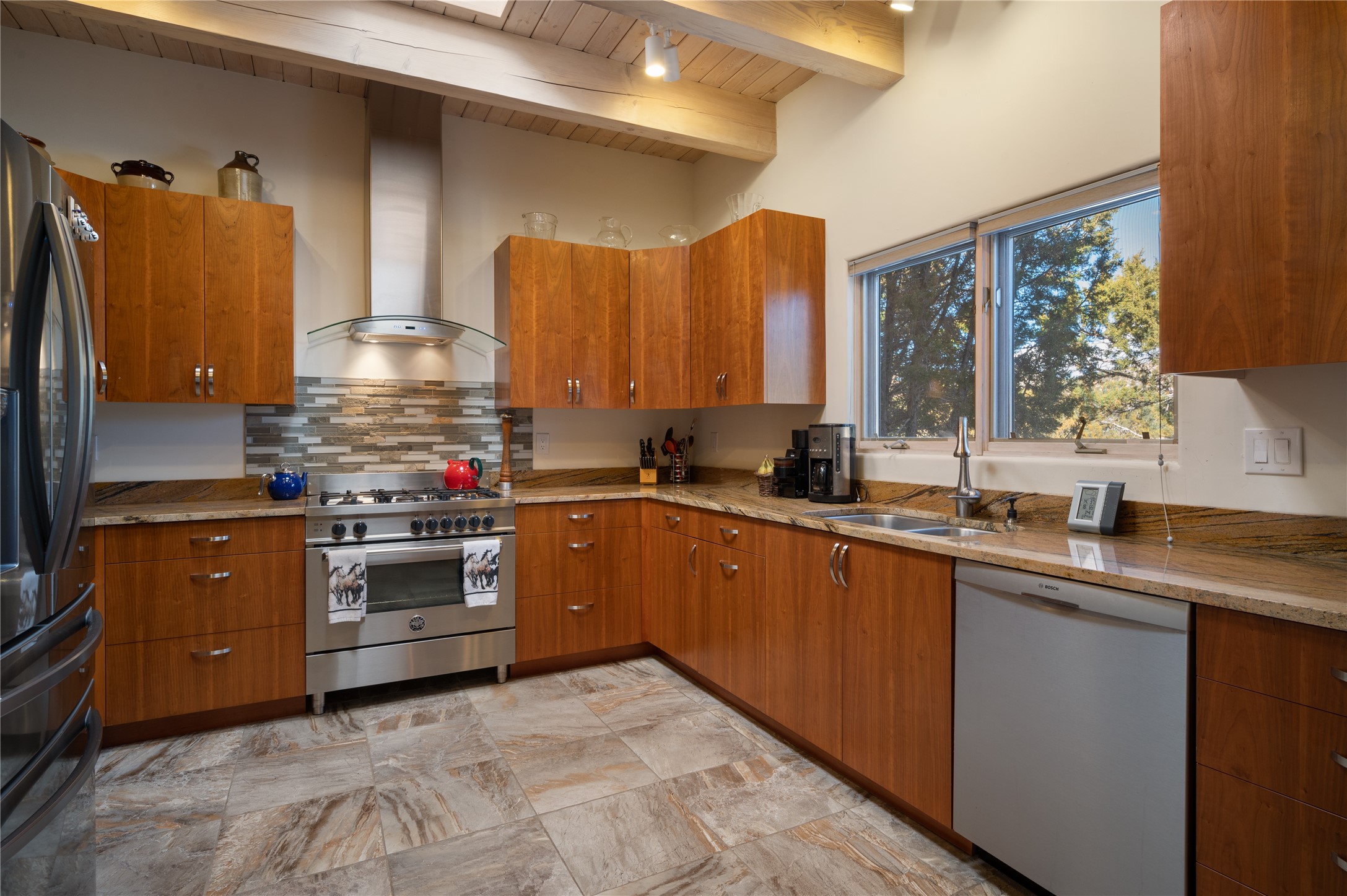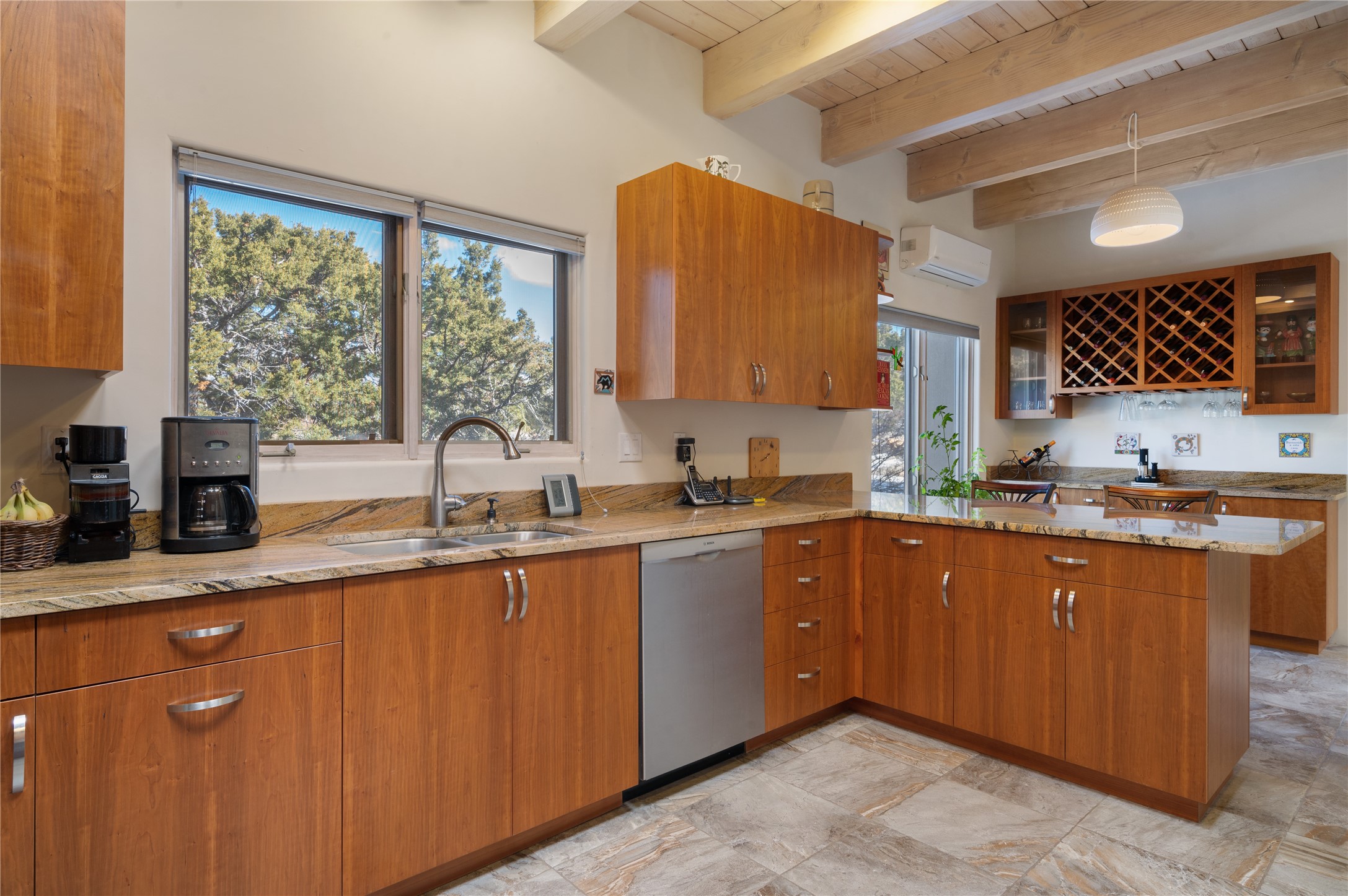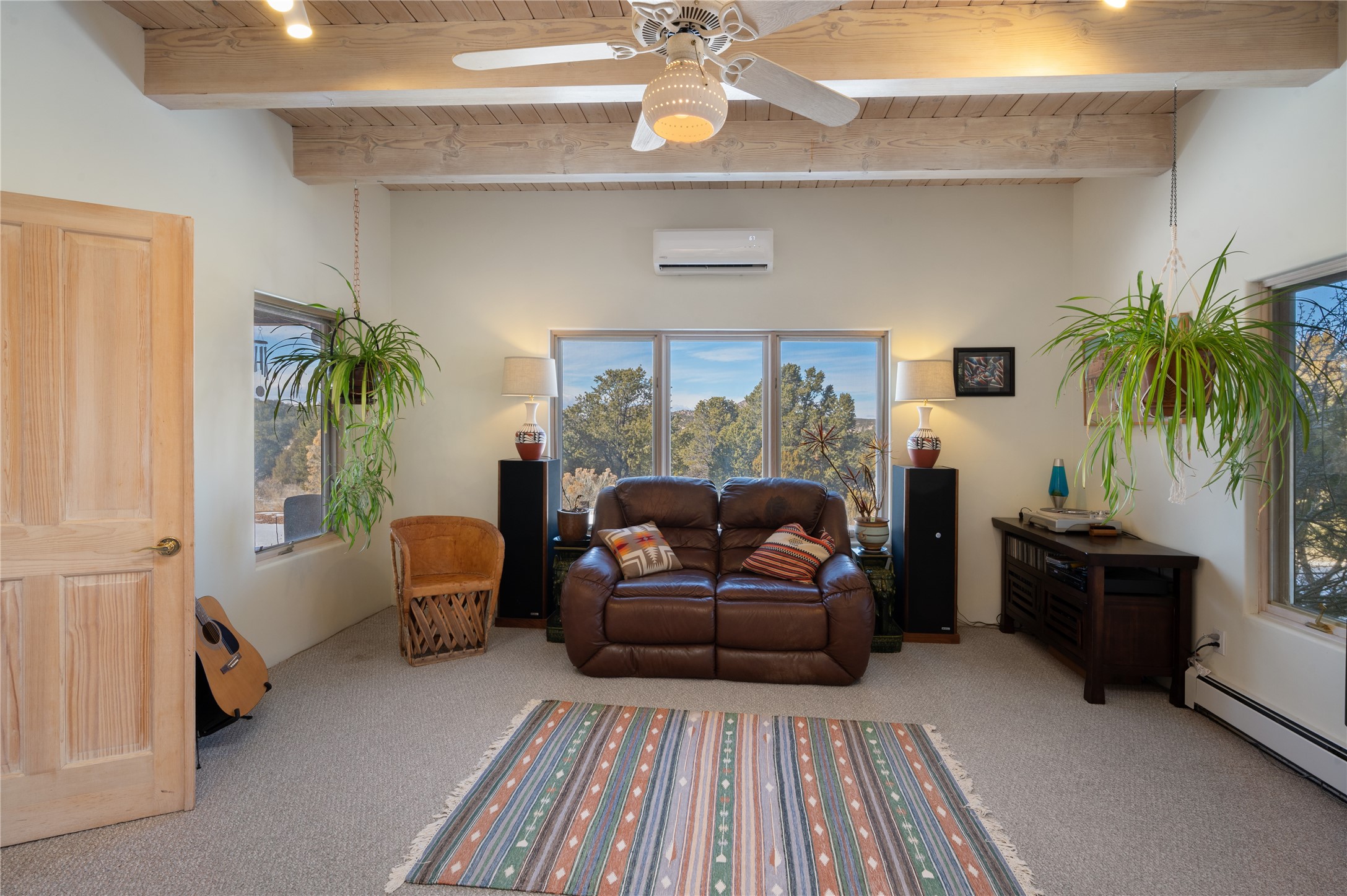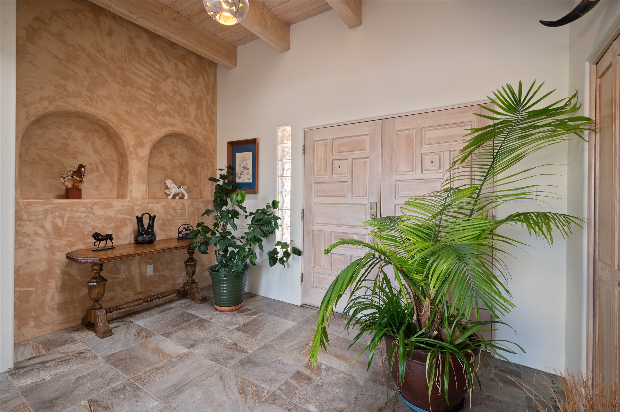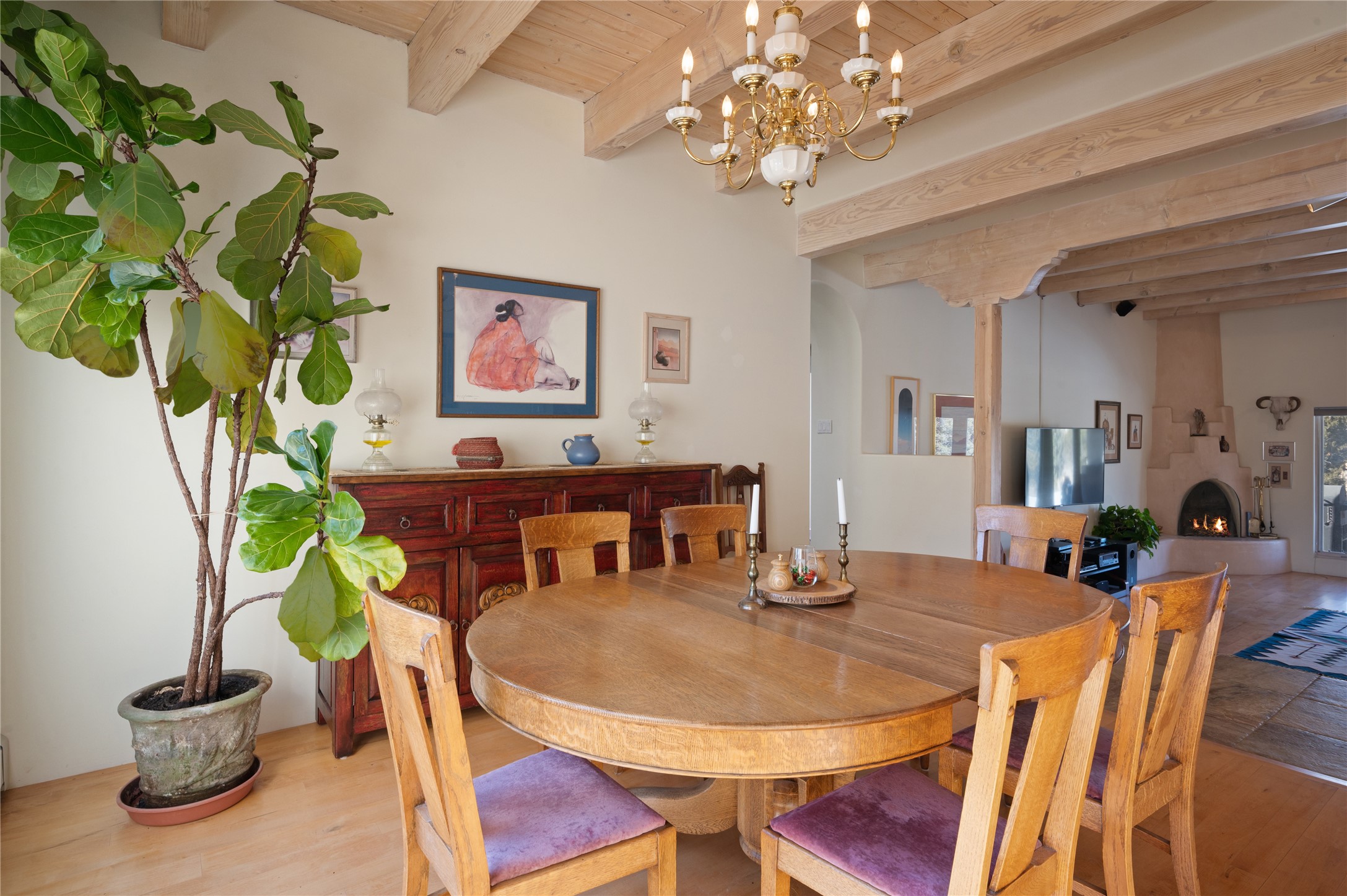 Nestled in the foothills of the Sangre de Cristo Mountains, this single level Pueblo style home can be found in the Dos Griegos Community, just 20 minutes from the Santa Fe plaza. This spacious 3,000+ square foot energy efficient home is situated on 3.66 acres, has 4 bedrooms along with a bonus room that could be used as an office, studio, media room...whatever you need it to be, 2 1/2 baths, 2 kiva fireplaces, beamed ceiling, 3 outdoor portals & 2 courtyards and a hot tub. Current owner updated the interior, added energy efficient appliances, an IB Roof System, 8 mini splits, a radiant floor heating mat in the primary bath, a water filtration system and purchased a Positive Energy Solar system.