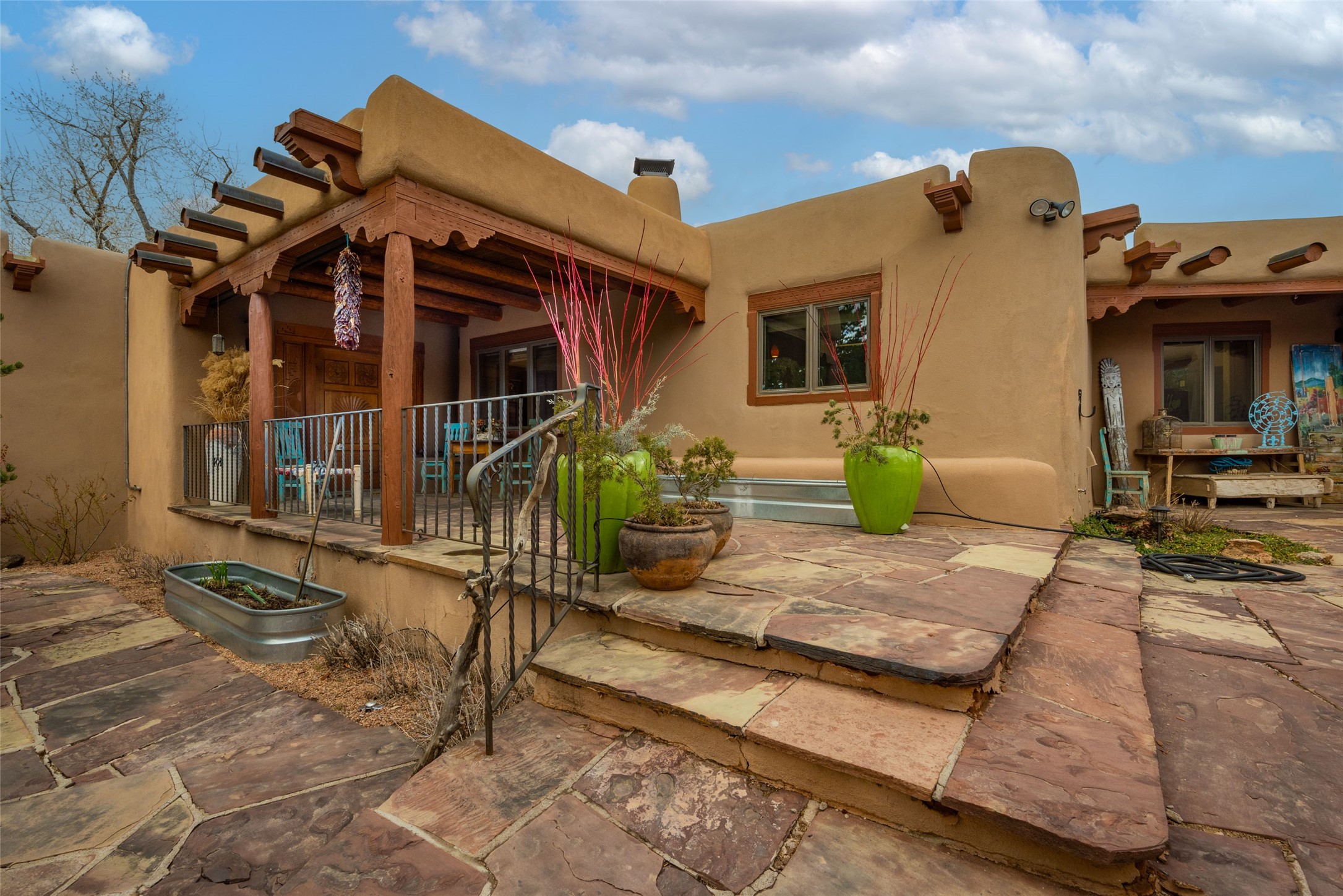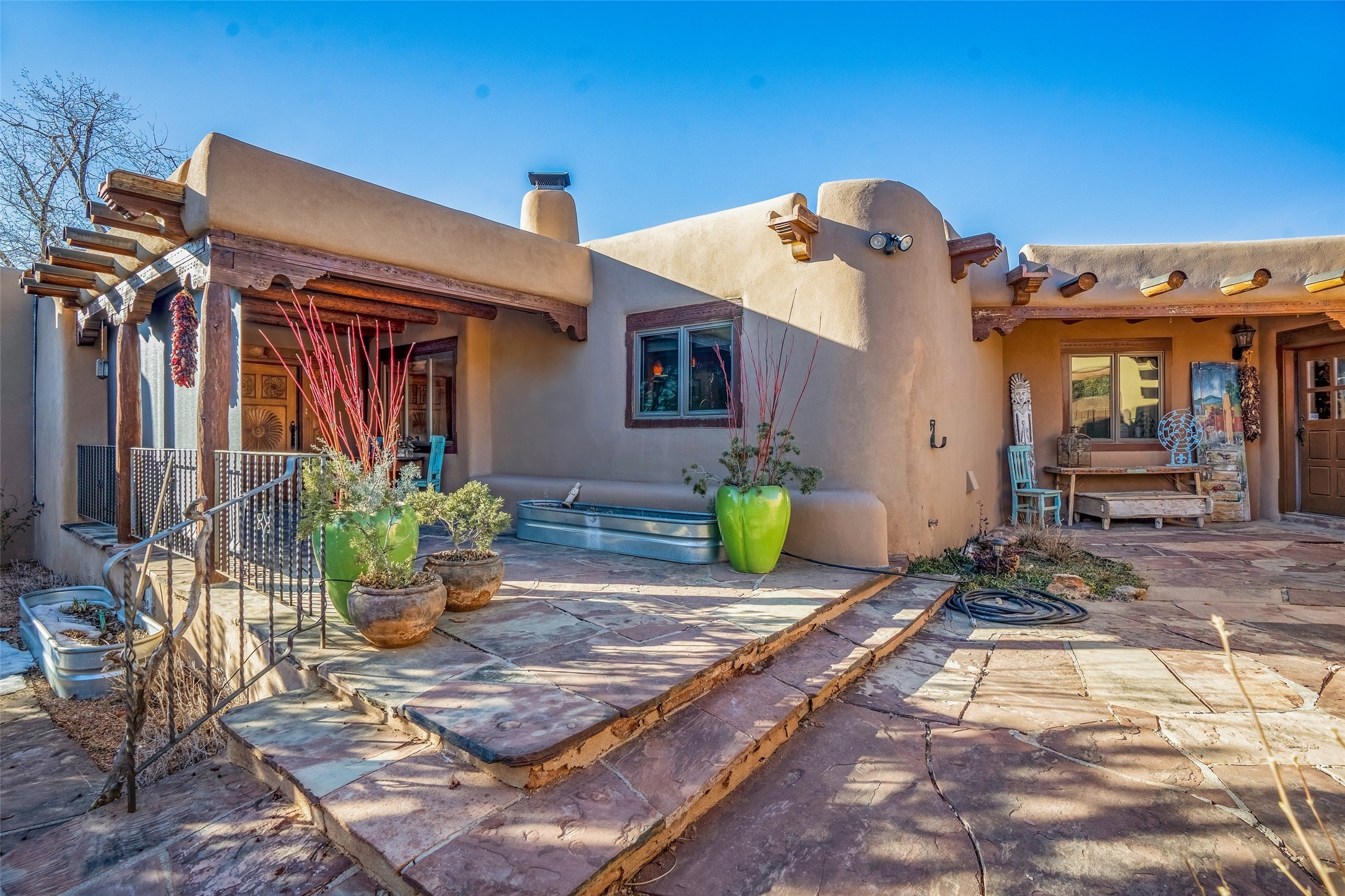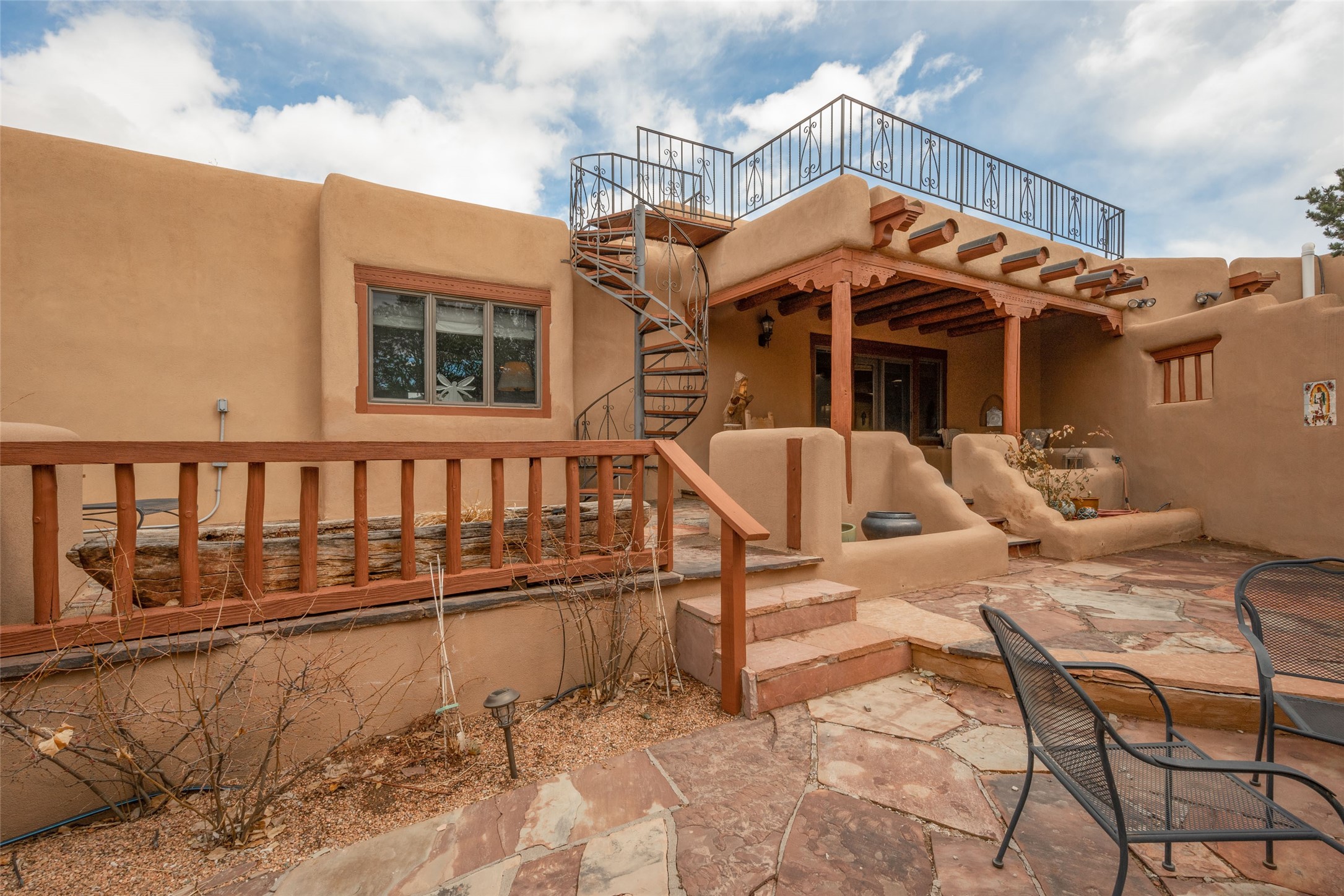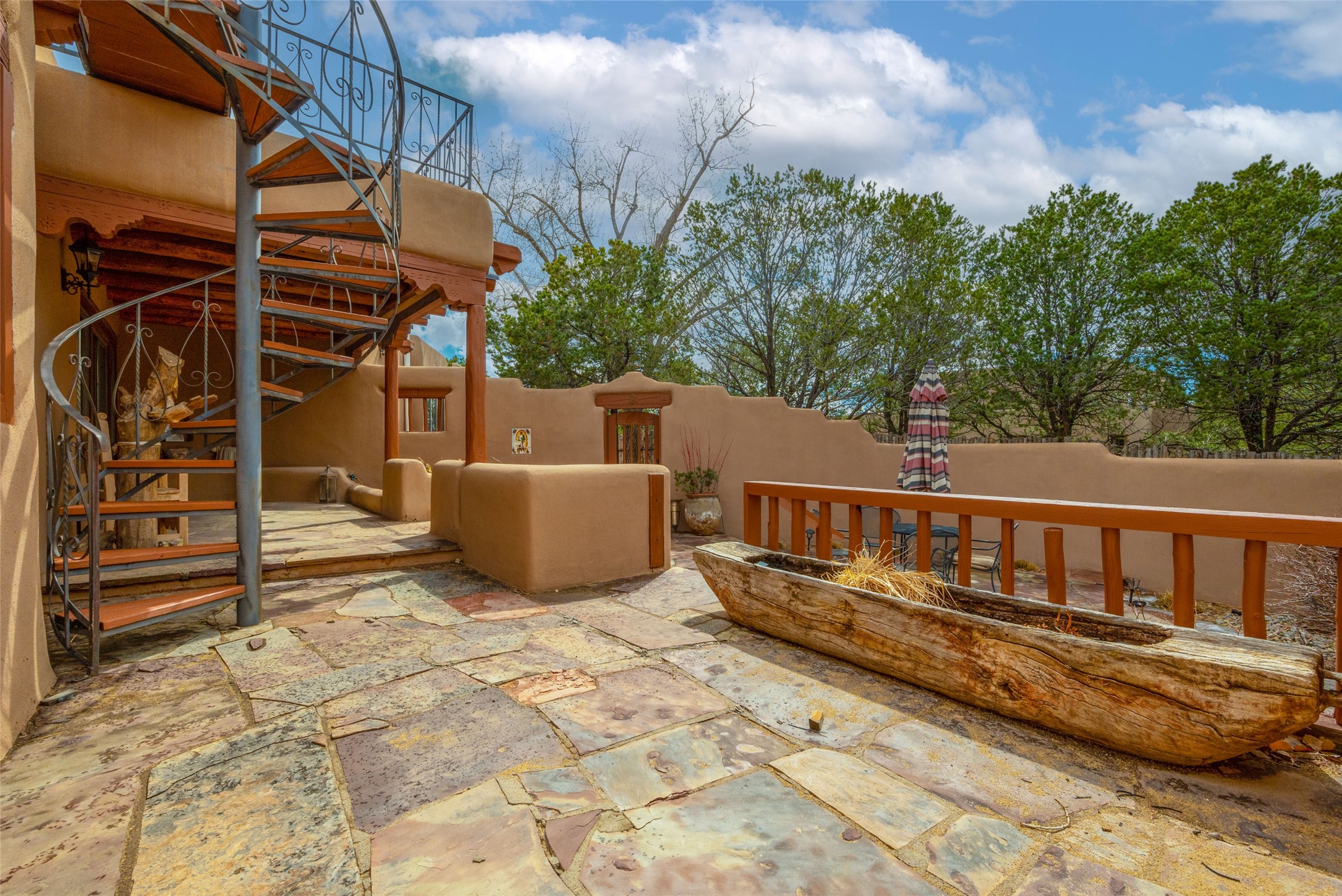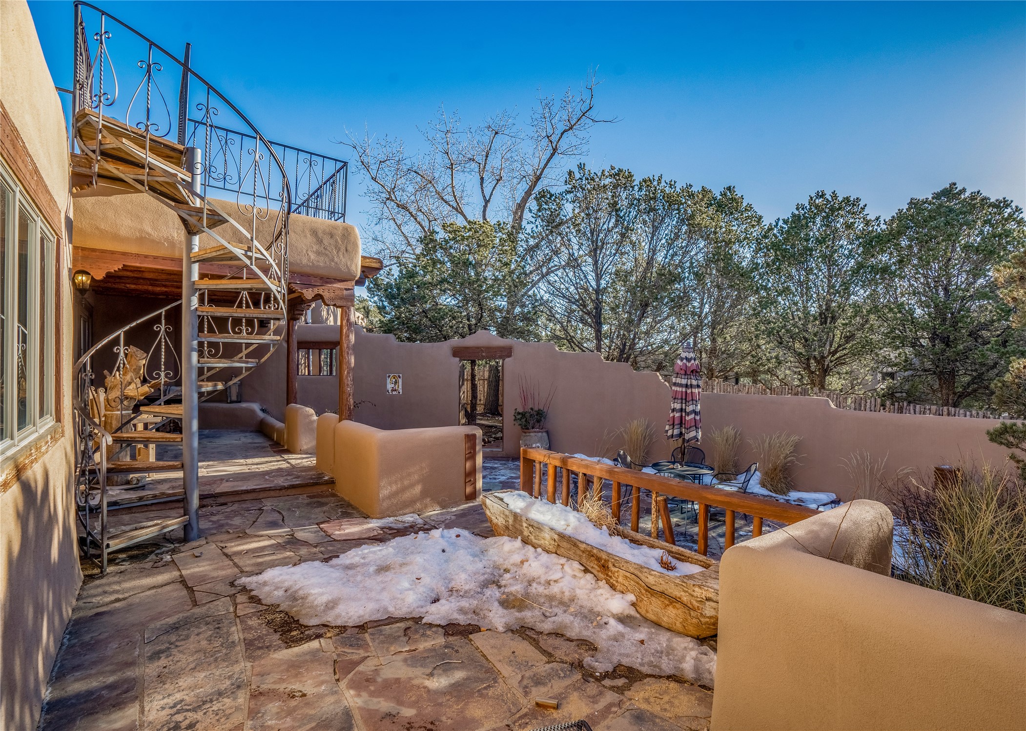 This well designed house has that spacious, Santa Fe style so many of us are looking for. A beautiful and elegant Southwestern home, 4,200 sq ft, close to Museum Hill, oozes with unique details, such as hand-crafted carving on beams and doors, Saltillo tile floors, 5 fireplaces, a stunning outdoor spiral staircase leading up to a rooftop deck. 3 Flagstone courtyards, one at the entrance, and two on either side of the main living area. There are two large living areas and a workroom. The kitchen is a cook's dream with plenty of counter top space, cabinetry and well designed placement of appliances. There is an oversized two car garage, irrigated landscaping and expansive views, a green house and the whole back of the property has been enclosed by a coyote fence with a gate to the back of the property just to take a walk along the arroyo. Once home you are in your own private world yet you are just minutes from downtown, there is one traffic light between you and the Plaza.