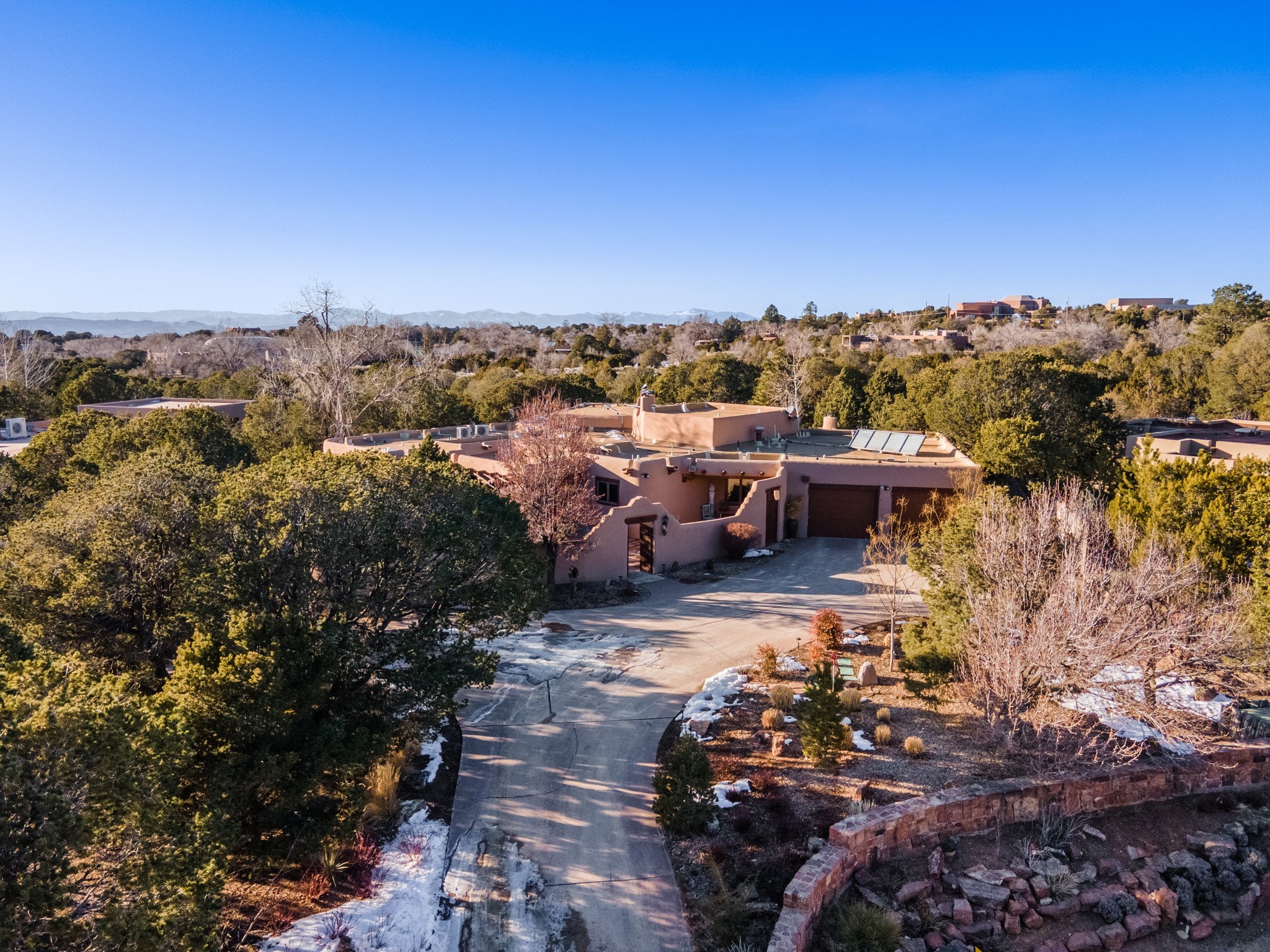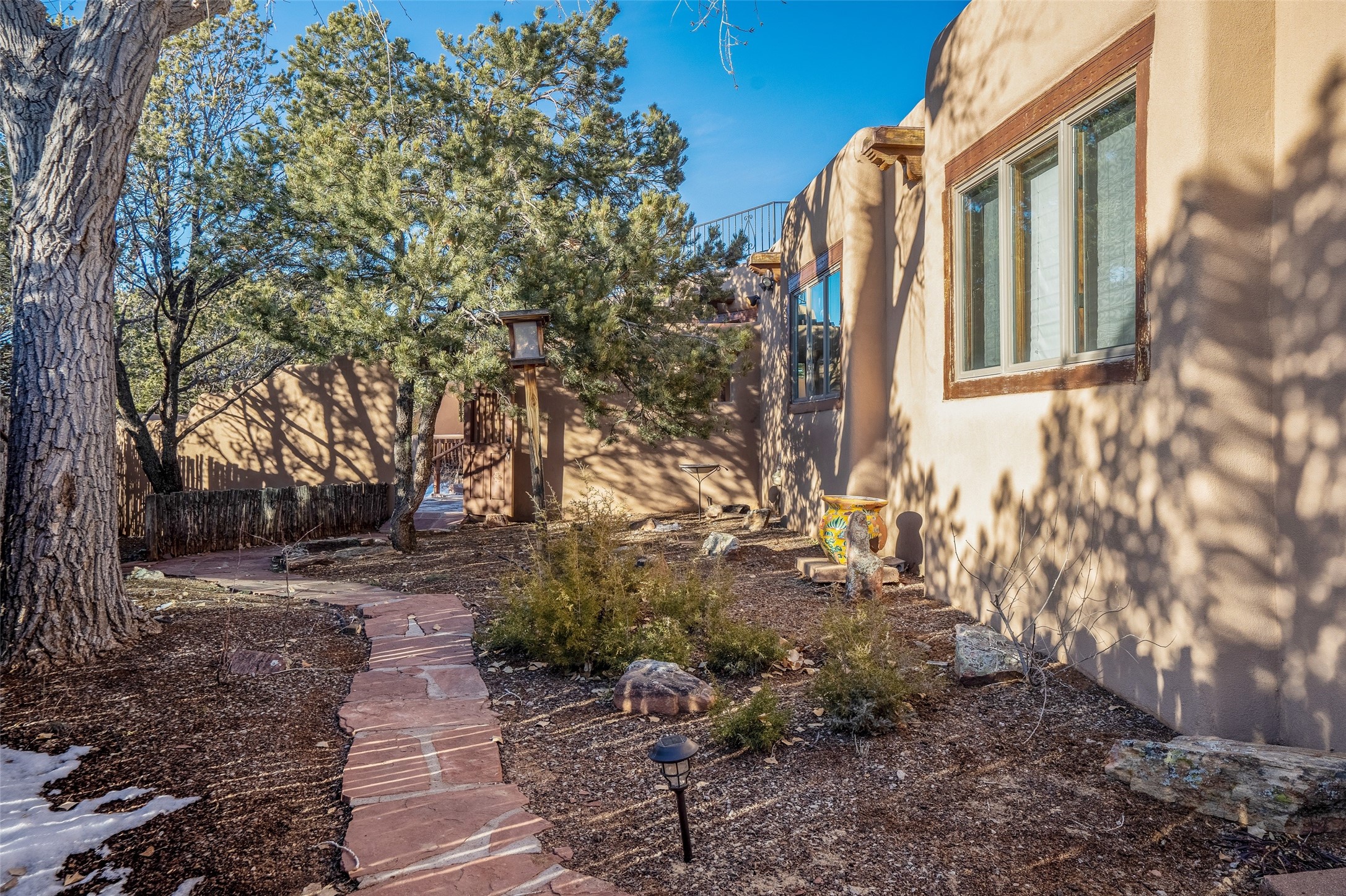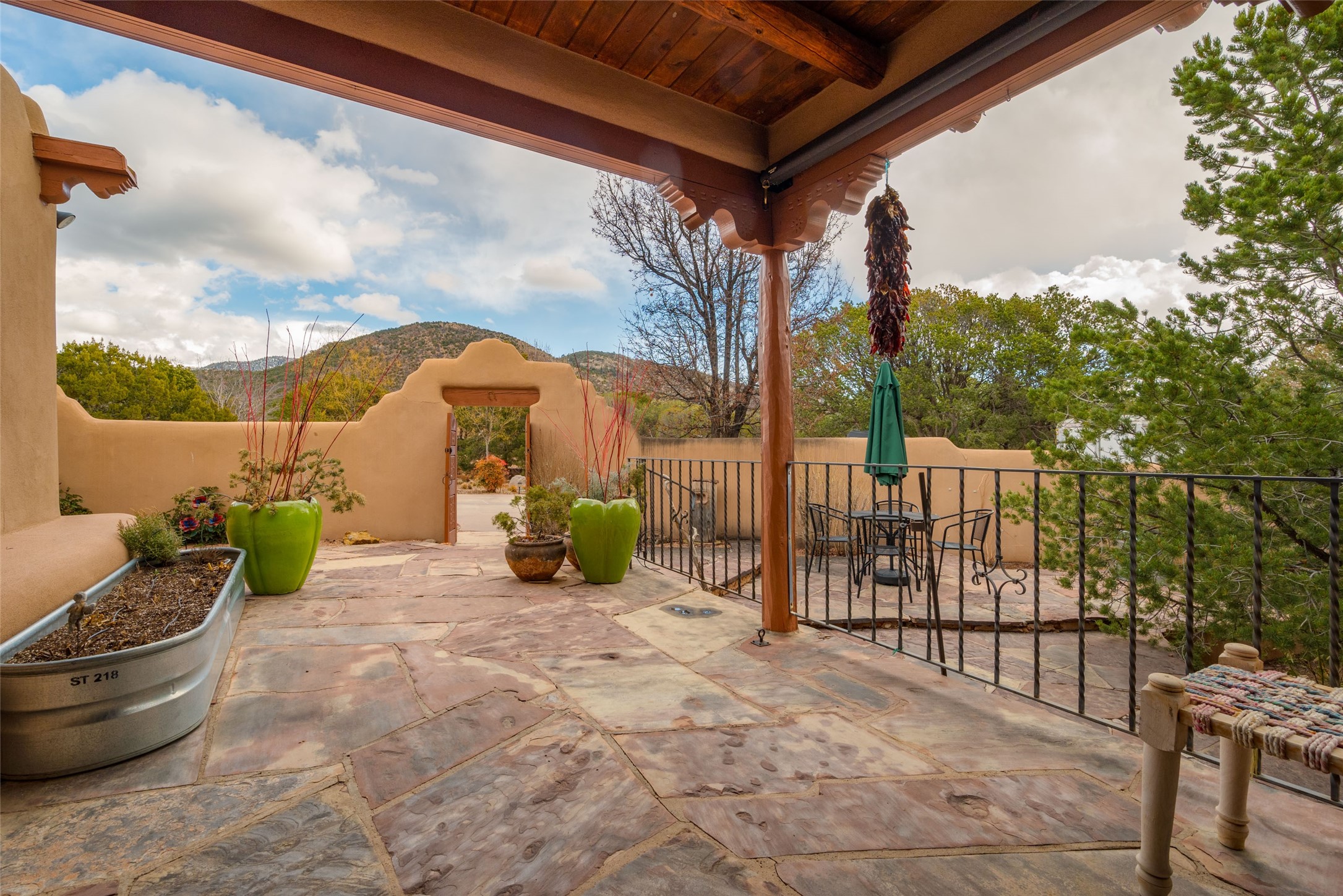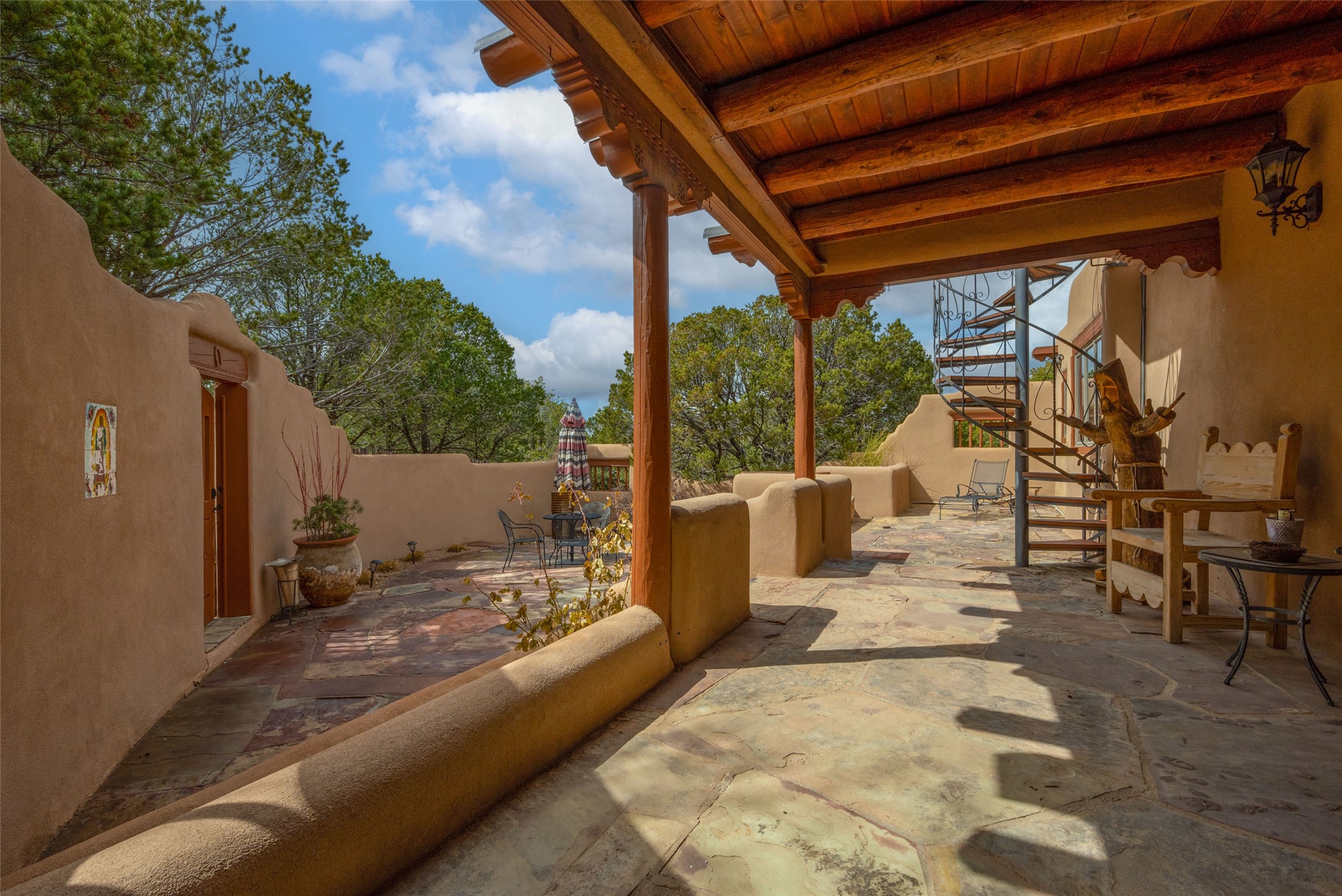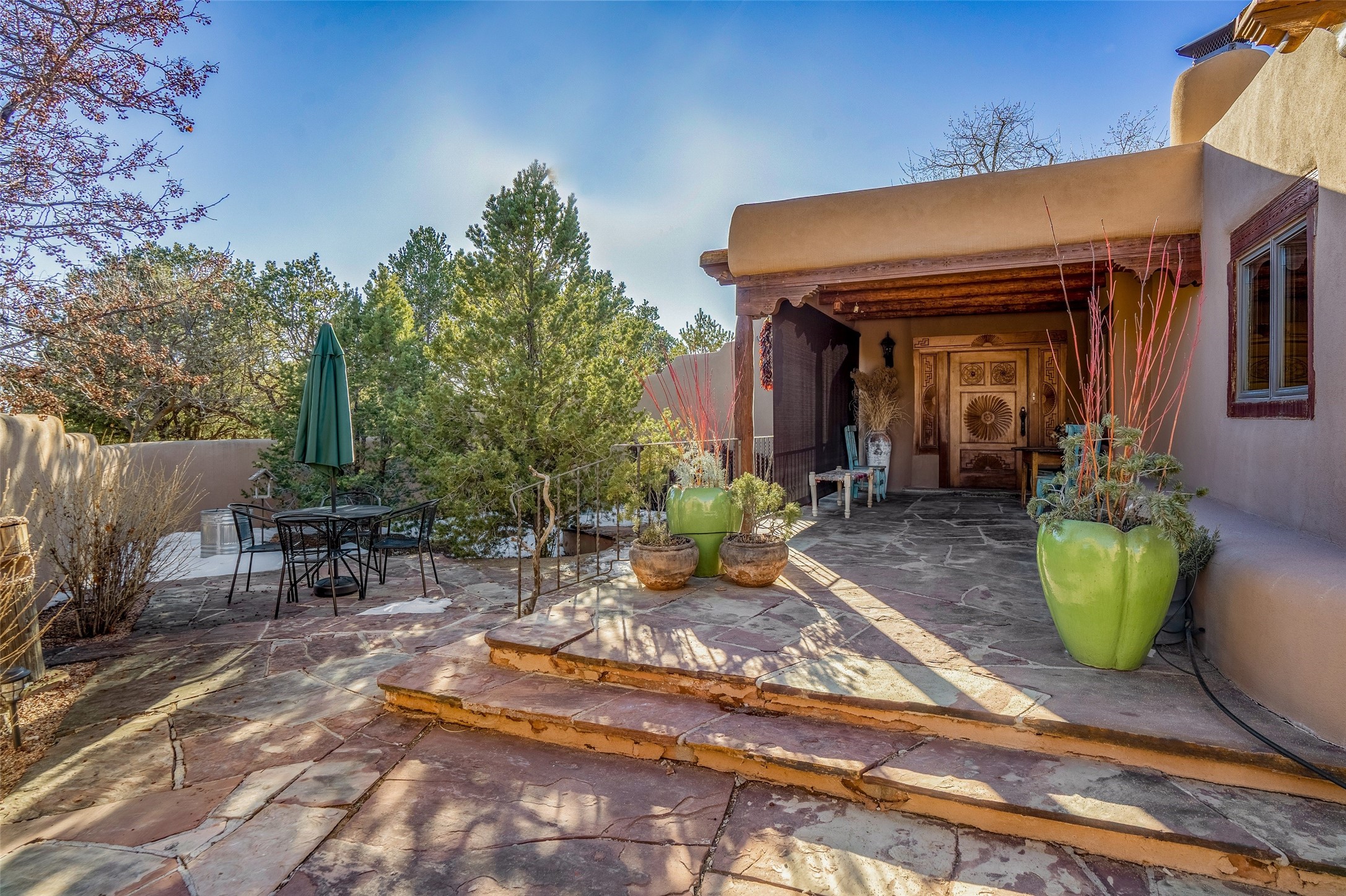 This well designed house has that spacious, Santa Fe style so many of us are looking for. A beautiful and elegant Southwestern home, 4,200 sq ft, close to Museum Hill, oozes with unique details, such as hand-crafted carving on beams and doors, Saltillo tile floors, 5 fireplaces, a stunning outdoor spiral staircase leading up to a rooftop deck. 3 Flagstone courtyards, one at the entrance, and two on either side of the main living area. There are two large living areas and a workroom. The kitchen is a cook's dream with plenty of counter top space, cabinetry and well designed placement of appliances. There is an oversized two car garage, irrigated landscaping and expansive views, a green house and the whole back of the property has been enclosed by a coyote fence with a gate to the back of the property just to take a walk along the arroyo. Once home you are in your own private world yet you are just minutes from downtown, there is one traffic light between you and the Plaza.