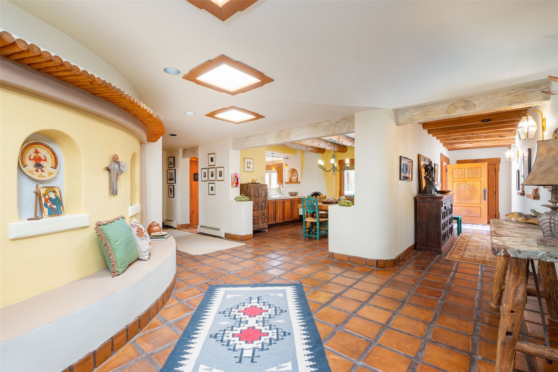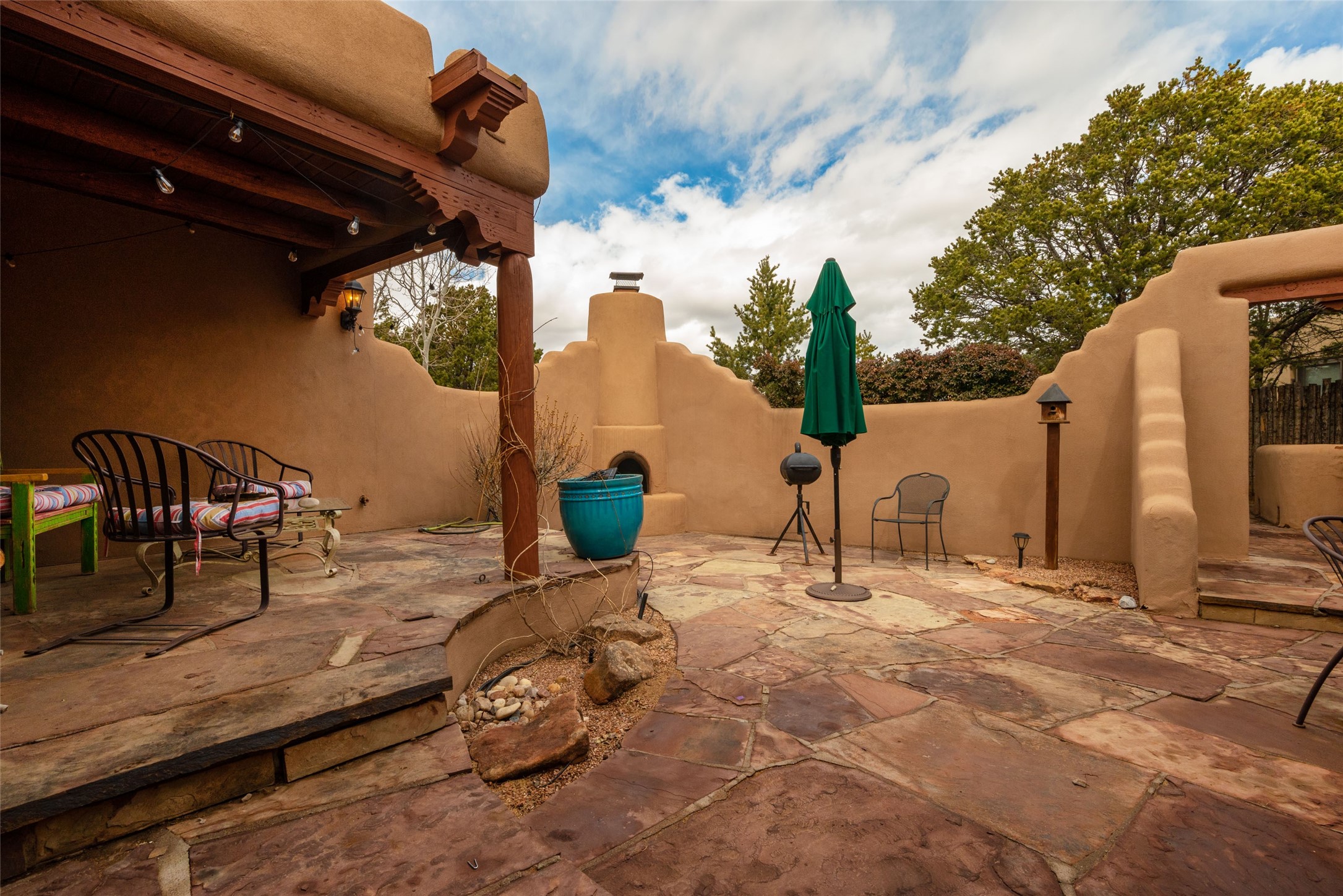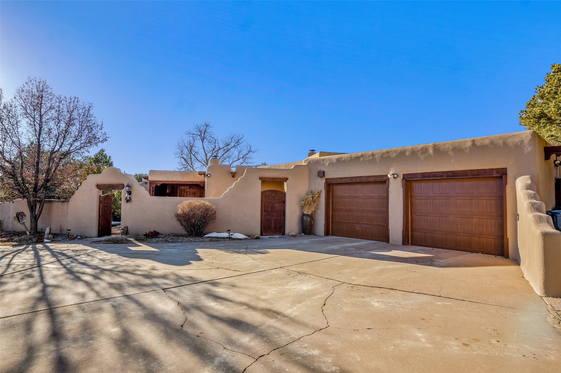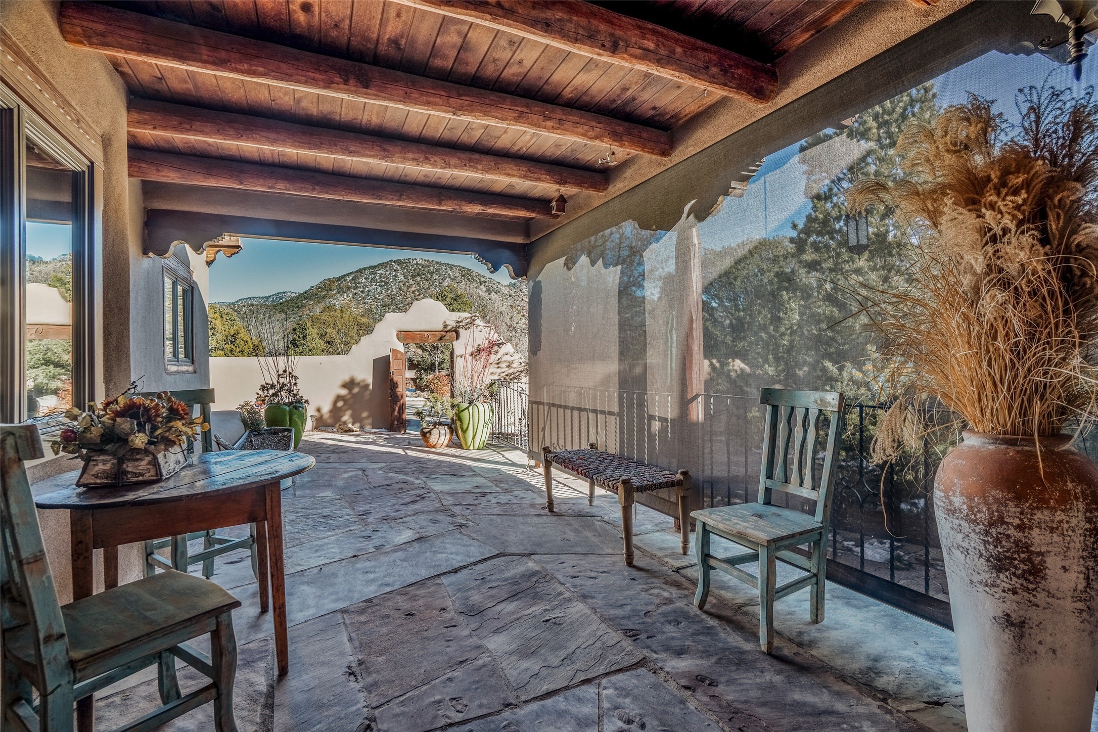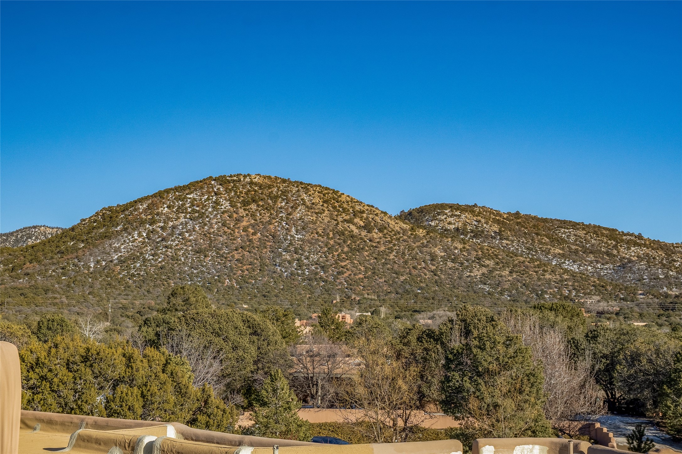 This well designed house has that spacious, Santa Fe style so many of us are looking for. A beautiful and elegant Southwestern home, 4,200 sq ft, close to Museum Hill, oozes with unique details, such as hand-crafted carving on beams and doors, Saltillo tile floors, 5 fireplaces, a stunning outdoor spiral staircase leading up to a rooftop deck. 3 Flagstone courtyards, one at the entrance, and two on either side of the main living area. There are two large living areas and a workroom. The kitchen is a cook's dream with plenty of counter top space, cabinetry and well designed placement of appliances. There is an oversized two car garage, irrigated landscaping and expansive views, a green house and the whole back of the property has been enclosed by a coyote fence with a gate to the back of the property just to take a walk along the arroyo. Once home you are in your own private world yet you are just minutes from downtown, there is one traffic light between you and the Plaza.