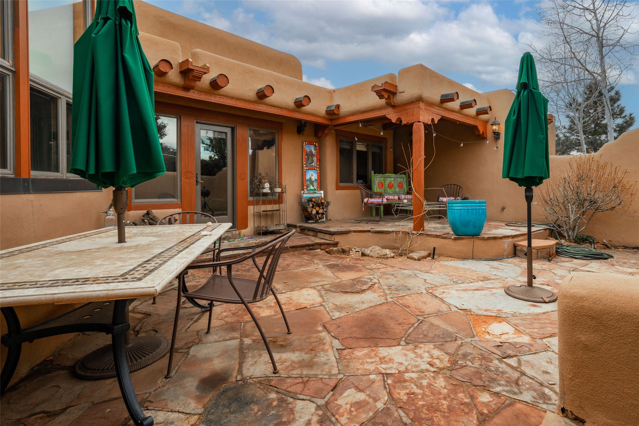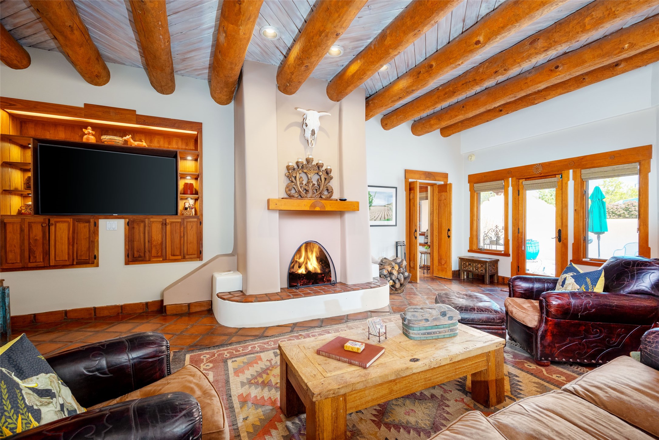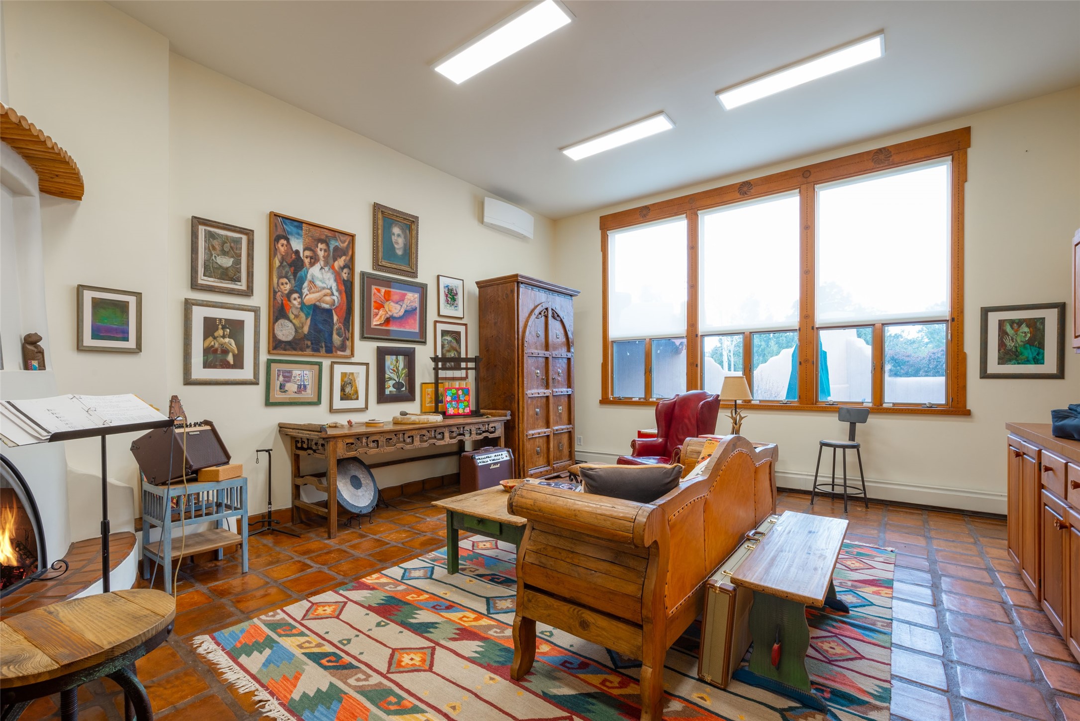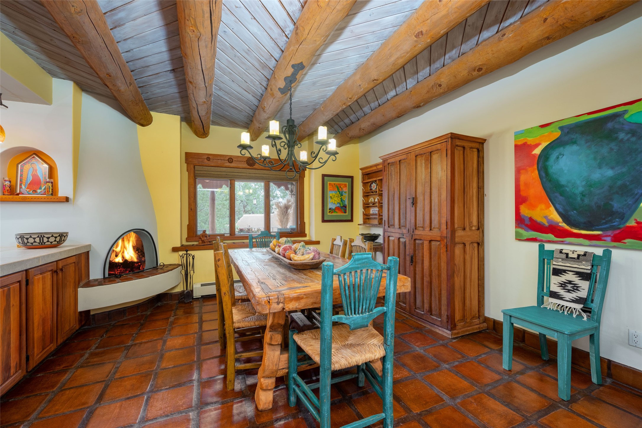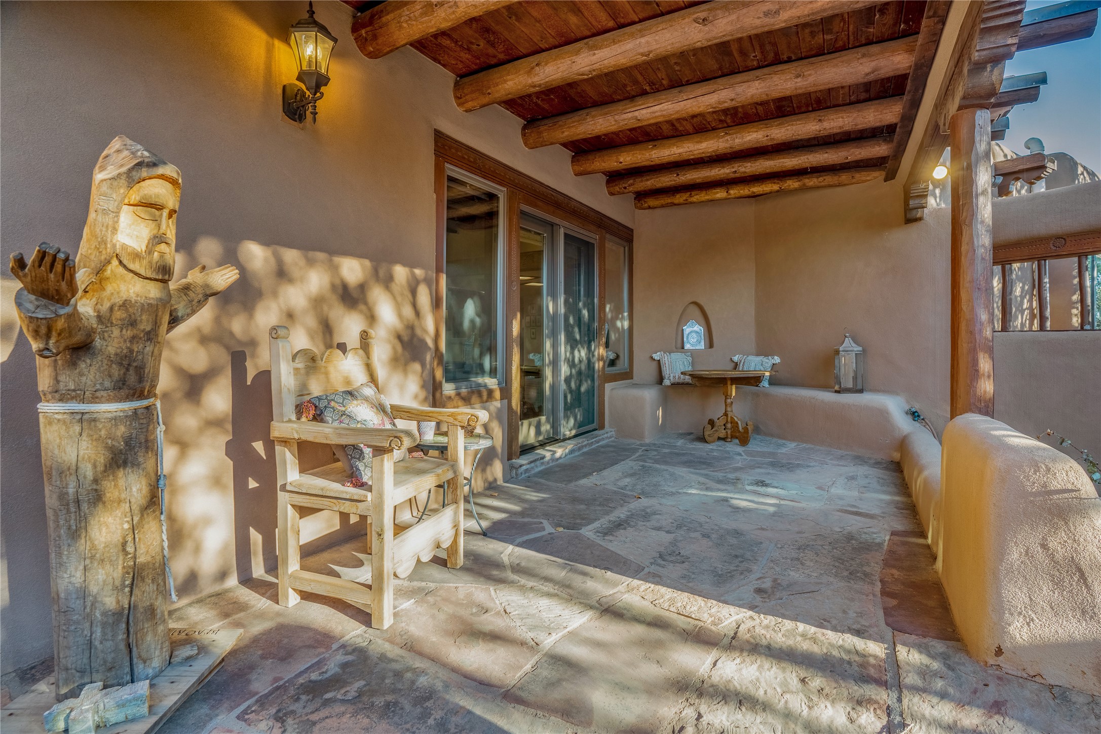 This well designed house has that spacious, Santa Fe style so many of us are looking for. A beautiful and elegant Southwestern home, 4,200 sq ft, close to Museum Hill, oozes with unique details, such as hand-crafted carving on beams and doors, Saltillo tile floors, 5 fireplaces, a stunning outdoor spiral staircase leading up to a rooftop deck. 3 Flagstone courtyards, one at the entrance, and two on either side of the main living area. There are two large living areas and a workroom. The kitchen is a cook's dream with plenty of counter top space, cabinetry and well designed placement of appliances. There is an oversized two car garage, irrigated landscaping and expansive views, a green house and the whole back of the property has been enclosed by a coyote fence with a gate to the back of the property just to take a walk along the arroyo. Once home you are in your own private world yet you are just minutes from downtown, there is one traffic light between you and the Plaza.
