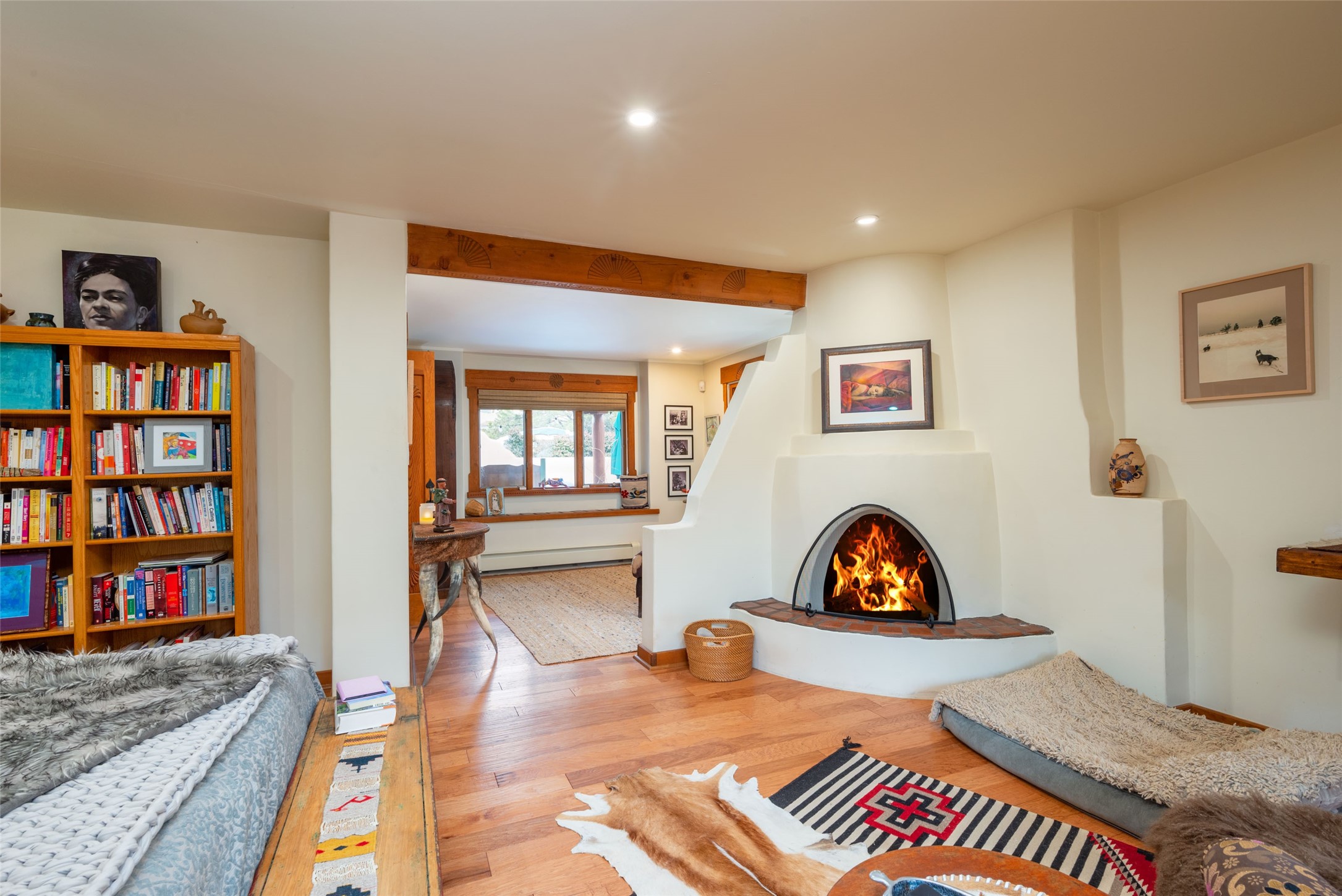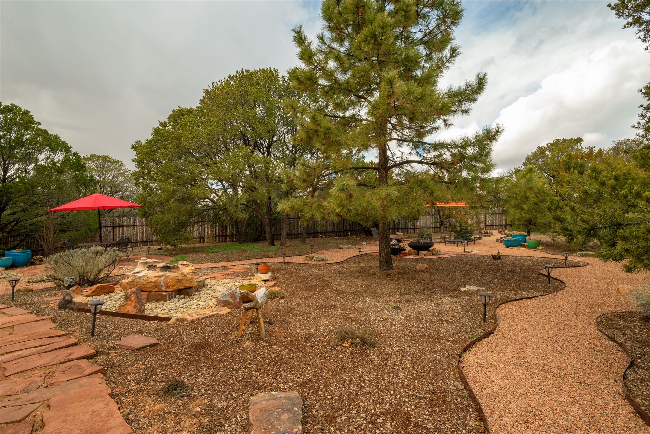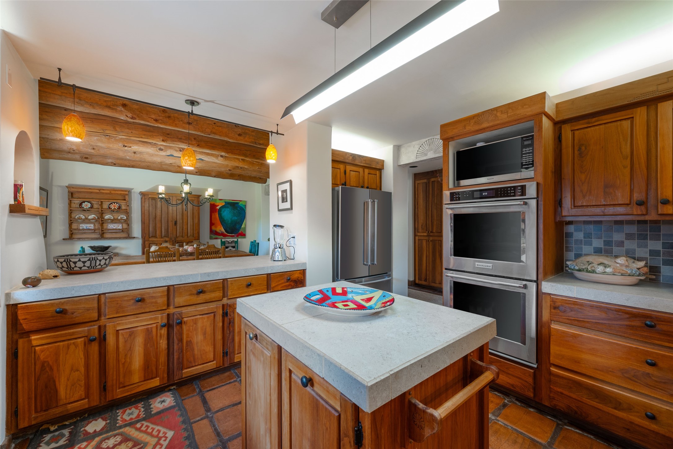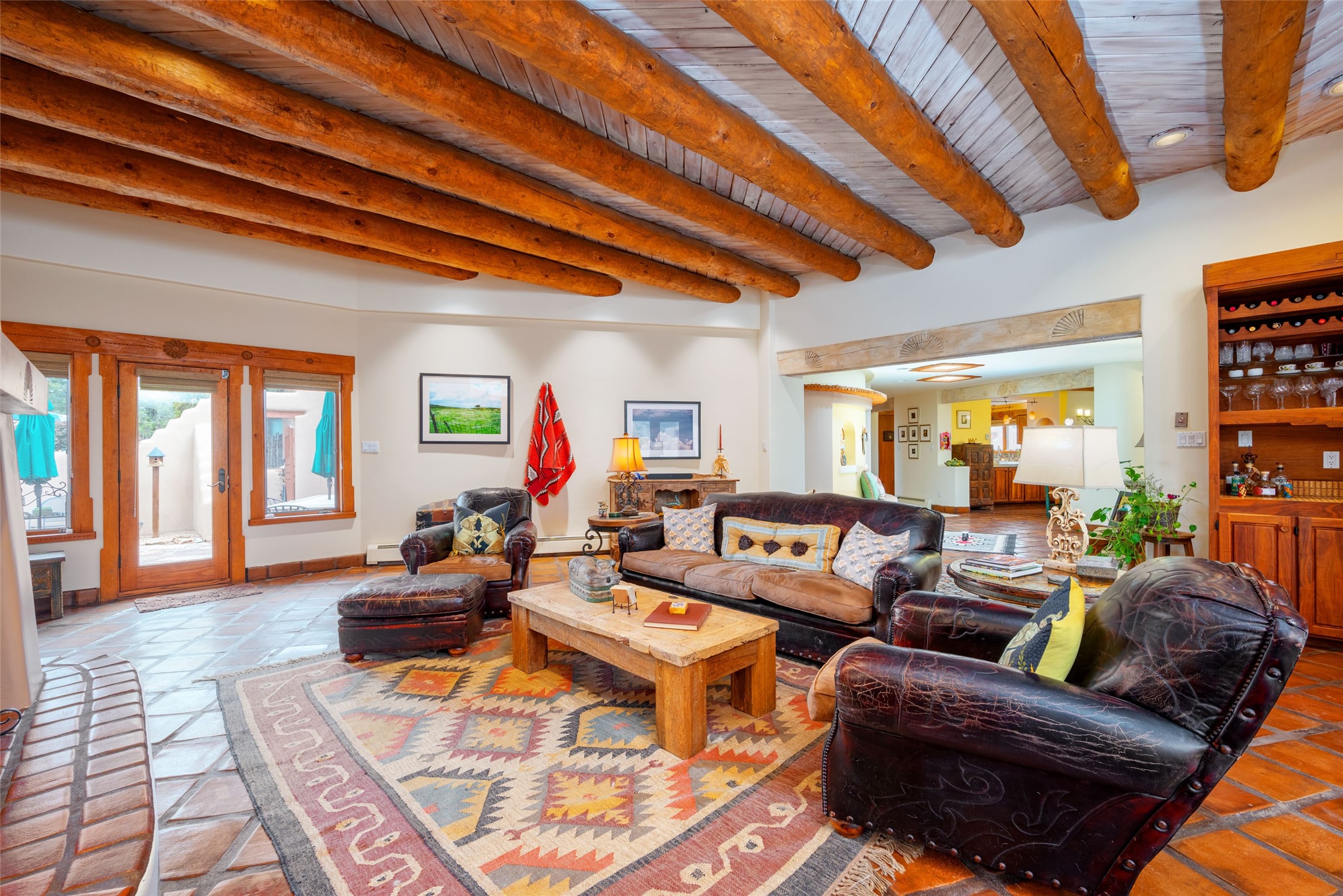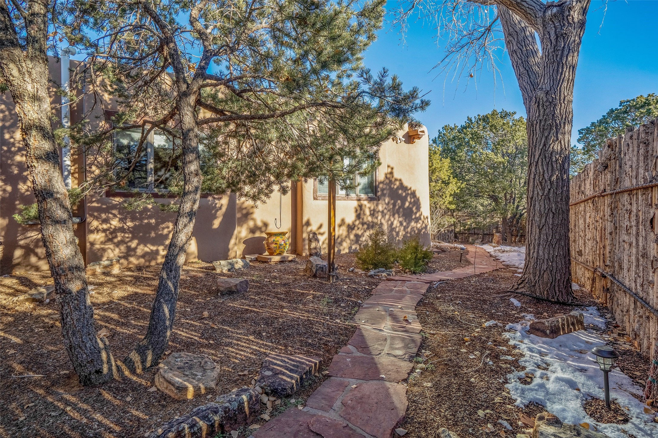 This well designed house has that spacious, Santa Fe style so many of us are looking for. A beautiful and elegant Southwestern home, 4,200 sq ft, close to Museum Hill, oozes with unique details, such as hand-crafted carving on beams and doors, Saltillo tile floors, 5 fireplaces, a stunning outdoor spiral staircase leading up to a rooftop deck. 3 Flagstone courtyards, one at the entrance, and two on either side of the main living area. There are two large living areas and a workroom. The kitchen is a cook's dream with plenty of counter top space, cabinetry and well designed placement of appliances. There is an oversized two car garage, irrigated landscaping and expansive views, a green house and the whole back of the property has been enclosed by a coyote fence with a gate to the back of the property just to take a walk along the arroyo. Once home you are in your own private world yet you are just minutes from downtown, there is one traffic light between you and the Plaza.