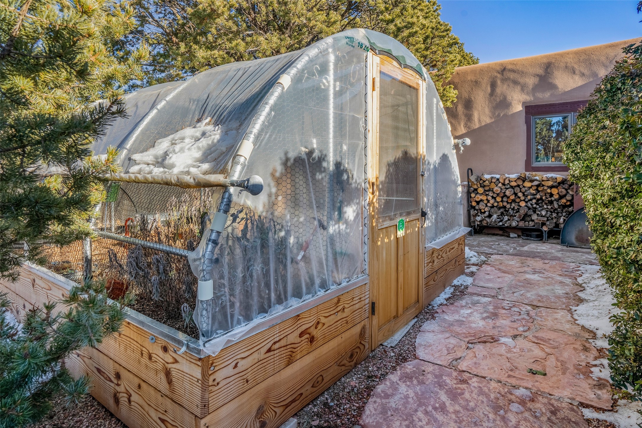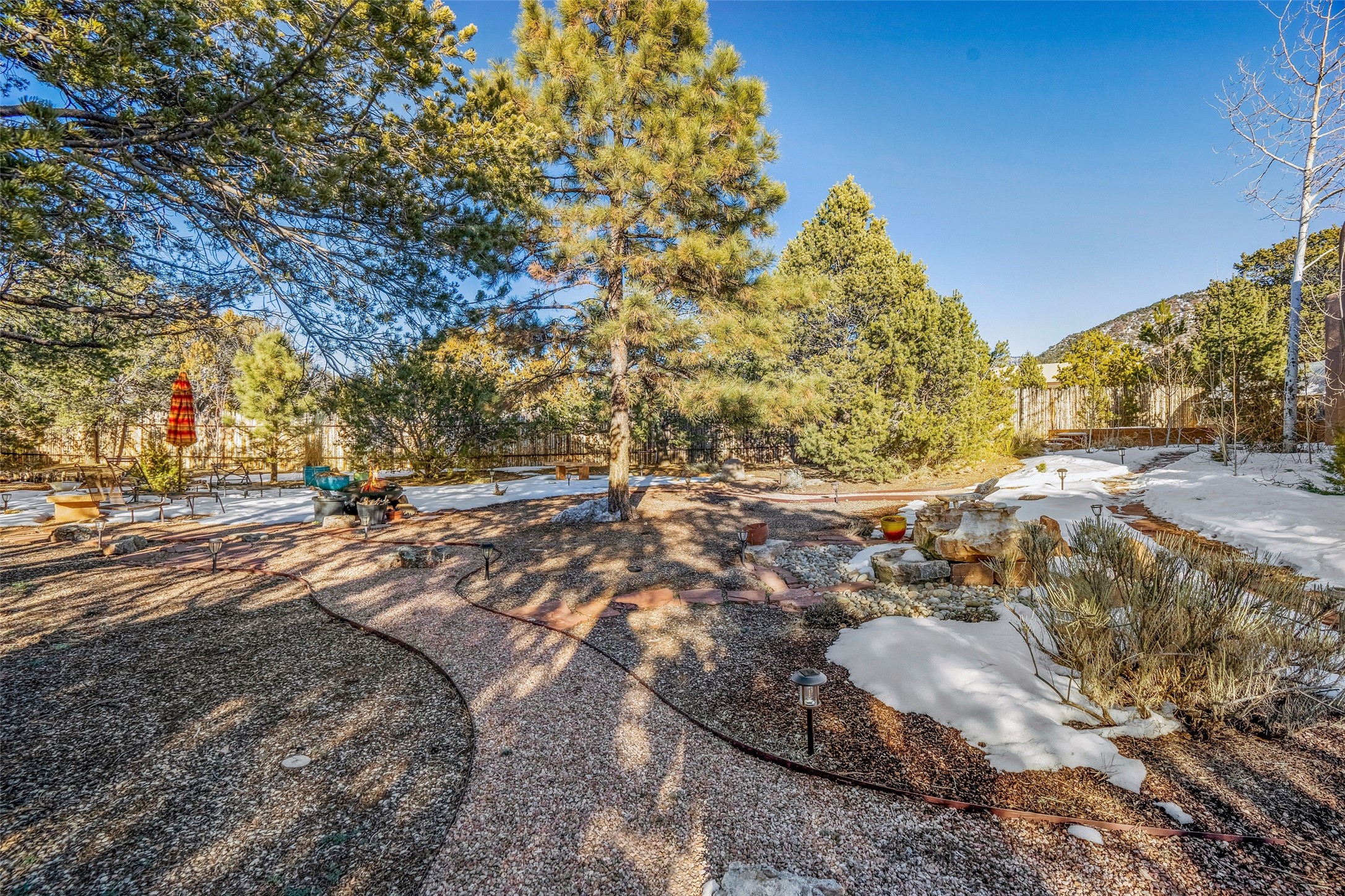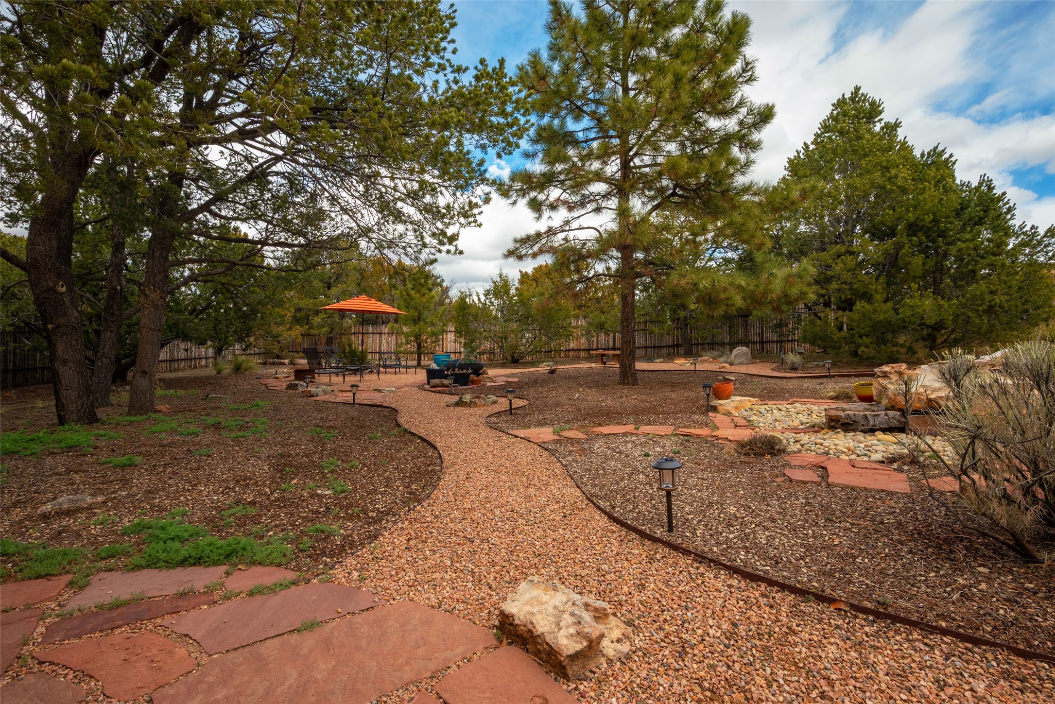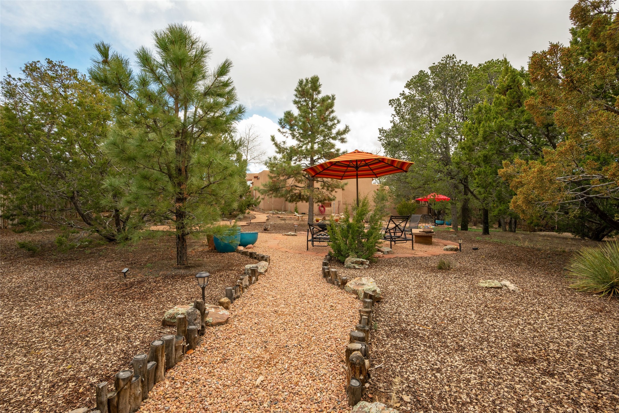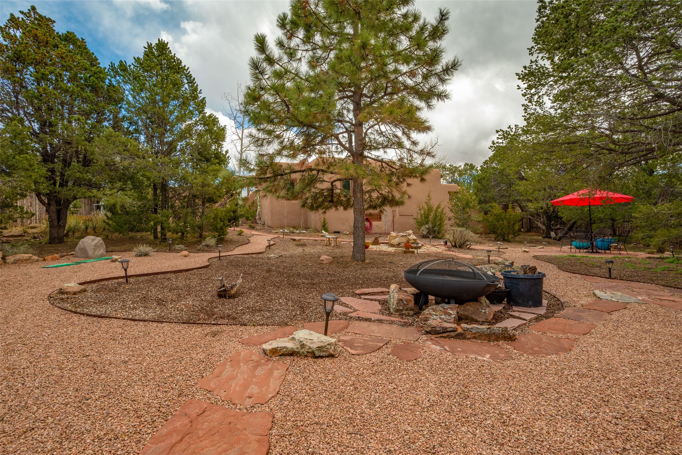 This well designed house has that spacious, Santa Fe style so many of us are looking for. A beautiful and elegant Southwestern home, 4,200 sq ft, close to Museum Hill, oozes with unique details, such as hand-crafted carving on beams and doors, Saltillo tile floors, 5 fireplaces, a stunning outdoor spiral staircase leading up to a rooftop deck. 3 Flagstone courtyards, one at the entrance, and two on either side of the main living area. There are two large living areas and a workroom. The kitchen is a cook's dream with plenty of counter top space, cabinetry and well designed placement of appliances. There is an oversized two car garage, irrigated landscaping and expansive views, a green house and the whole back of the property has been enclosed by a coyote fence with a gate to the back of the property just to take a walk along the arroyo. Once home you are in your own private world yet you are just minutes from downtown, there is one traffic light between you and the Plaza.