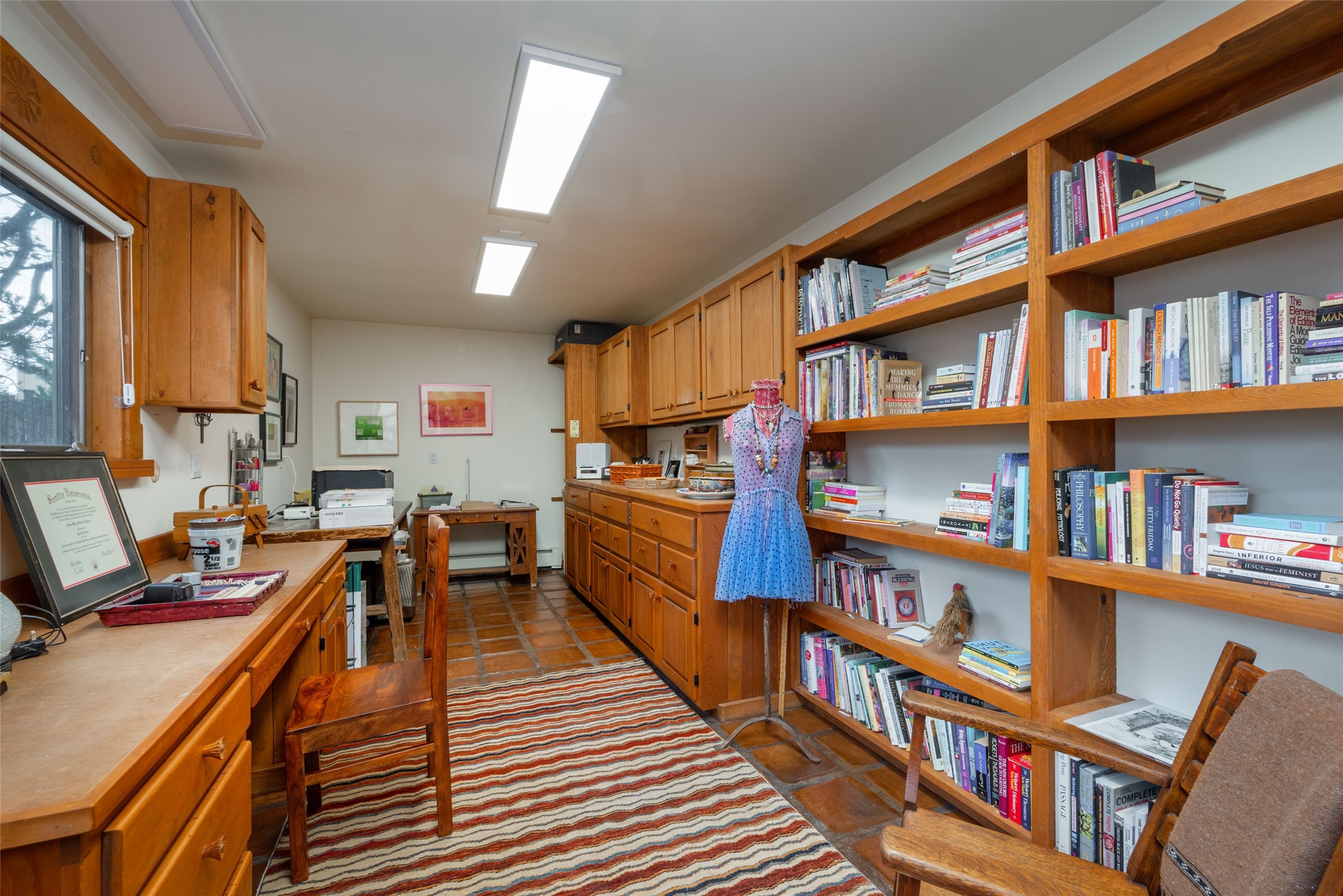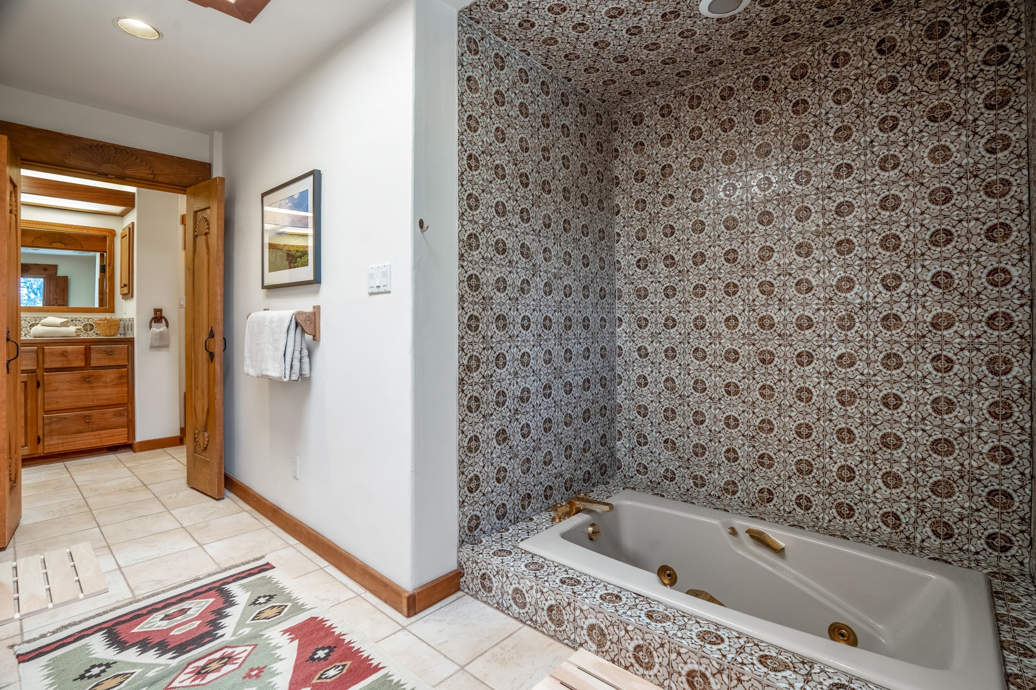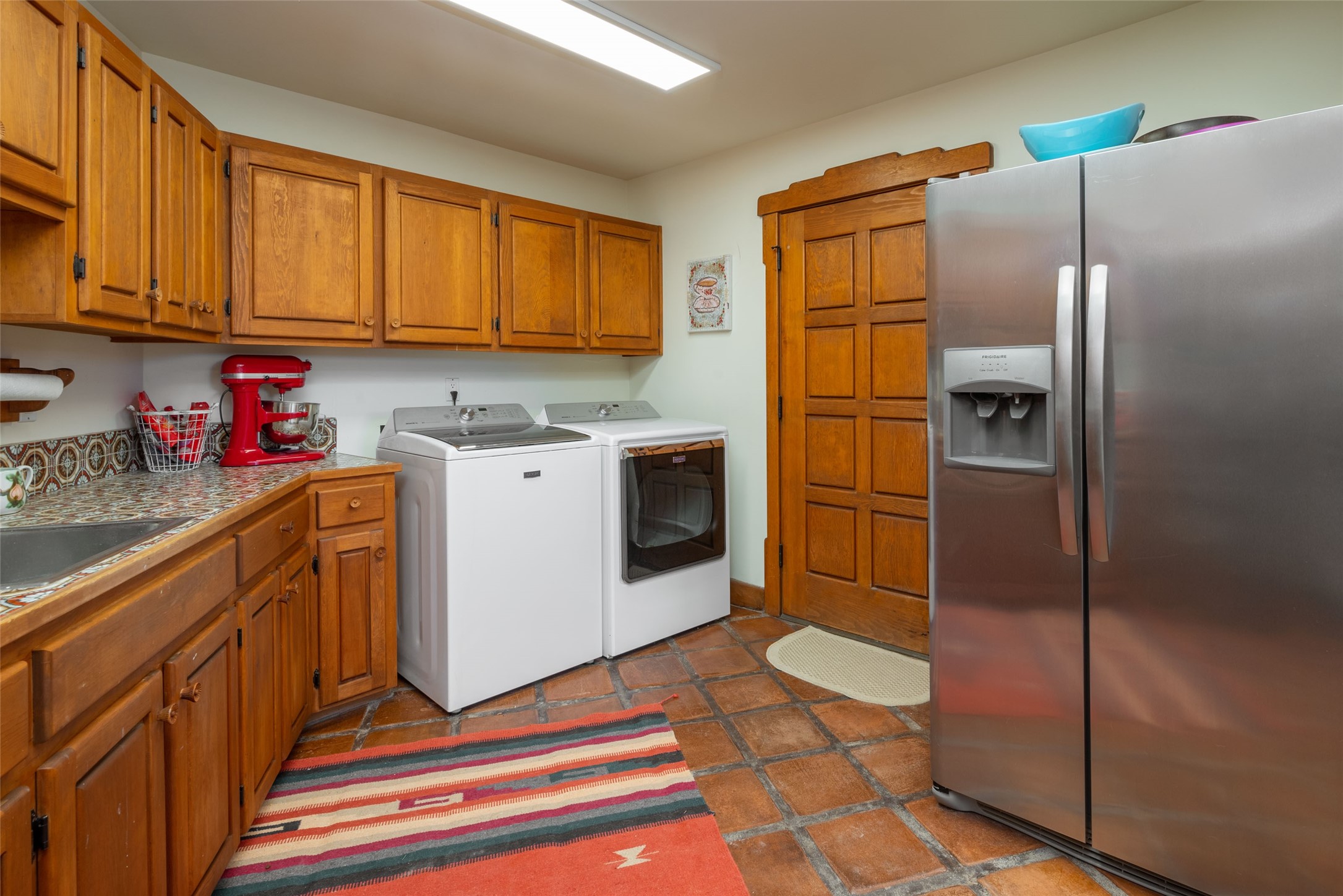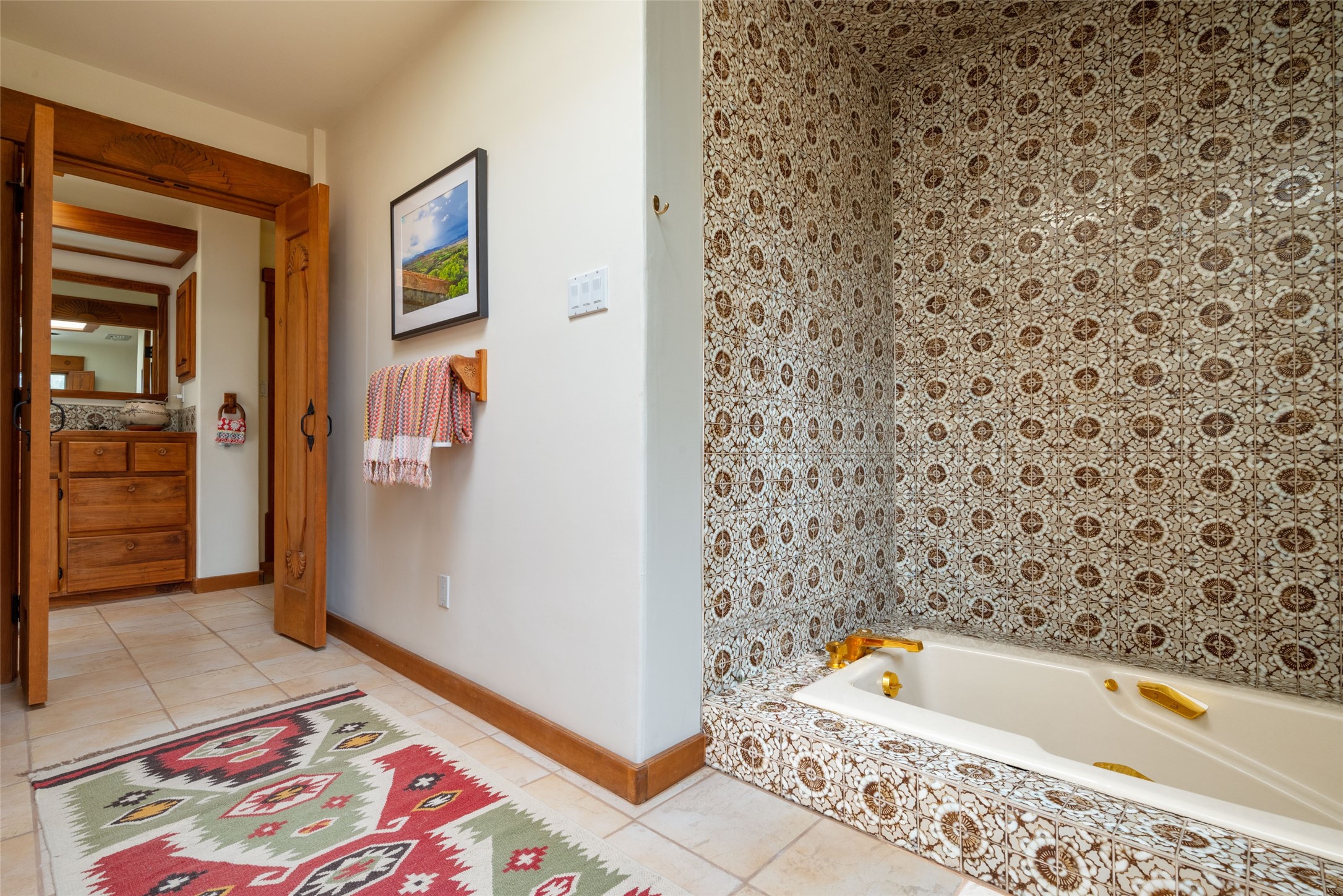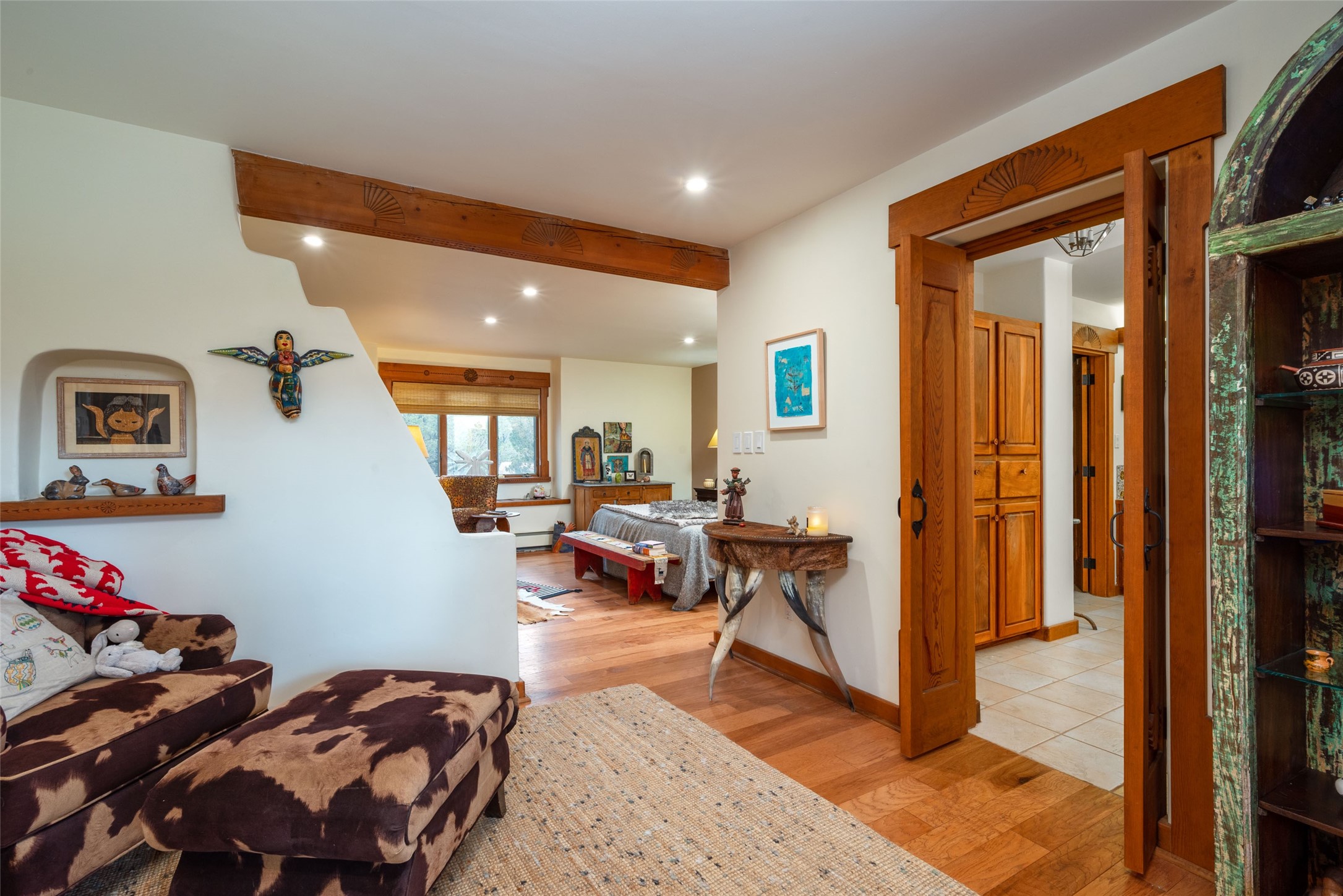 This well designed house has that spacious, Santa Fe style so many of us are looking for. A beautiful and elegant Southwestern home, 4,200 sq ft, close to Museum Hill, oozes with unique details, such as hand-crafted carving on beams and doors, Saltillo tile floors, 5 fireplaces, a stunning outdoor spiral staircase leading up to a rooftop deck. 3 Flagstone courtyards, one at the entrance, and two on either side of the main living area. There are two large living areas and a workroom. The kitchen is a cook's dream with plenty of counter top space, cabinetry and well designed placement of appliances. There is an oversized two car garage, irrigated landscaping and expansive views, a green house and the whole back of the property has been enclosed by a coyote fence with a gate to the back of the property just to take a walk along the arroyo. Once home you are in your own private world yet you are just minutes from downtown, there is one traffic light between you and the Plaza.