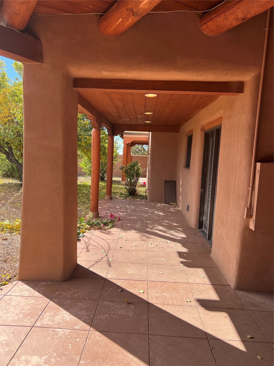 Country living close to Santa Fe. This custom home is located on a cul de sac lot, just minutes outside of Santa Fe. This home features 3 bedrooms, a large primary suite with a sitting/gym/or office area, located just off the primary bedroom, complete with a spa like bath and a large walk in closet! The SW features include, Vigas, Beams, Nichos, T&G ceilings and a 2 Kiva fireplaces. Recessed lighting and skylights make this home light and bright. There are new cabinets and countertops throughout. The converted garage is great for an extra large den/second living room. The detached garage is great for your cars, toys, boats etc.! or great as a separate studio.