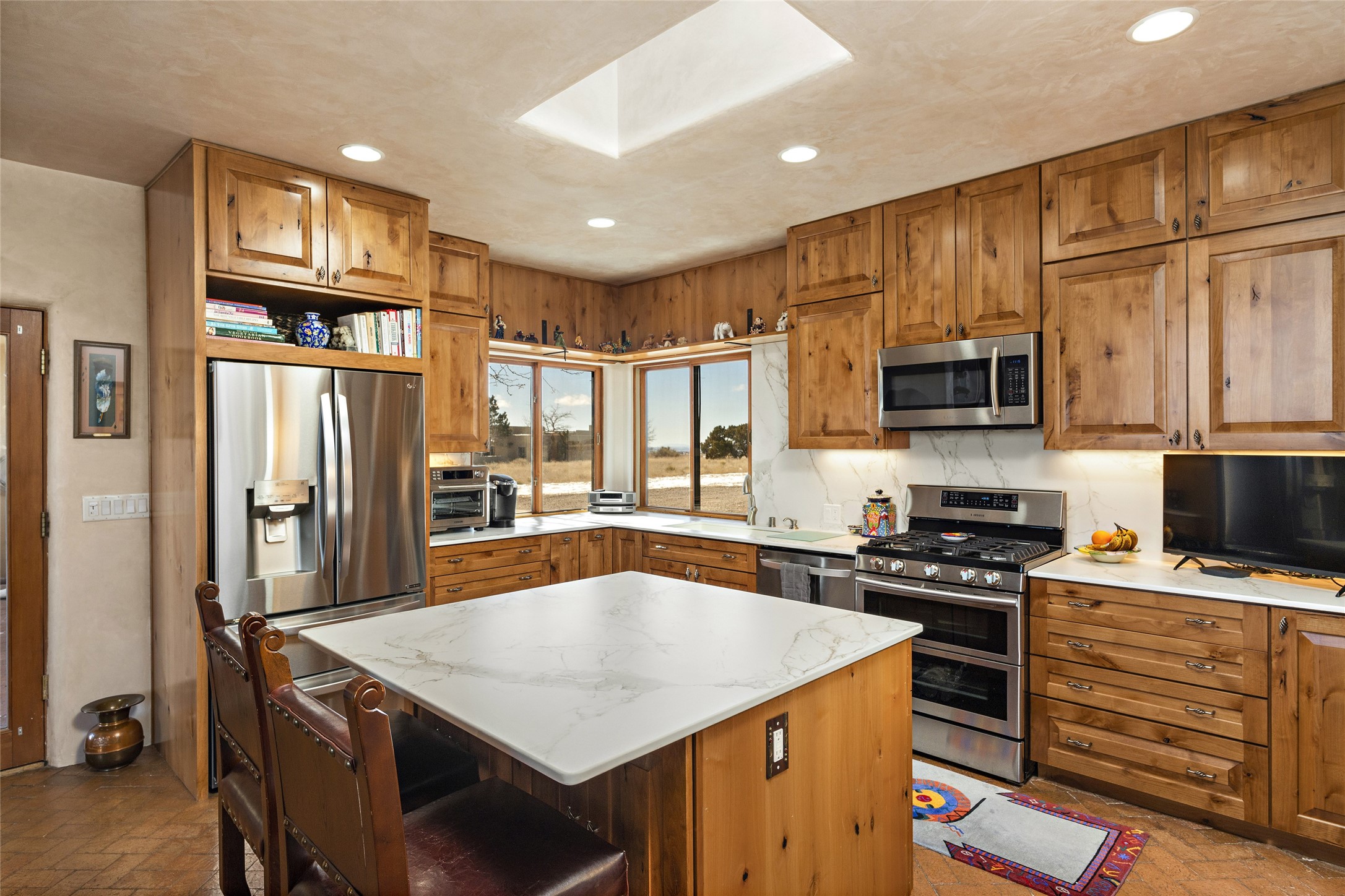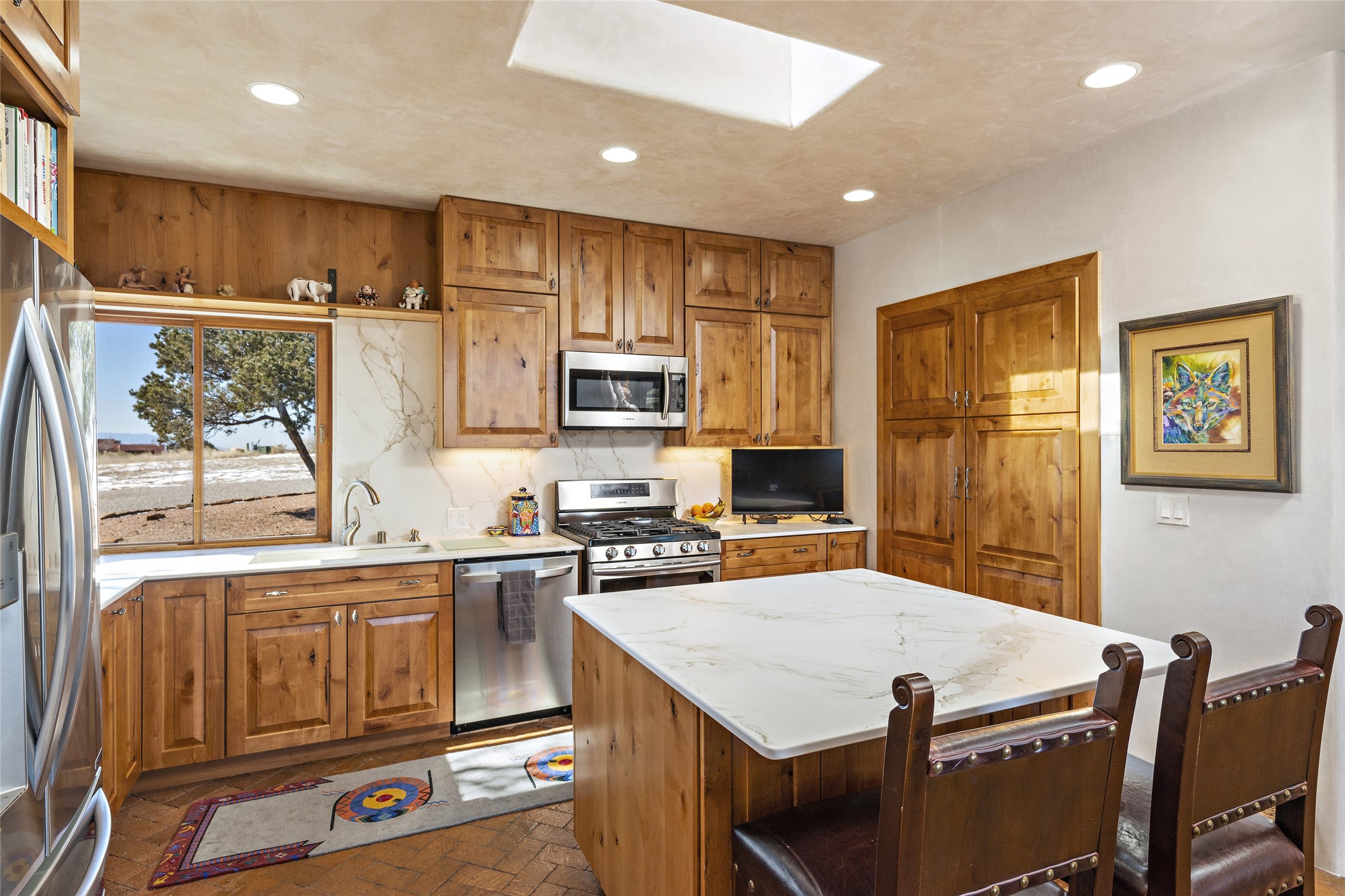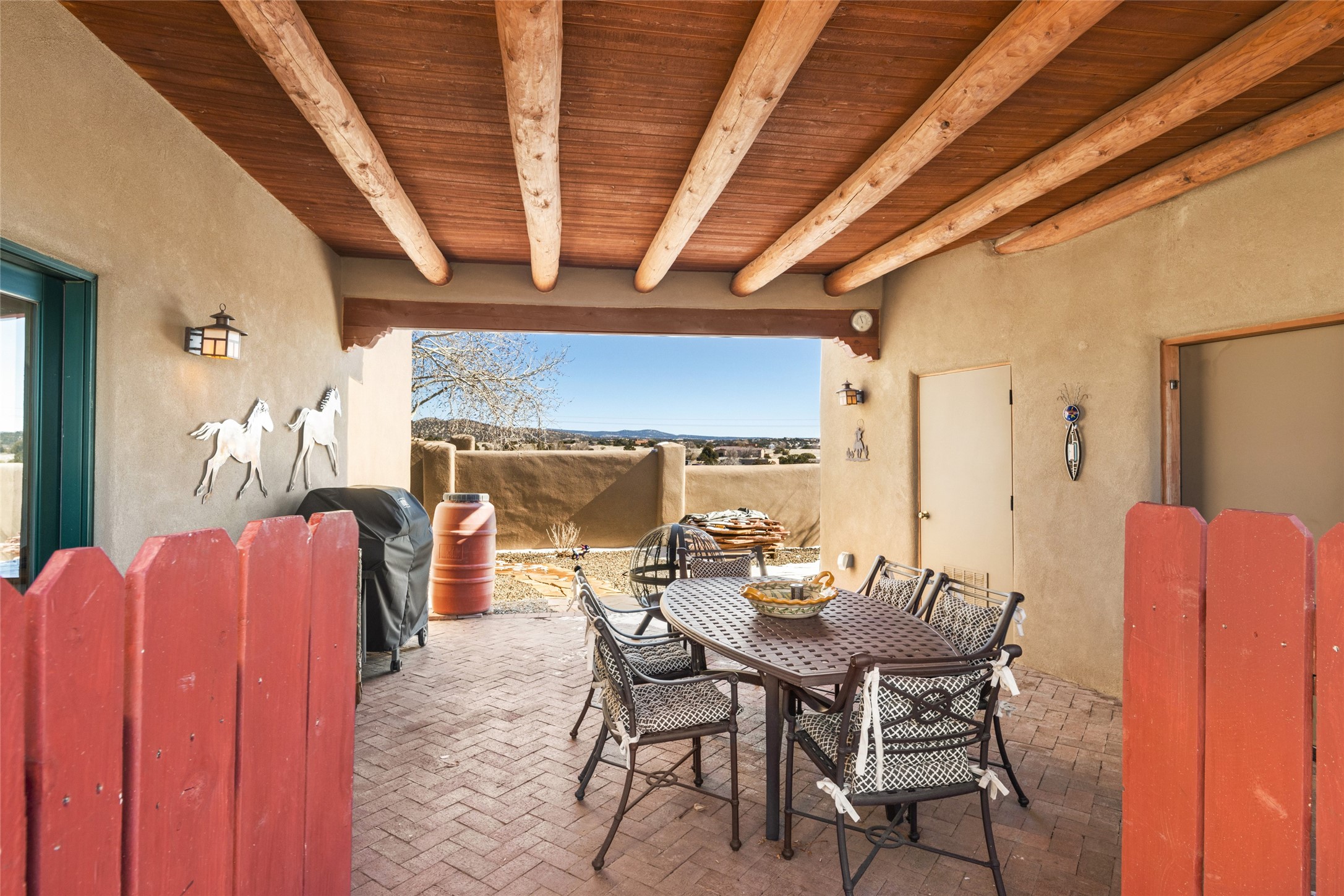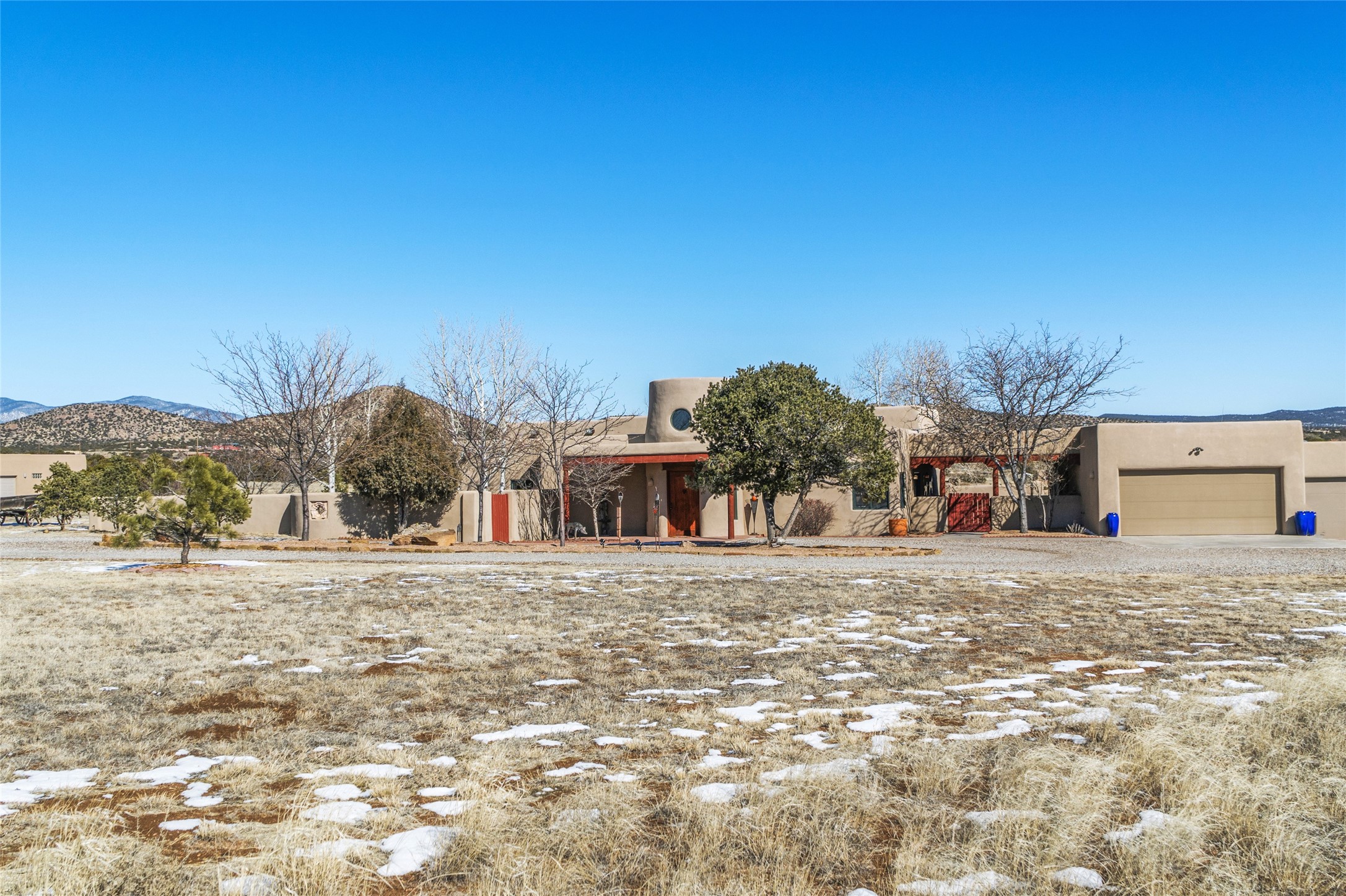 CASA CONTENTA. Named by the owners, this gorgeous La Paz at Eldorado property is sited on nearly 3 acres with a fully updated kitchen in 2021. Double ovens, island with storage and built-in recycle center and spice rack. Spacious shelved pantry. Matte porcelain counters and backsplash. Custom cabinets go all the way to the ceiling. Lots of generous drawers - all soft close. Dramatic and formal entry with diamond plaster in public areas and brick floors throughout. Three mini-splits provide cooling for primary bedroom, open kitchen, living and dining areas and fully outfitted gym. **All gym equipment conveys with the property. The primary bedroom is quite spacious with 12' ceilings, luxurious whirlpool tub, double sinks, a steam shower, towel warmer and walk-in closet. A den/office with pocket doors is a perfect second living area or could be a 4th bedroom. There is a tremendous amount of well-thought out storage in this home. Walled front and back courtyards with mature and happy Aspen trees. NO STEPS, NO KITEC, NO CARPET. There is a fully outfitted gym behind the garage which could be studio or workshop space. All this on a paved road too! Do some real stargazing from the hot tub. LG washer and dryer stay with the property. New Lochinar boiler in 2021. Newish stucco. Security system. Finished 2-car garage with epoxy floor. A small finished third-bay garage can be flex space.