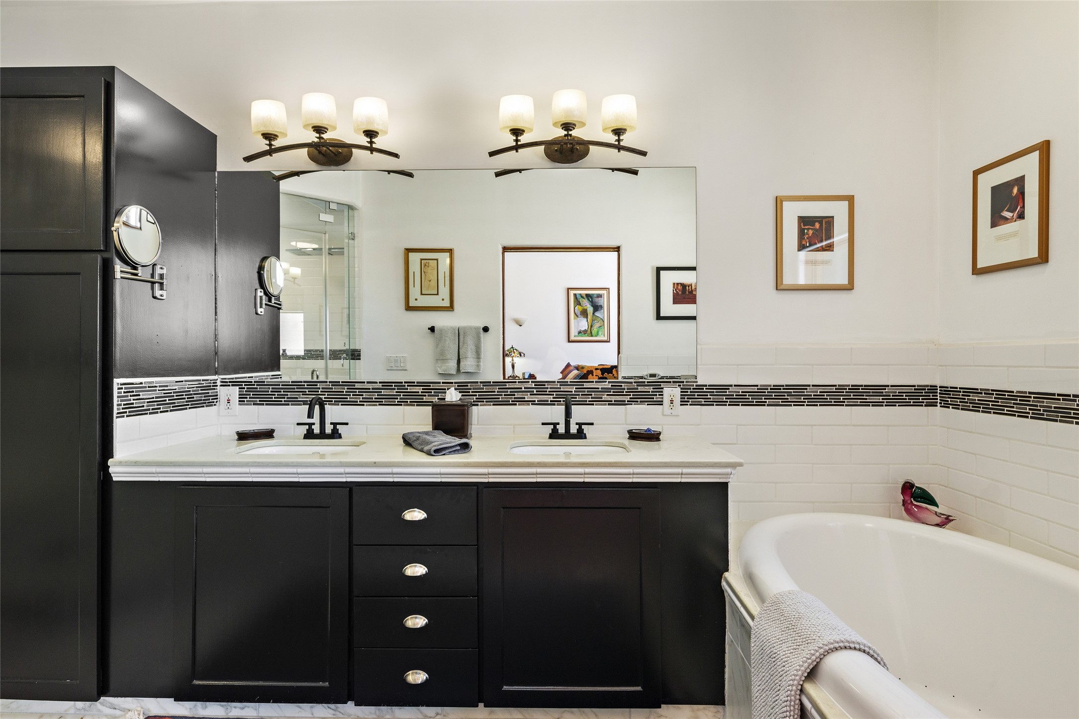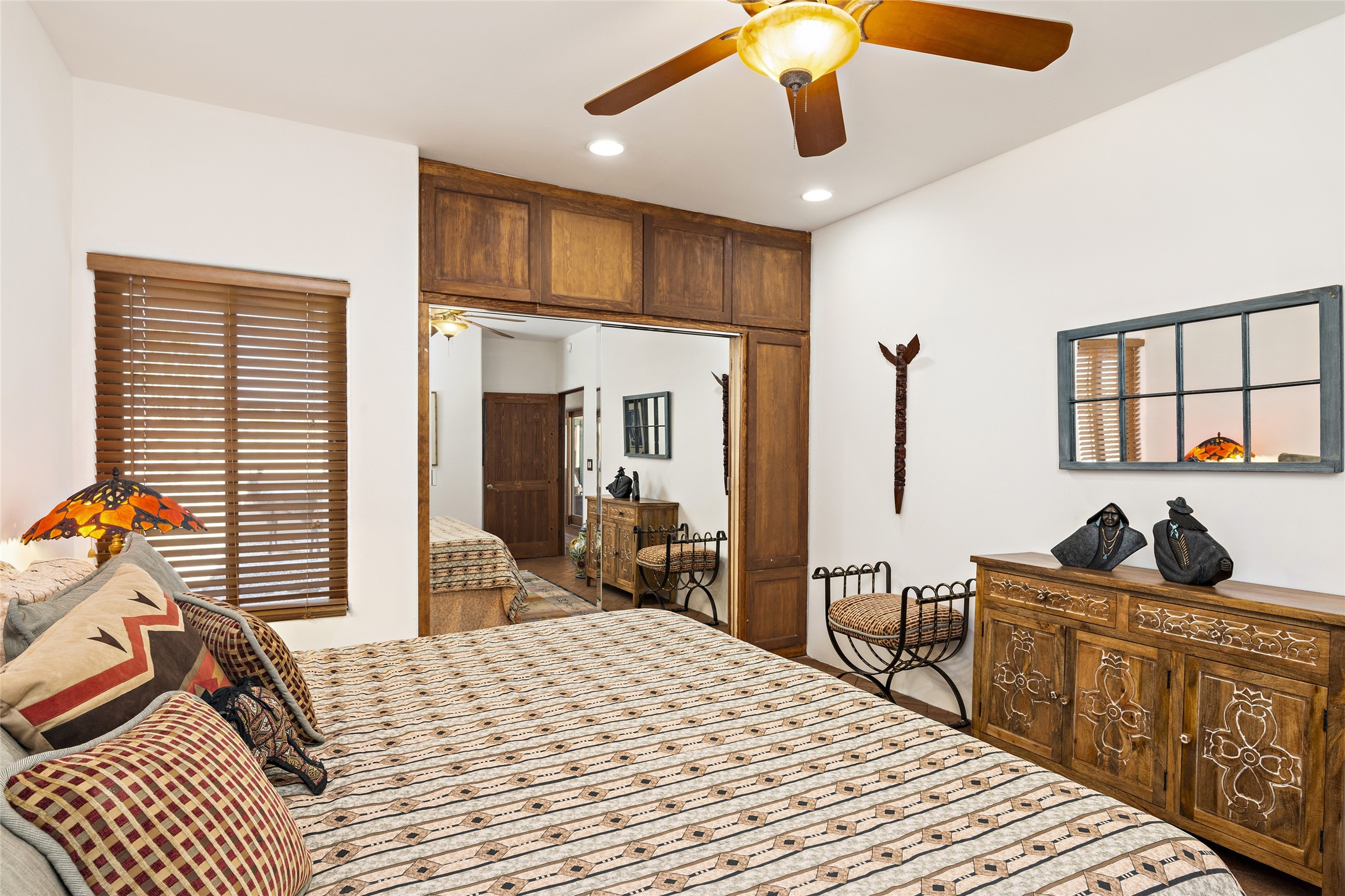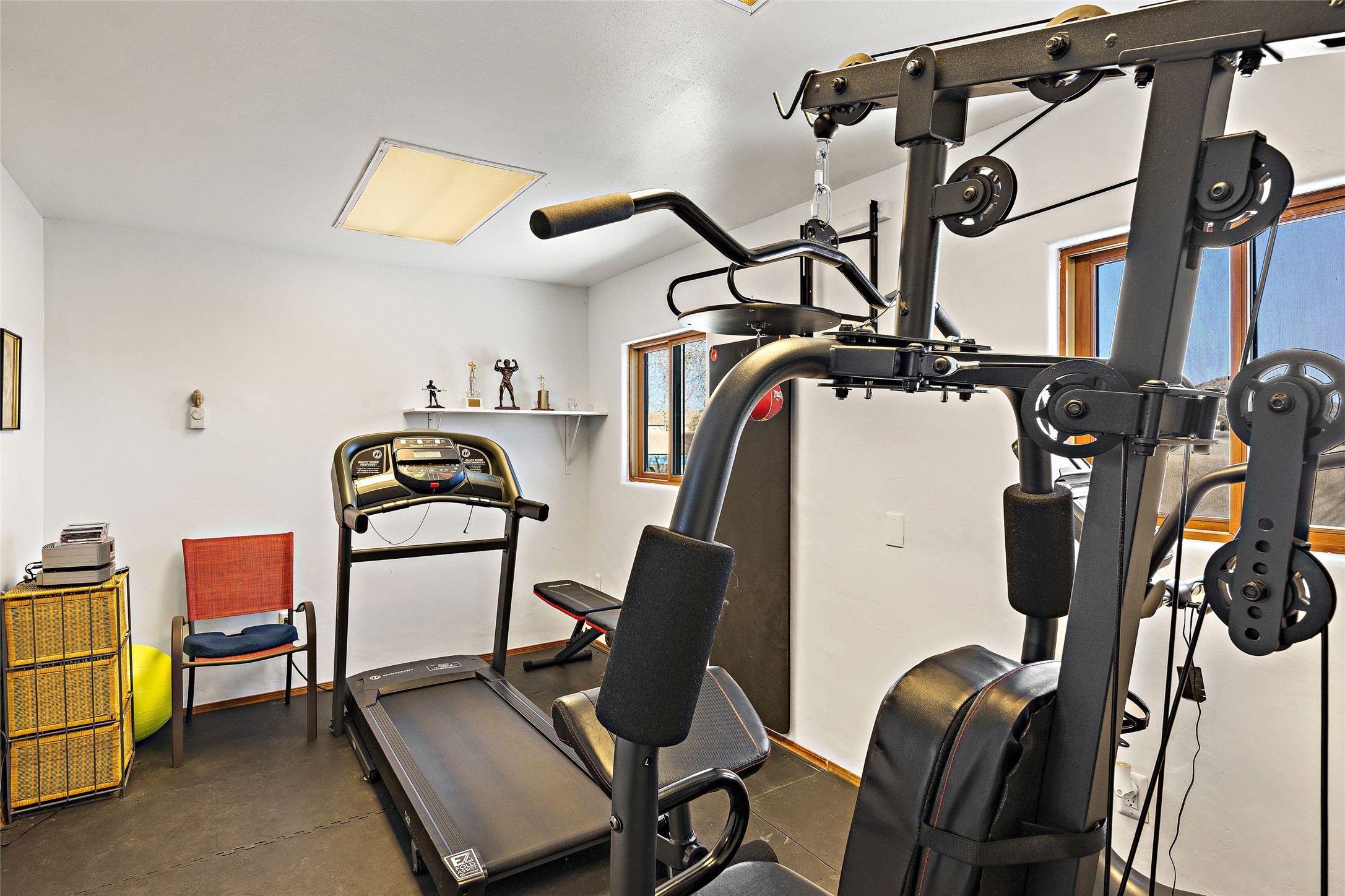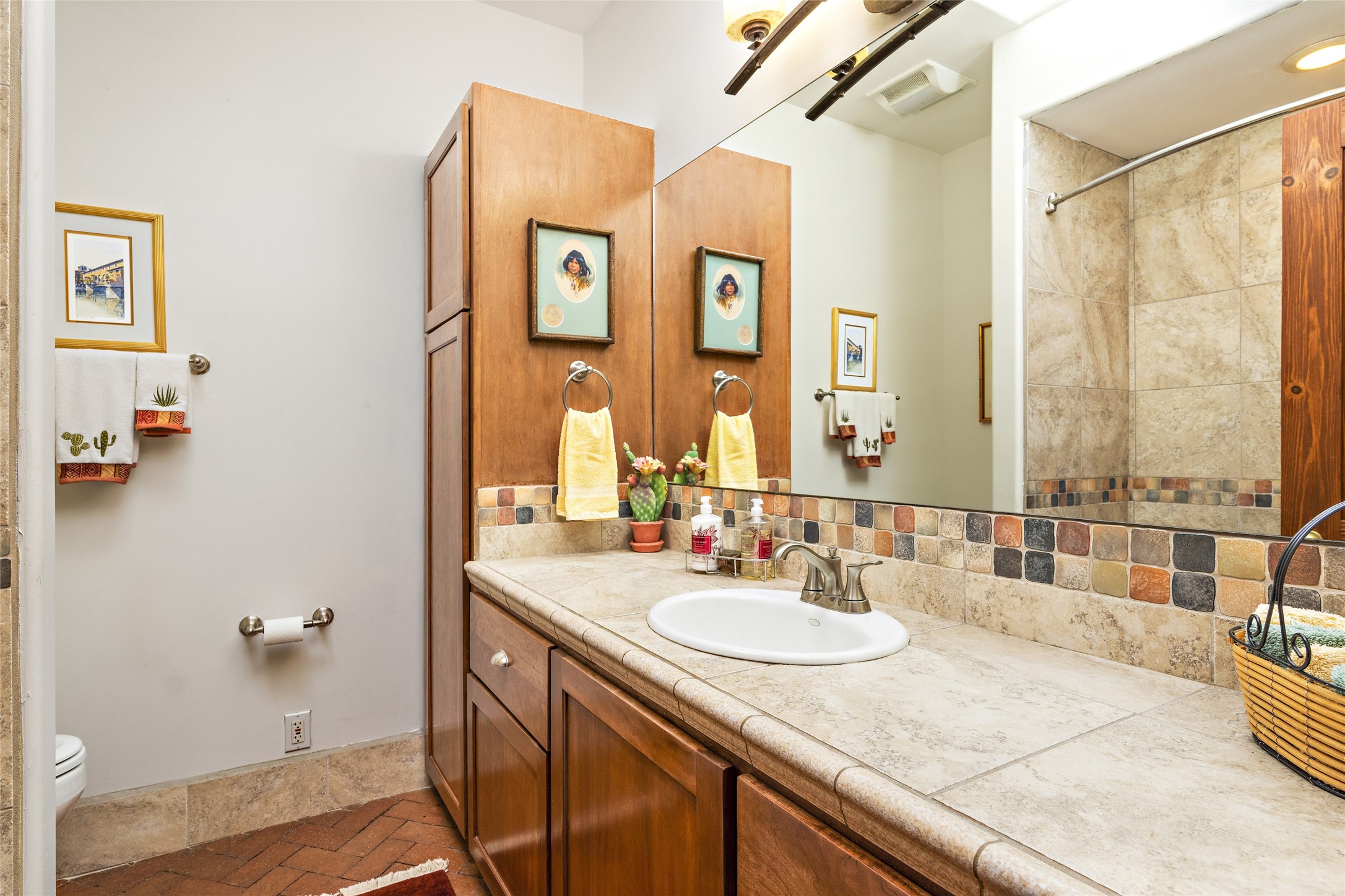CASA CONTENTA. Named by the owners, this gorgeous La Paz at Eldorado property is sited on nearly 3 acres with a fully updated kitchen in 2021. Double ovens, island with storage and built-in recycle center and spice rack. Spacious shelved pantry. Matte porcelain counters and backsplash. Custom cabinets go all the way to the ceiling. Lots of generous drawers - all soft close. Dramatic and formal entry with diamond plaster in public areas and brick floors throughout. Three mini-splits provide cooling for primary bedroom, open kitchen, living and dining areas and fully outfitted gym. **All gym equipment conveys with the property. The primary bedroom is quite spacious with 12' ceilings, luxurious whirlpool tub, double sinks, a steam shower, towel warmer and walk-in closet. A den/office with pocket doors is a perfect second living area or could be a 4th bedroom. There is a tremendous amount of well-thought out storage in this home. Walled front and back courtyards with mature and happy Aspen trees. NO STEPS, NO KITEC, NO CARPET. There is a fully outfitted gym behind the garage which could be studio or workshop space. All this on a paved road too! Do some real stargazing from the hot tub. LG washer and dryer stay with the property. New Lochinar boiler in 2021. Newish stucco. Security system. Finished 2-car garage with epoxy floor. A small finished third-bay garage can be flex space.