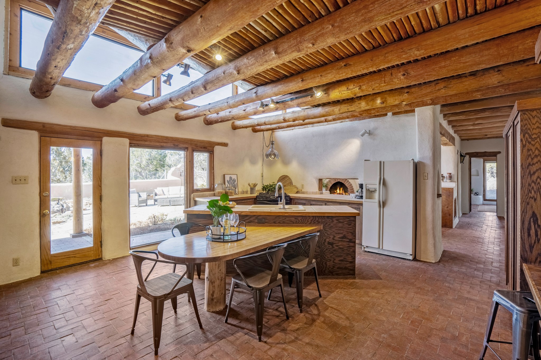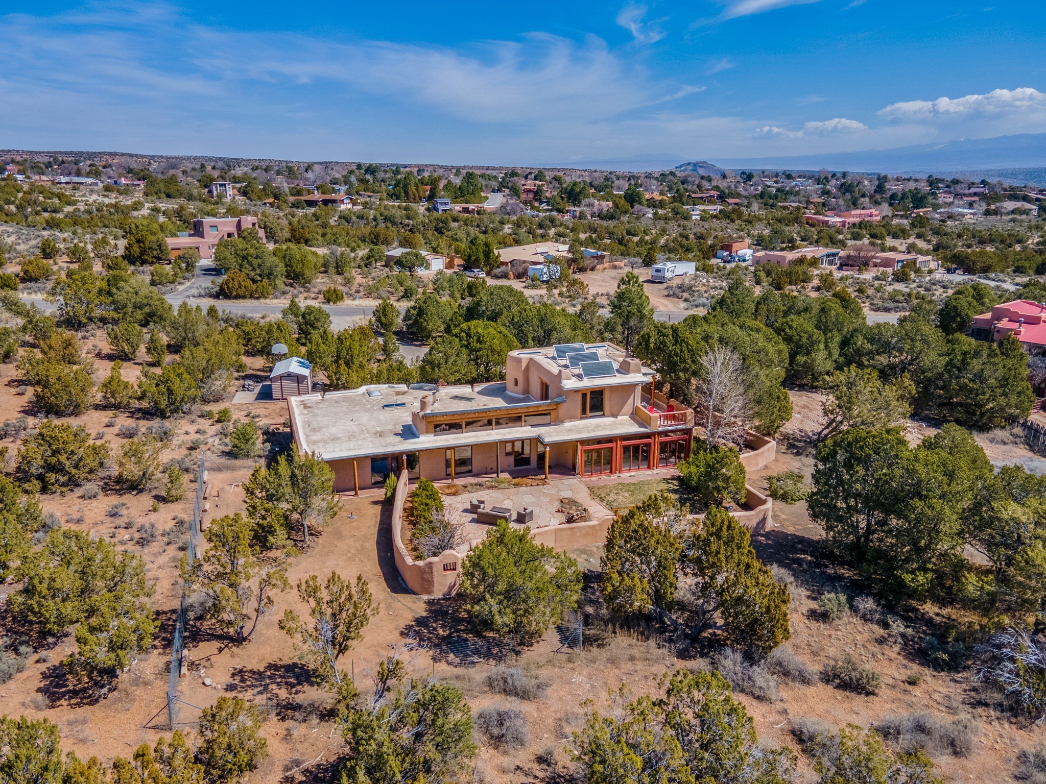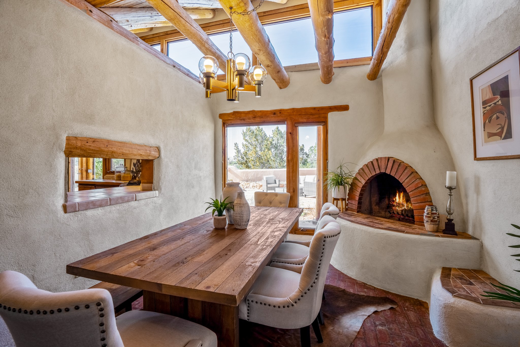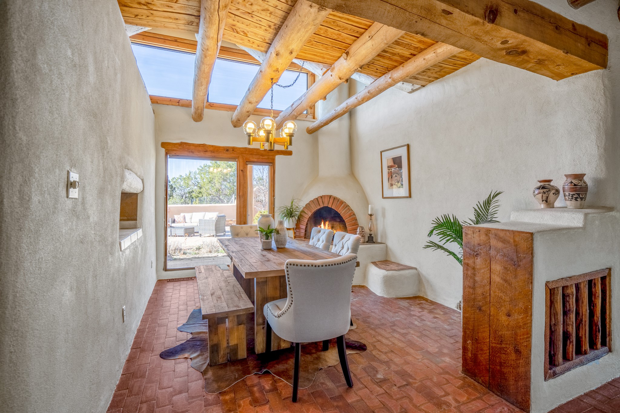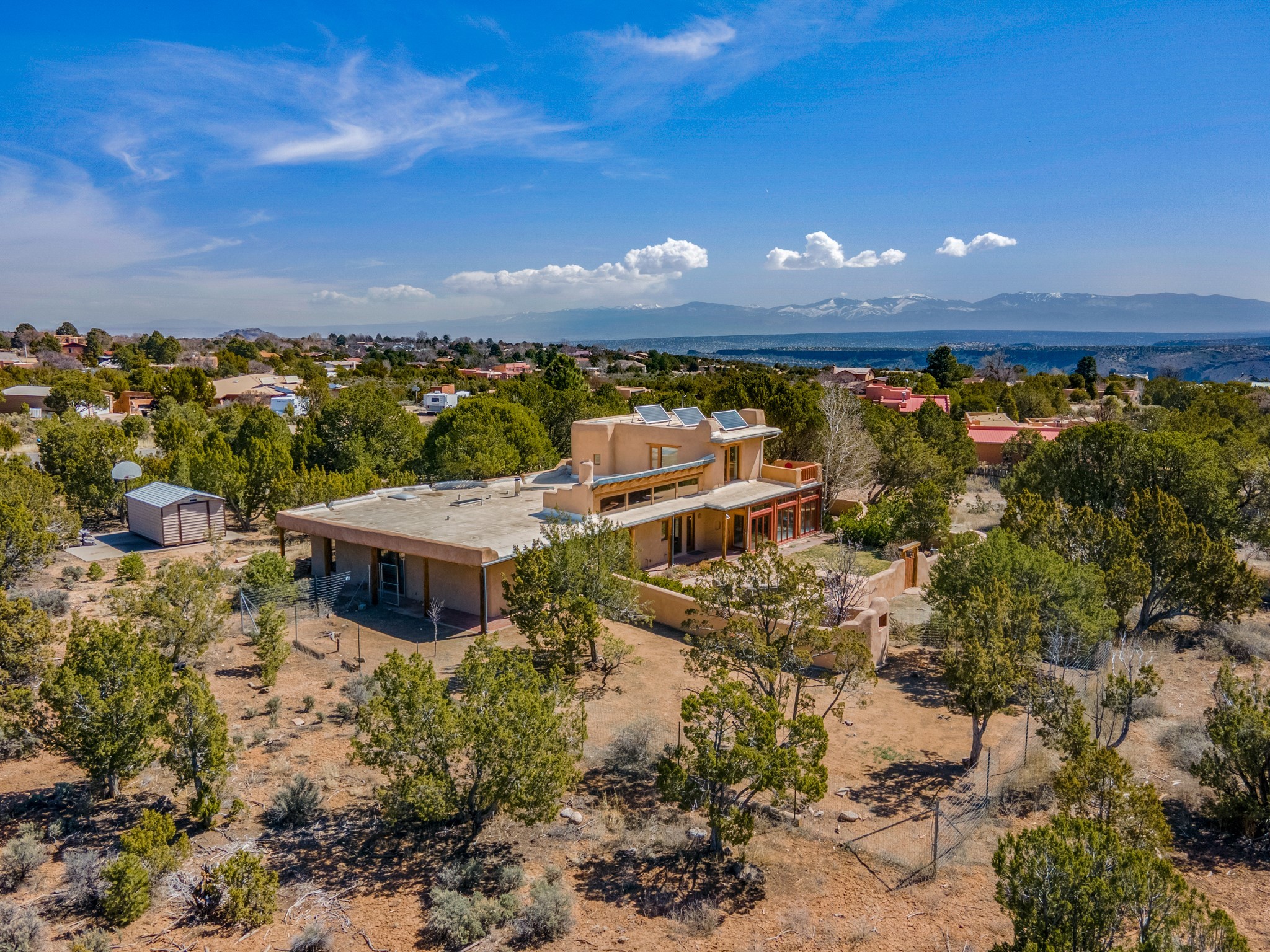 True Adobe, Vigas & Exposed Beams, Kiva Fireplaces, 2.06 Acres, 4 Bedrooms, Large Sunroom, 2 Car Garage, Passive Solar Heating, Abundant Natural Light, Large Storage Shed and More! This stunning, custom 4-bedroom full adobe home sits on 2.06 acres and offers classic, high-end Santa Fe style right here in Los Alamos County. A custom front door and foyer greet you upon entering the home, and you will immediately notice the red brick floors and viga ceilings. Each room features a different custom viga ceiling for added charm. The kitchen features an island with a built-in eating area, gas cooking, lofted ceiling with large clerestories, and walk-out access to the patio for indoor/outdoor entertaining. The grand dining room features floor-to-ceiling windows, a pass-through window to the kitchen, and a kiva fireplace to create a warm, intimate setting for your fine dining experience. The living room features hardwood floors and a large kiva fireplace. A large sunroom with south-facing, floor-to-ceiling windows wraps around the living room and provides you with the opportunity to grow bountiful plants and potted trees throughout the year, or simply to enjoy a good book while soaking up the sunshine. A large, private study and second living space are found on the east side of the first floor, and the room accentuates the beauty of the adobe home with its flowing lines. Two large bedrooms, each featuring a walk-in closet, along with an updated bathroom round out the first floor. The primary suite is located on the second floor, accessed by a spiral cedar staircase. The suite consists of the bedroom, walk-in closet, and bathroom. The room opens onto the deck, which offers great views of the surrounding area. A fourth bedroom, which could be used as an additional home office, completes the second floor. Outside, you will enjoy sunrises, sunsets, and dark, starlit nights from your private yard featuring a flagstone patio. An adjacent, fully-fenced dog yard completes the package. The sellers plan to review offers on Wednesday, April 19, so schedule your showing today!