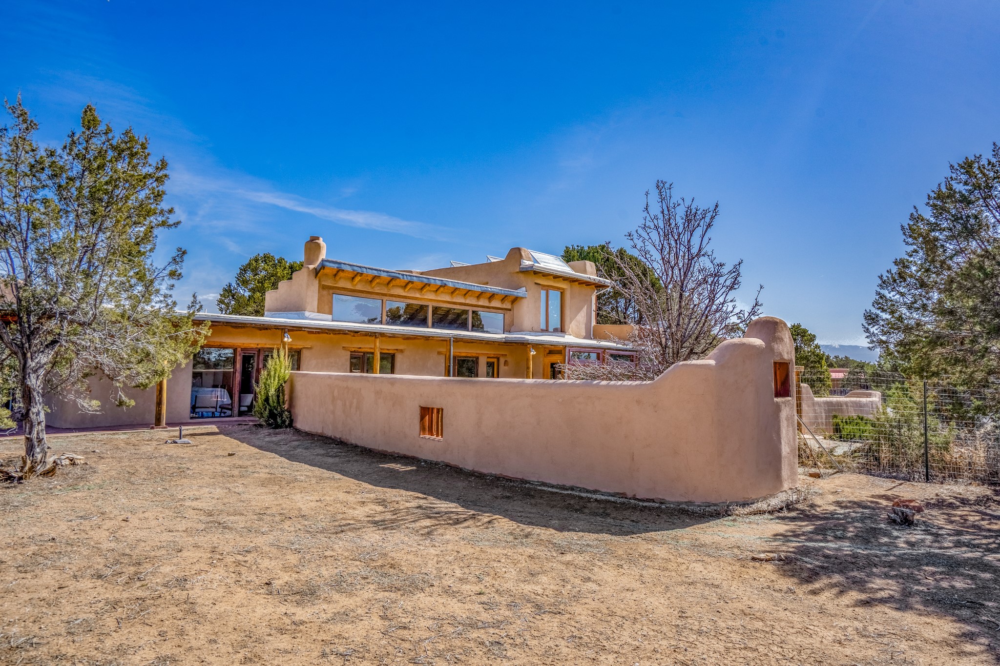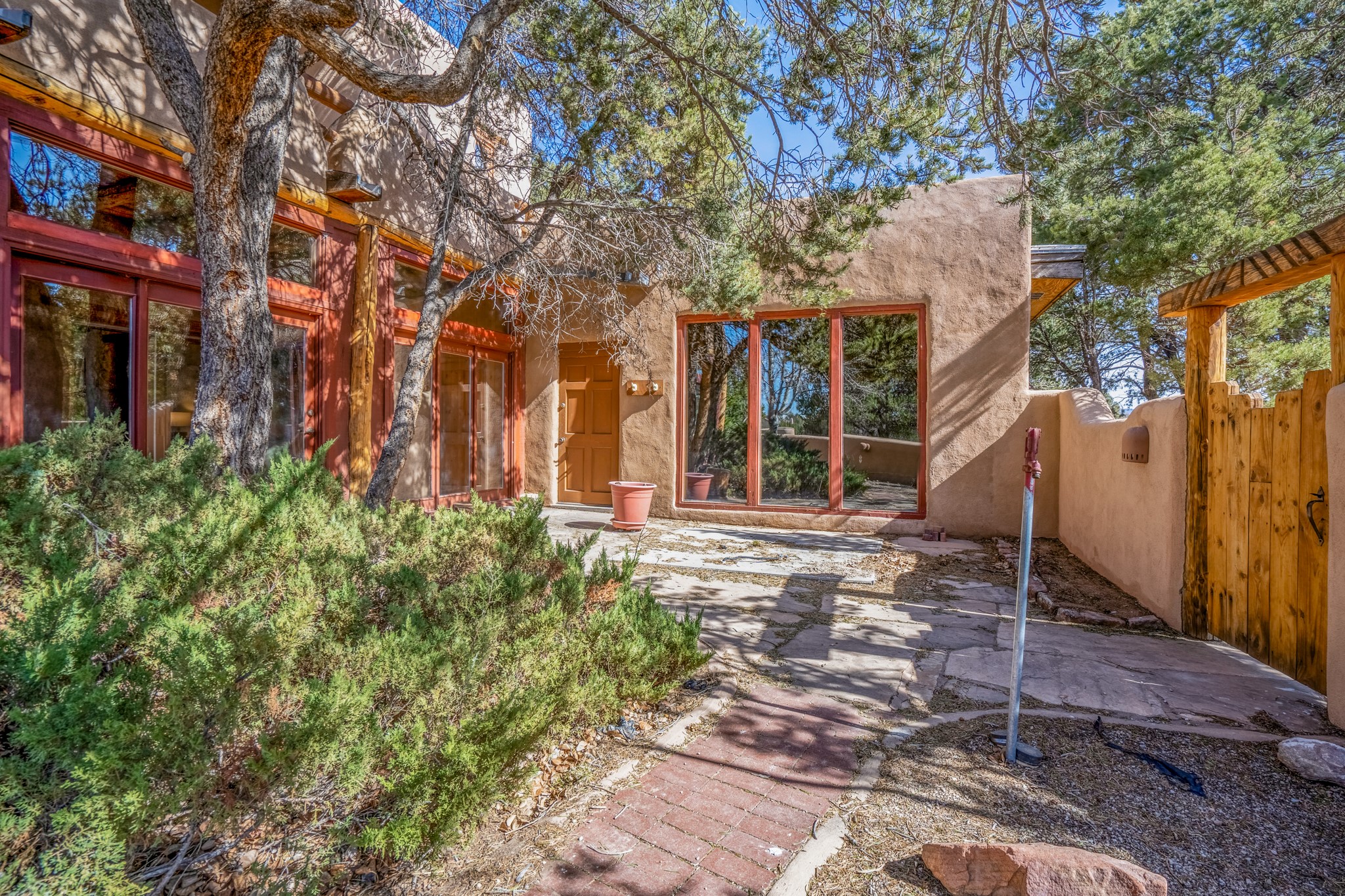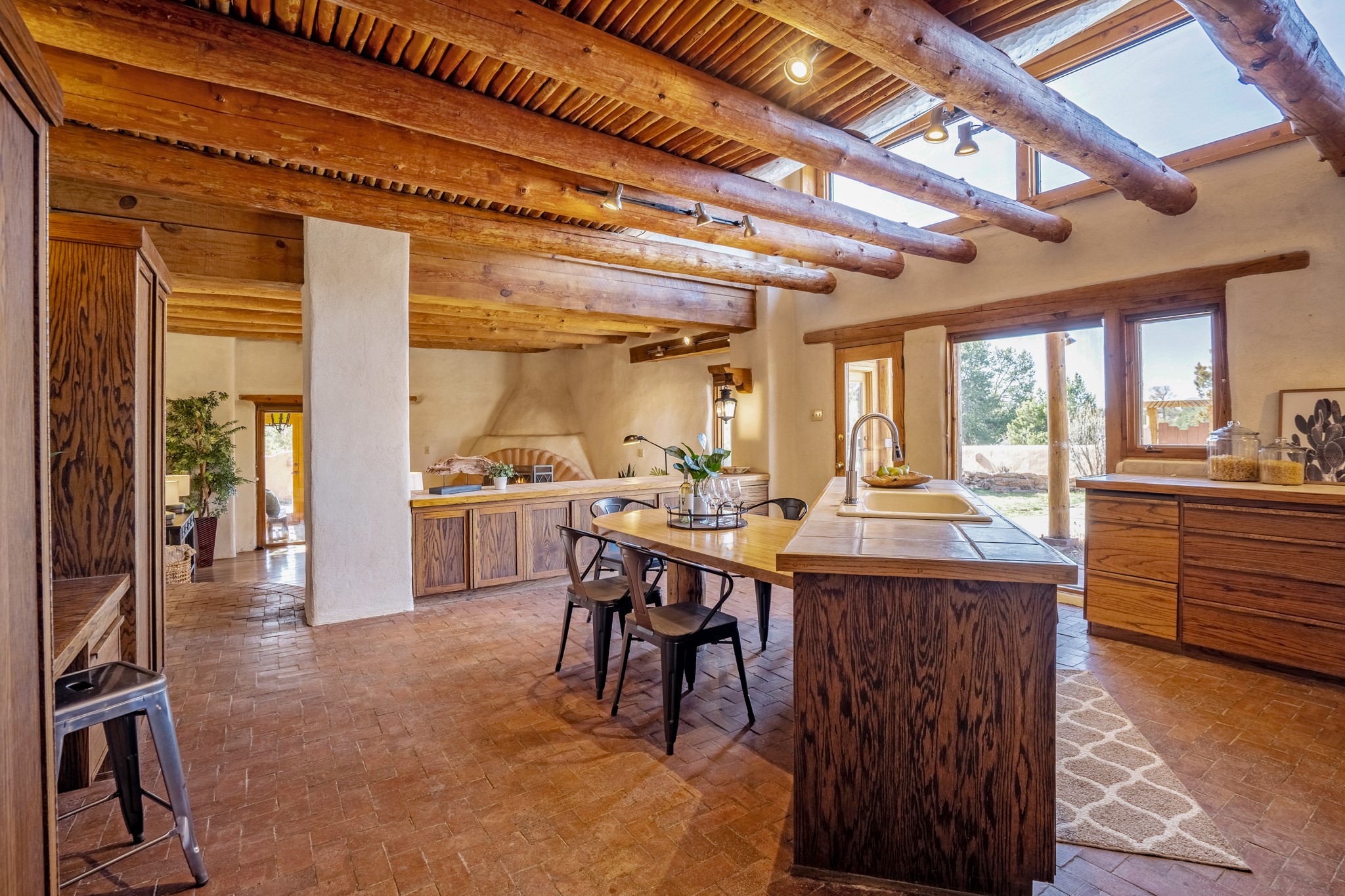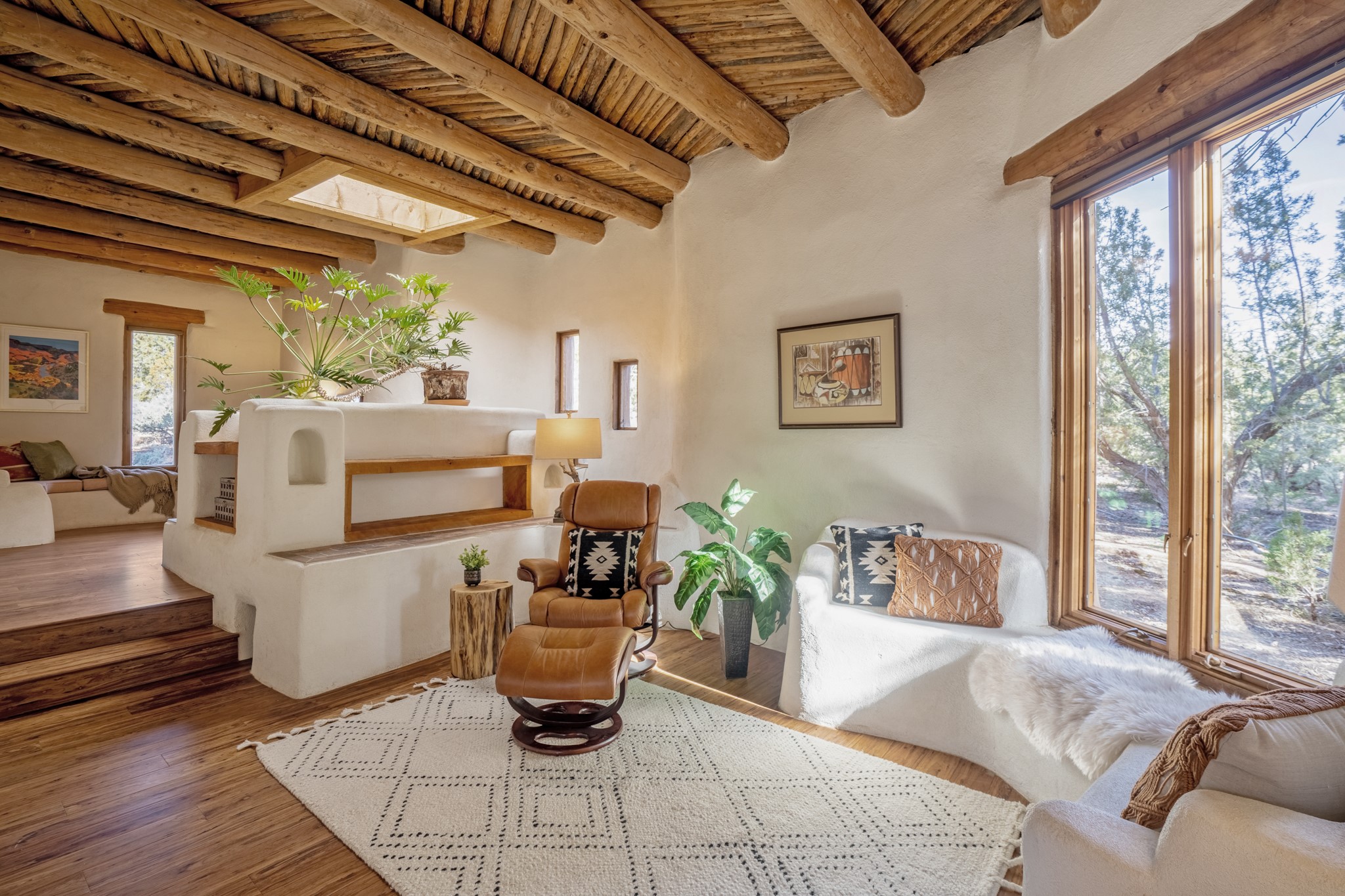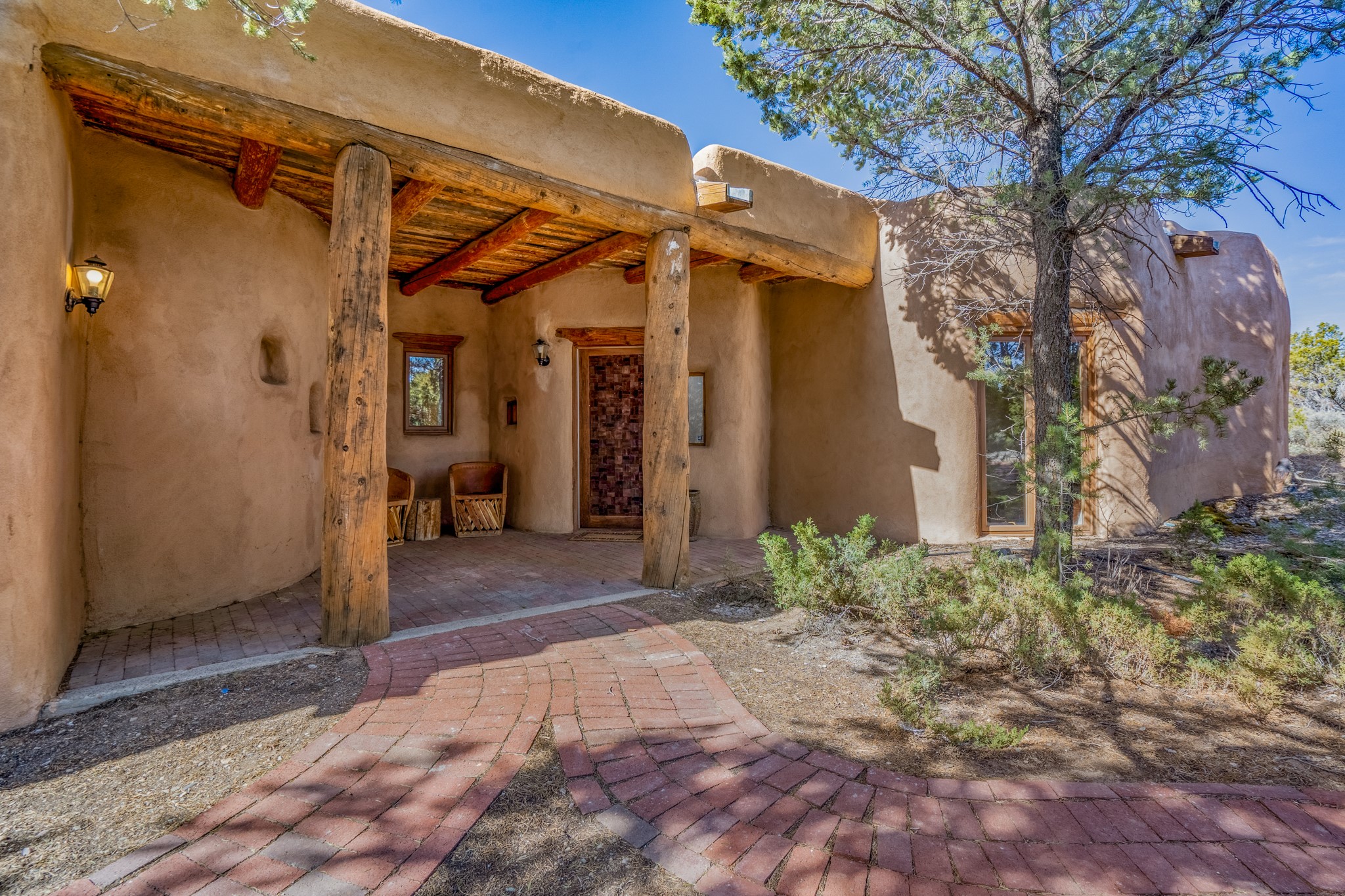 True Adobe, Vigas & Exposed Beams, Kiva Fireplaces, 2.06 Acres, 4 Bedrooms, Large Sunroom, 2 Car Garage, Passive Solar Heating, Abundant Natural Light, Large Storage Shed and More! This stunning, custom 4-bedroom full adobe home sits on 2.06 acres and offers classic, high-end Santa Fe style right here in Los Alamos County. A custom front door and foyer greet you upon entering the home, and you will immediately notice the red brick floors and viga ceilings. Each room features a different custom viga ceiling for added charm. The kitchen features an island with a built-in eating area, gas cooking, lofted ceiling with large clerestories, and walk-out access to the patio for indoor/outdoor entertaining. The grand dining room features floor-to-ceiling windows, a pass-through window to the kitchen, and a kiva fireplace to create a warm, intimate setting for your fine dining experience. The living room features hardwood floors and a large kiva fireplace. A large sunroom with south-facing, floor-to-ceiling windows wraps around the living room and provides you with the opportunity to grow bountiful plants and potted trees throughout the year, or simply to enjoy a good book while soaking up the sunshine. A large, private study and second living space are found on the east side of the first floor, and the room accentuates the beauty of the adobe home with its flowing lines. Two large bedrooms, each featuring a walk-in closet, along with an updated bathroom round out the first floor. The primary suite is located on the second floor, accessed by a spiral cedar staircase. The suite consists of the bedroom, walk-in closet, and bathroom. The room opens onto the deck, which offers great views of the surrounding area. A fourth bedroom, which could be used as an additional home office, completes the second floor. Outside, you will enjoy sunrises, sunsets, and dark, starlit nights from your private yard featuring a flagstone patio. An adjacent, fully-fenced dog yard completes the package. The sellers plan to review offers on Wednesday, April 19, so schedule your showing today!