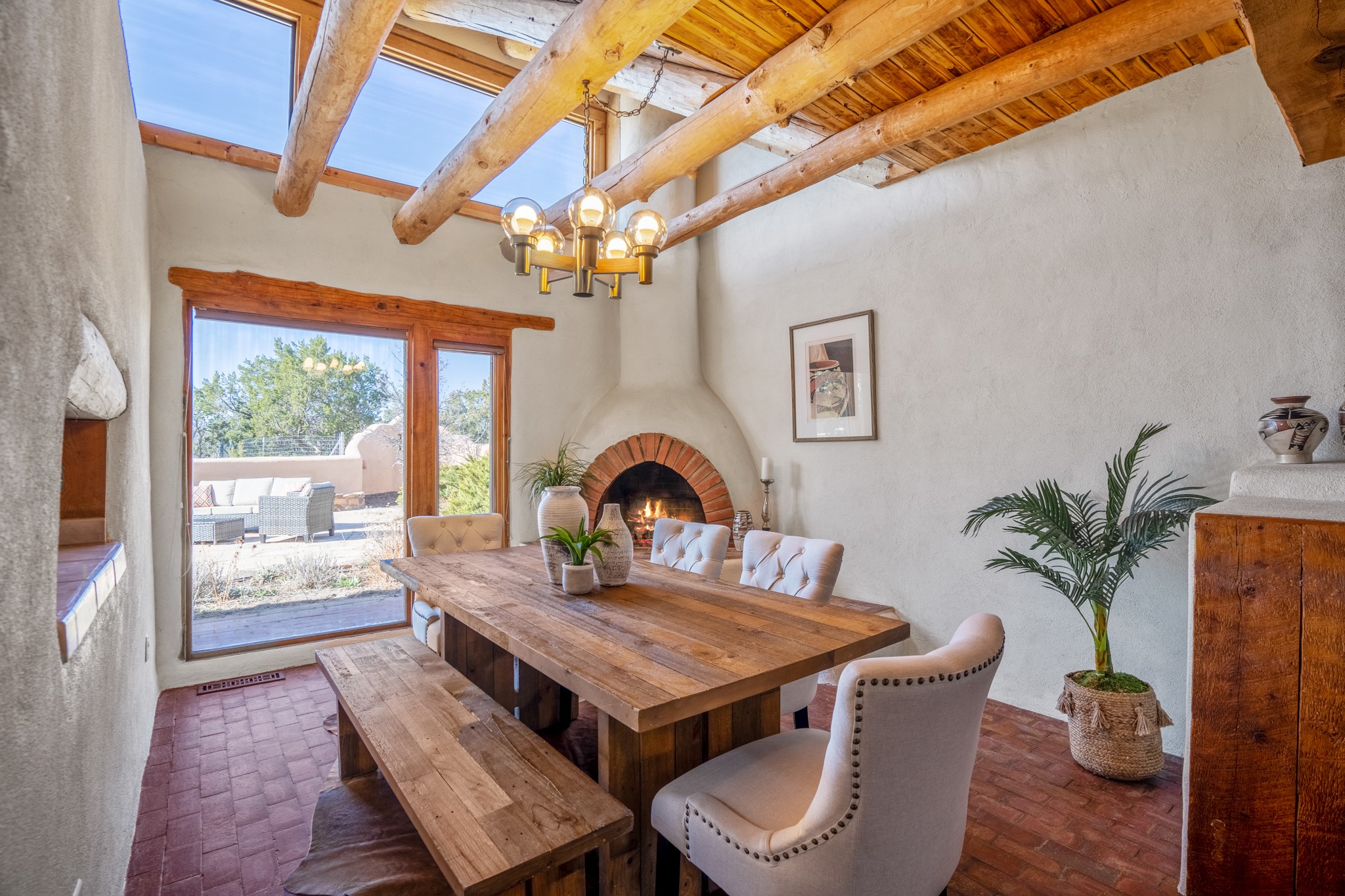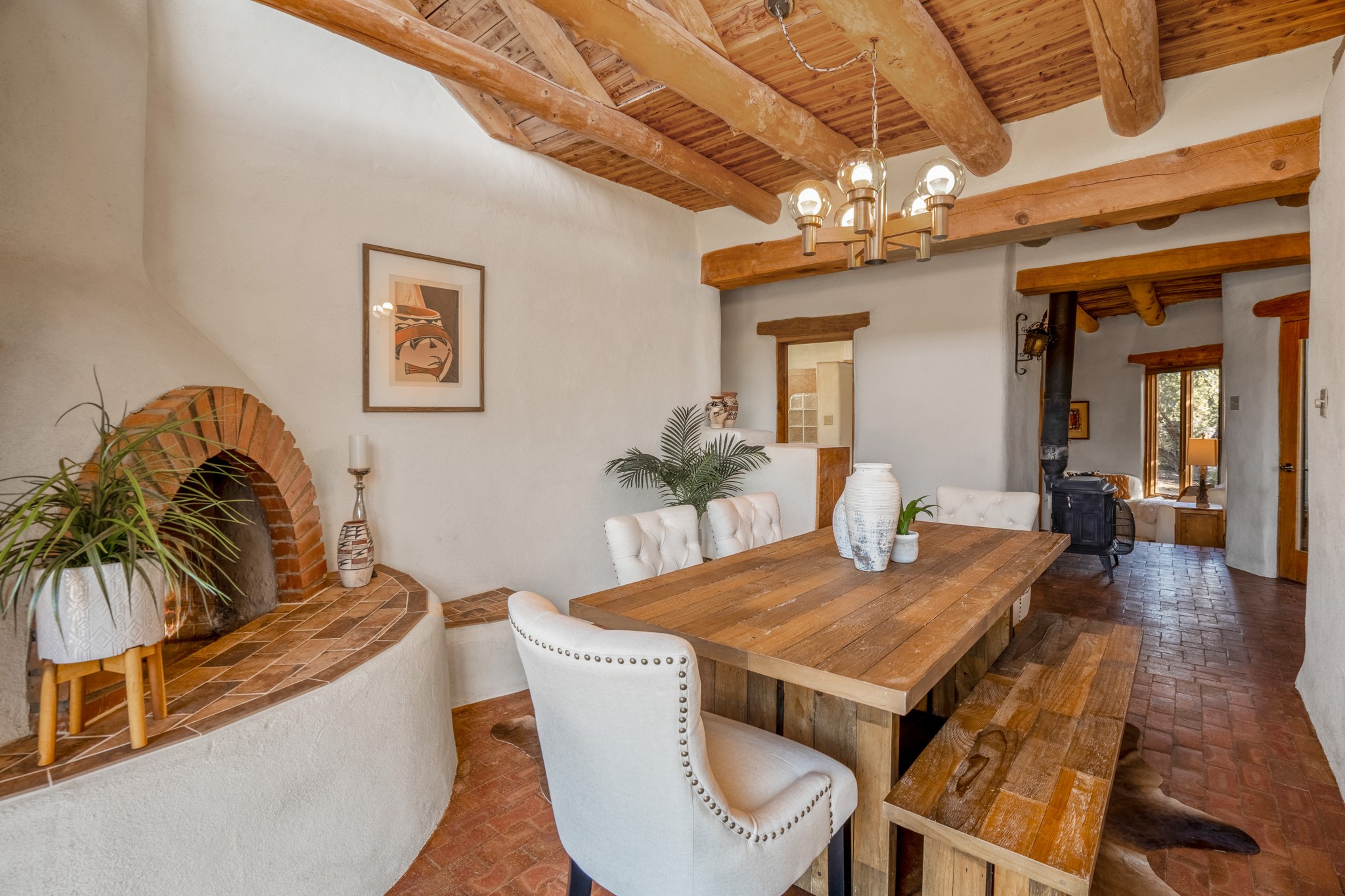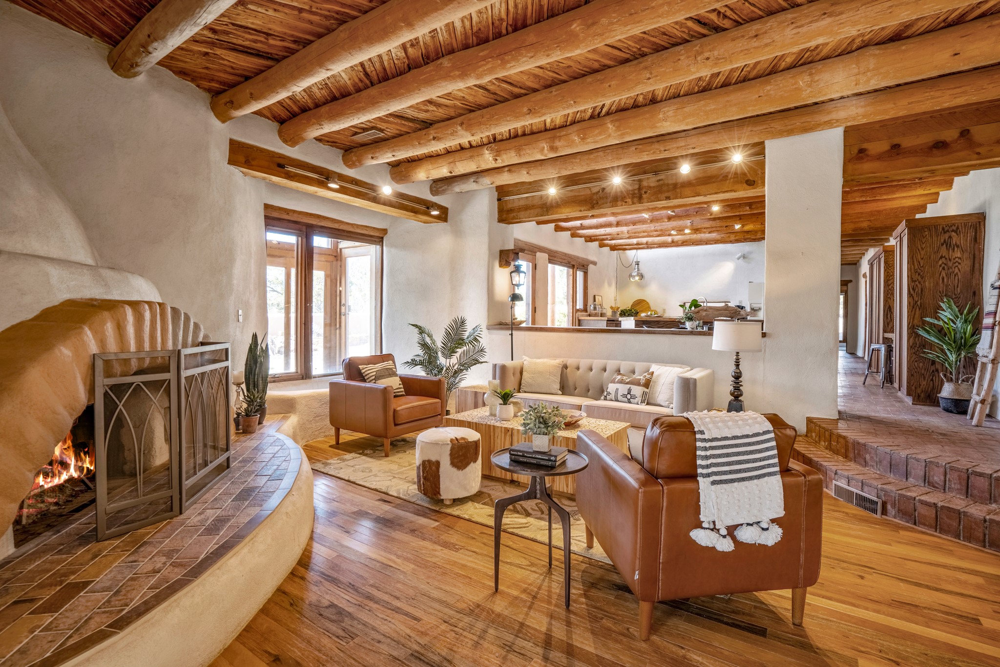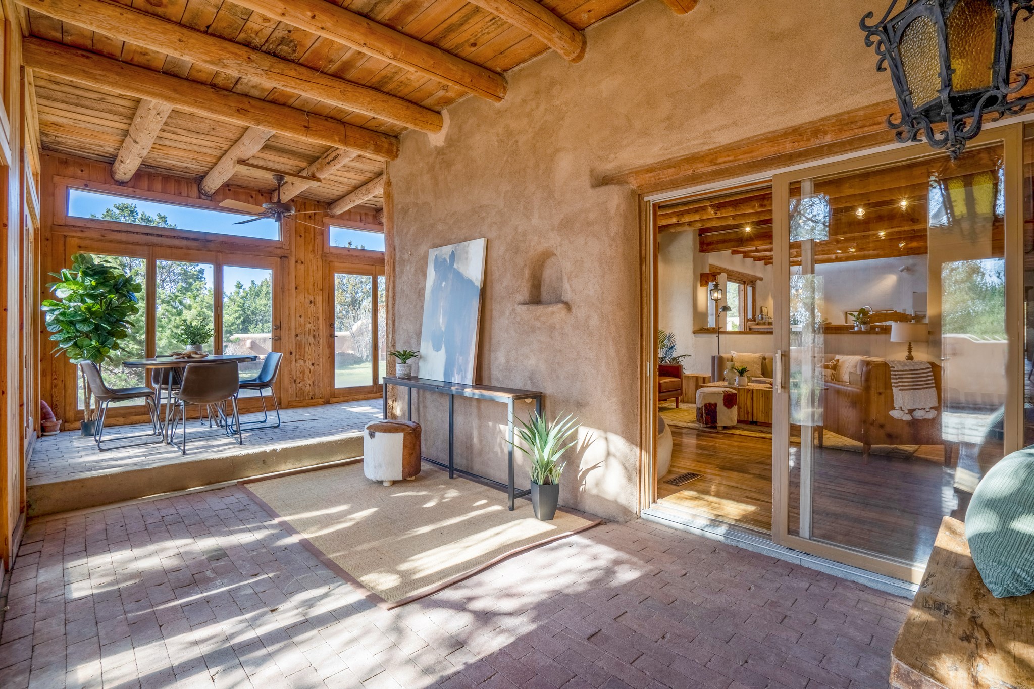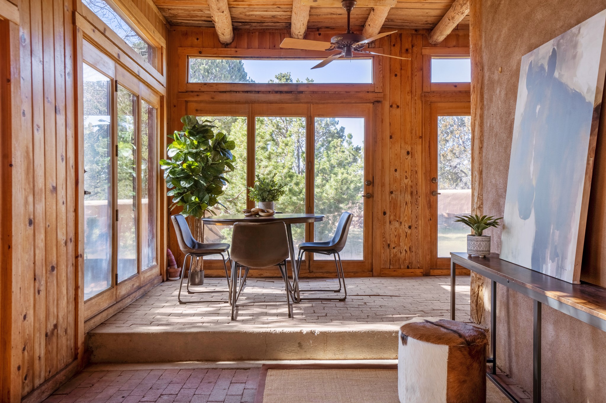 True Adobe, Vigas & Exposed Beams, Kiva Fireplaces, 2.06 Acres, 4 Bedrooms, Large Sunroom, 2 Car Garage, Passive Solar Heating, Abundant Natural Light, Large Storage Shed and More! This stunning, custom 4-bedroom full adobe home sits on 2.06 acres and offers classic, high-end Santa Fe style right here in Los Alamos County. A custom front door and foyer greet you upon entering the home, and you will immediately notice the red brick floors and viga ceilings. Each room features a different custom viga ceiling for added charm. The kitchen features an island with a built-in eating area, gas cooking, lofted ceiling with large clerestories, and walk-out access to the patio for indoor/outdoor entertaining. The grand dining room features floor-to-ceiling windows, a pass-through window to the kitchen, and a kiva fireplace to create a warm, intimate setting for your fine dining experience. The living room features hardwood floors and a large kiva fireplace. A large sunroom with south-facing, floor-to-ceiling windows wraps around the living room and provides you with the opportunity to grow bountiful plants and potted trees throughout the year, or simply to enjoy a good book while soaking up the sunshine. A large, private study and second living space are found on the east side of the first floor, and the room accentuates the beauty of the adobe home with its flowing lines. Two large bedrooms, each featuring a walk-in closet, along with an updated bathroom round out the first floor. The primary suite is located on the second floor, accessed by a spiral cedar staircase. The suite consists of the bedroom, walk-in closet, and bathroom. The room opens onto the deck, which offers great views of the surrounding area. A fourth bedroom, which could be used as an additional home office, completes the second floor. Outside, you will enjoy sunrises, sunsets, and dark, starlit nights from your private yard featuring a flagstone patio. An adjacent, fully-fenced dog yard completes the package. The sellers plan to review offers on Wednesday, April 19, so schedule your showing today!