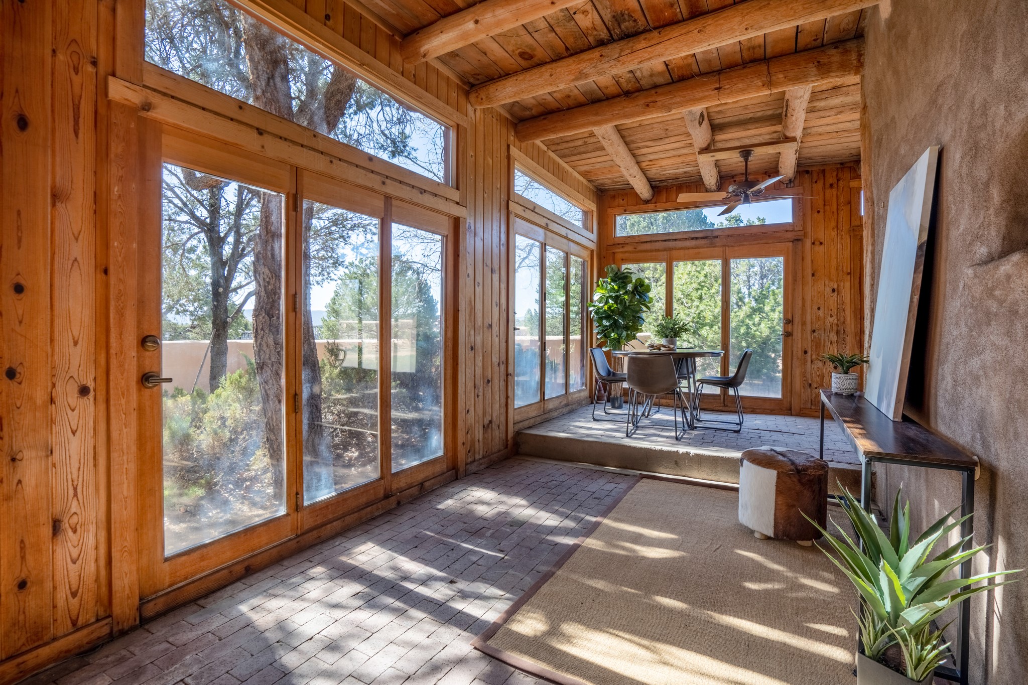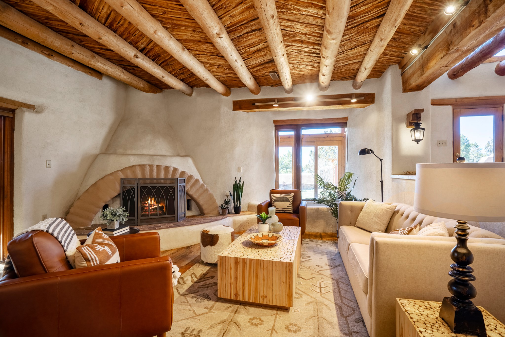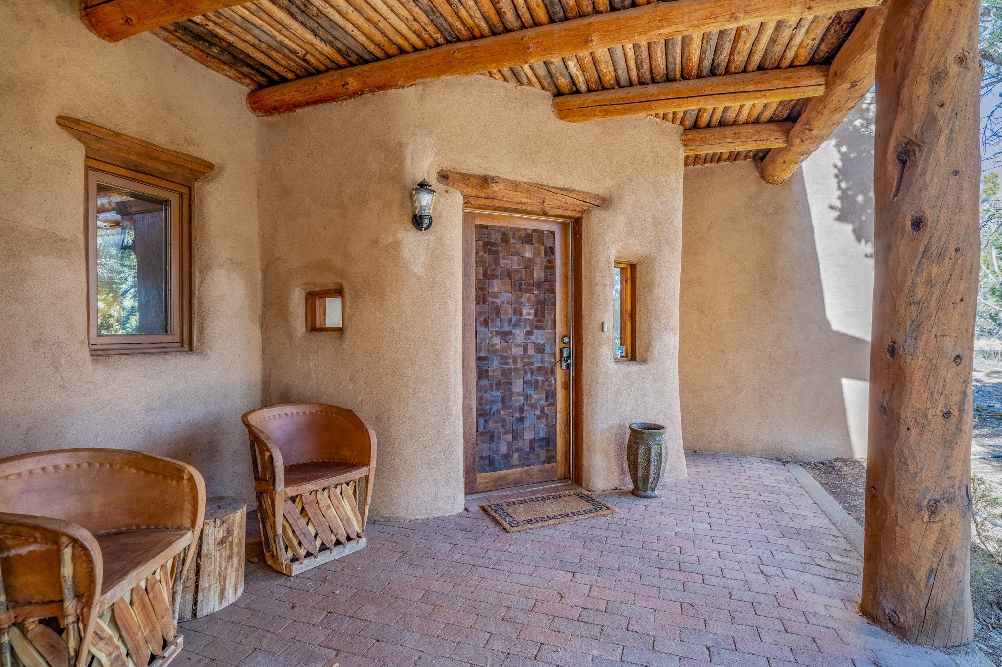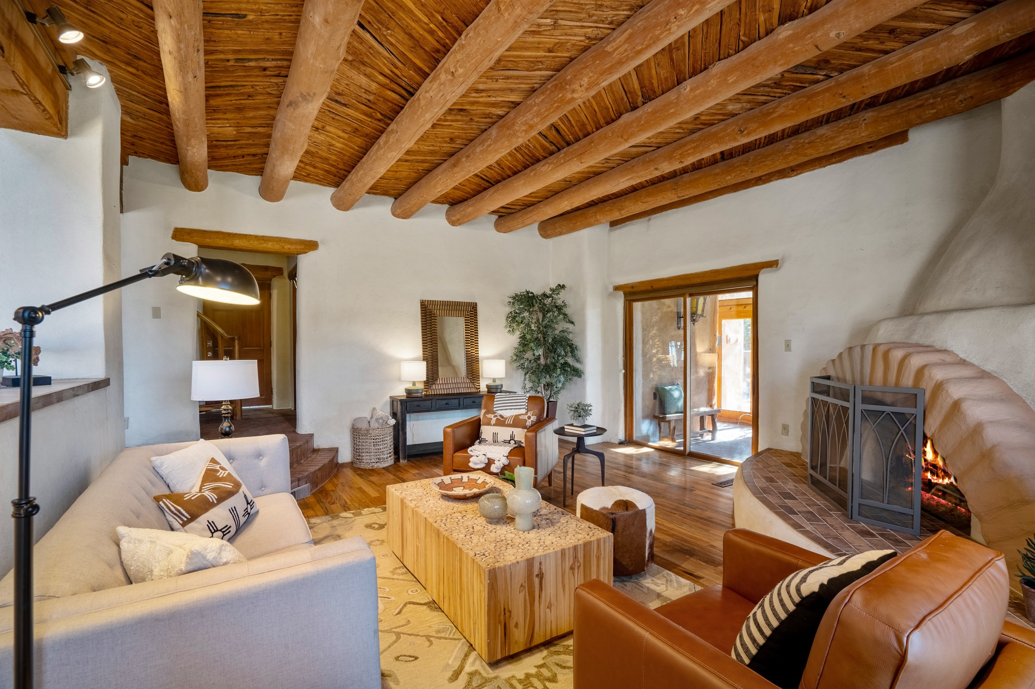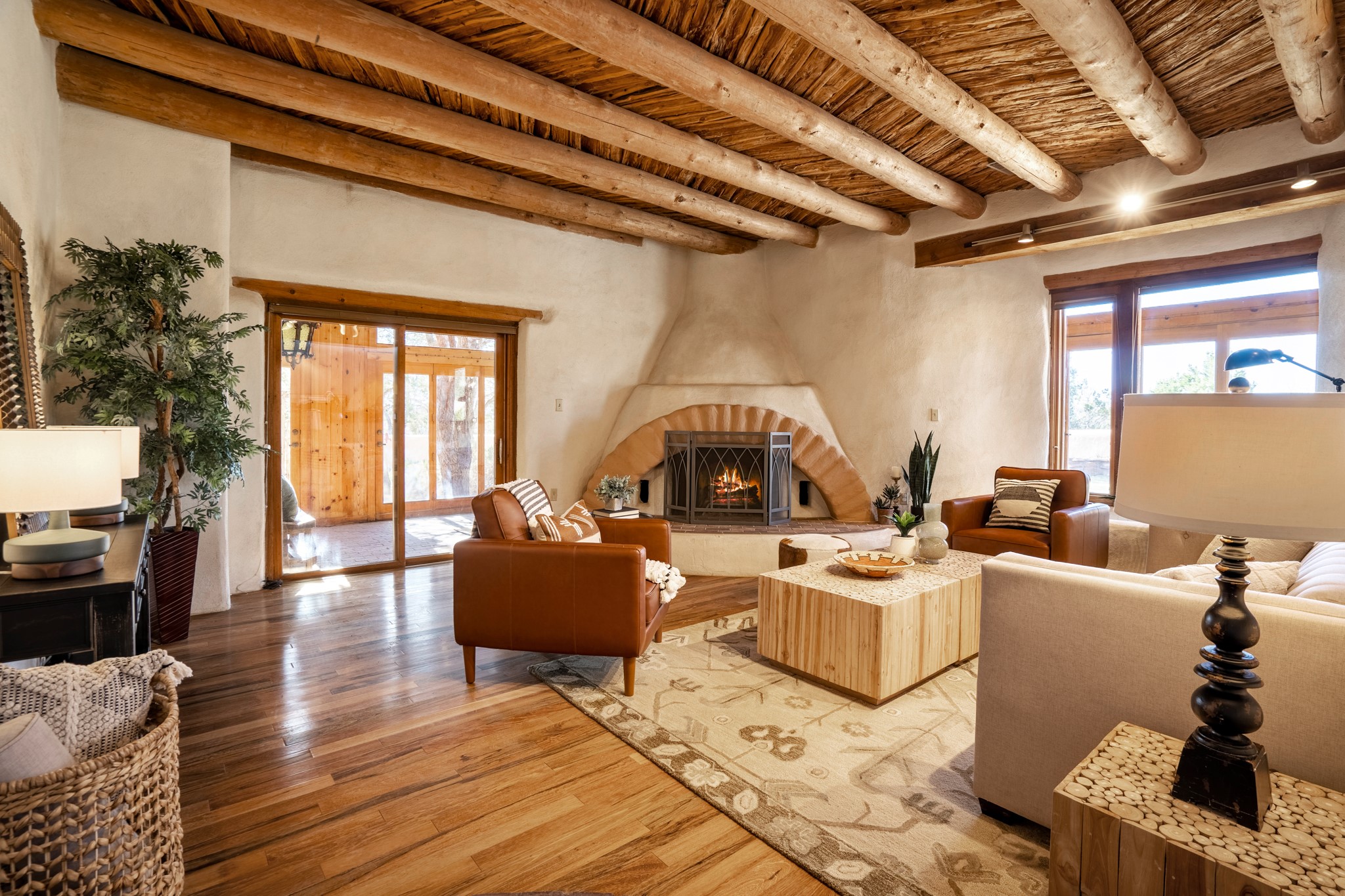 True Adobe, Vigas & Exposed Beams, Kiva Fireplaces, 2.06 Acres, 4 Bedrooms, Large Sunroom, 2 Car Garage, Passive Solar Heating, Abundant Natural Light, Large Storage Shed and More! This stunning, custom 4-bedroom full adobe home sits on 2.06 acres and offers classic, high-end Santa Fe style right here in Los Alamos County. A custom front door and foyer greet you upon entering the home, and you will immediately notice the red brick floors and viga ceilings. Each room features a different custom viga ceiling for added charm. The kitchen features an island with a built-in eating area, gas cooking, lofted ceiling with large clerestories, and walk-out access to the patio for indoor/outdoor entertaining. The grand dining room features floor-to-ceiling windows, a pass-through window to the kitchen, and a kiva fireplace to create a warm, intimate setting for your fine dining experience. The living room features hardwood floors and a large kiva fireplace. A large sunroom with south-facing, floor-to-ceiling windows wraps around the living room and provides you with the opportunity to grow bountiful plants and potted trees throughout the year, or simply to enjoy a good book while soaking up the sunshine. A large, private study and second living space are found on the east side of the first floor, and the room accentuates the beauty of the adobe home with its flowing lines. Two large bedrooms, each featuring a walk-in closet, along with an updated bathroom round out the first floor. The primary suite is located on the second floor, accessed by a spiral cedar staircase. The suite consists of the bedroom, walk-in closet, and bathroom. The room opens onto the deck, which offers great views of the surrounding area. A fourth bedroom, which could be used as an additional home office, completes the second floor. Outside, you will enjoy sunrises, sunsets, and dark, starlit nights from your private yard featuring a flagstone patio. An adjacent, fully-fenced dog yard completes the package. The sellers plan to review offers on Wednesday, April 19, so schedule your showing today!