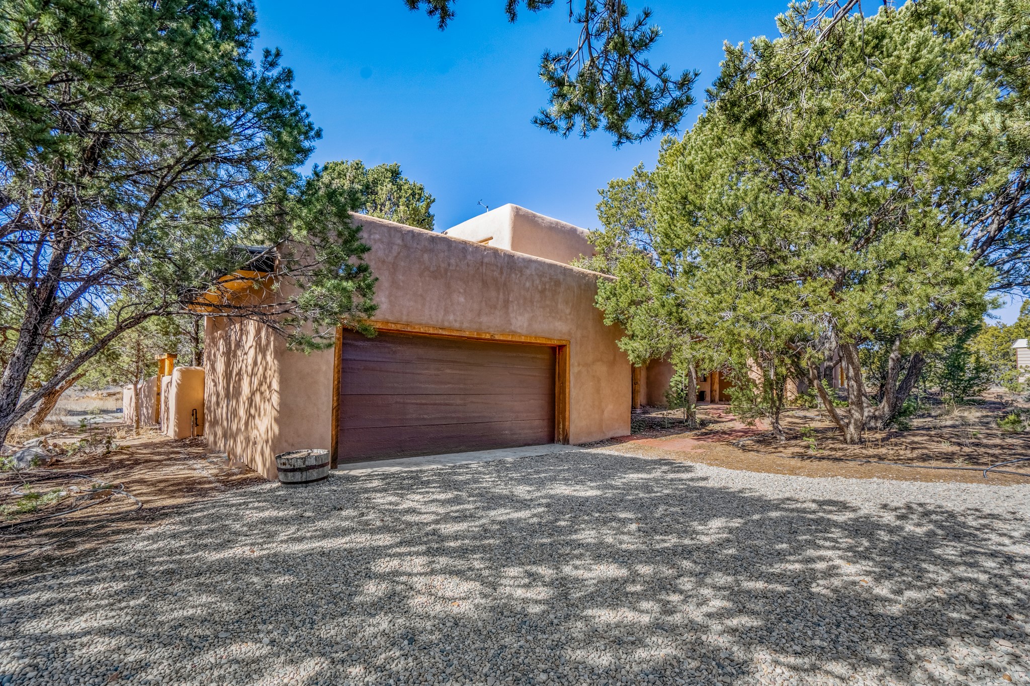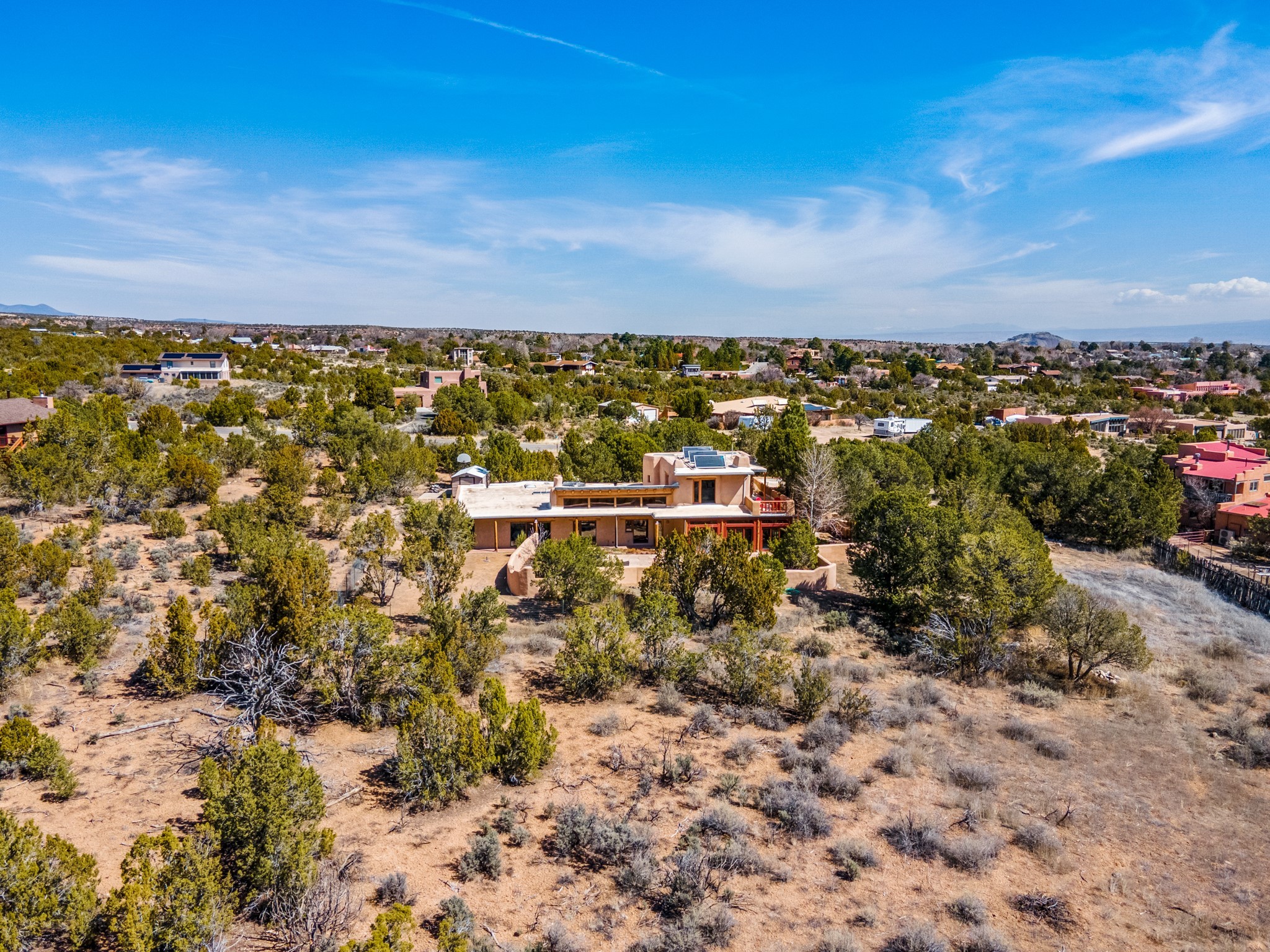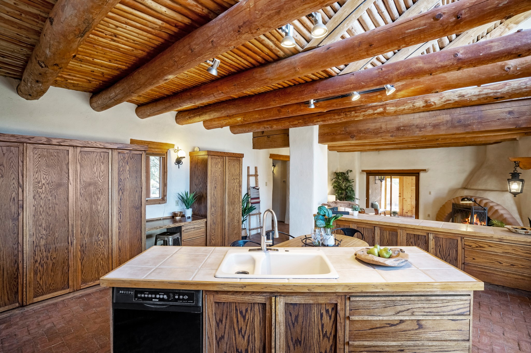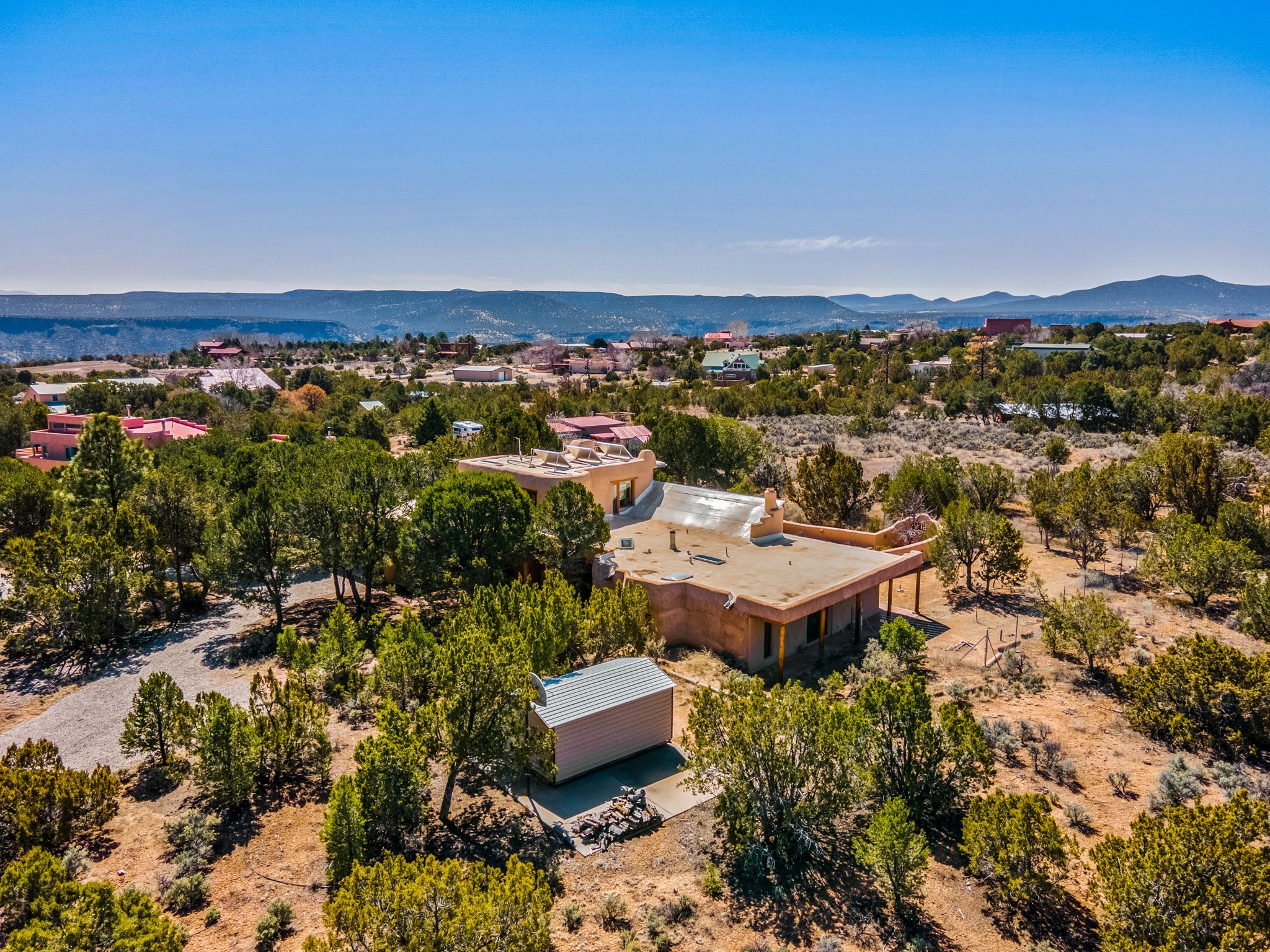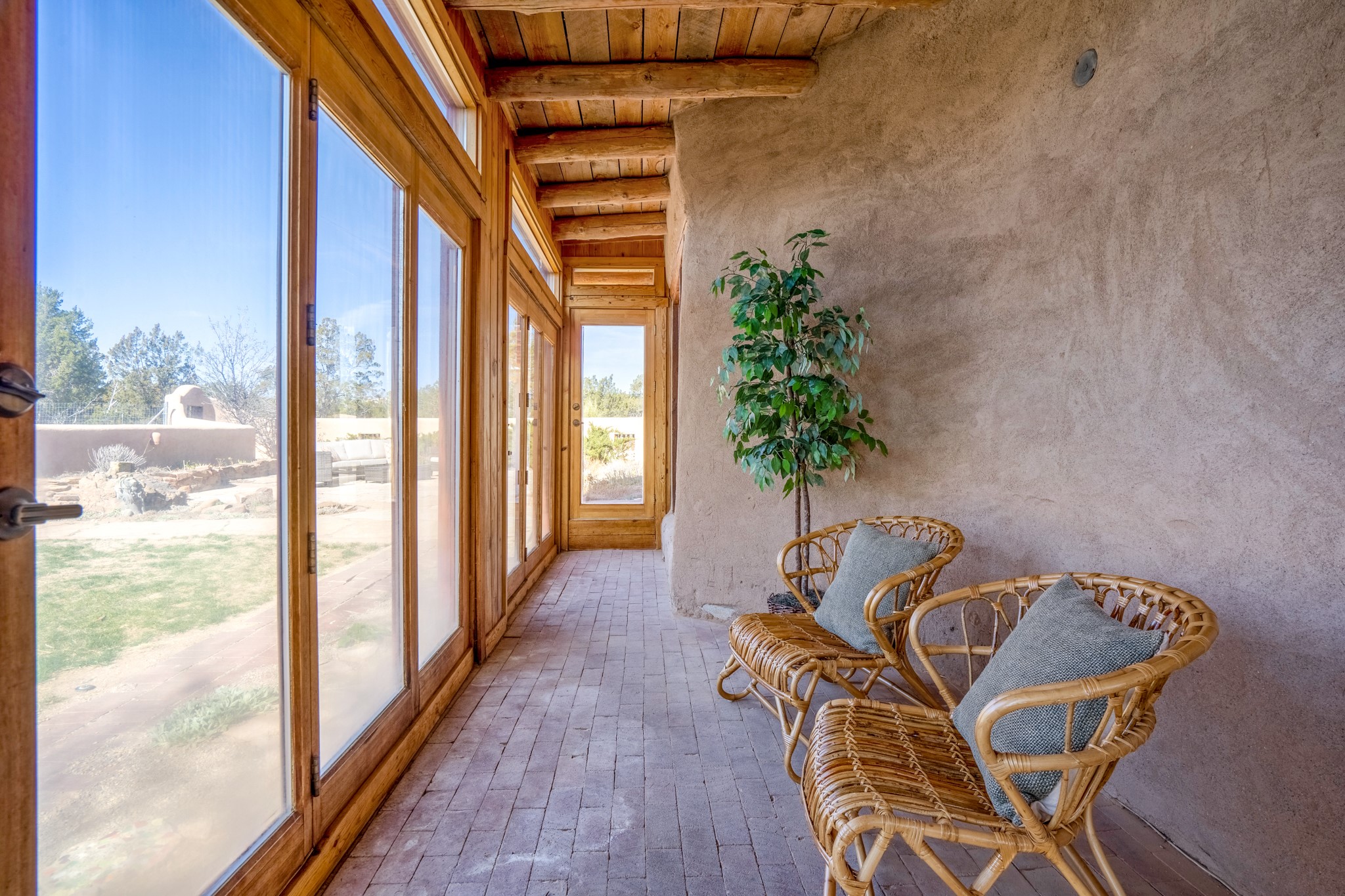True Adobe, Vigas & Exposed Beams, Kiva Fireplaces, 2.06 Acres, 4 Bedrooms, Large Sunroom, 2 Car Garage, Passive Solar Heating, Abundant Natural Light, Large Storage Shed and More! This stunning, custom 4-bedroom full adobe home sits on 2.06 acres and offers classic, high-end Santa Fe style right here in Los Alamos County. A custom front door and foyer greet you upon entering the home, and you will immediately notice the red brick floors and viga ceilings. Each room features a different custom viga ceiling for added charm. The kitchen features an island with a built-in eating area, gas cooking, lofted ceiling with large clerestories, and walk-out access to the patio for indoor/outdoor entertaining. The grand dining room features floor-to-ceiling windows, a pass-through window to the kitchen, and a kiva fireplace to create a warm, intimate setting for your fine dining experience. The living room features hardwood floors and a large kiva fireplace. A large sunroom with south-facing, floor-to-ceiling windows wraps around the living room and provides you with the opportunity to grow bountiful plants and potted trees throughout the year, or simply to enjoy a good book while soaking up the sunshine. A large, private study and second living space are found on the east side of the first floor, and the room accentuates the beauty of the adobe home with its flowing lines. Two large bedrooms, each featuring a walk-in closet, along with an updated bathroom round out the first floor. The primary suite is located on the second floor, accessed by a spiral cedar staircase. The suite consists of the bedroom, walk-in closet, and bathroom. The room opens onto the deck, which offers great views of the surrounding area. A fourth bedroom, which could be used as an additional home office, completes the second floor. Outside, you will enjoy sunrises, sunsets, and dark, starlit nights from your private yard featuring a flagstone patio. An adjacent, fully-fenced dog yard completes the package. The sellers plan to review offers on Wednesday, April 19, so schedule your showing today!