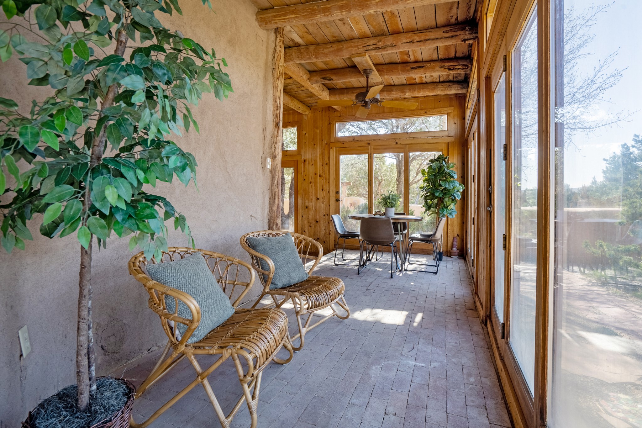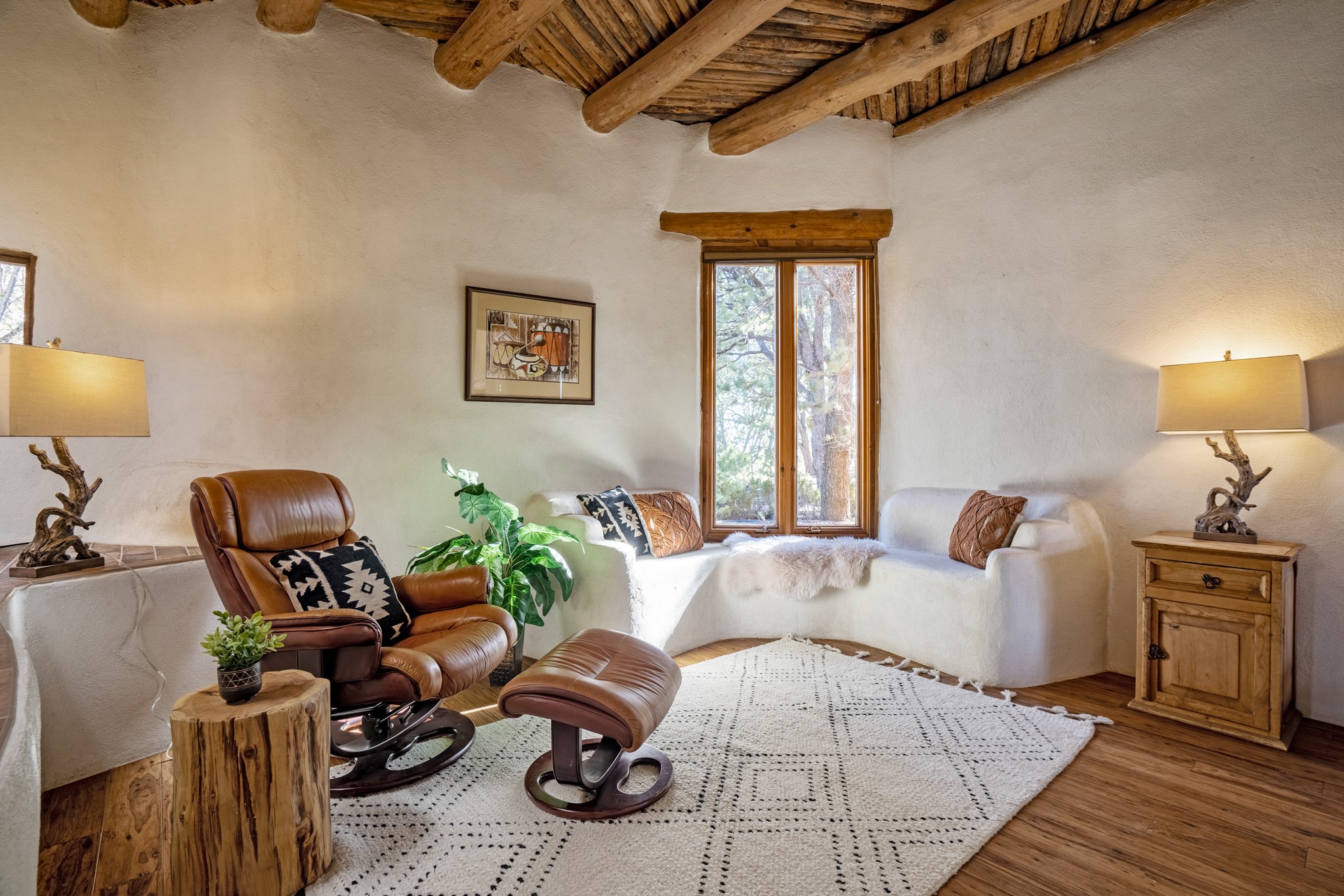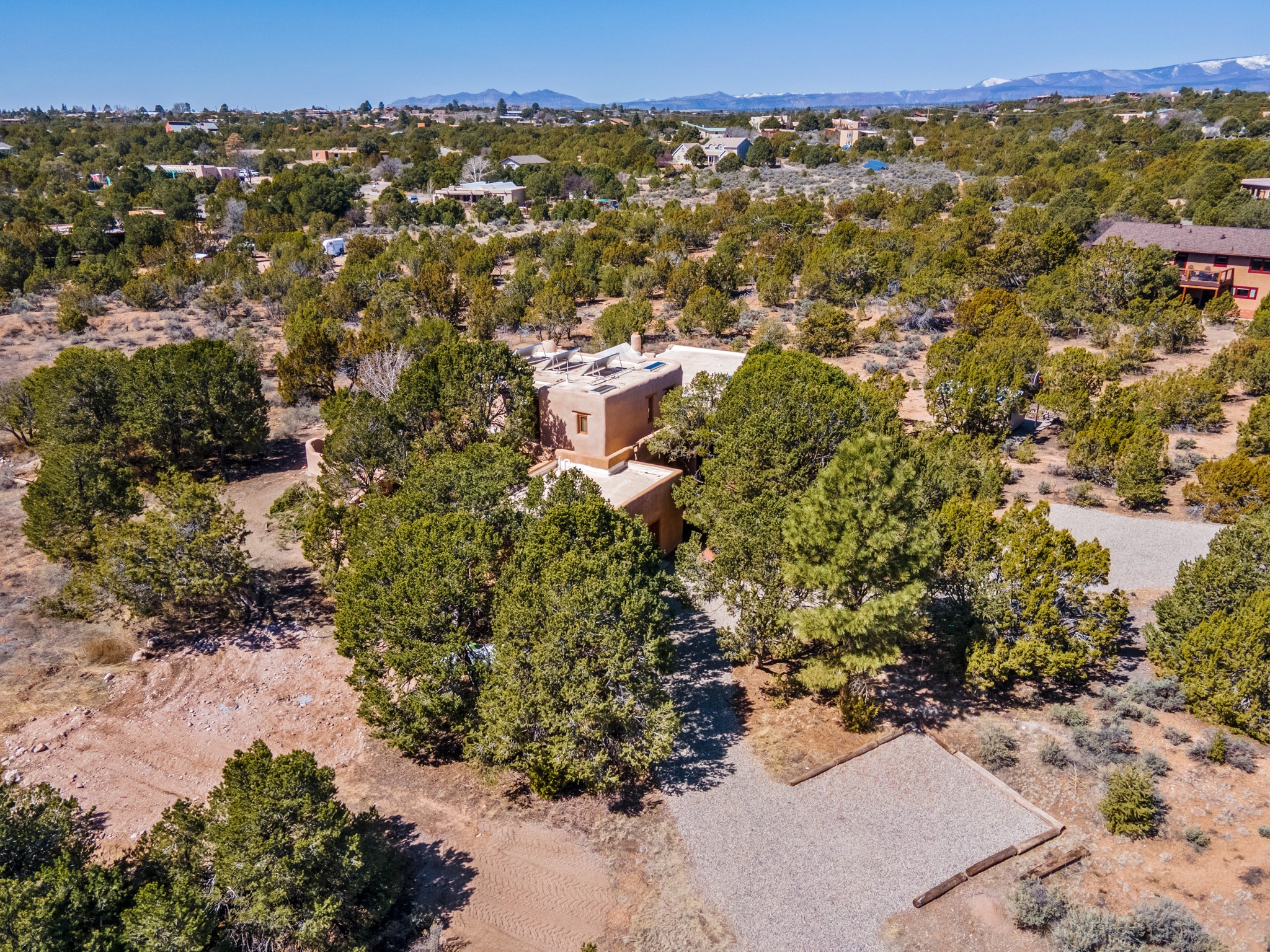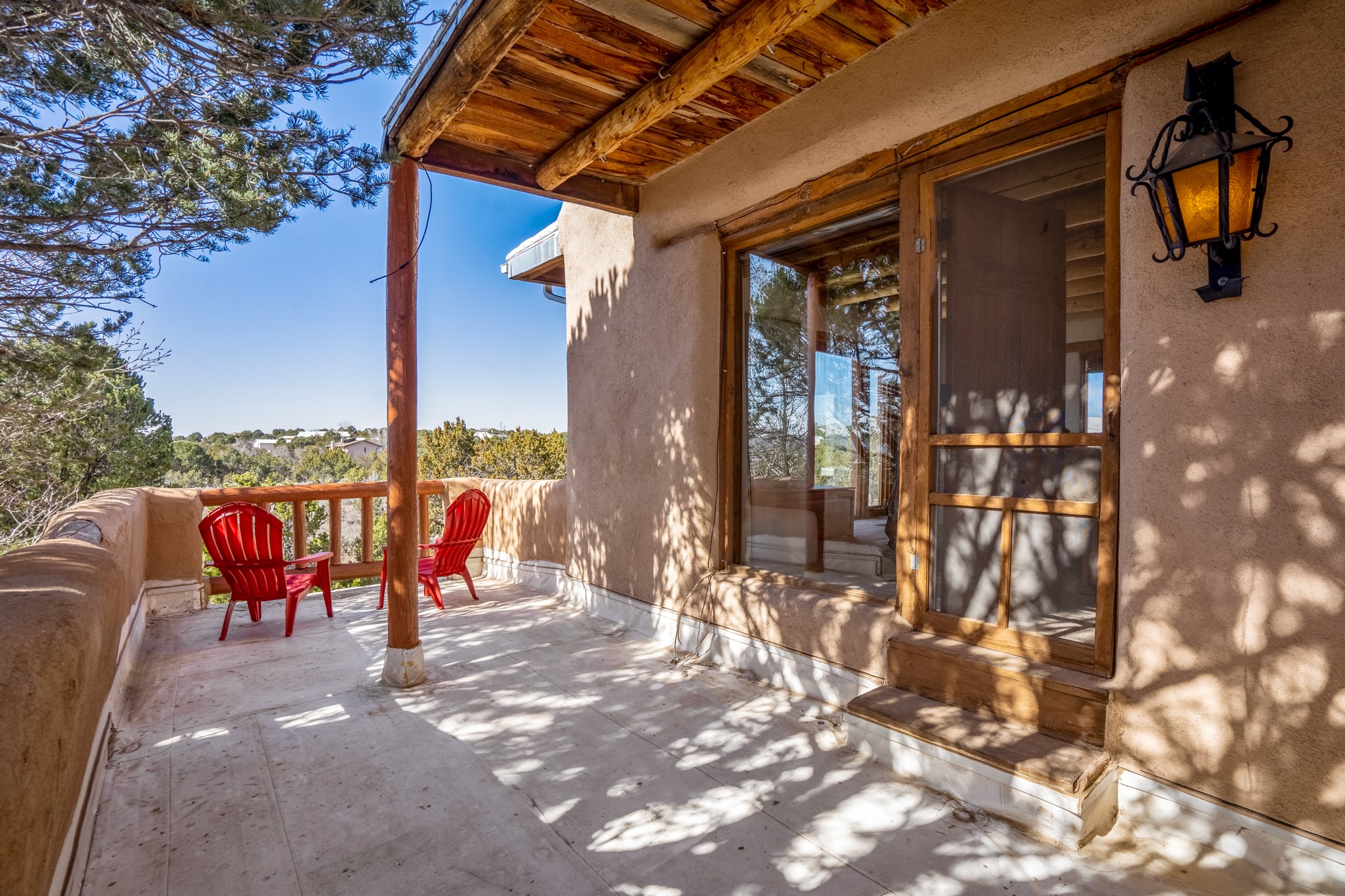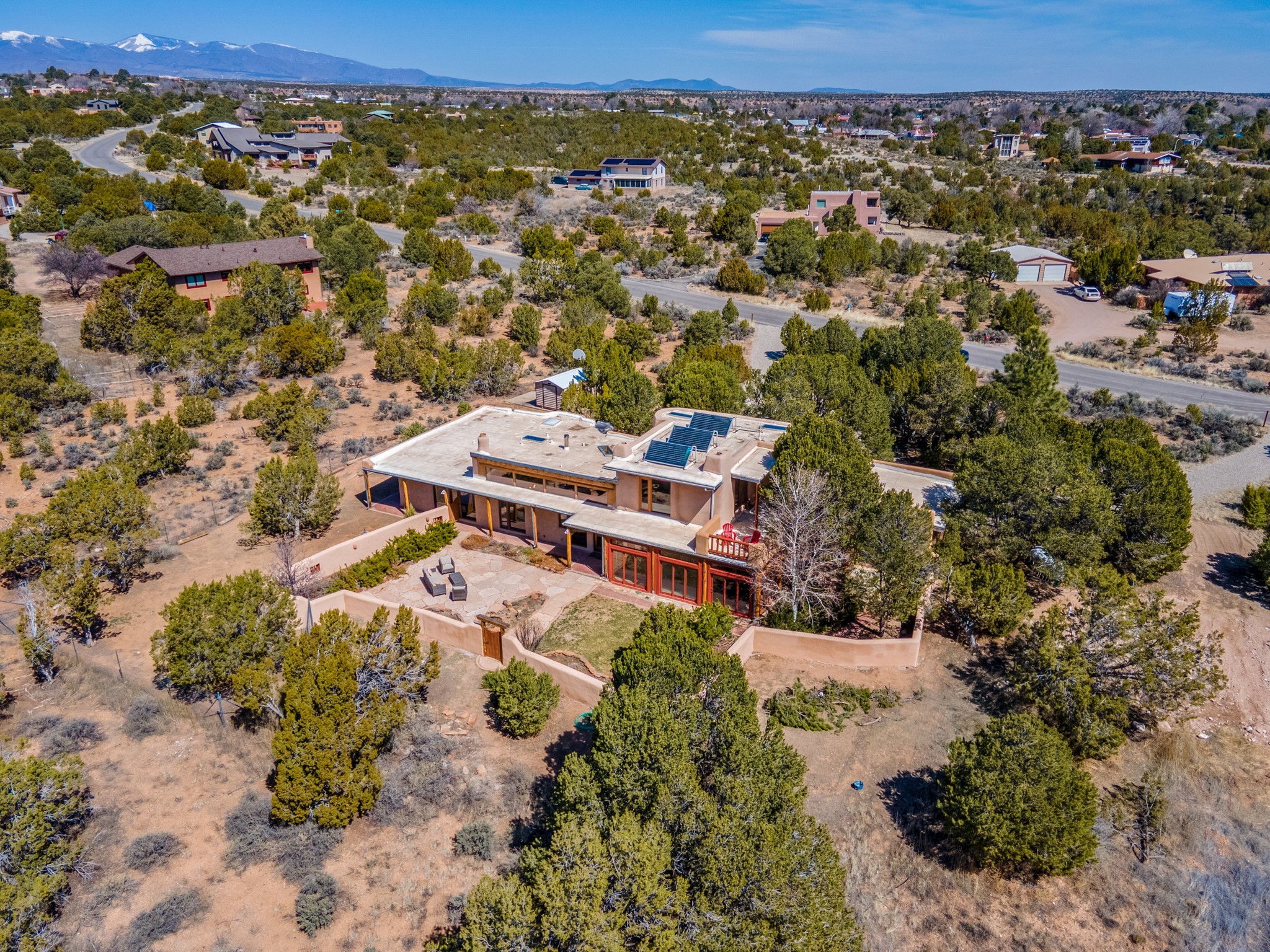 True Adobe, Vigas & Exposed Beams, Kiva Fireplaces, 2.06 Acres, 4 Bedrooms, Large Sunroom, 2 Car Garage, Passive Solar Heating, Abundant Natural Light, Large Storage Shed and More! This stunning, custom 4-bedroom full adobe home sits on 2.06 acres and offers classic, high-end Santa Fe style right here in Los Alamos County. A custom front door and foyer greet you upon entering the home, and you will immediately notice the red brick floors and viga ceilings. Each room features a different custom viga ceiling for added charm. The kitchen features an island with a built-in eating area, gas cooking, lofted ceiling with large clerestories, and walk-out access to the patio for indoor/outdoor entertaining. The grand dining room features floor-to-ceiling windows, a pass-through window to the kitchen, and a kiva fireplace to create a warm, intimate setting for your fine dining experience. The living room features hardwood floors and a large kiva fireplace. A large sunroom with south-facing, floor-to-ceiling windows wraps around the living room and provides you with the opportunity to grow bountiful plants and potted trees throughout the year, or simply to enjoy a good book while soaking up the sunshine. A large, private study and second living space are found on the east side of the first floor, and the room accentuates the beauty of the adobe home with its flowing lines. Two large bedrooms, each featuring a walk-in closet, along with an updated bathroom round out the first floor. The primary suite is located on the second floor, accessed by a spiral cedar staircase. The suite consists of the bedroom, walk-in closet, and bathroom. The room opens onto the deck, which offers great views of the surrounding area. A fourth bedroom, which could be used as an additional home office, completes the second floor. Outside, you will enjoy sunrises, sunsets, and dark, starlit nights from your private yard featuring a flagstone patio. An adjacent, fully-fenced dog yard completes the package. The sellers plan to review offers on Wednesday, April 19, so schedule your showing today!