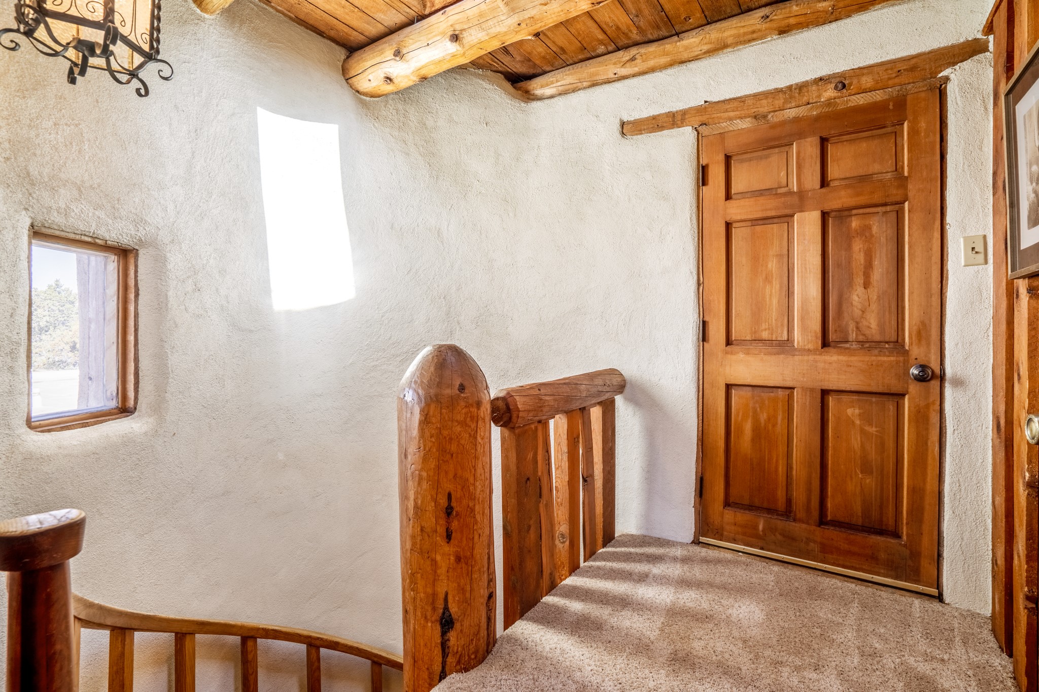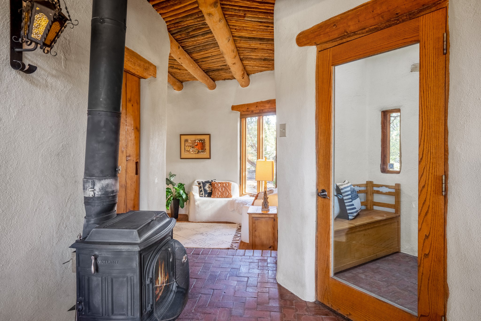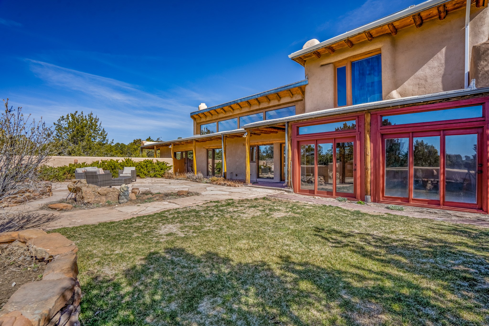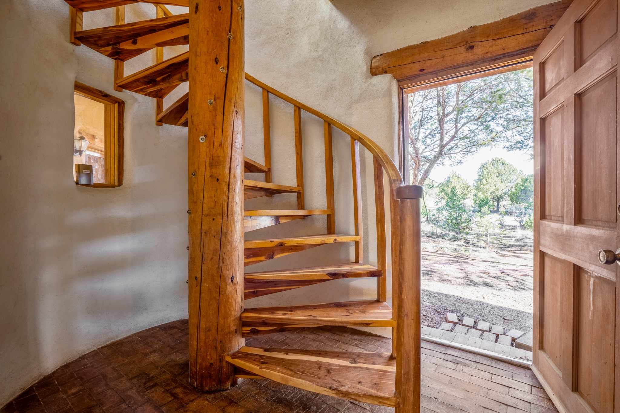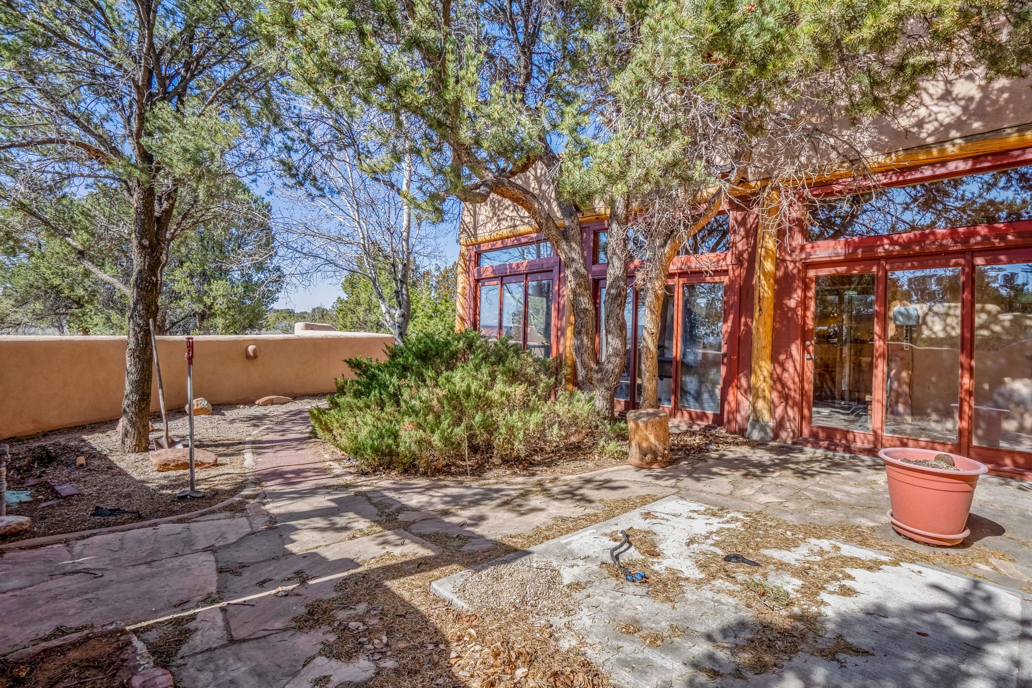 True Adobe, Vigas & Exposed Beams, Kiva Fireplaces, 2.06 Acres, 4 Bedrooms, Large Sunroom, 2 Car Garage, Passive Solar Heating, Abundant Natural Light, Large Storage Shed and More! This stunning, custom 4-bedroom full adobe home sits on 2.06 acres and offers classic, high-end Santa Fe style right here in Los Alamos County. A custom front door and foyer greet you upon entering the home, and you will immediately notice the red brick floors and viga ceilings. Each room features a different custom viga ceiling for added charm. The kitchen features an island with a built-in eating area, gas cooking, lofted ceiling with large clerestories, and walk-out access to the patio for indoor/outdoor entertaining. The grand dining room features floor-to-ceiling windows, a pass-through window to the kitchen, and a kiva fireplace to create a warm, intimate setting for your fine dining experience. The living room features hardwood floors and a large kiva fireplace. A large sunroom with south-facing, floor-to-ceiling windows wraps around the living room and provides you with the opportunity to grow bountiful plants and potted trees throughout the year, or simply to enjoy a good book while soaking up the sunshine. A large, private study and second living space are found on the east side of the first floor, and the room accentuates the beauty of the adobe home with its flowing lines. Two large bedrooms, each featuring a walk-in closet, along with an updated bathroom round out the first floor. The primary suite is located on the second floor, accessed by a spiral cedar staircase. The suite consists of the bedroom, walk-in closet, and bathroom. The room opens onto the deck, which offers great views of the surrounding area. A fourth bedroom, which could be used as an additional home office, completes the second floor. Outside, you will enjoy sunrises, sunsets, and dark, starlit nights from your private yard featuring a flagstone patio. An adjacent, fully-fenced dog yard completes the package. The sellers plan to review offers on Wednesday, April 19, so schedule your showing today!