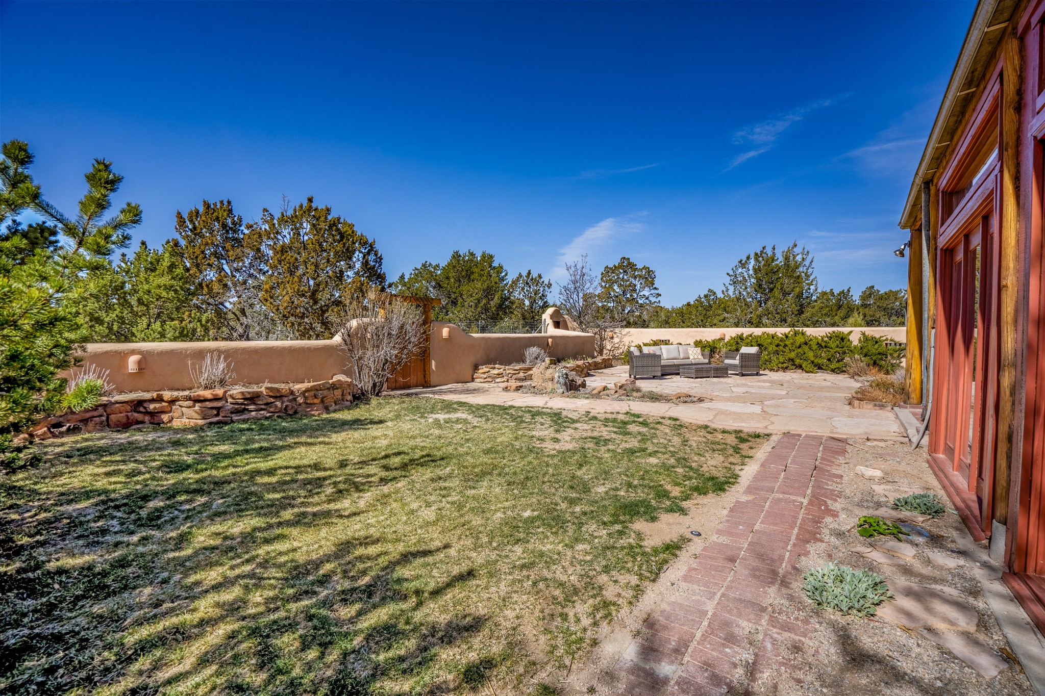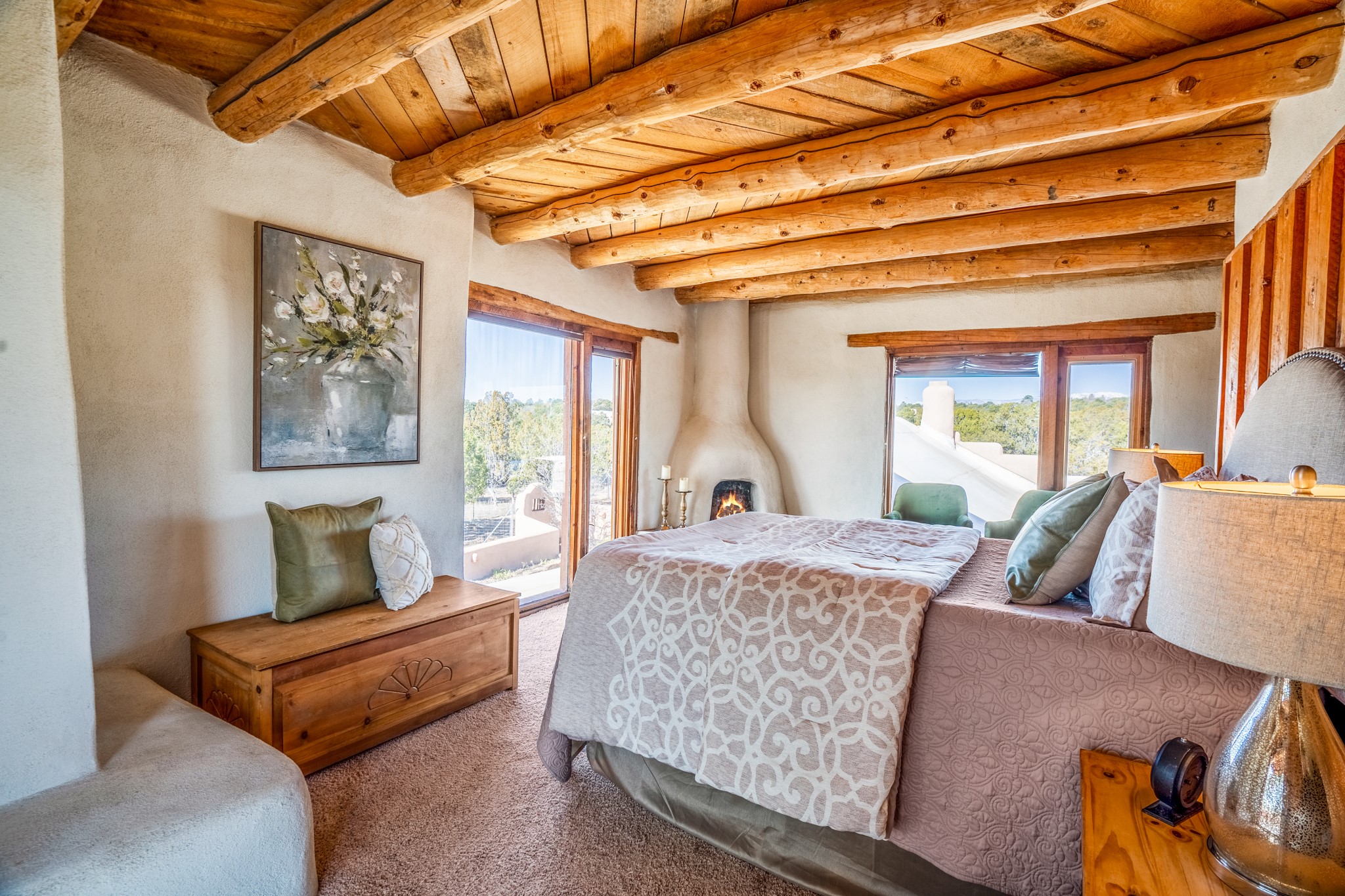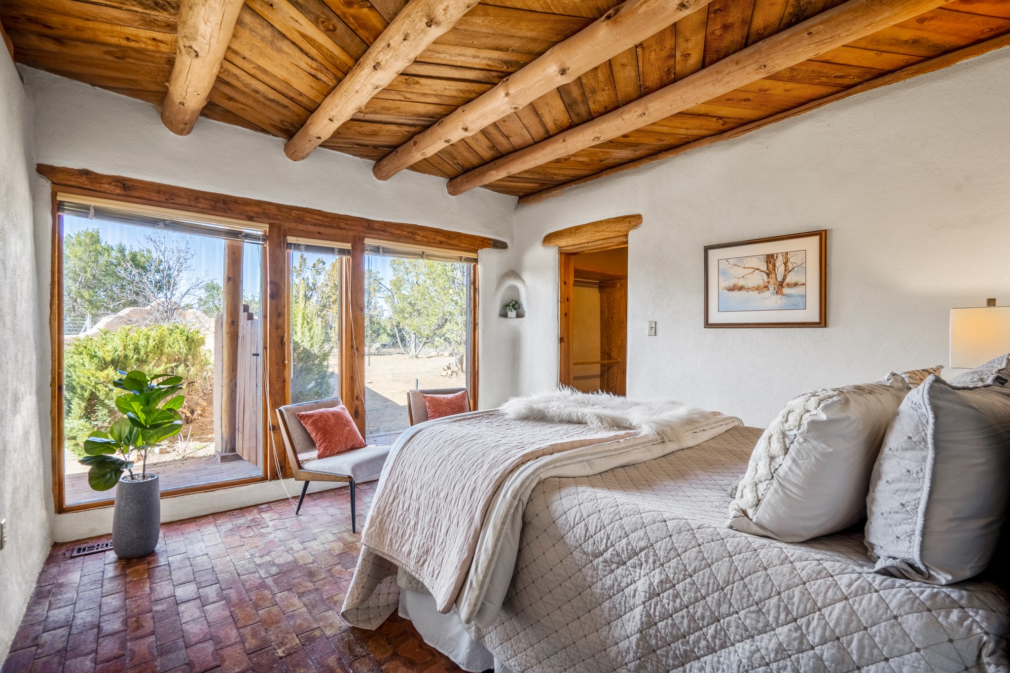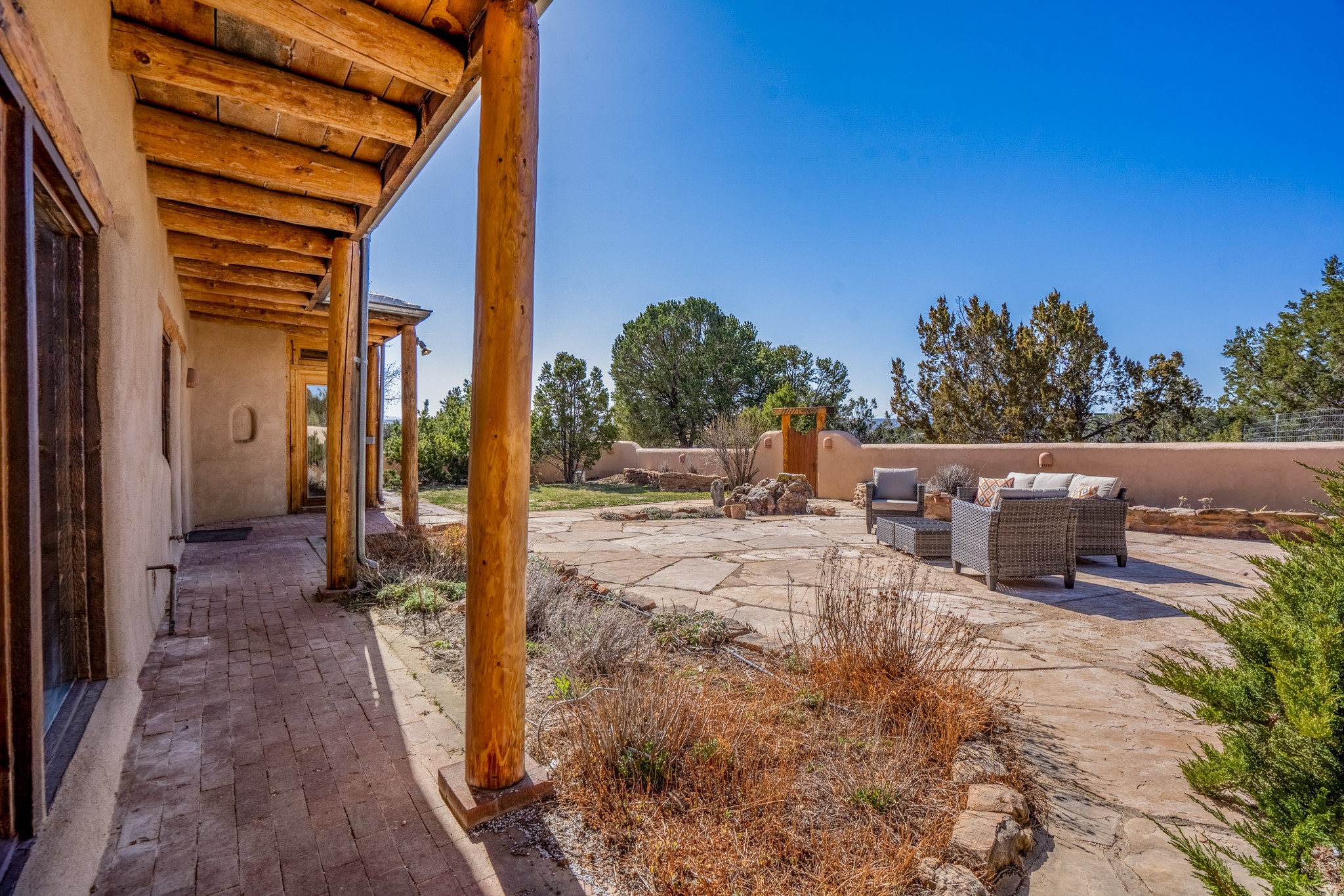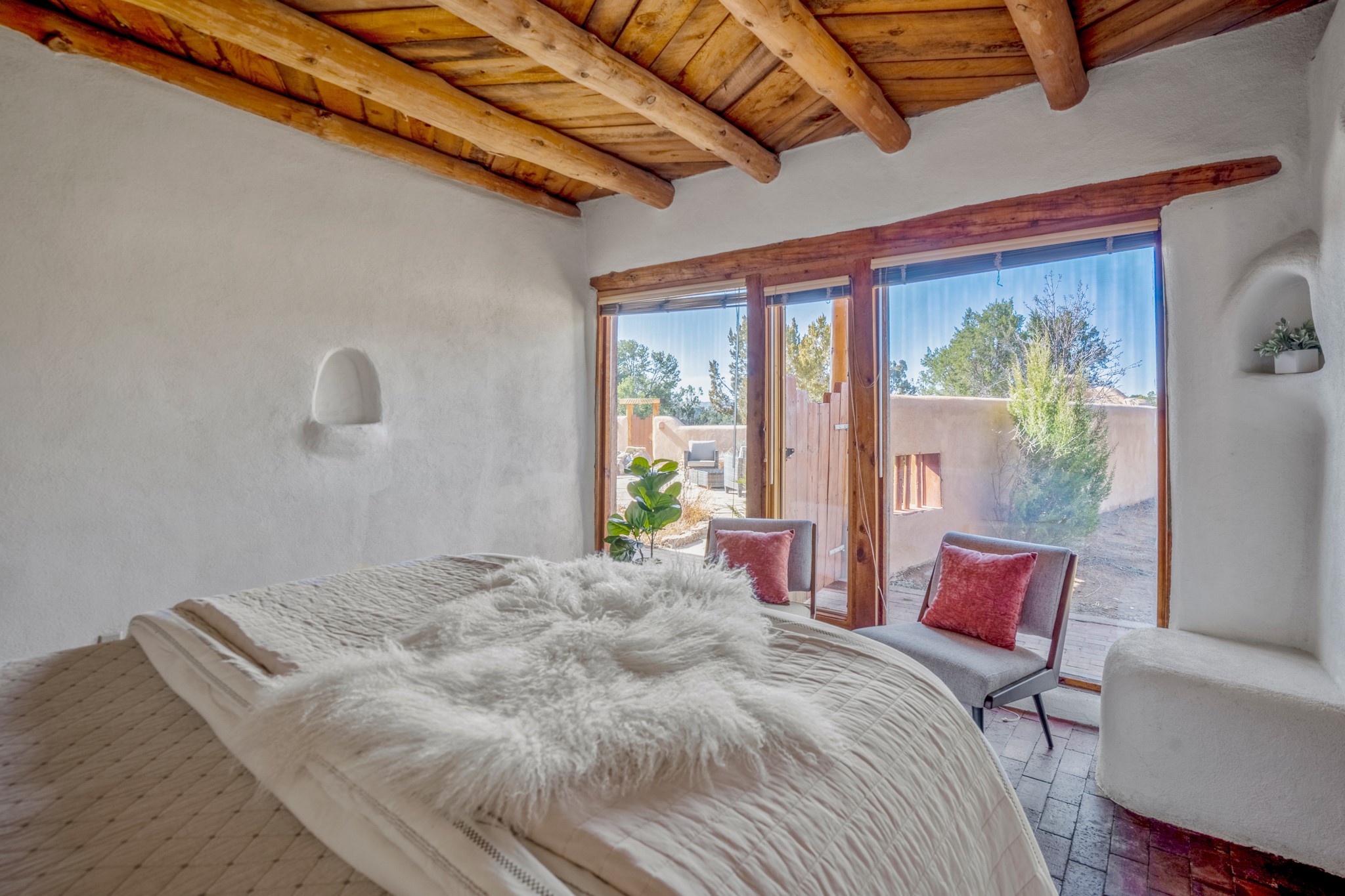True Adobe, Vigas & Exposed Beams, Kiva Fireplaces, 2.06 Acres, 4 Bedrooms, Large Sunroom, 2 Car Garage, Passive Solar Heating, Abundant Natural Light, Large Storage Shed and More! This stunning, custom 4-bedroom full adobe home sits on 2.06 acres and offers classic, high-end Santa Fe style right here in Los Alamos County. A custom front door and foyer greet you upon entering the home, and you will immediately notice the red brick floors and viga ceilings. Each room features a different custom viga ceiling for added charm. The kitchen features an island with a built-in eating area, gas cooking, lofted ceiling with large clerestories, and walk-out access to the patio for indoor/outdoor entertaining. The grand dining room features floor-to-ceiling windows, a pass-through window to the kitchen, and a kiva fireplace to create a warm, intimate setting for your fine dining experience. The living room features hardwood floors and a large kiva fireplace. A large sunroom with south-facing, floor-to-ceiling windows wraps around the living room and provides you with the opportunity to grow bountiful plants and potted trees throughout the year, or simply to enjoy a good book while soaking up the sunshine. A large, private study and second living space are found on the east side of the first floor, and the room accentuates the beauty of the adobe home with its flowing lines. Two large bedrooms, each featuring a walk-in closet, along with an updated bathroom round out the first floor. The primary suite is located on the second floor, accessed by a spiral cedar staircase. The suite consists of the bedroom, walk-in closet, and bathroom. The room opens onto the deck, which offers great views of the surrounding area. A fourth bedroom, which could be used as an additional home office, completes the second floor. Outside, you will enjoy sunrises, sunsets, and dark, starlit nights from your private yard featuring a flagstone patio. An adjacent, fully-fenced dog yard completes the package. The sellers plan to review offers on Wednesday, April 19, so schedule your showing today!