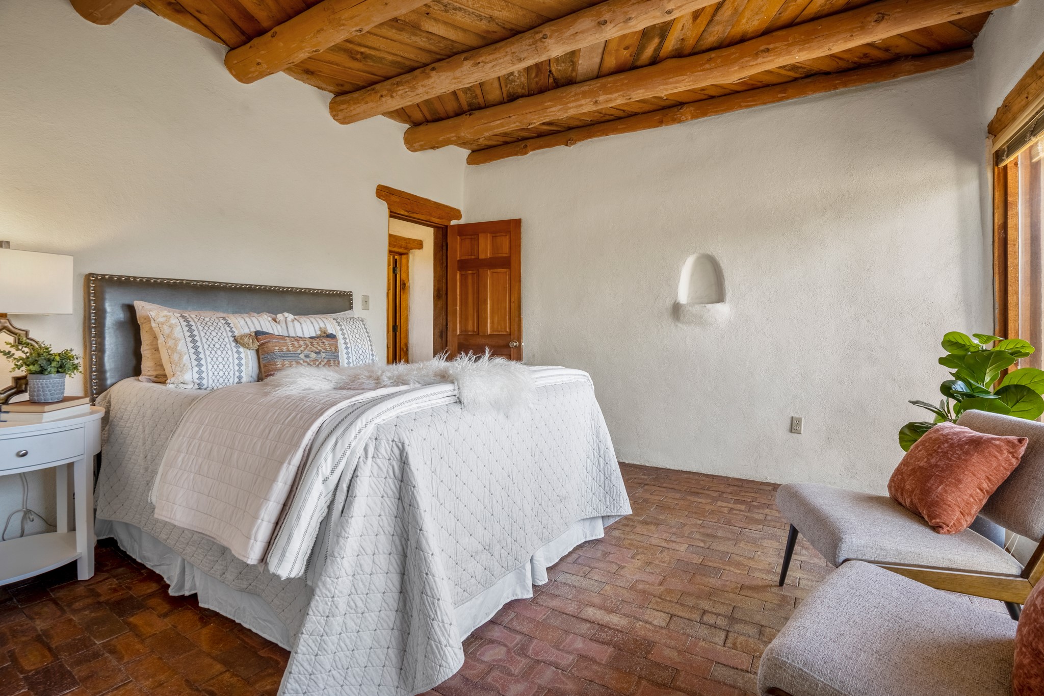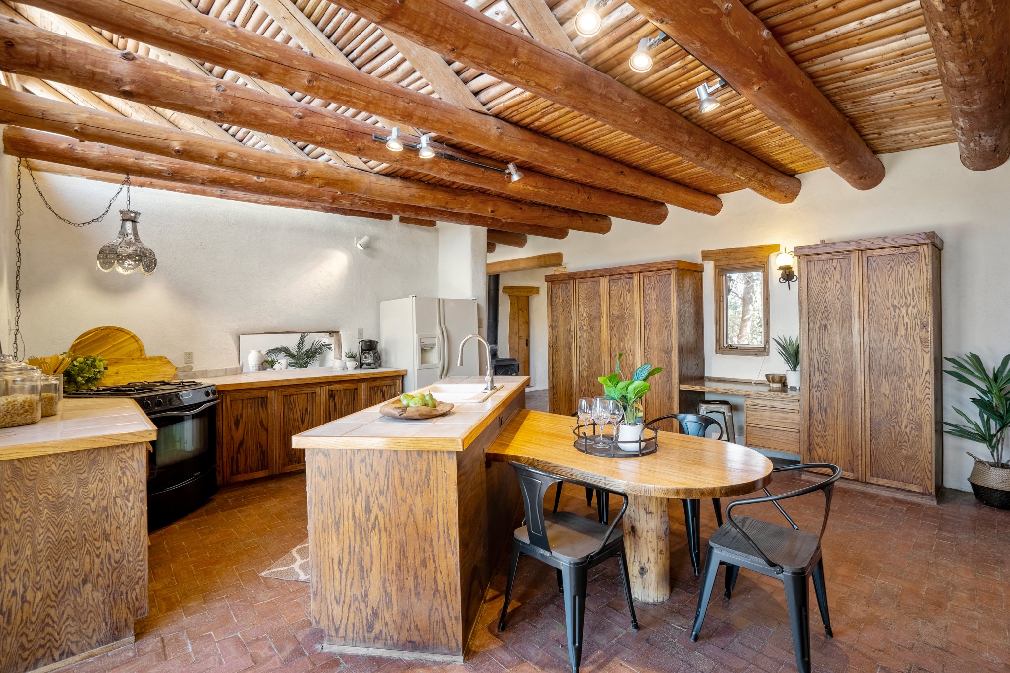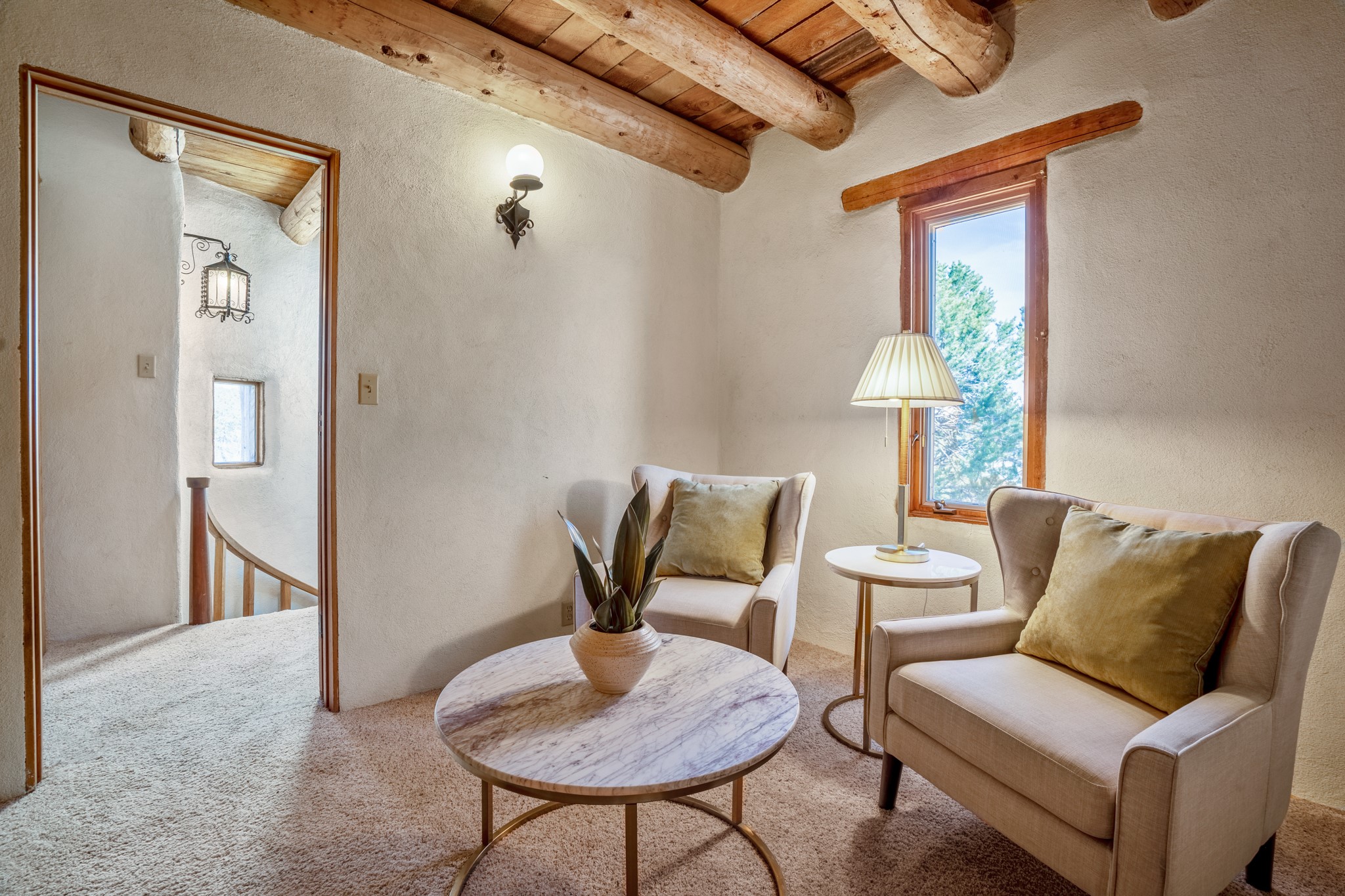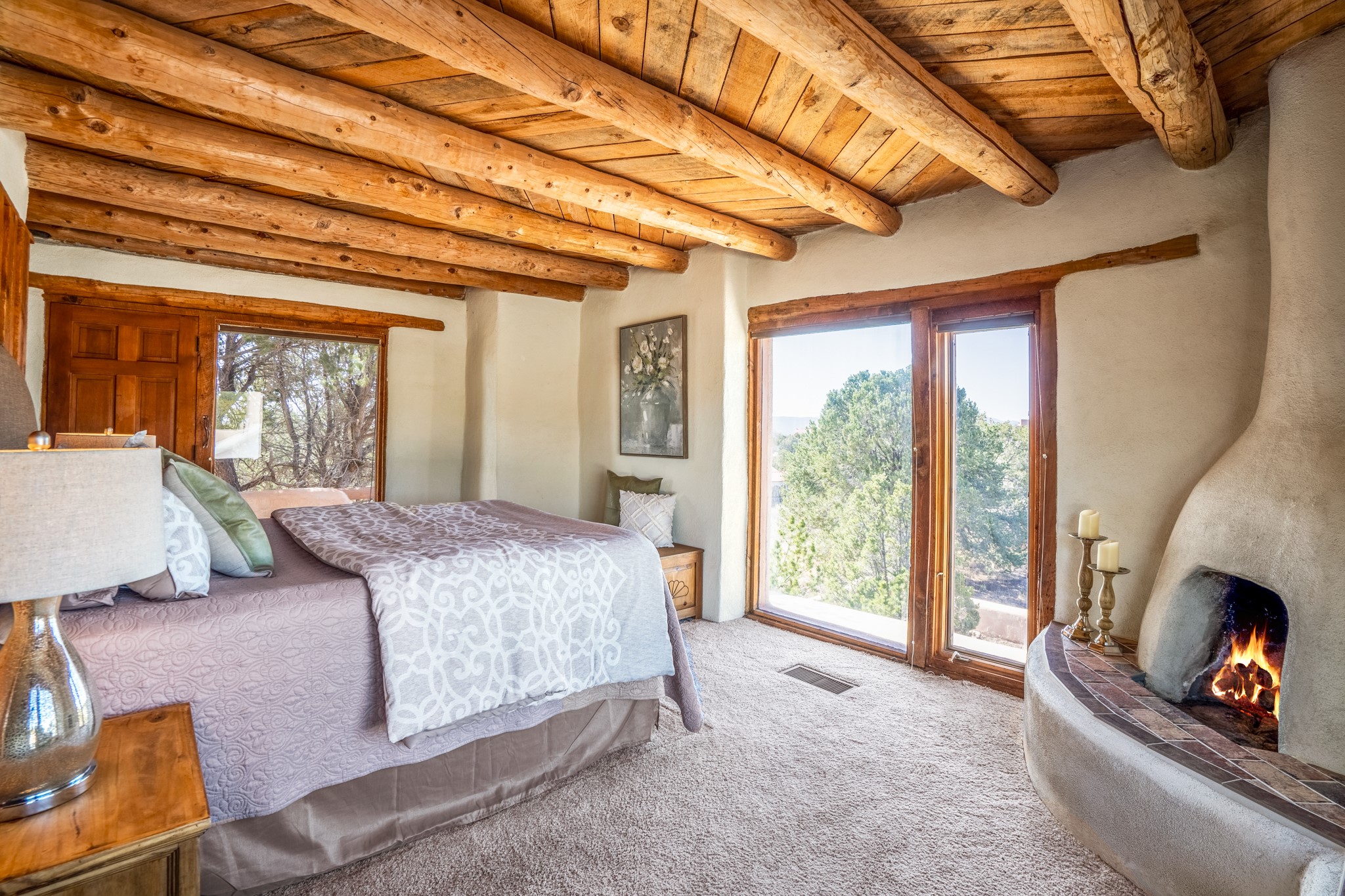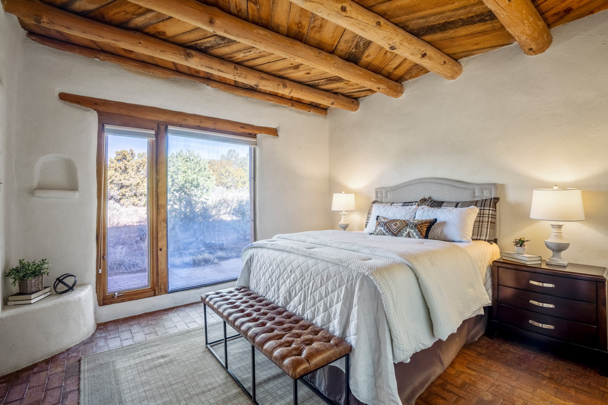True Adobe, Vigas & Exposed Beams, Kiva Fireplaces, 2.06 Acres, 4 Bedrooms, Large Sunroom, 2 Car Garage, Passive Solar Heating, Abundant Natural Light, Large Storage Shed and More! This stunning, custom 4-bedroom full adobe home sits on 2.06 acres and offers classic, high-end Santa Fe style right here in Los Alamos County. A custom front door and foyer greet you upon entering the home, and you will immediately notice the red brick floors and viga ceilings. Each room features a different custom viga ceiling for added charm. The kitchen features an island with a built-in eating area, gas cooking, lofted ceiling with large clerestories, and walk-out access to the patio for indoor/outdoor entertaining. The grand dining room features floor-to-ceiling windows, a pass-through window to the kitchen, and a kiva fireplace to create a warm, intimate setting for your fine dining experience. The living room features hardwood floors and a large kiva fireplace. A large sunroom with south-facing, floor-to-ceiling windows wraps around the living room and provides you with the opportunity to grow bountiful plants and potted trees throughout the year, or simply to enjoy a good book while soaking up the sunshine. A large, private study and second living space are found on the east side of the first floor, and the room accentuates the beauty of the adobe home with its flowing lines. Two large bedrooms, each featuring a walk-in closet, along with an updated bathroom round out the first floor. The primary suite is located on the second floor, accessed by a spiral cedar staircase. The suite consists of the bedroom, walk-in closet, and bathroom. The room opens onto the deck, which offers great views of the surrounding area. A fourth bedroom, which could be used as an additional home office, completes the second floor. Outside, you will enjoy sunrises, sunsets, and dark, starlit nights from your private yard featuring a flagstone patio. An adjacent, fully-fenced dog yard completes the package. The sellers plan to review offers on Wednesday, April 19, so schedule your showing today!