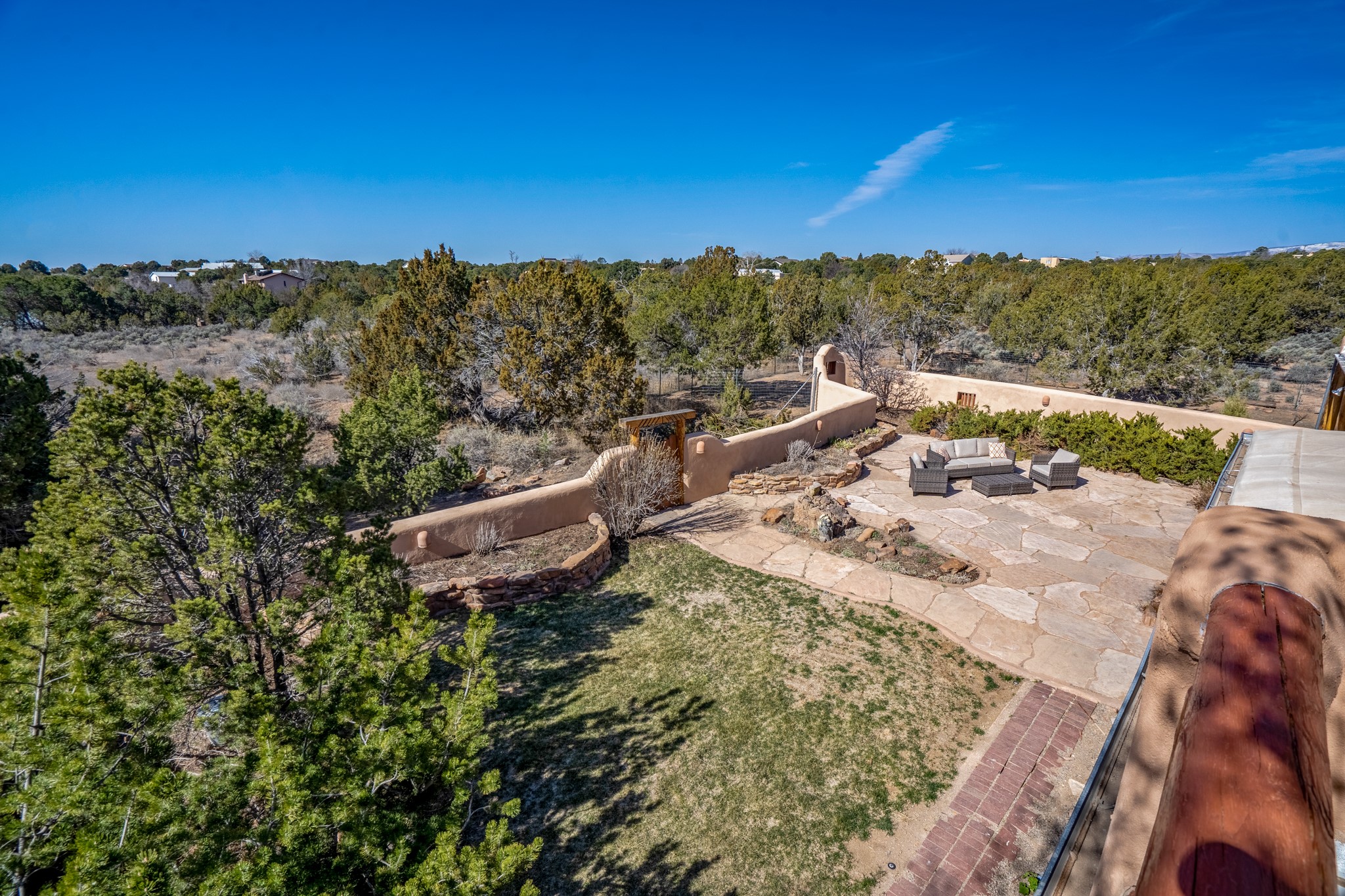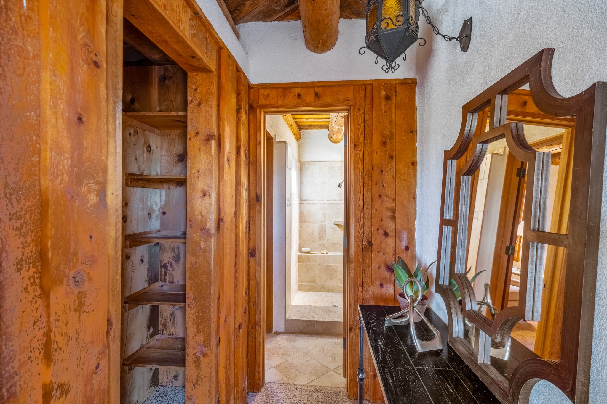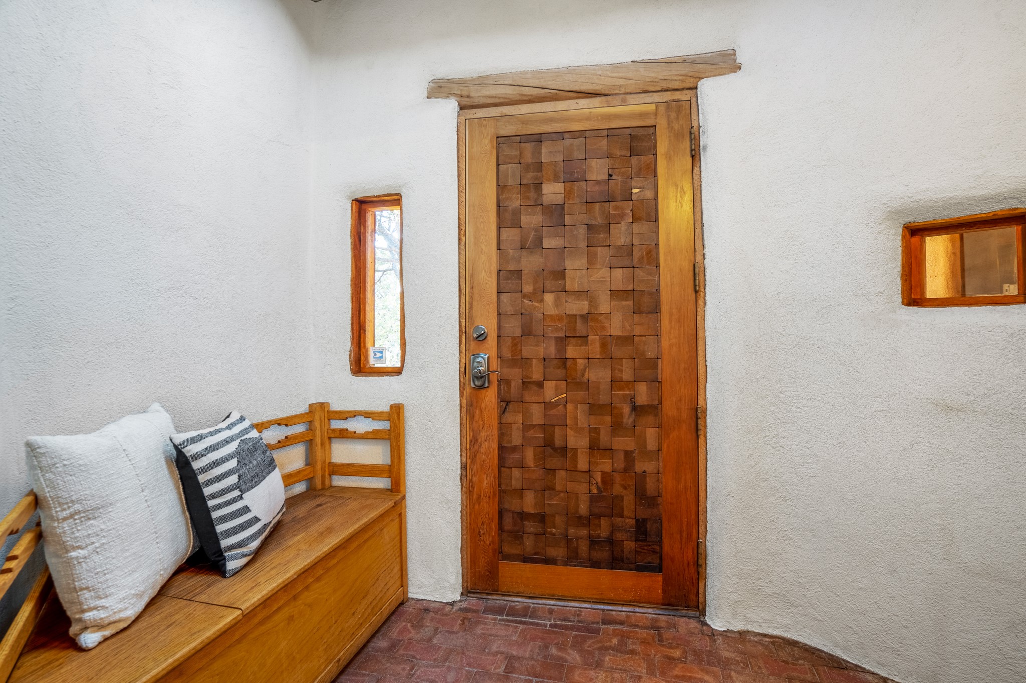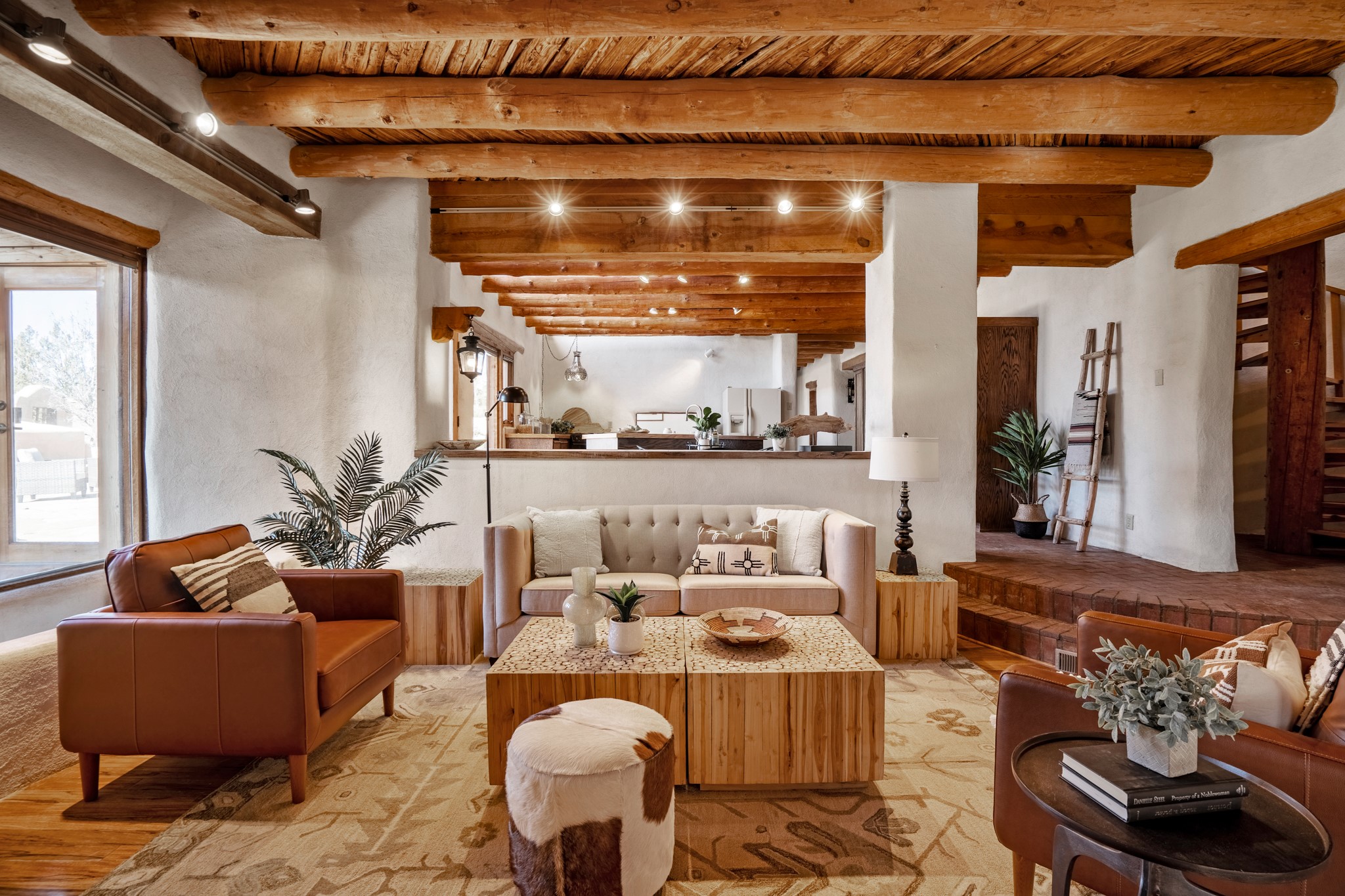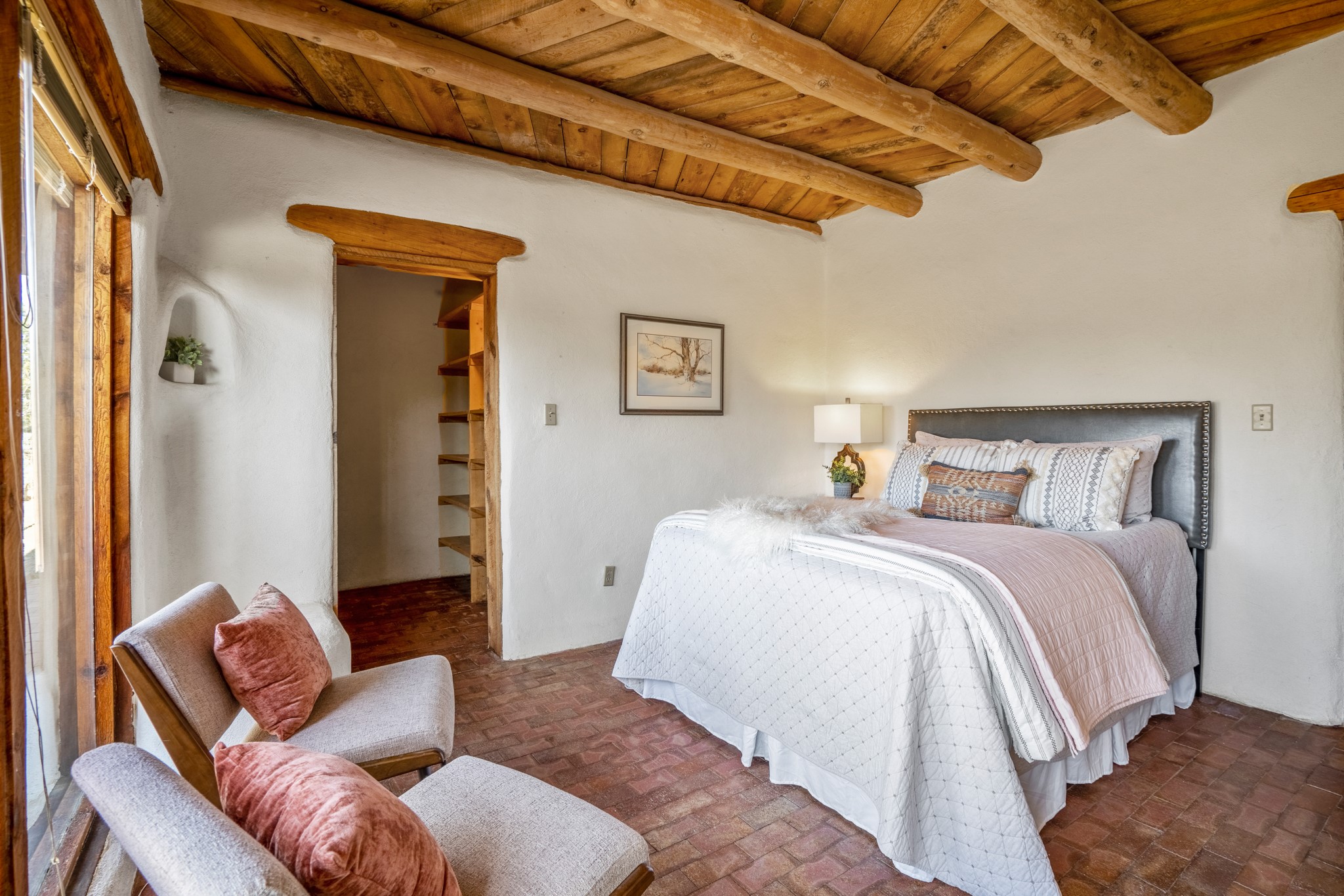 True Adobe, Vigas & Exposed Beams, Kiva Fireplaces, 2.06 Acres, 4 Bedrooms, Large Sunroom, 2 Car Garage, Passive Solar Heating, Abundant Natural Light, Large Storage Shed and More! This stunning, custom 4-bedroom full adobe home sits on 2.06 acres and offers classic, high-end Santa Fe style right here in Los Alamos County. A custom front door and foyer greet you upon entering the home, and you will immediately notice the red brick floors and viga ceilings. Each room features a different custom viga ceiling for added charm. The kitchen features an island with a built-in eating area, gas cooking, lofted ceiling with large clerestories, and walk-out access to the patio for indoor/outdoor entertaining. The grand dining room features floor-to-ceiling windows, a pass-through window to the kitchen, and a kiva fireplace to create a warm, intimate setting for your fine dining experience. The living room features hardwood floors and a large kiva fireplace. A large sunroom with south-facing, floor-to-ceiling windows wraps around the living room and provides you with the opportunity to grow bountiful plants and potted trees throughout the year, or simply to enjoy a good book while soaking up the sunshine. A large, private study and second living space are found on the east side of the first floor, and the room accentuates the beauty of the adobe home with its flowing lines. Two large bedrooms, each featuring a walk-in closet, along with an updated bathroom round out the first floor. The primary suite is located on the second floor, accessed by a spiral cedar staircase. The suite consists of the bedroom, walk-in closet, and bathroom. The room opens onto the deck, which offers great views of the surrounding area. A fourth bedroom, which could be used as an additional home office, completes the second floor. Outside, you will enjoy sunrises, sunsets, and dark, starlit nights from your private yard featuring a flagstone patio. An adjacent, fully-fenced dog yard completes the package. The sellers plan to review offers on Wednesday, April 19, so schedule your showing today!