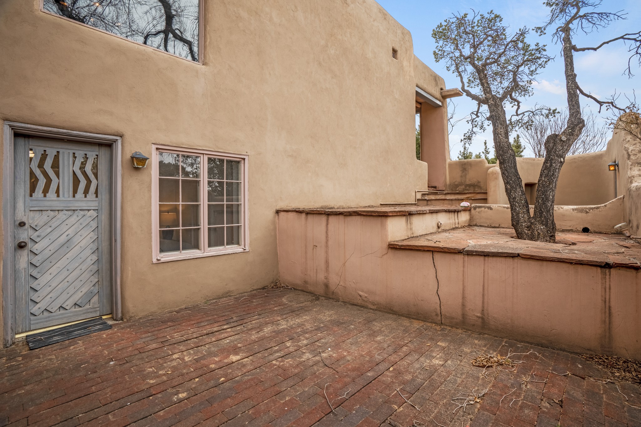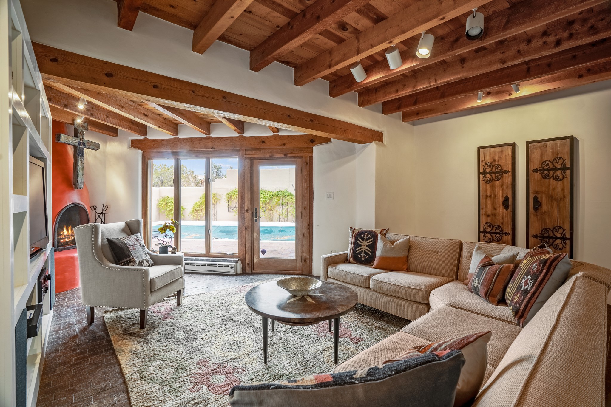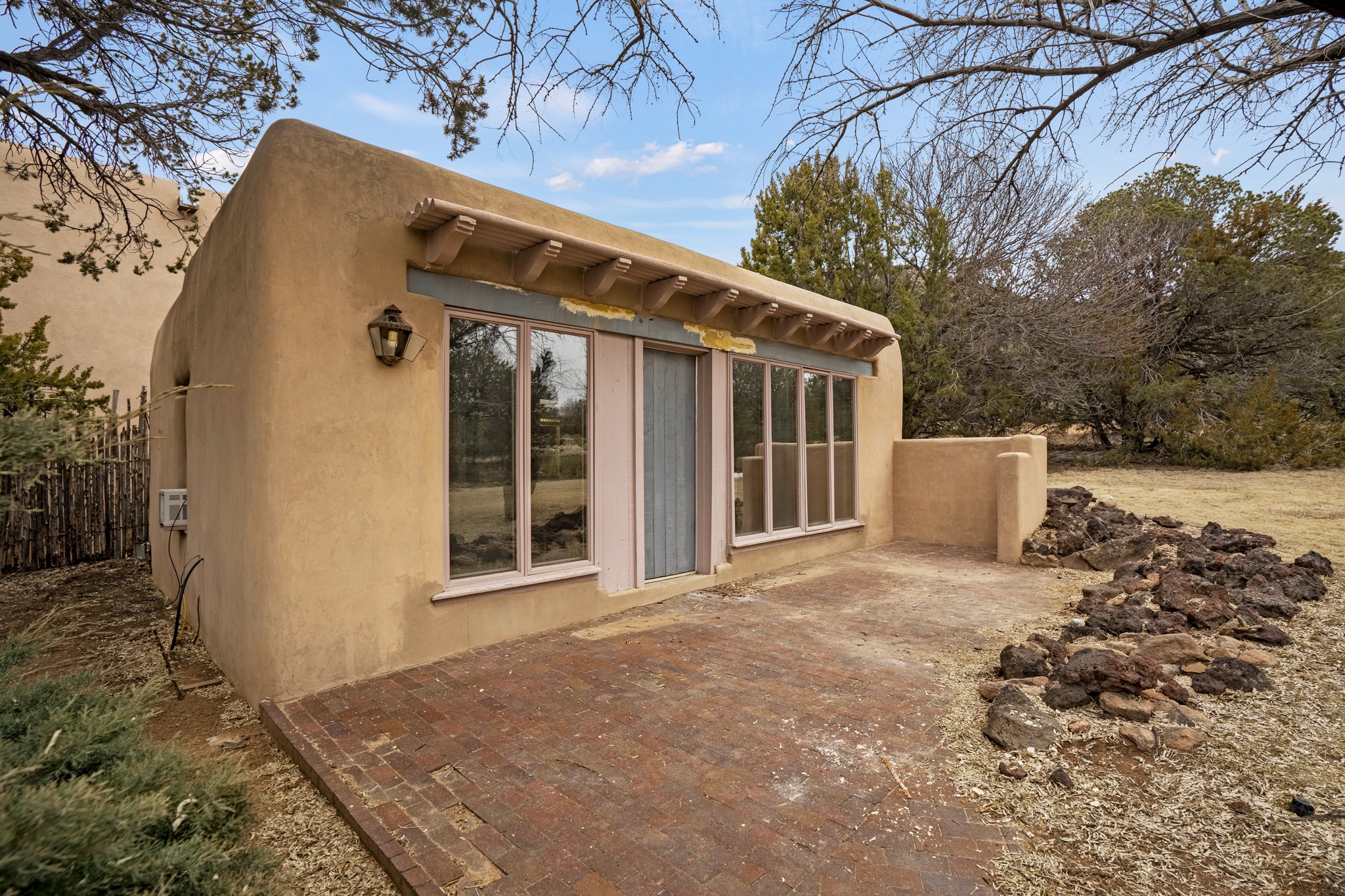 A Diamond in the rough situated on 2 wooded acres in a prime Santa Fe location at the foot of Sun Mountain. This is a classic Santa Fe home built in 1947 with 2 bedrooms and 2 full bathrooms in the primary residence and a detached guest house. Enter the property down a long driveway and find this home nestled in the trees and pinons. The home has a spacious living room with vigas, wood floors and a large fireplace. The kitchen is well equipped with an adjacent formal dining room. The spacious primary bedroom has a kiva fireplace and has a large primary bathroom with views overlooking the property. The large walk in closet has been remodeled with ample shelving and storage. The large family room opens out into a walled courtyard with an in-ground pool. Entertain family and friends in the large rear patio with a portal. Direct access to the Sun Mountain Hiking trail from the property. With some remodeling and renovation, this is the perfect Santa Fe home.