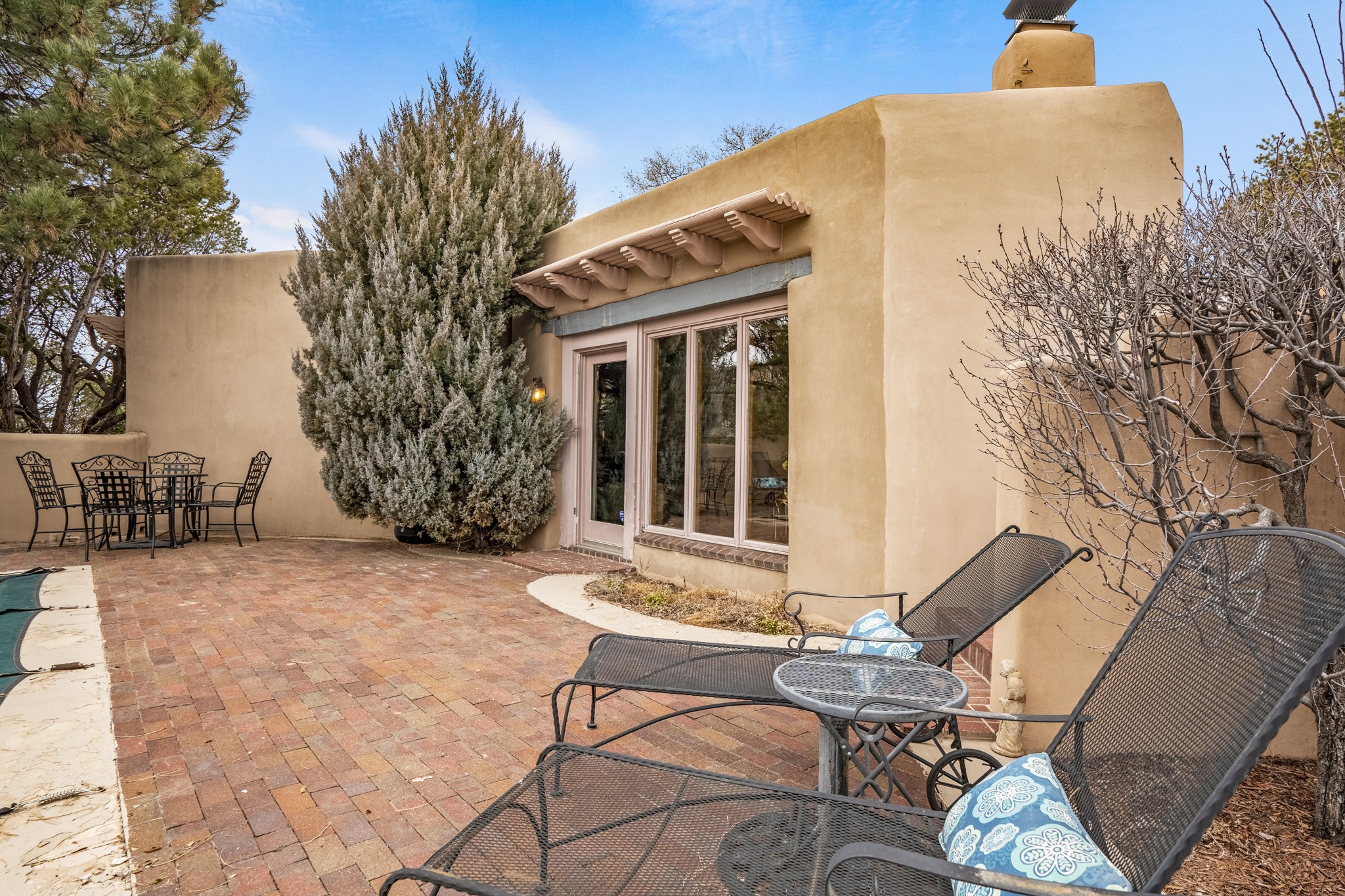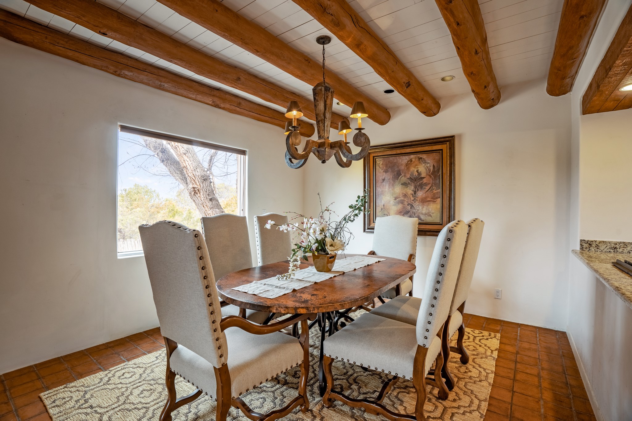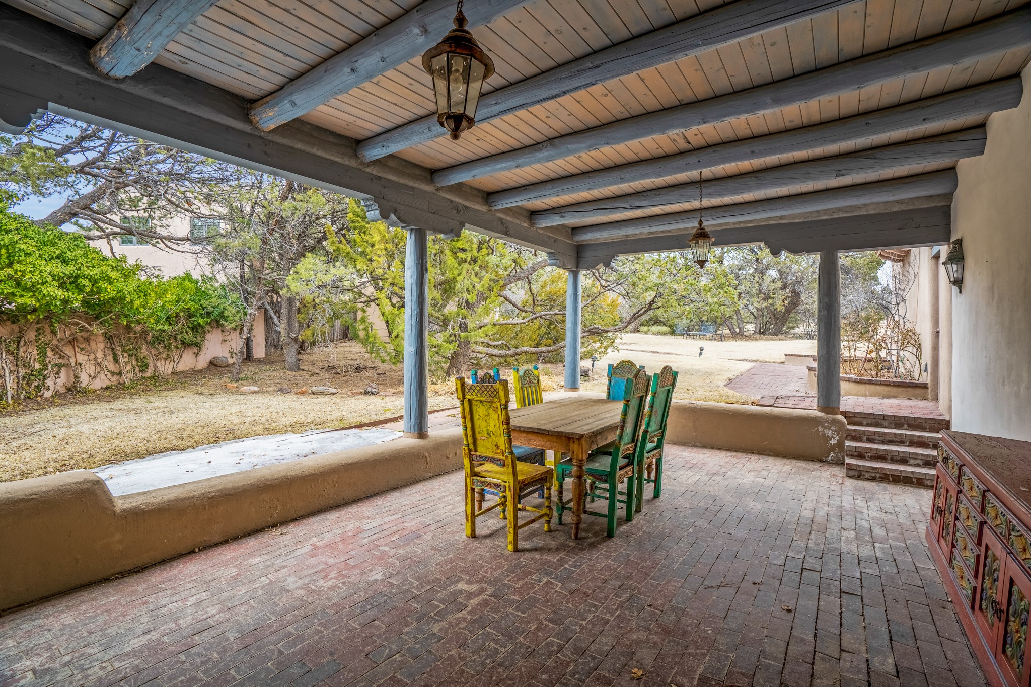 A Diamond in the rough situated on 2 wooded acres in a prime Santa Fe location at the foot of Sun Mountain. This is a classic Santa Fe home built in 1947 with 2 bedrooms and 2 full bathrooms in the primary residence and a detached guest house. Enter the property down a long driveway and find this home nestled in the trees and pinons. The home has a spacious living room with vigas, wood floors and a large fireplace. The kitchen is well equipped with an adjacent formal dining room. The spacious primary bedroom has a kiva fireplace and has a large primary bathroom with views overlooking the property. The large walk in closet has been remodeled with ample shelving and storage. The large family room opens out into a walled courtyard with an in-ground pool. Entertain family and friends in the large rear patio with a portal. Direct access to the Sun Mountain Hiking trail from the property. With some remodeling and renovation, this is the perfect Santa Fe home.