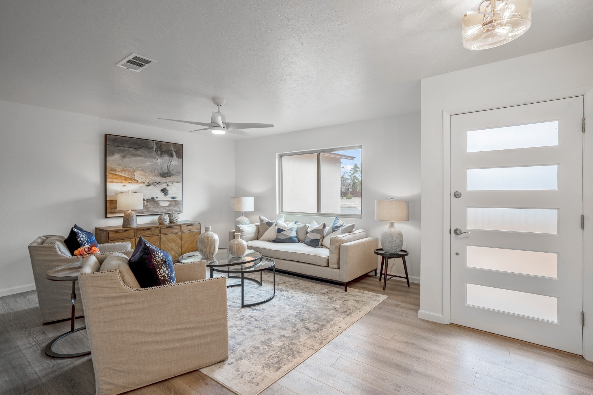 Light and bright 4 bedroom home centrally located within Santa Fe. The open floor plan is great for entertaining! This designer inspired home has new luxury vinyl floors, new cabinets, granite countertops, new plumbing and lighting fixtures, also a new furnace and hot water heater. The backyard is fenced with mature trees and views of the Sangre De Cristo Mountains. Both front and back yards are beautifully landscaped. This home is complete with new windows, propanel roof, and stucco!