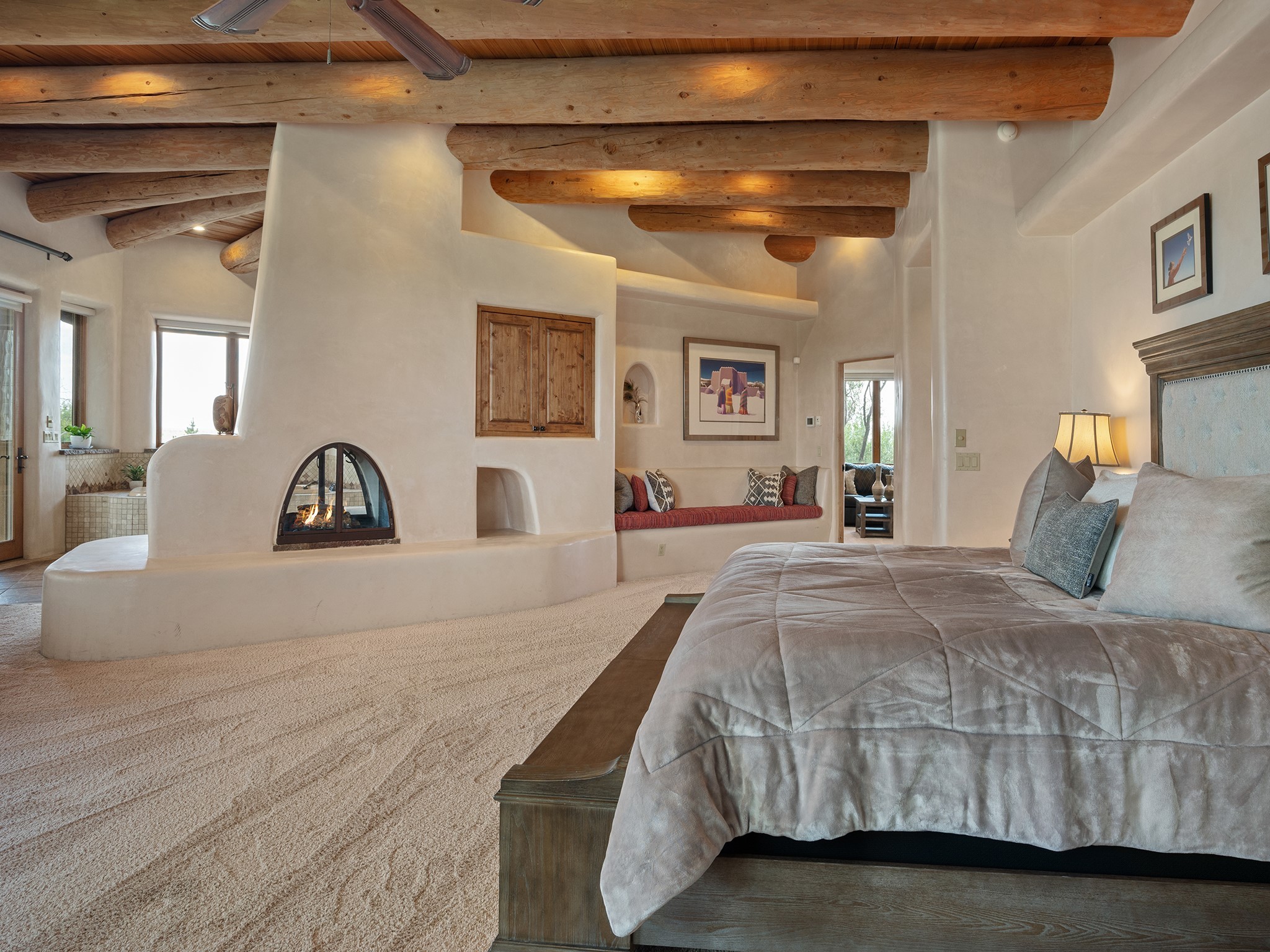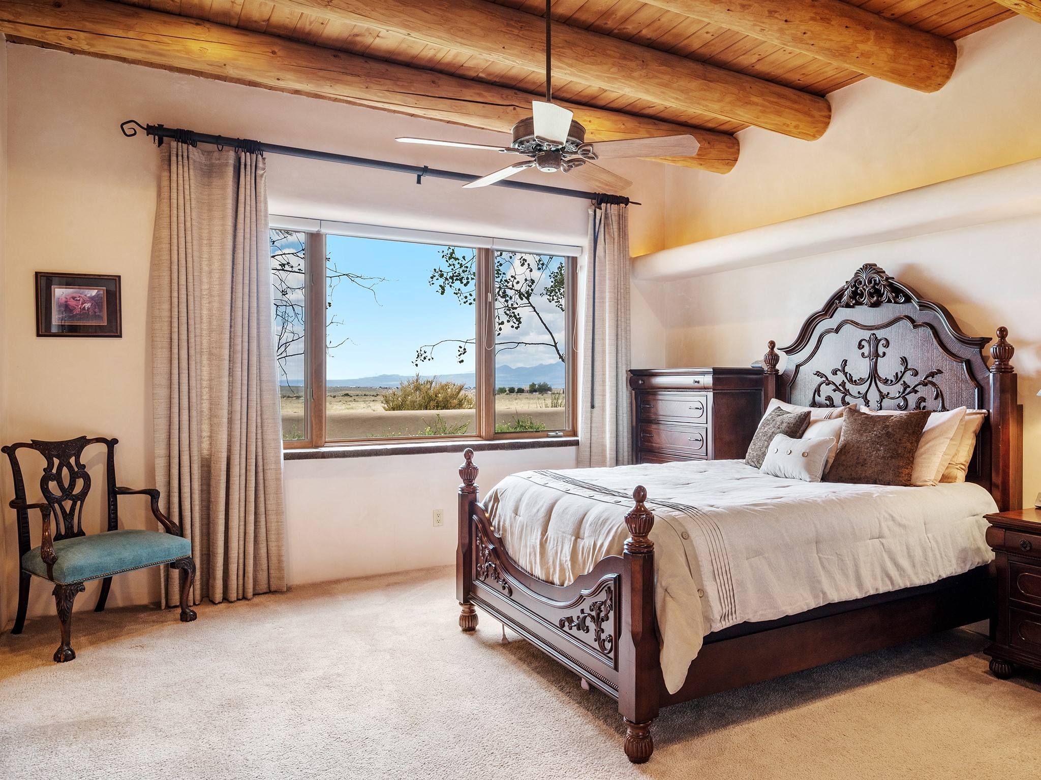 This stunning property located in the Santa Fe County equine community of Rancho San Marcos will take your breath away. Situated on 33+ acres with expansive mountain views and space to roam, along with a 3-acre foot private well. The roof was replaced in fall 2022 and there's new HVAC for your comfort. Only 20 minutes to the Santa Fe Plaza, the property is spacious yet surprisingly warm and inviting for a home this large. The Kitchen is a cook's dream and the multi car garages will make a car collector swoon. The home features custom detailing and grand proportions throughout. There's a large Primary Bedroom Suite w/wood-burning fireplace, dressing room and custom closet. The Living Room has a wet bar and French doors that open to deep portals. There are elegant en suite Guest Bedrooms, a Game Room w/wet bar and fireplace, Media Room and a light/bright Artist Studio. In addition, there is an attached Guest House with 2 Bedrooms, Living Room, Kitchen/Dining, Laundry and a separate entrance. The entire property is surrounded by lush landscaping made possible by extensive irrigation and the 3-acre foot private well which had a new pump. Owner has also added an arena and outbuilding for agility training for her show dogs. There's plenty of space for horses as well. This is a rare opportunity to own your own private oasis in one of the most desirable areas in Santa Fe. Don't miss out!
