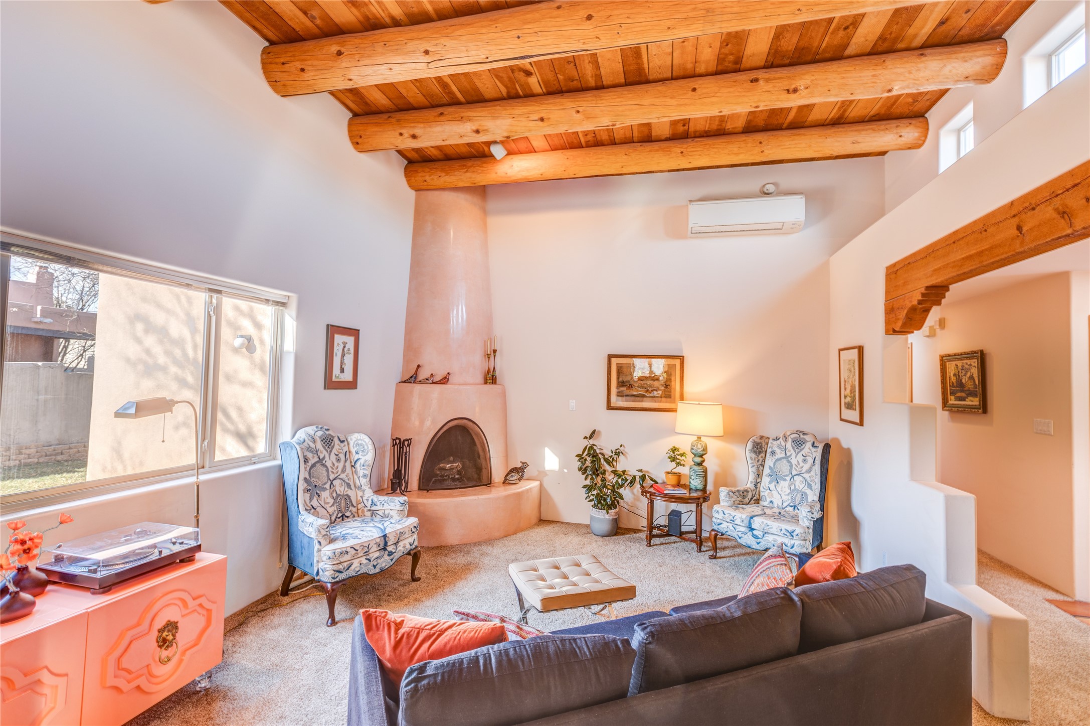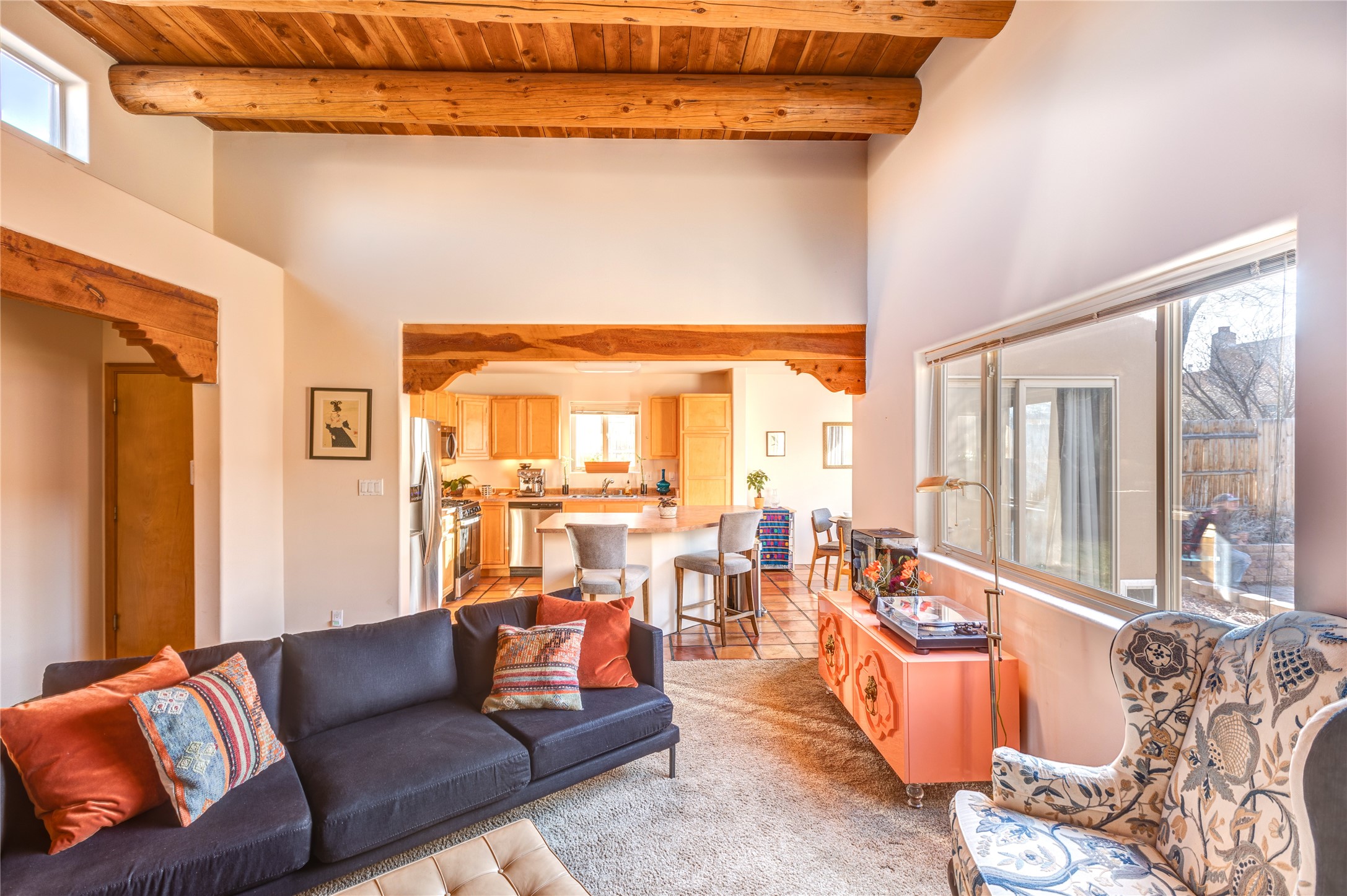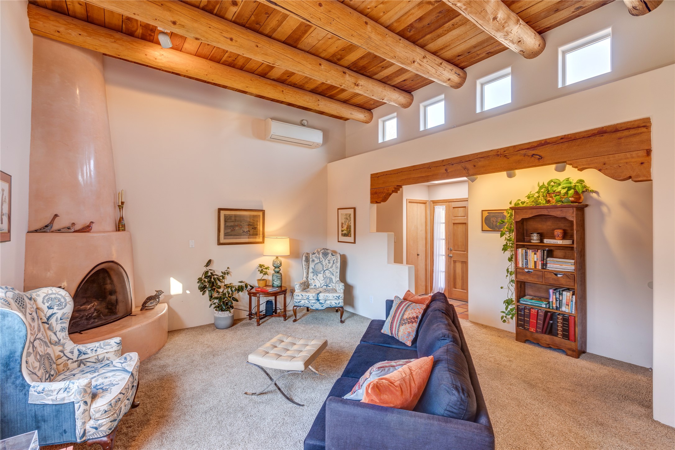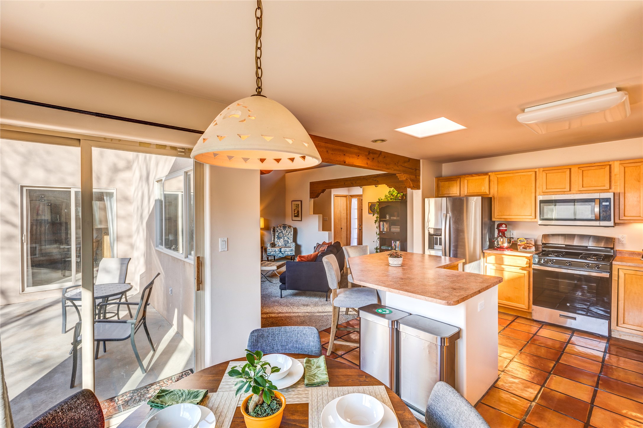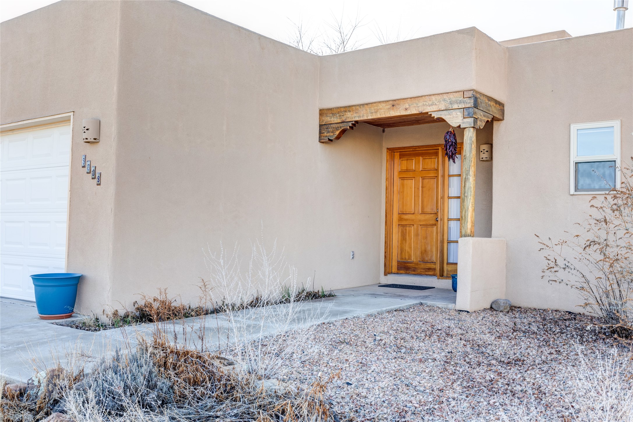 Pueblos del Sol charmer! Single level home with an abundance of Southwestern accents - tall ceilings with vigas, commanding kiva, corbels, and Saltillo tile floors. The kitchen, with all new appliances, opens to the living room and dining area, and includes an expansive island with more seating. The dining area's sliders allow access to the beautifully landscaped rear patio/garden. A generously proportioned primary bedroom also provides back yard access. New additions include 2 mini splits and a newer boiler and water heater. Come enjoy the walking trails and well designed playground for your children in this move in ready, comfortable home.