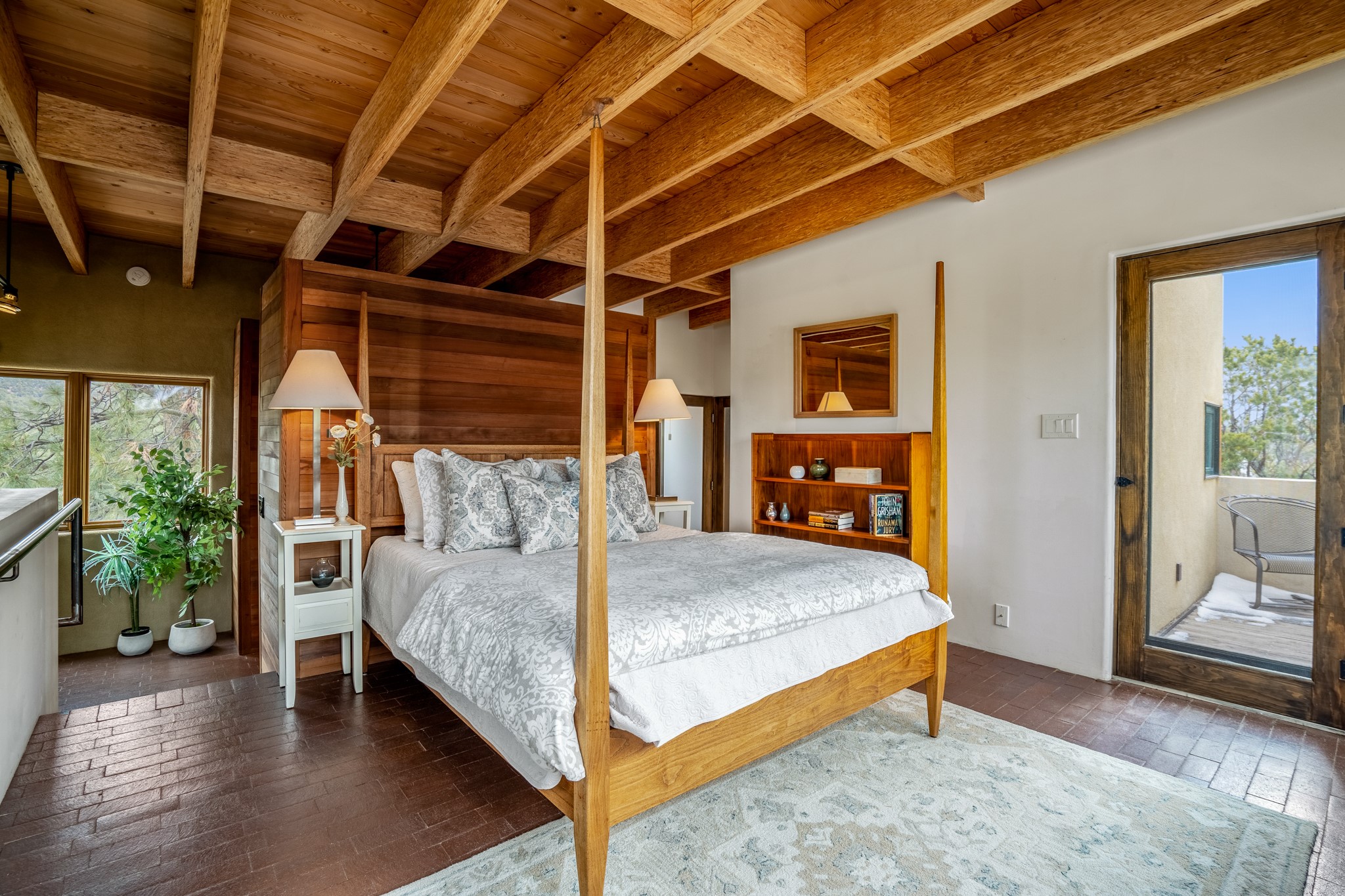 Sophisticated contemporary two story gem on Double Arrow Road in Santa Fe. Situated on 5.14 acres with views to Wilderness Gate and the Jemez Mountains, this 3 bedroom 2 bath, 2750+/- square foot home with two offices, greenhouse, two car heated +/-550sf garage and workshop (not included in main square footage) is located one house up from Hidden Valley Road. Designed by the architecture firm of Rinehart Herbst of San Diego and built in 1996. Floor to ceiling windows bring light and warmth to this extraordinary structure. Parallam beamed ceilings inside, brick flooring, radiant heat, interior gas fireplace, exterior wood burning fireplace. Accessiblility to the outdoors, the many hand crafted built-ins and the intimate nature of each space gives a unique aesthetic and timeless functionality to this lovely home. The exterior wood accents on the garage and studio are Redwood. Two Cisterns and a community well. Paved driveway. Double Arrow Road is gated and is paved.