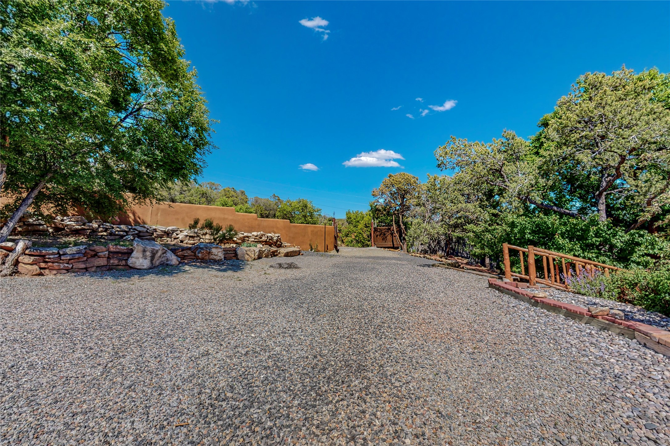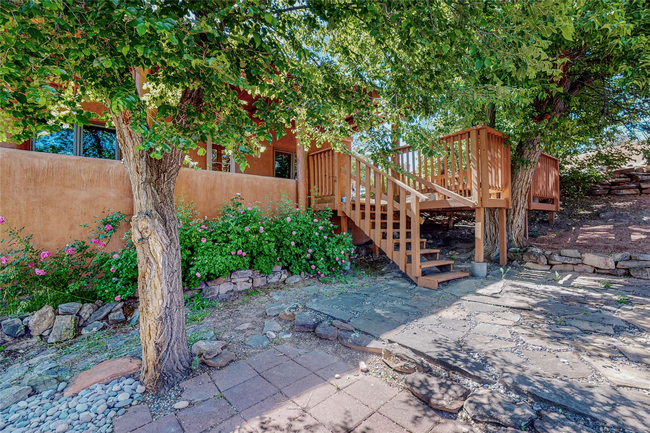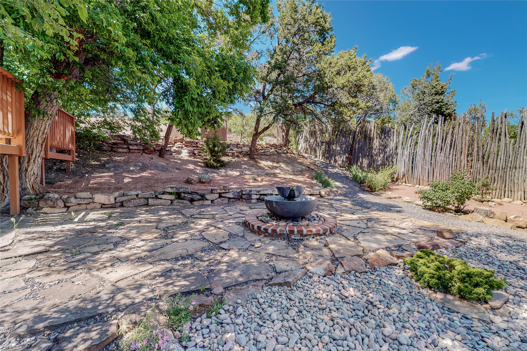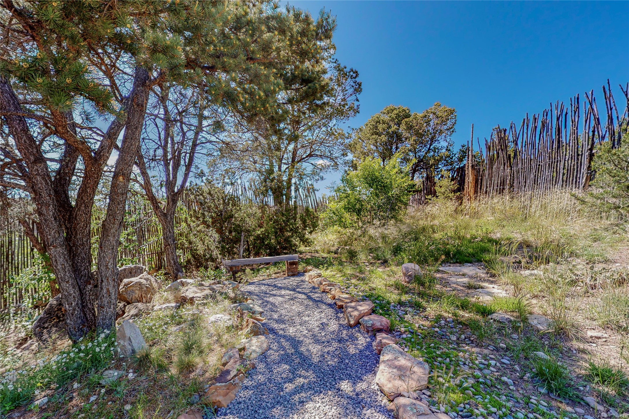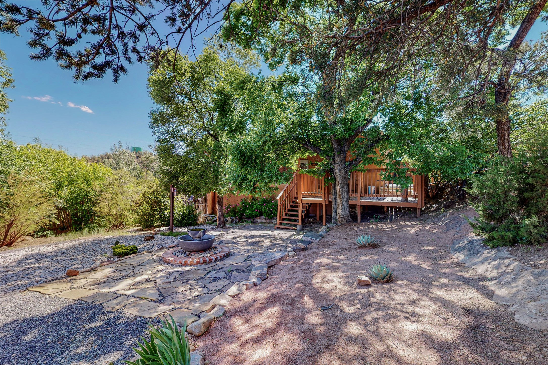Classic Northern New Mexico style adobe gem listed for sale. The property features many upgrades including a fully fenced/walled lot with two access gates from paved NM Hwy 63, vigas and beams, tongue and groove ceilings, extensive landscaping, a fountain, an horno, a bricked terrace with great views, and a carport. Entering from the graveled driveway to covered porch overlooking one of the gardens and fountain one enters the home through a custom wooden door. The living room has recently sanded and sealed floors, corner kiva fireplace, views to the ridge above the Pecos River, bookshelf and openings to the office/2nd bedroom and dining room. The bathroom has be renovated and adjoins both bedrooms. The large recently remodeled country kitchen has stainless steel appliances - refrigerator/dishwasher/stove, copper sink, expansive seating area, new cabinets and adjoins the laundry room. There is a lower level with a den, bath, a small room that with a closet could be a bedroom or an office, separate entrance as well as a large unfinished "basement" for ample storage or renovation possibilities. There is radon mitigation in place. There is a stand alone shed/work shop that is a bonus. Come see this beautiful property today!