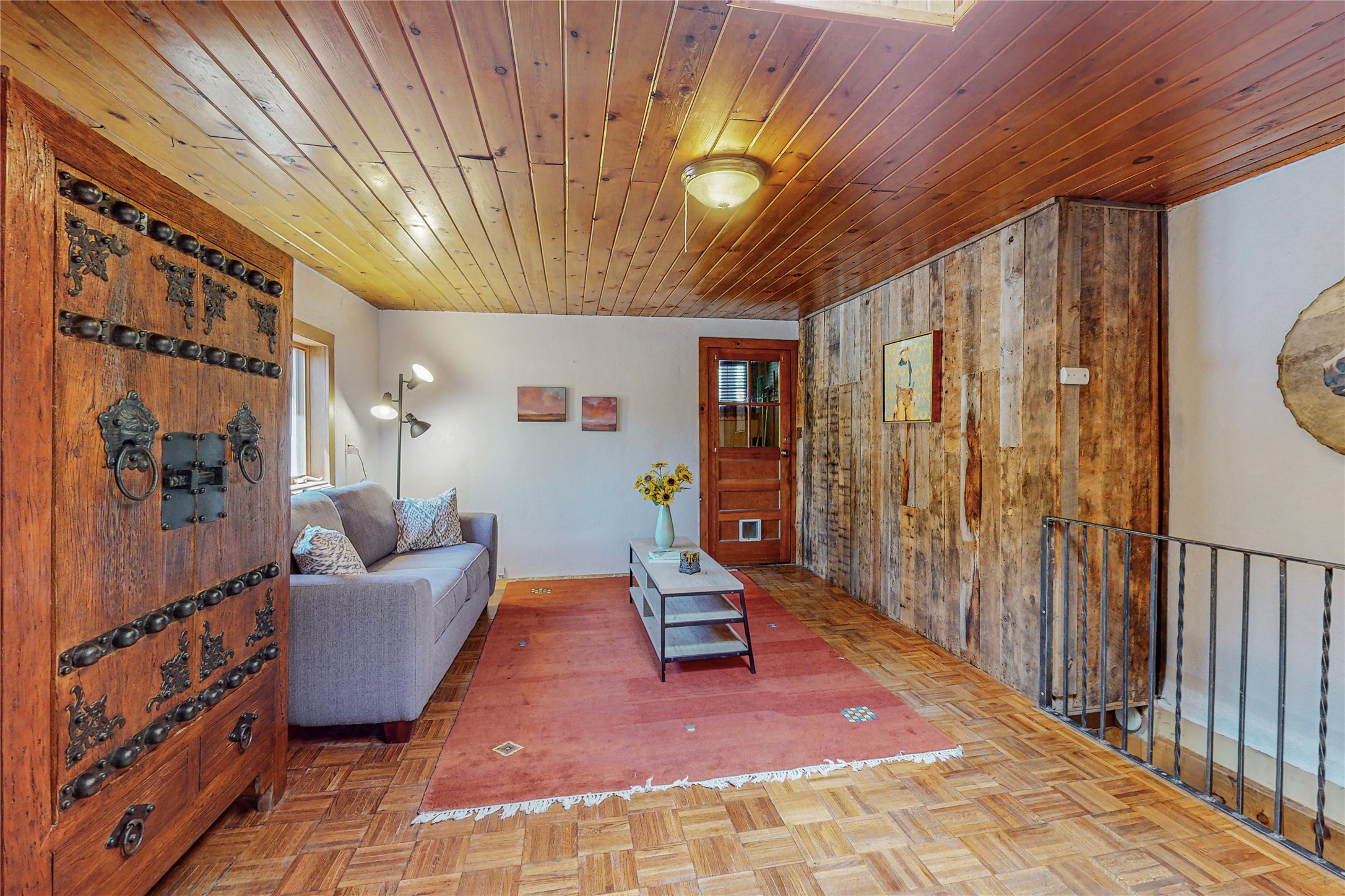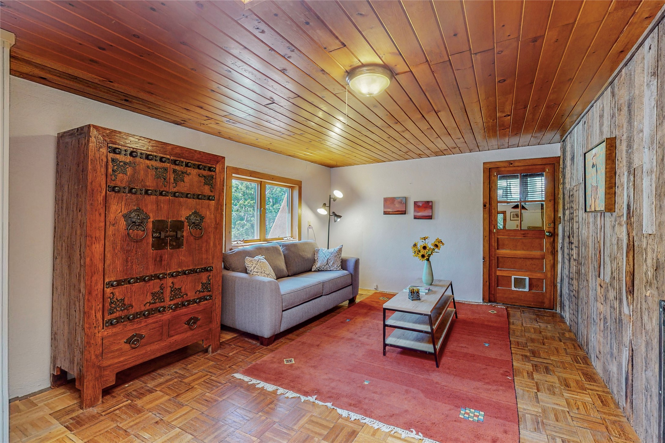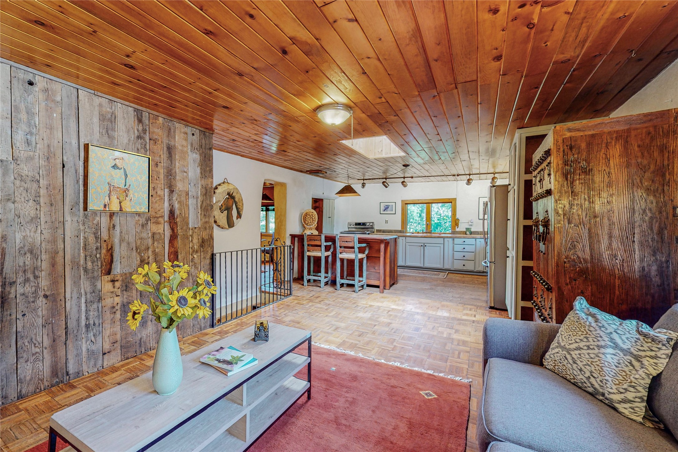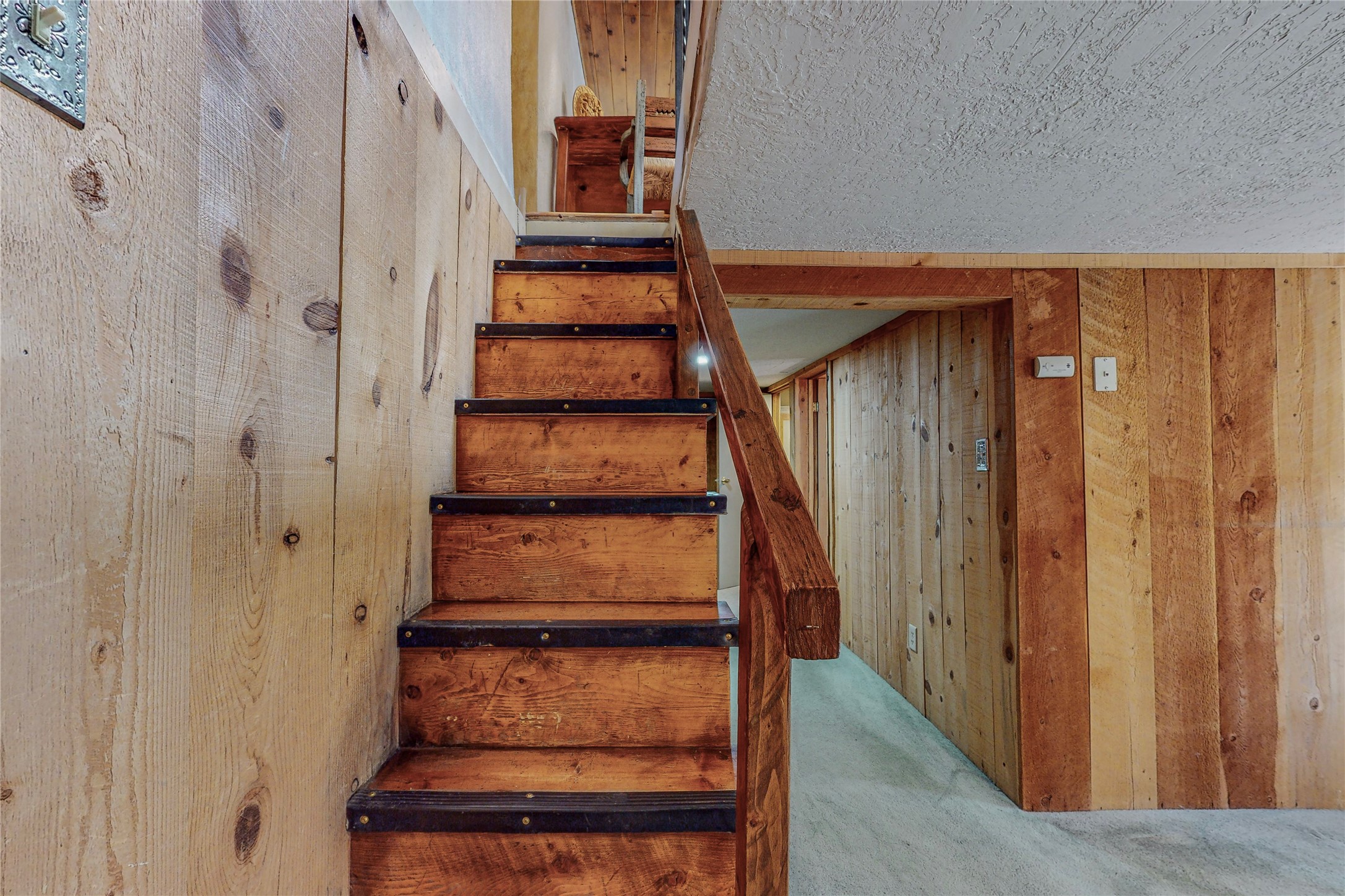Classic Northern New Mexico style adobe gem listed for sale. The property features many upgrades including a fully fenced/walled lot with two access gates from paved NM Hwy 63, vigas and beams, tongue and groove ceilings, extensive landscaping, a fountain, an horno, a bricked terrace with great views, and a carport. Entering from the graveled driveway to covered porch overlooking one of the gardens and fountain one enters the home through a custom wooden door. The living room has recently sanded and sealed floors, corner kiva fireplace, views to the ridge above the Pecos River, bookshelf and openings to the office/2nd bedroom and dining room. The bathroom has be renovated and adjoins both bedrooms. The large recently remodeled country kitchen has stainless steel appliances - refrigerator/dishwasher/stove, copper sink, expansive seating area, new cabinets and adjoins the laundry room. There is a lower level with a den, bath, a small room that with a closet could be a bedroom or an office, separate entrance as well as a large unfinished "basement" for ample storage or renovation possibilities. There is radon mitigation in place. There is a stand alone shed/work shop that is a bonus. Come see this beautiful property today!