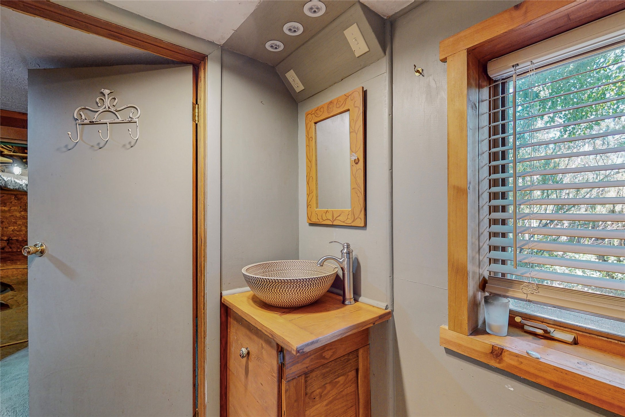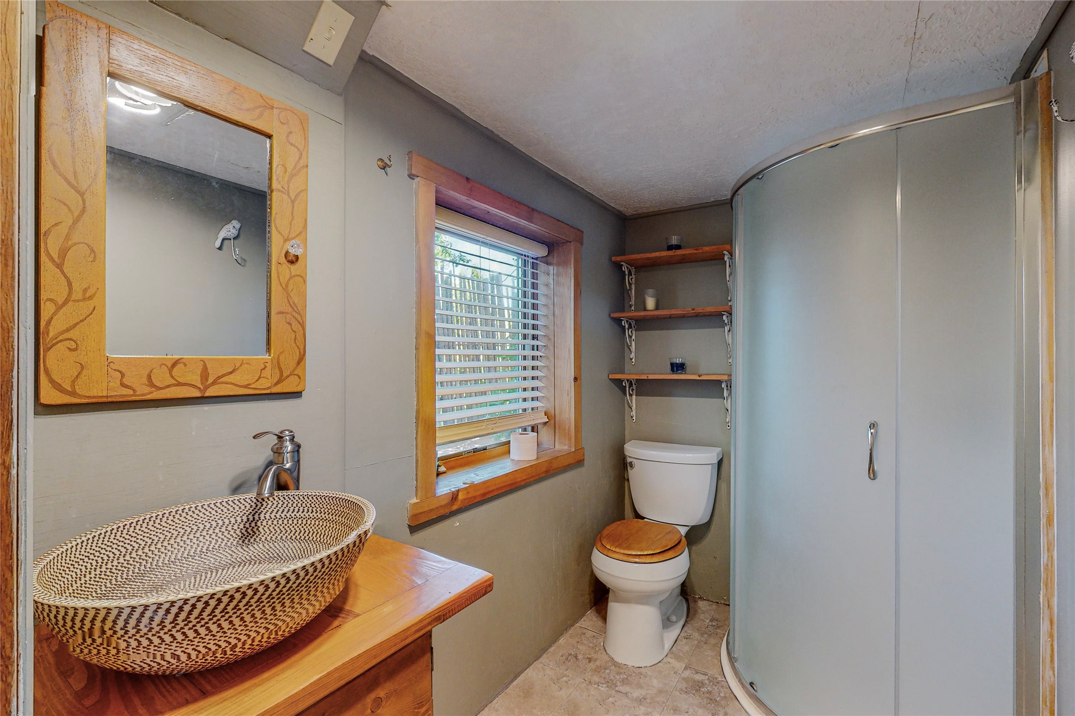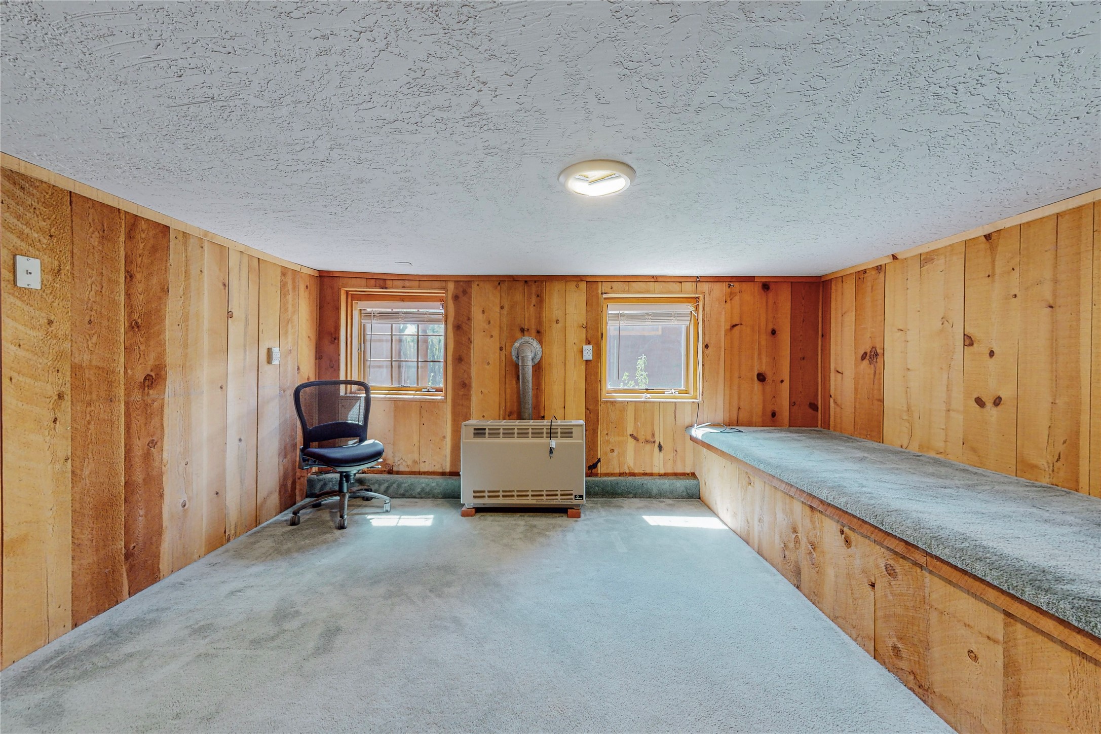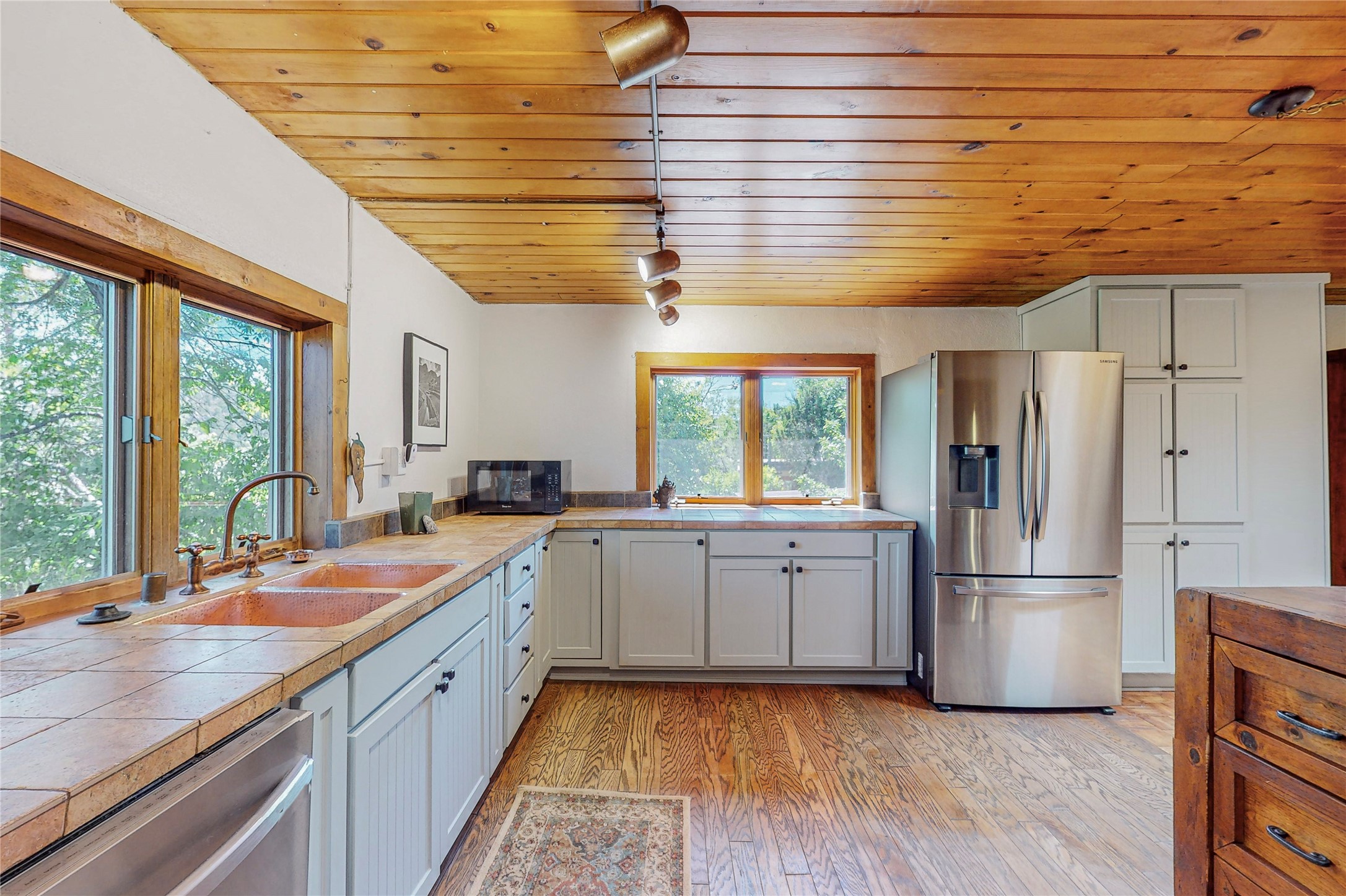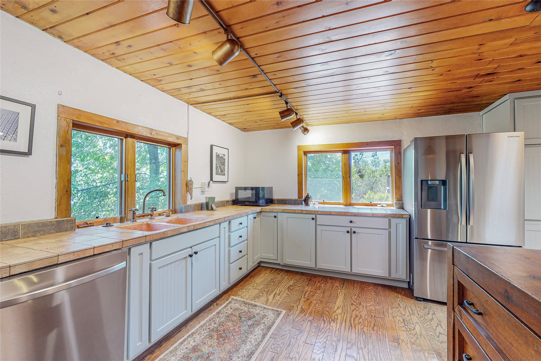 Classic Northern New Mexico style adobe gem listed for sale. The property features many upgrades including a fully fenced/walled lot with two access gates from paved NM Hwy 63, vigas and beams, tongue and groove ceilings, extensive landscaping, a fountain, an horno, a bricked terrace with great views, and a carport. Entering from the graveled driveway to covered porch overlooking one of the gardens and fountain one enters the home through a custom wooden door. The living room has recently sanded and sealed floors, corner kiva fireplace, views to the ridge above the Pecos River, bookshelf and openings to the office/2nd bedroom and dining room. The bathroom has be renovated and adjoins both bedrooms. The large recently remodeled country kitchen has stainless steel appliances - refrigerator/dishwasher/stove, copper sink, expansive seating area, new cabinets and adjoins the laundry room. There is a lower level with a den, bath, a small room that with a closet could be a bedroom or an office, separate entrance as well as a large unfinished "basement" for ample storage or renovation possibilities. There is radon mitigation in place. There is a stand alone shed/work shop that is a bonus. Come see this beautiful property today!