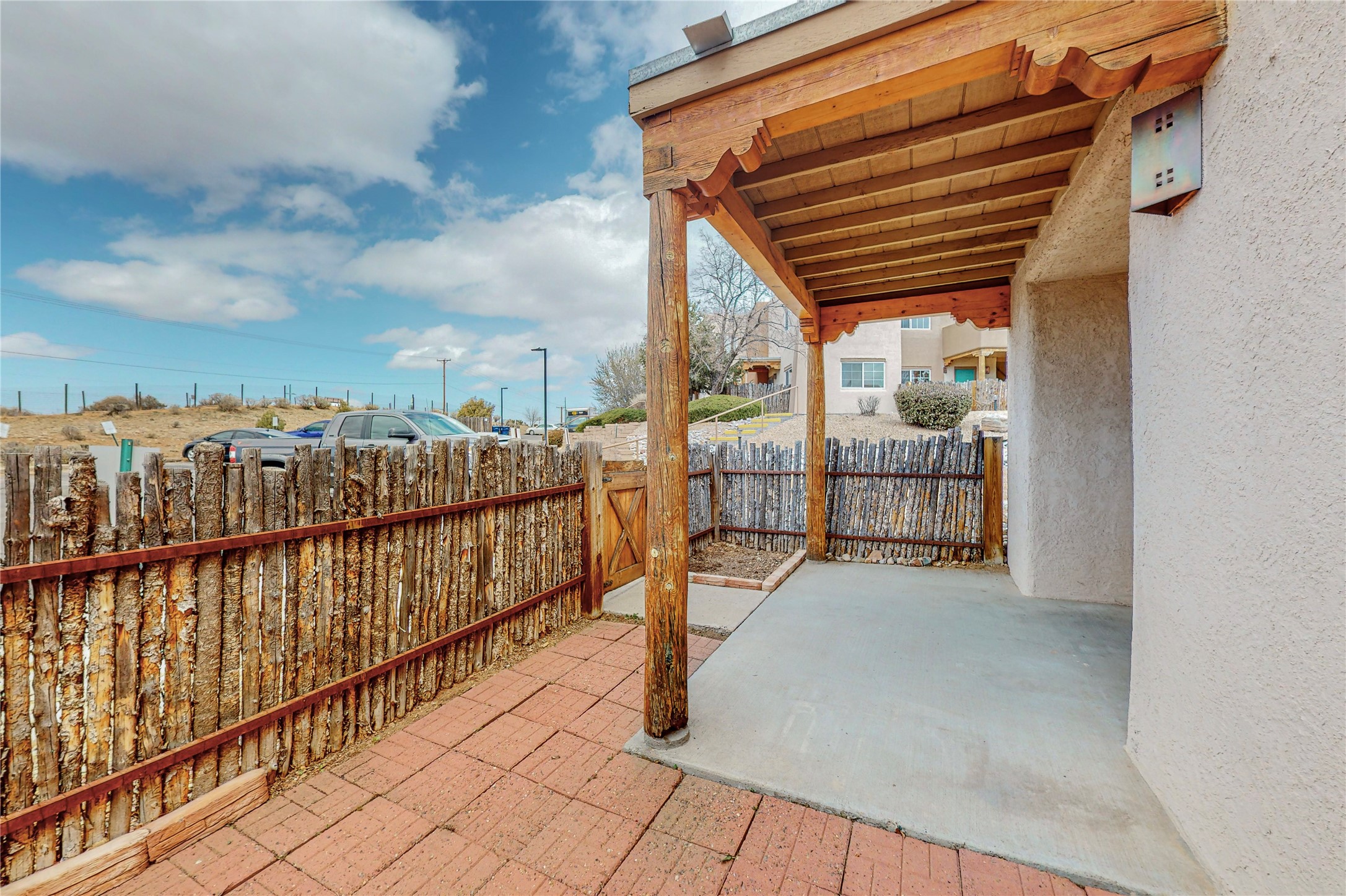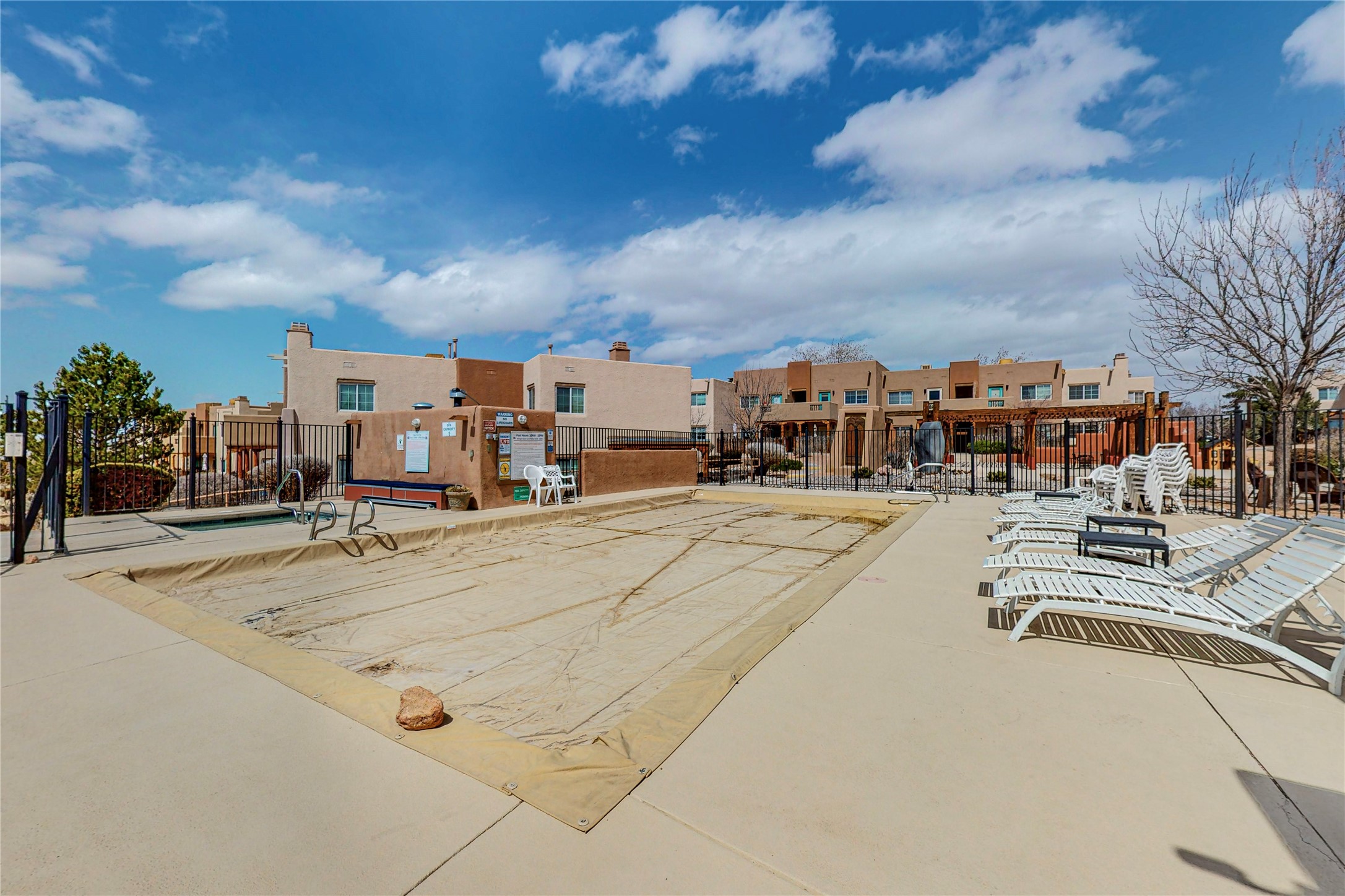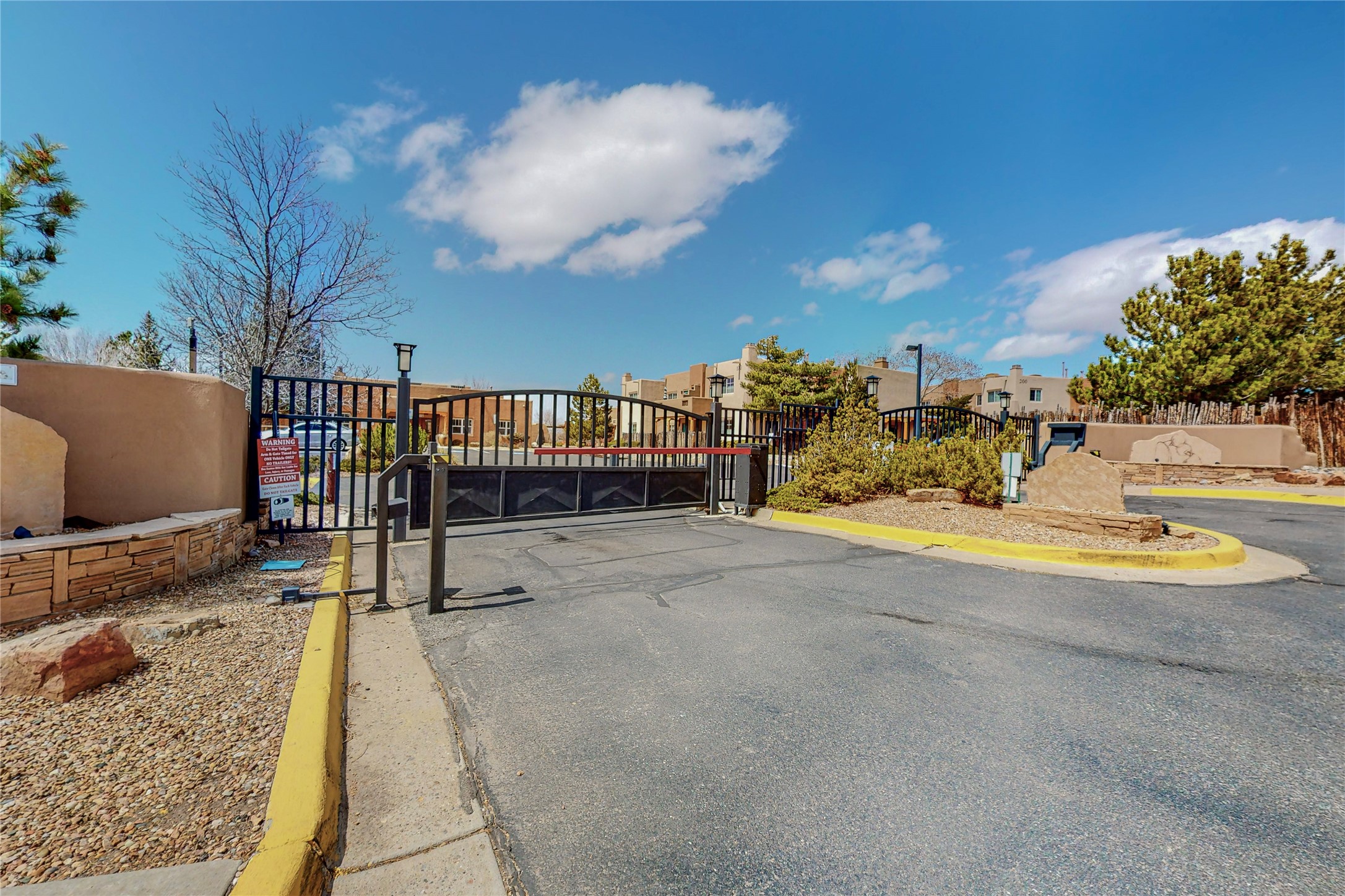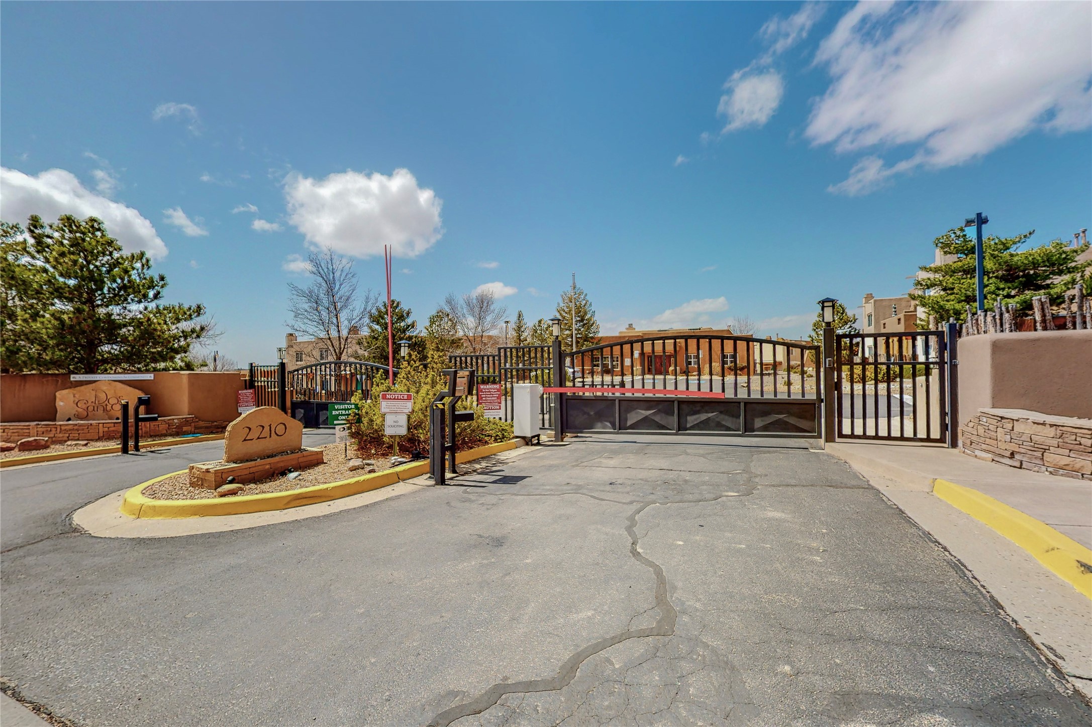 Welcome to 2210 Miguel Chaves! A stunning Santa Fe condo in a premium location, in the gated community of Dos Santos, aptly named for the fantastic central location at the intersection of Saint Francis & Saint Michael's. Enjoy all the community's amenities which includes outdoor grilling, a dog park, a salt water swimming pool, spa and a fitness center! This home is south facing enabling a wide open view! Enter the home to an open, light and bright floor plan laid out with natural wood looking porcelain tile, FULLY UPDATED! All new stainless steel appliances including new WHIRLPOOL stacked washer and dryer. Enjoy a completely redesigned kitchen with a custom farmhouse-style/apron sink made from 99% pure-mined copper with a hammered finish, set on sleek quartz countertops, recessed lighting, glossy white mosaic backsplash and LIVING ART on the wall in the form of a built in fireplace! Find new light fixtures and natural wood doors throughout the home. Each bedroom has a huge walk in closet with set storage space fixed to the walls. Enjoy a fully custom master bathroom equipped with natural stone from the walk in shower to the backsplash. Well maintained, fully updated! This is a MUST SEE!!! Schedule your showing today!